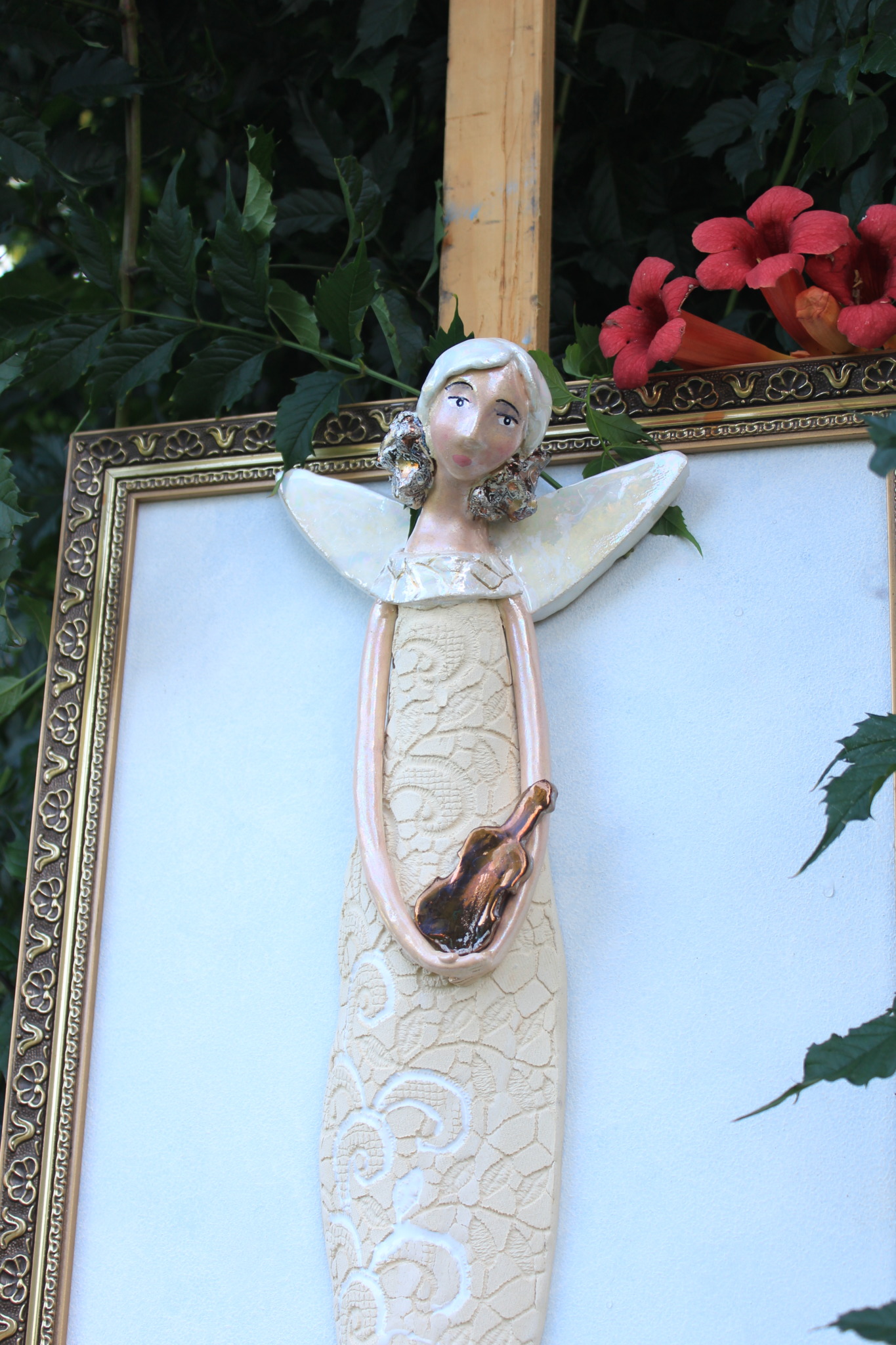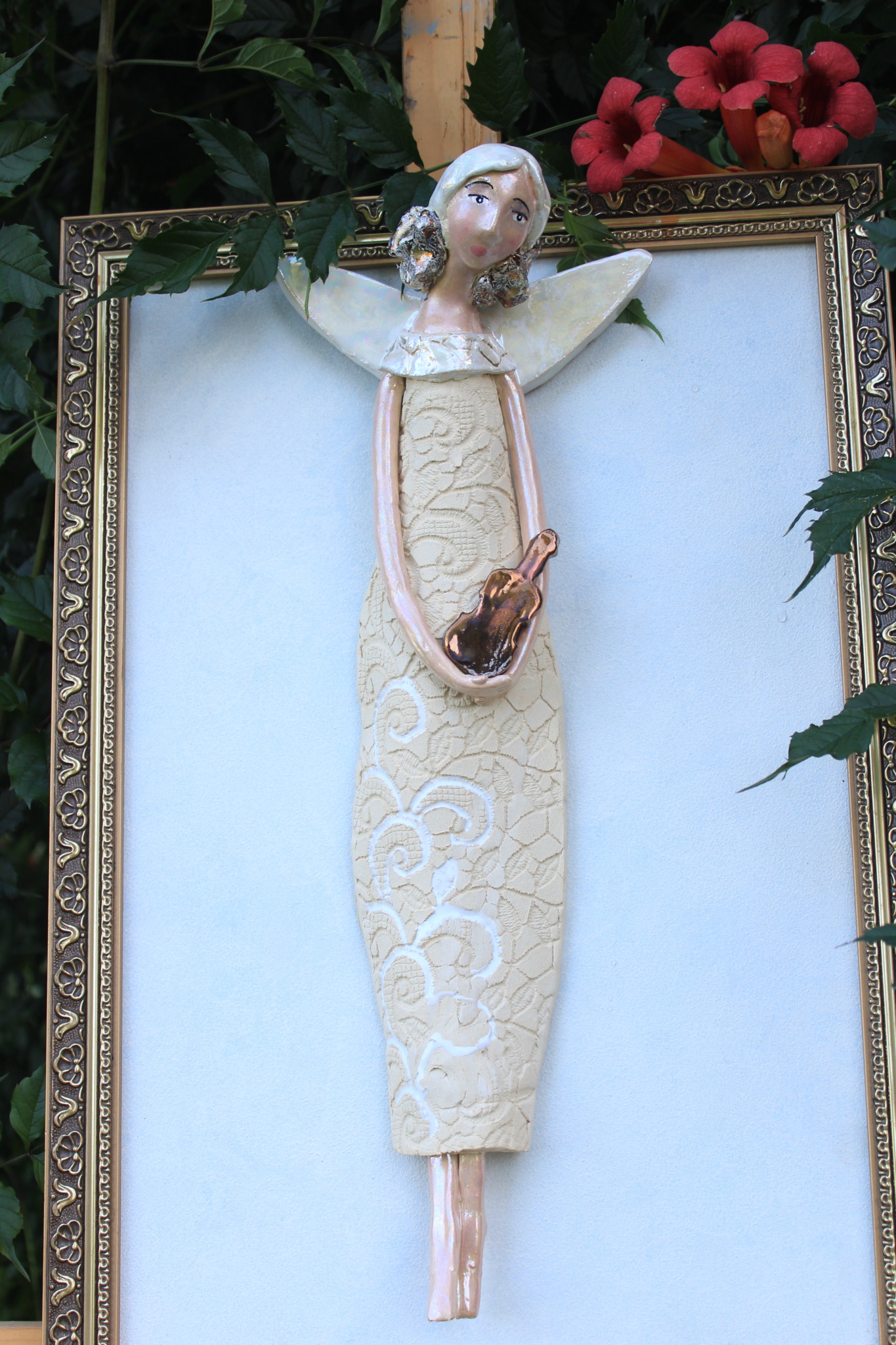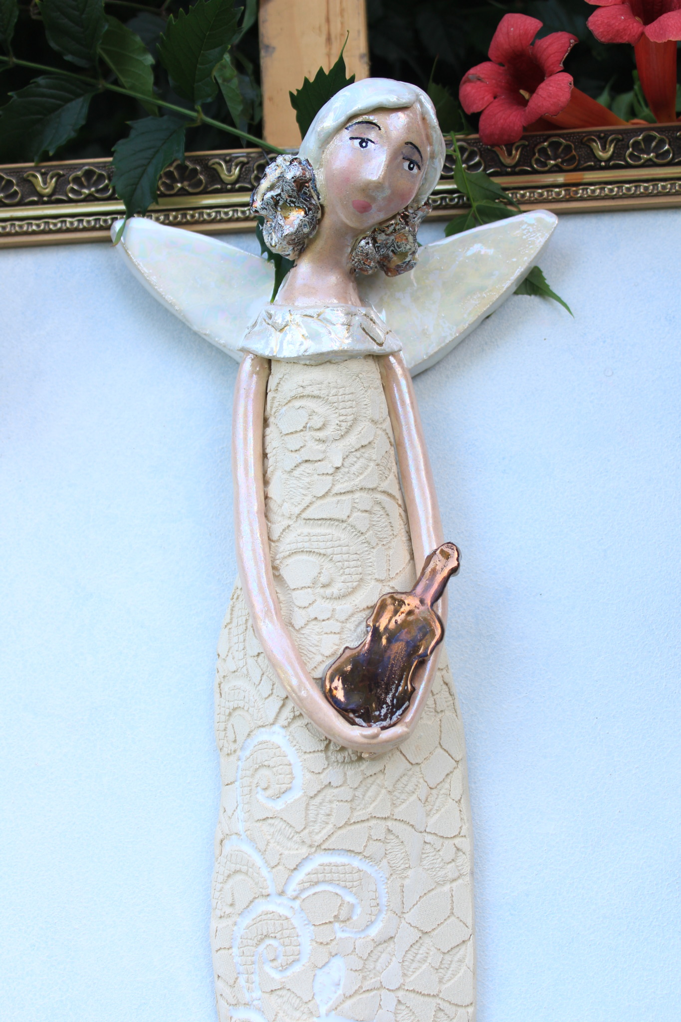 Anielski Muzyk, to rzeźba wykonana ręcznie z gliny w pojedynczym egzemplarzu. Anioł ten jest trzykrotnie wypalany, szkliwiony a w detalach pokryty metalami szlachetnymi. Szczególnie polecamy tą rzeźbę, jako prezent na specjalne okazje takie jak, wesele bądź rocznice ślubu. Jej wyjątkowy wygląd sprawi, iż będzie to unikatowa ozdoba ścienna.