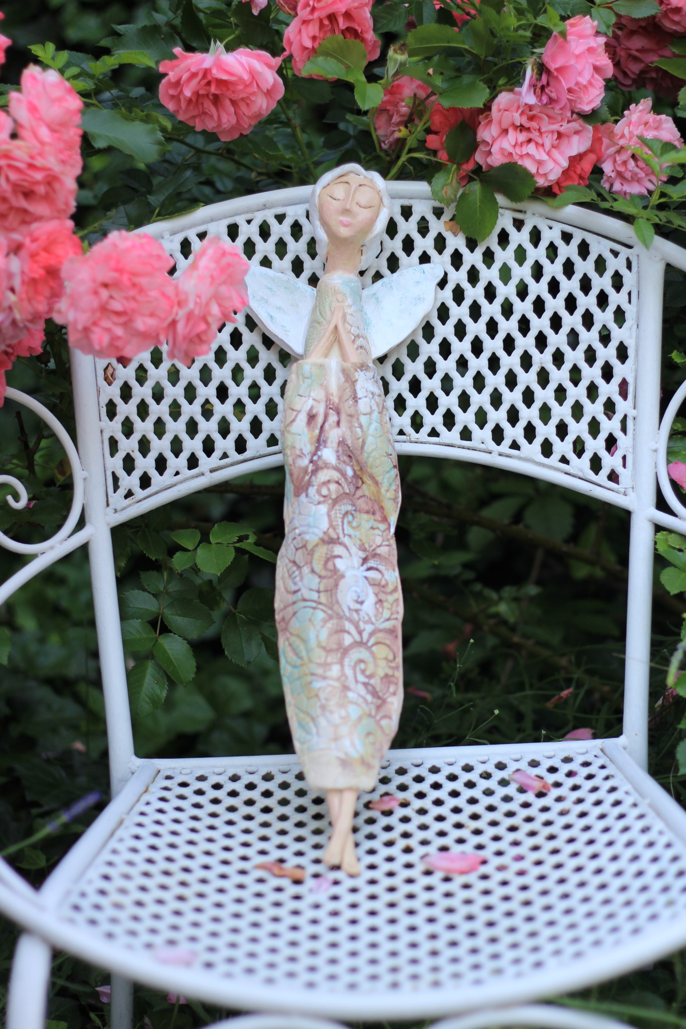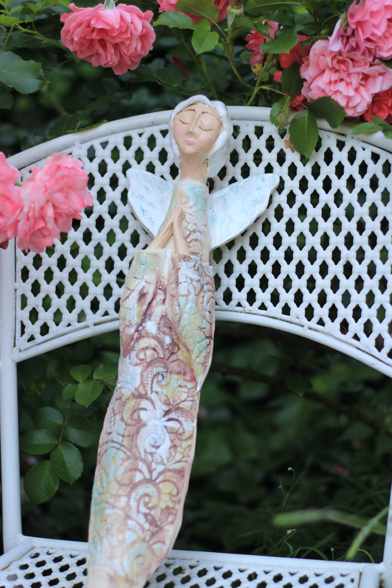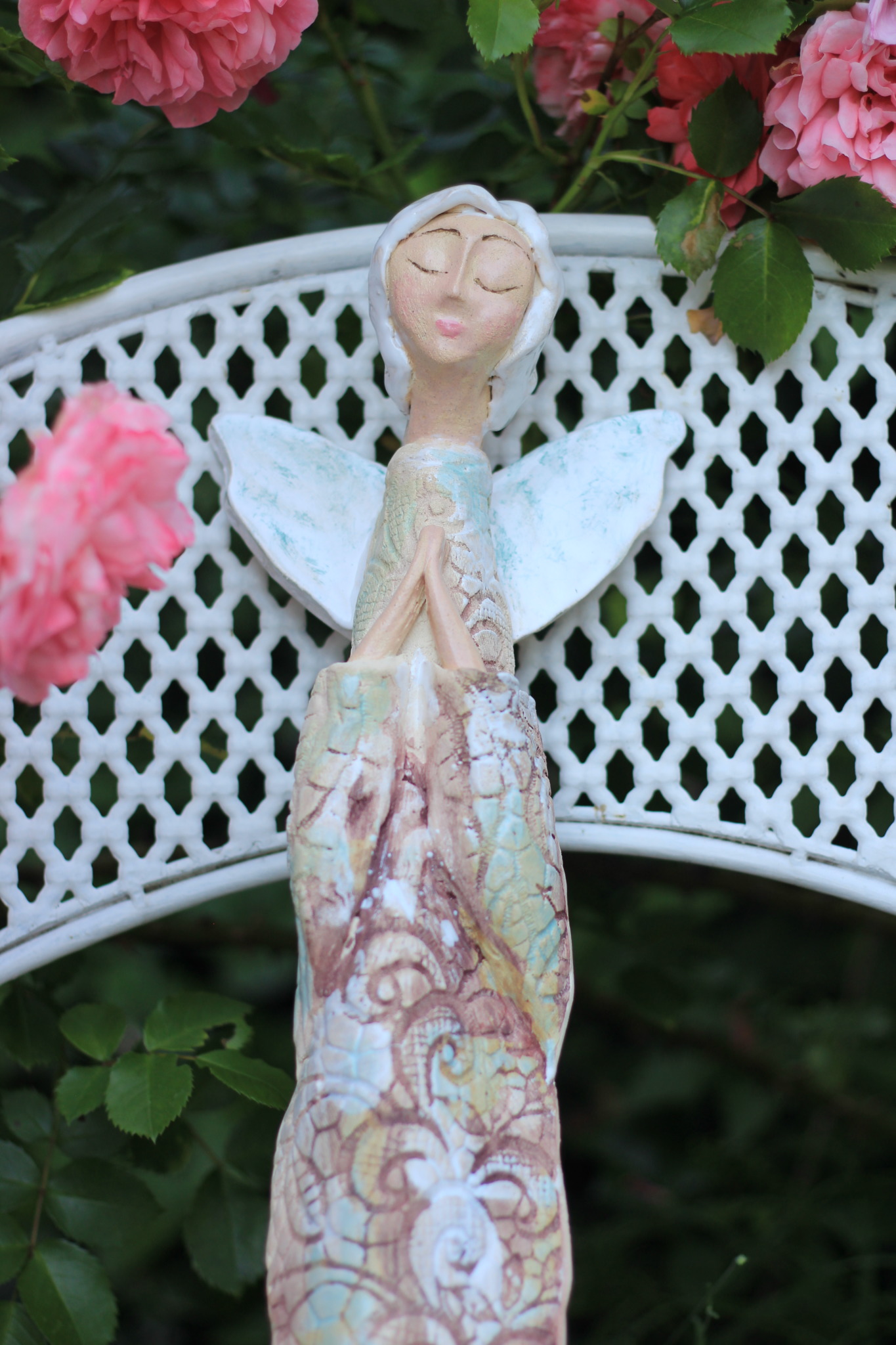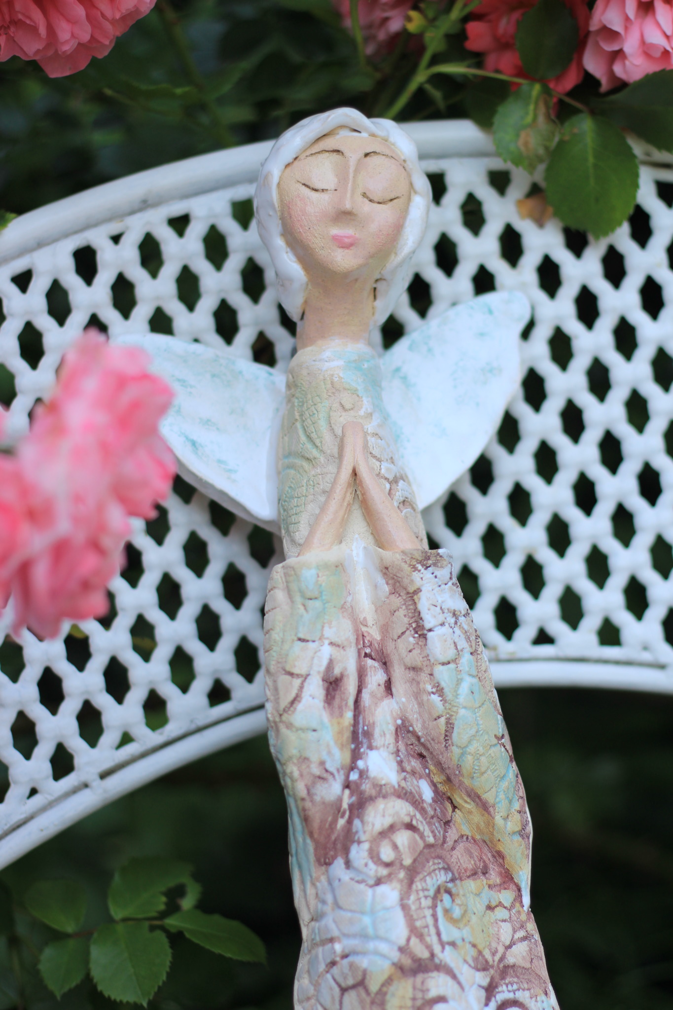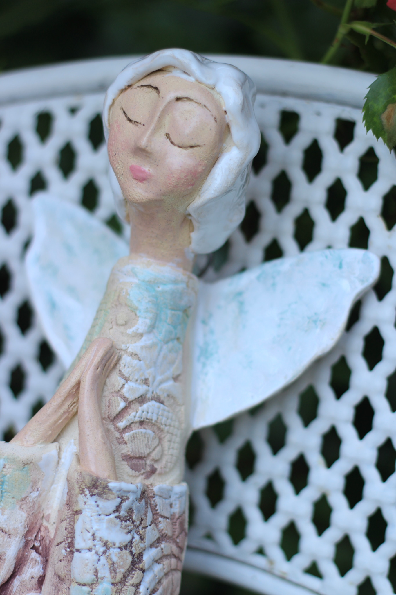 Anioł ceramiczny, wykonany ręcznie z gliny w pojedynczym egzemplarzu. Dwukrotnie wypalany oraz szkliwiony. Stanowi świetną propozycję dla unikatowego prezentu dla bliskiej osoby oraz nietuzinkową ozdobę ścienną.