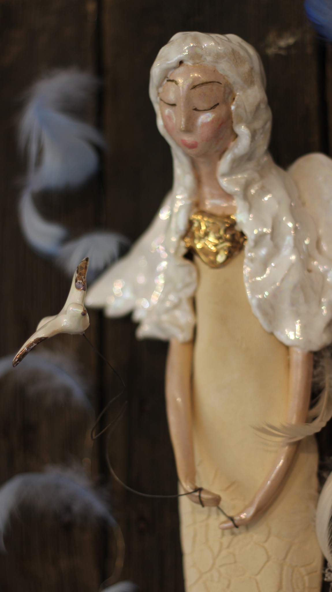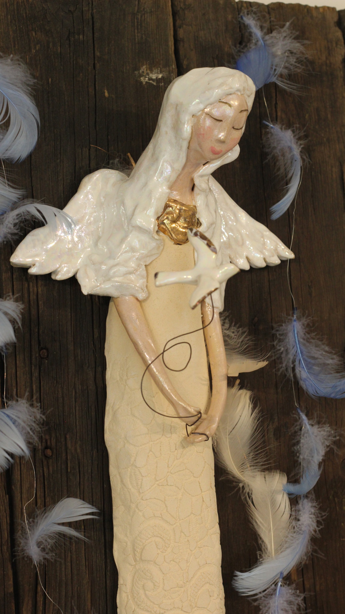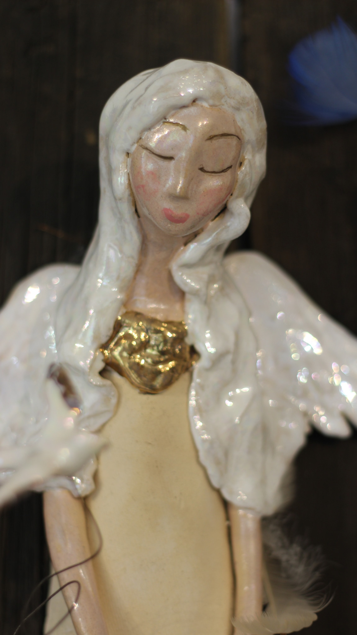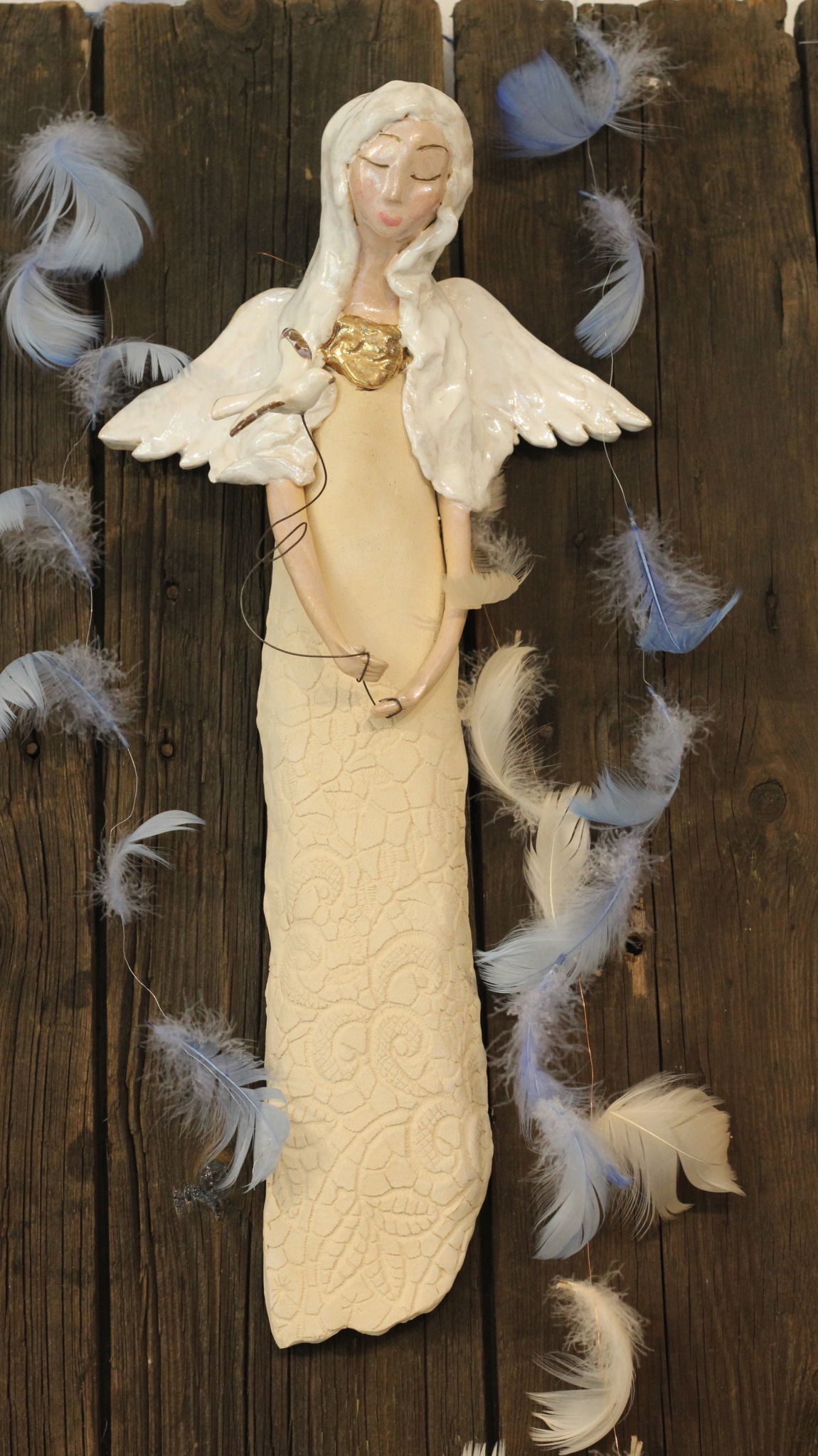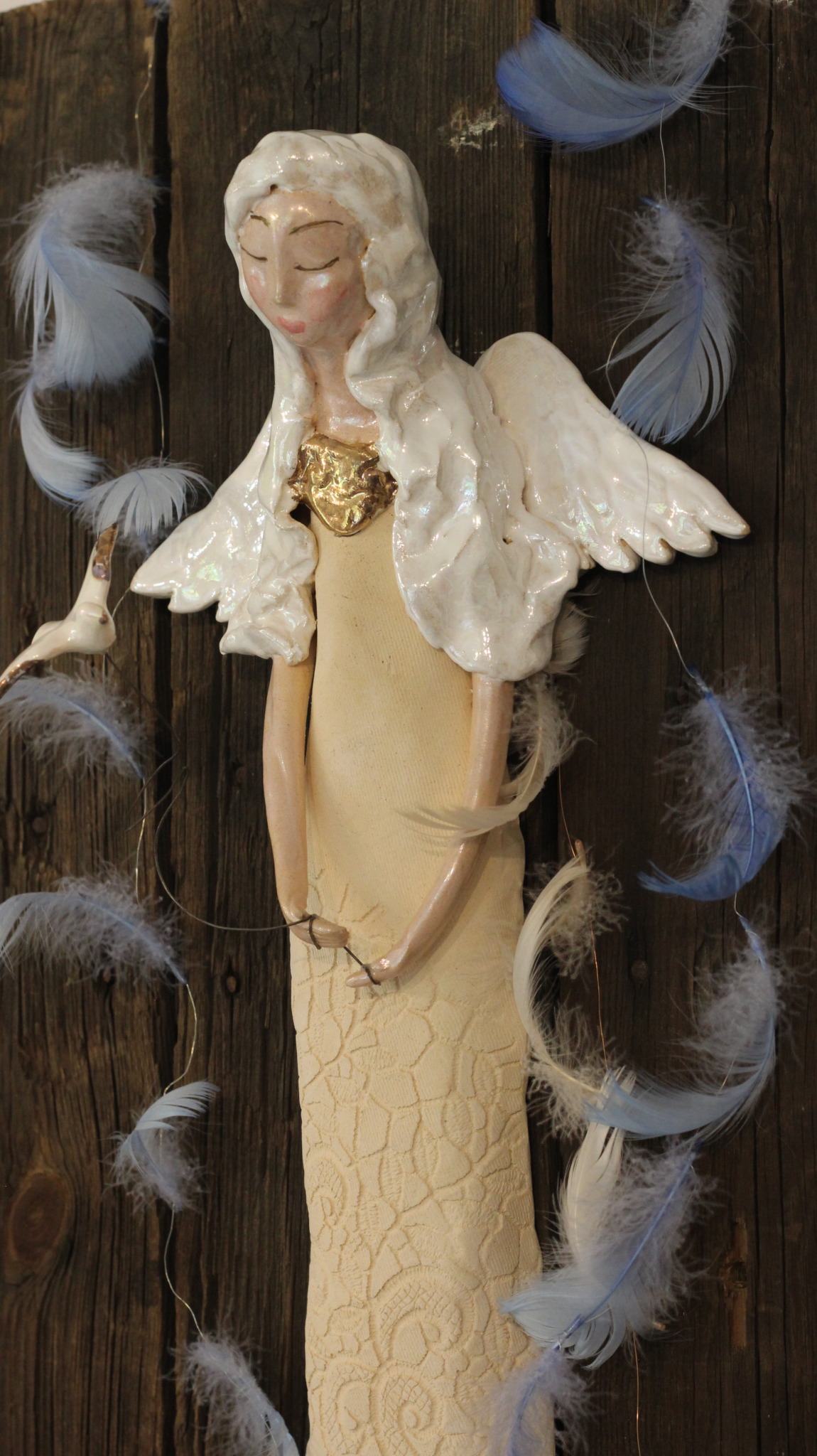 Anioł ceramiczny ze złotym ornamentem, wykonany ręcznie z gliny w pojedynczym egzemplarzu. Trzykrotnie wypalany, szkliwiony a w detalach pokryty metalami szlachetnymi. Stanowi świetną propozycję dla unikatowego prezentu dla bliskiej osoby oraz oryginalną ozdobę ścienną.