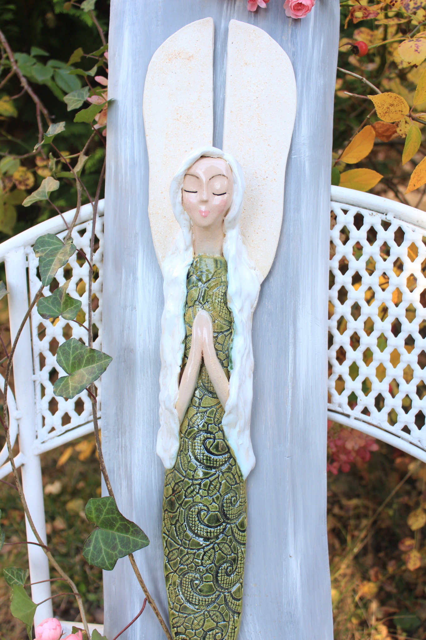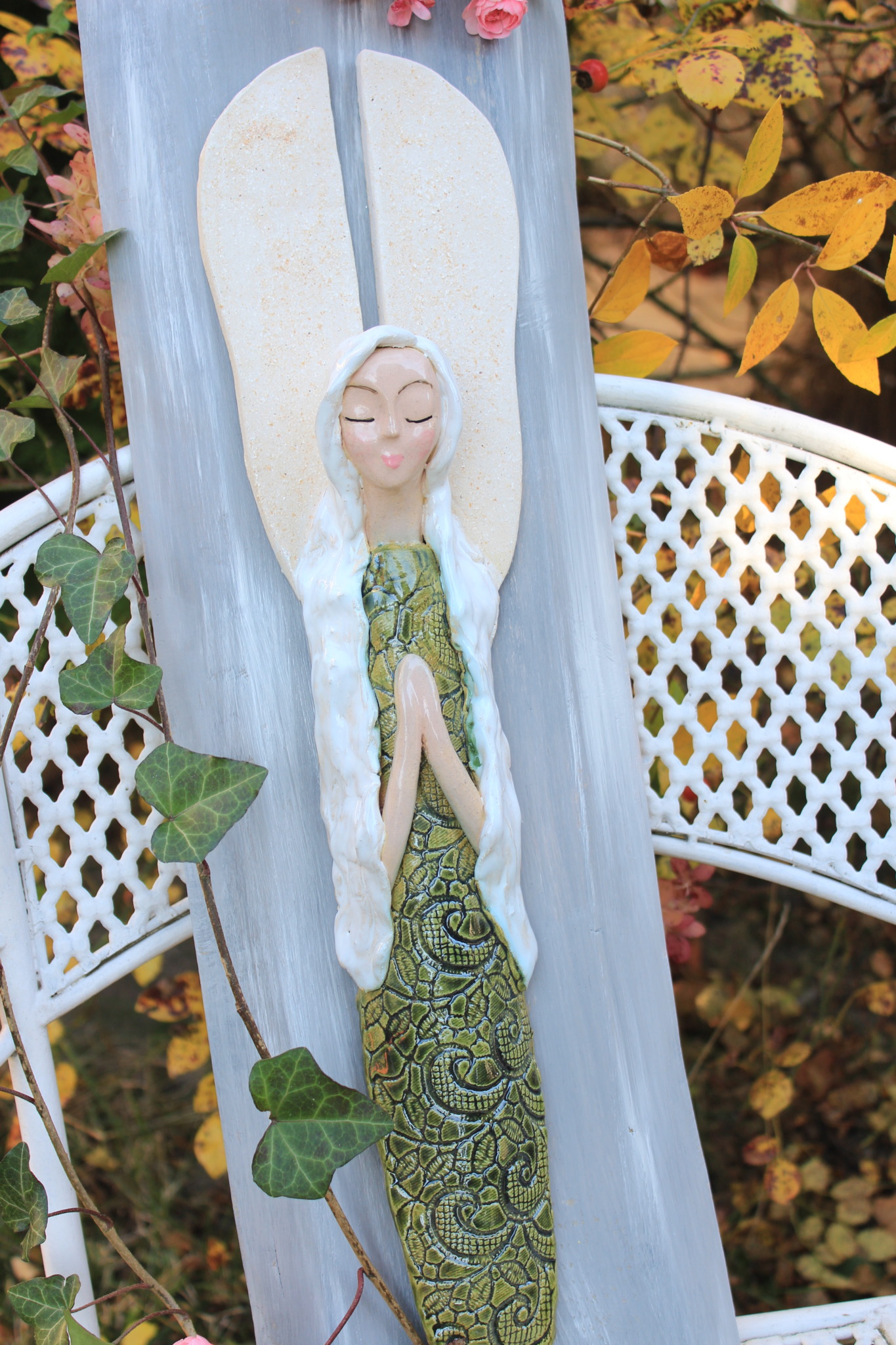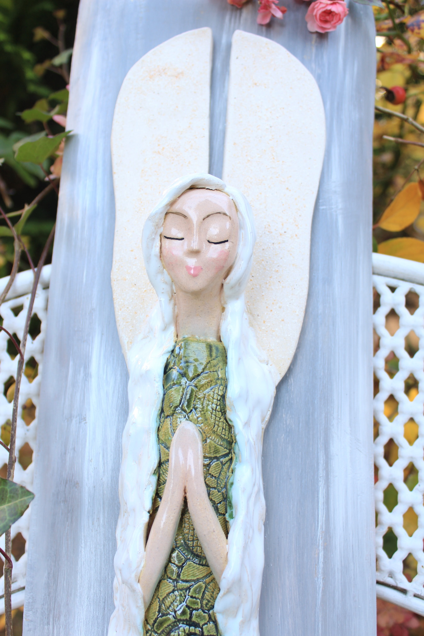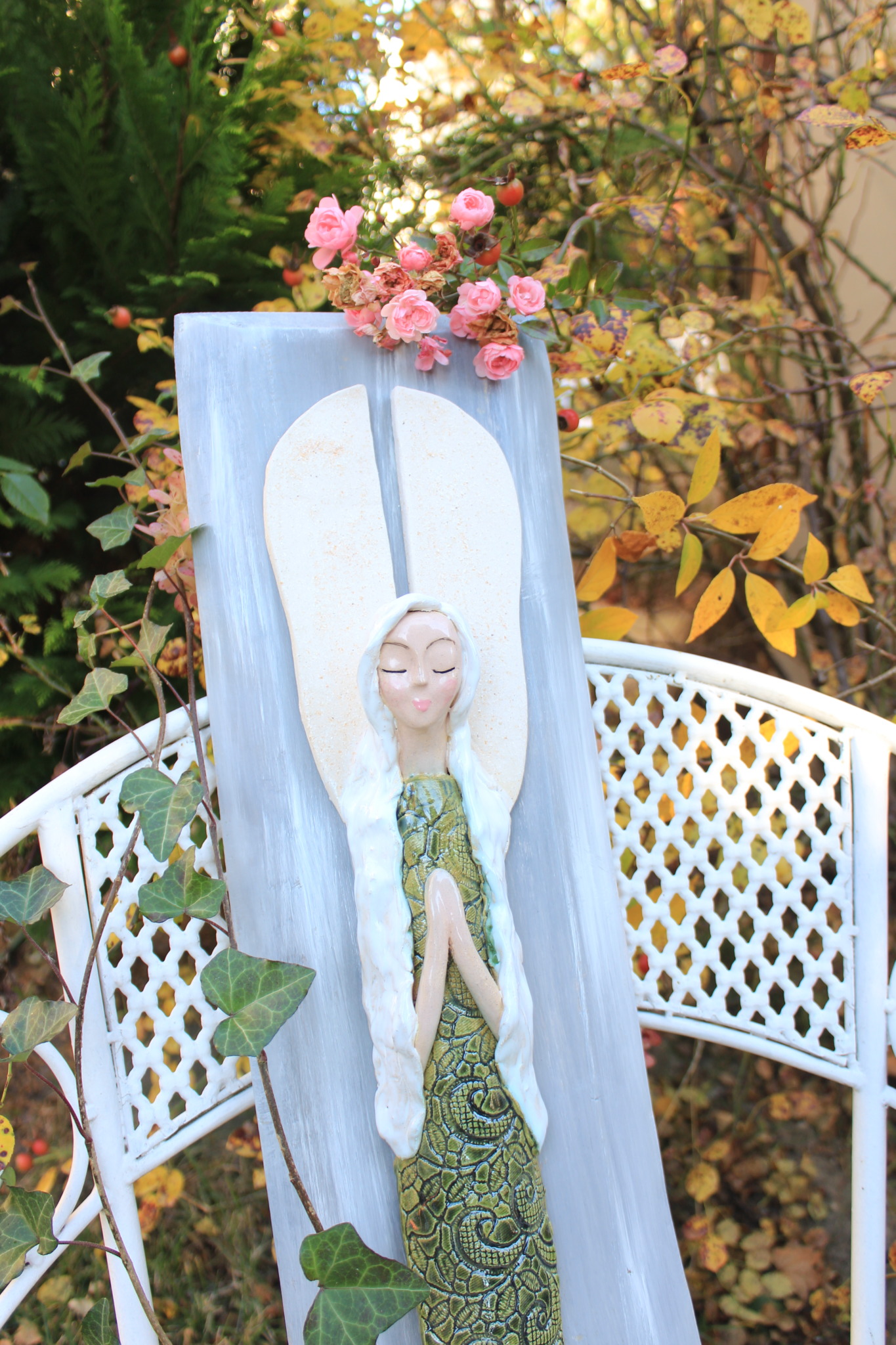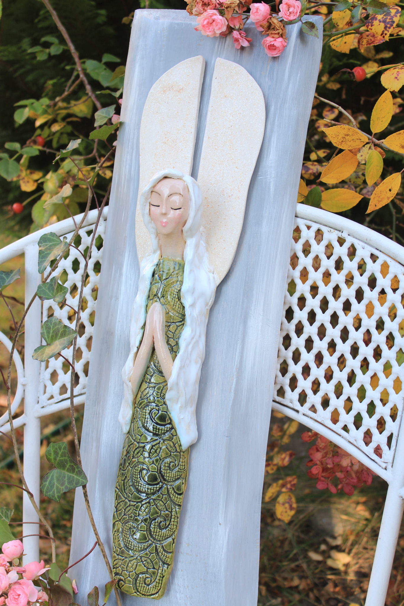 Ceramiczny anioł na desce wykonany ręcznie z gliny w pojedynczym egzemplarzu. Anioł jest całościowo szkliwiony i na stałe przyklejony do deski odpowiednio wcześniej zabezpieczonej. Z tyłu deski znajduje się stosowny otwór z blaszką do regulacji. Szczególnie polecamy tą rzeźbę, jako prezent na specjalne okazje takie jak, śluby, rocznice ślubu bądź jako prezent bożonarodzeniowy. Jej wyjątkowy wygląd sprawi, iż będzie to unikatowa ozdoba ścienna.