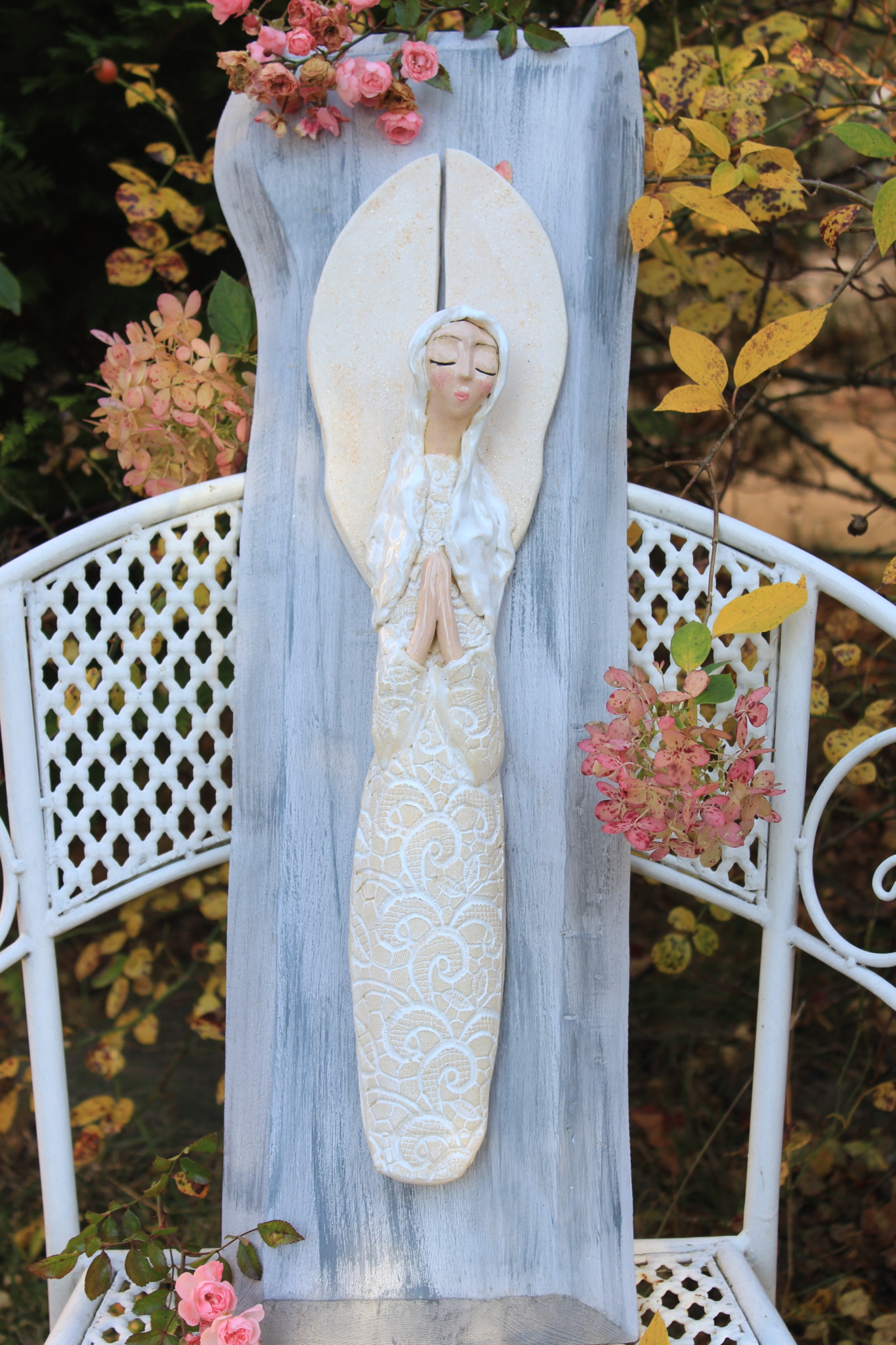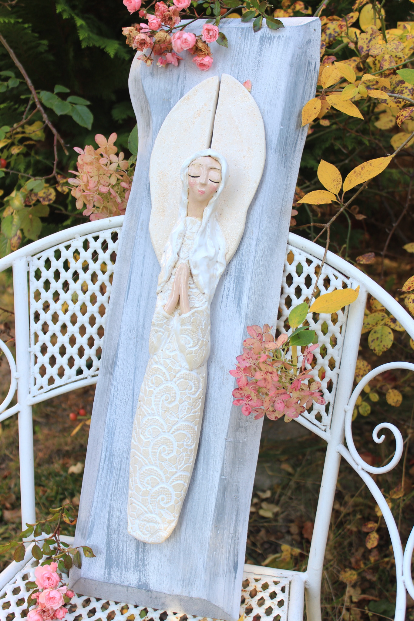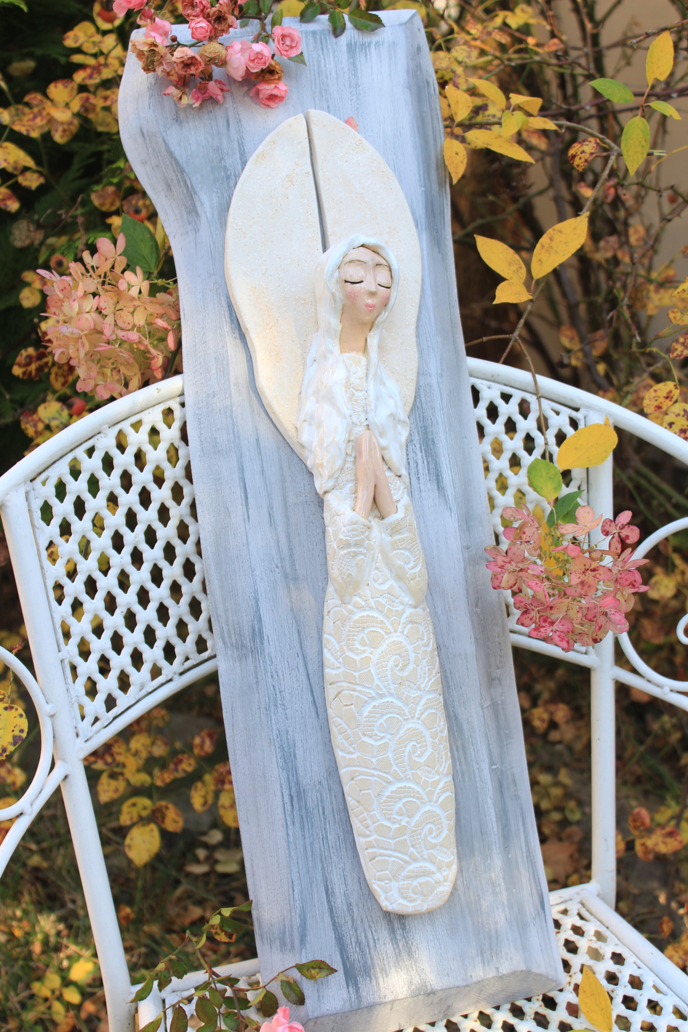 • Ceramiczny anioł na desce wykonany ręcznie z gliny w pojedynczym egzemplarzu. Anioł jest całościowo szkliwiony i na stałe przyklejony do deski odpowiednio wcześniej zabezpieczonej. Z tyłu deski znajduje się stosowny otwór z blaszką do regulacji. Szczególnie polecamy tą rzeźbę, jako prezent na specjalne okazje takie jak, śluby, rocznice ślubu bądź jako prezent bożonarodzeniowy. Jej wyjątkowy wygląd sprawi, iż będzie to unikatowa ozdoba ścienna.