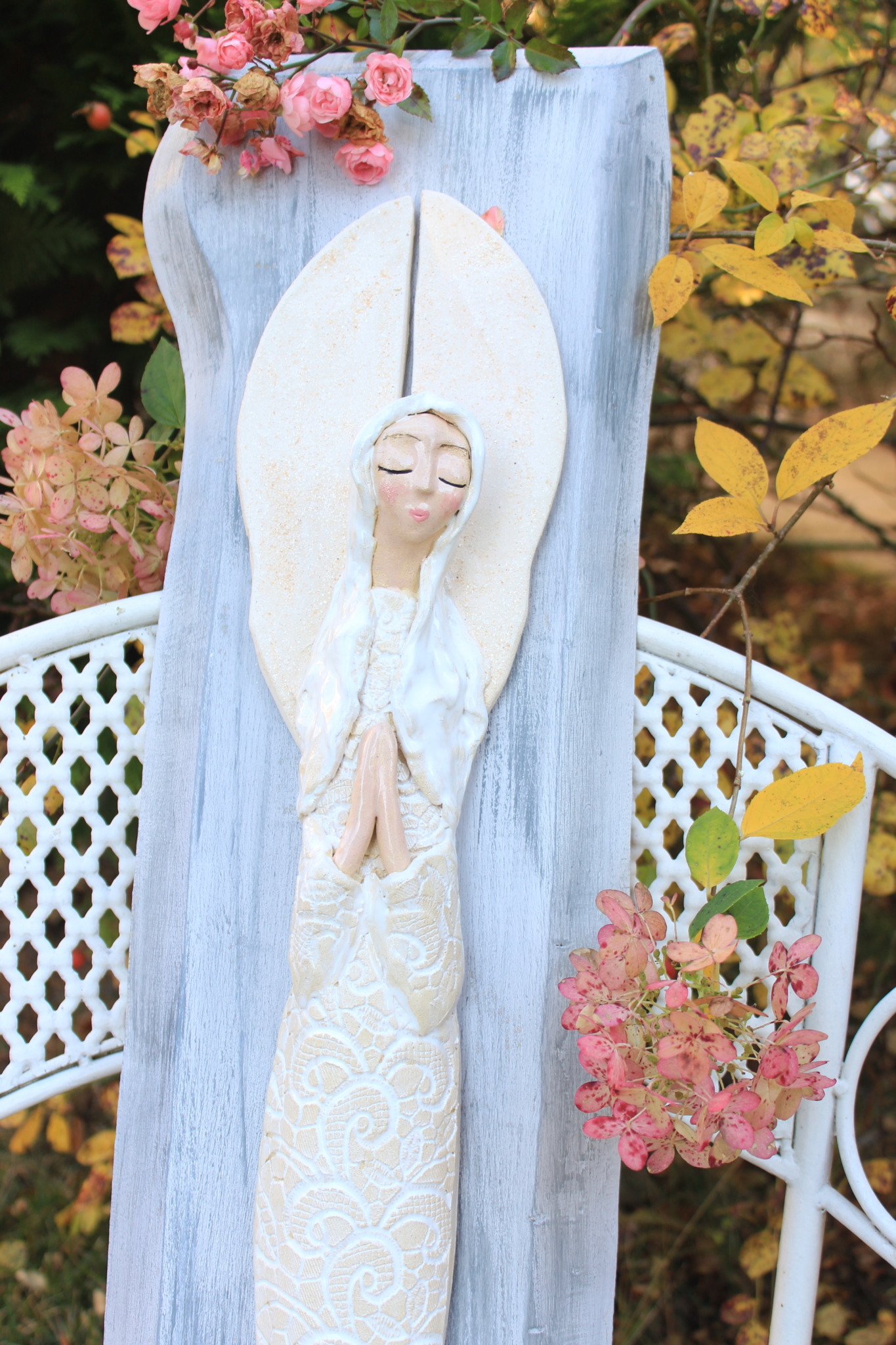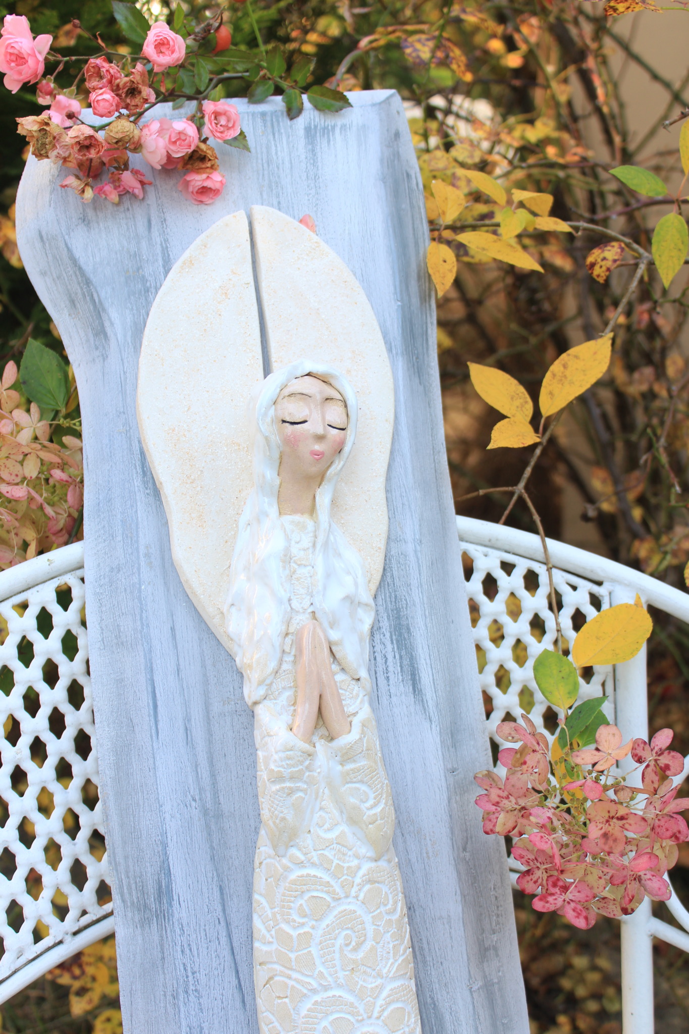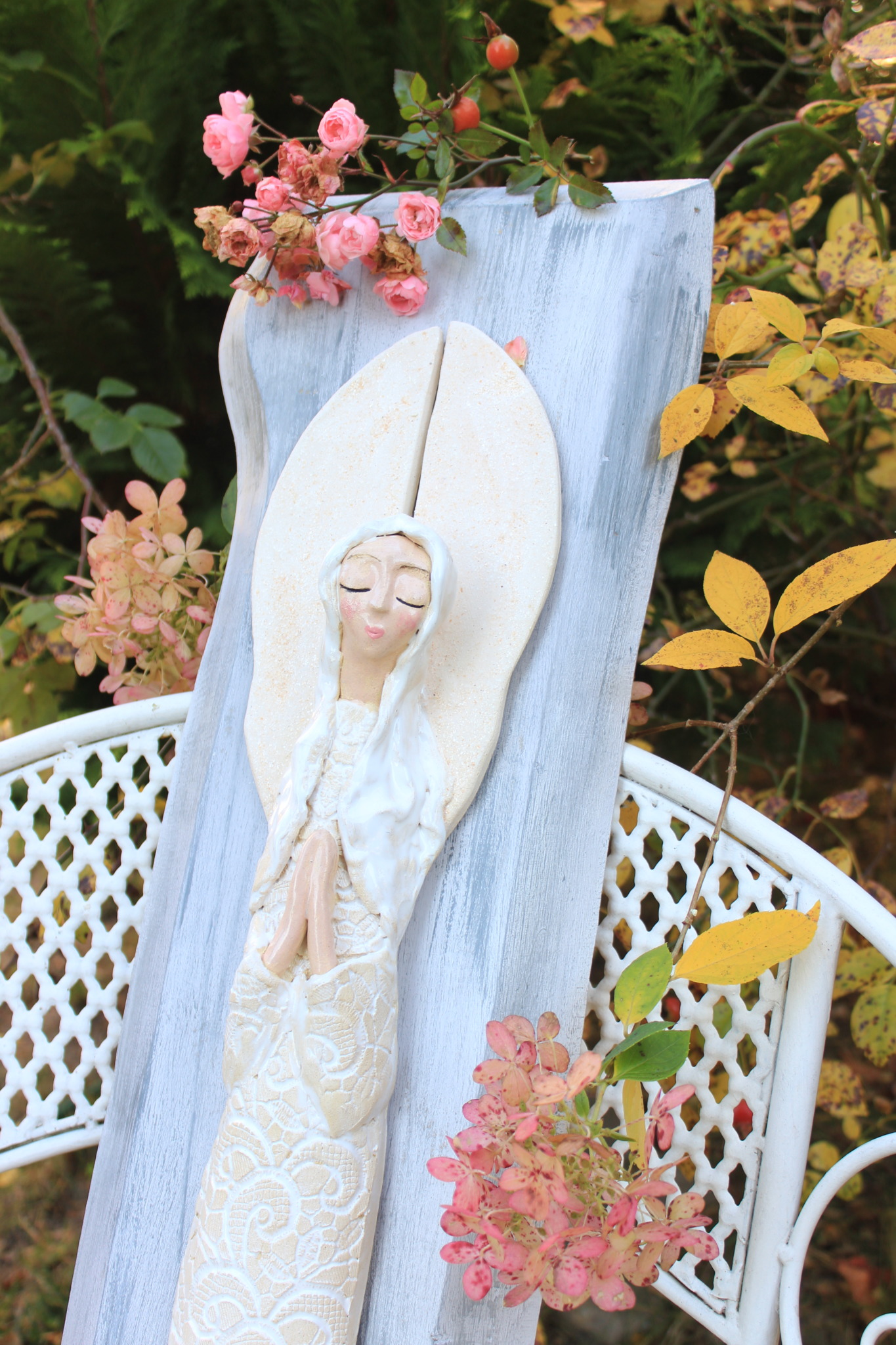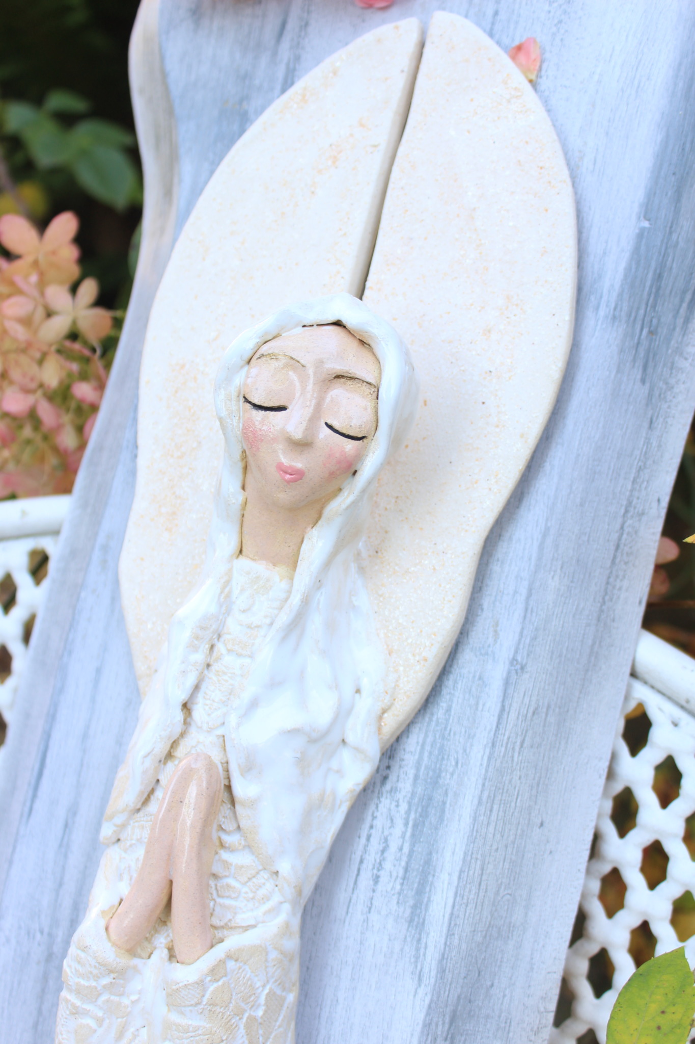 • Ceramiczny anioł na desce wykonany ręcznie z gliny w pojedynczym egzemplarzu. Anioł jest całościowo szkliwiony i na stałe przyklejony do deski odpowiednio wcześniej zabezpieczonej. Z tyłu deski znajduje się stosowny otwór z blaszką do regulacji. Szczególnie polecamy tą rzeźbę, jako prezent na specjalne okazje takie jak, śluby, rocznice ślubu bądź jako prezent bożonarodzeniowy. Jej wyjątkowy wygląd sprawi, iż będzie to unikatowa ozdoba ścienna.