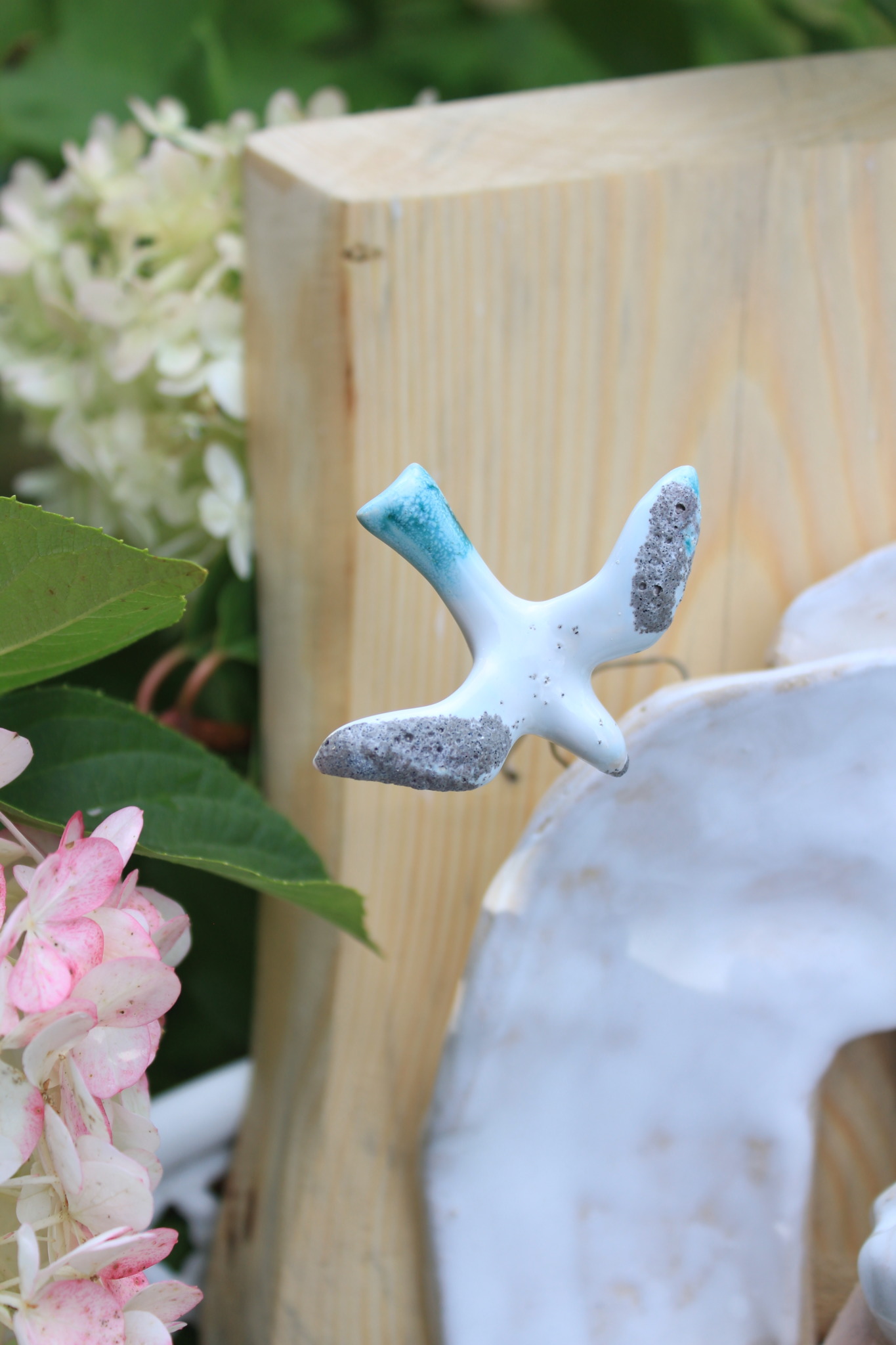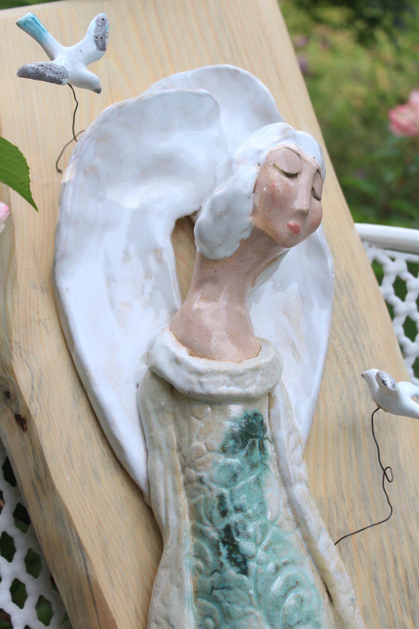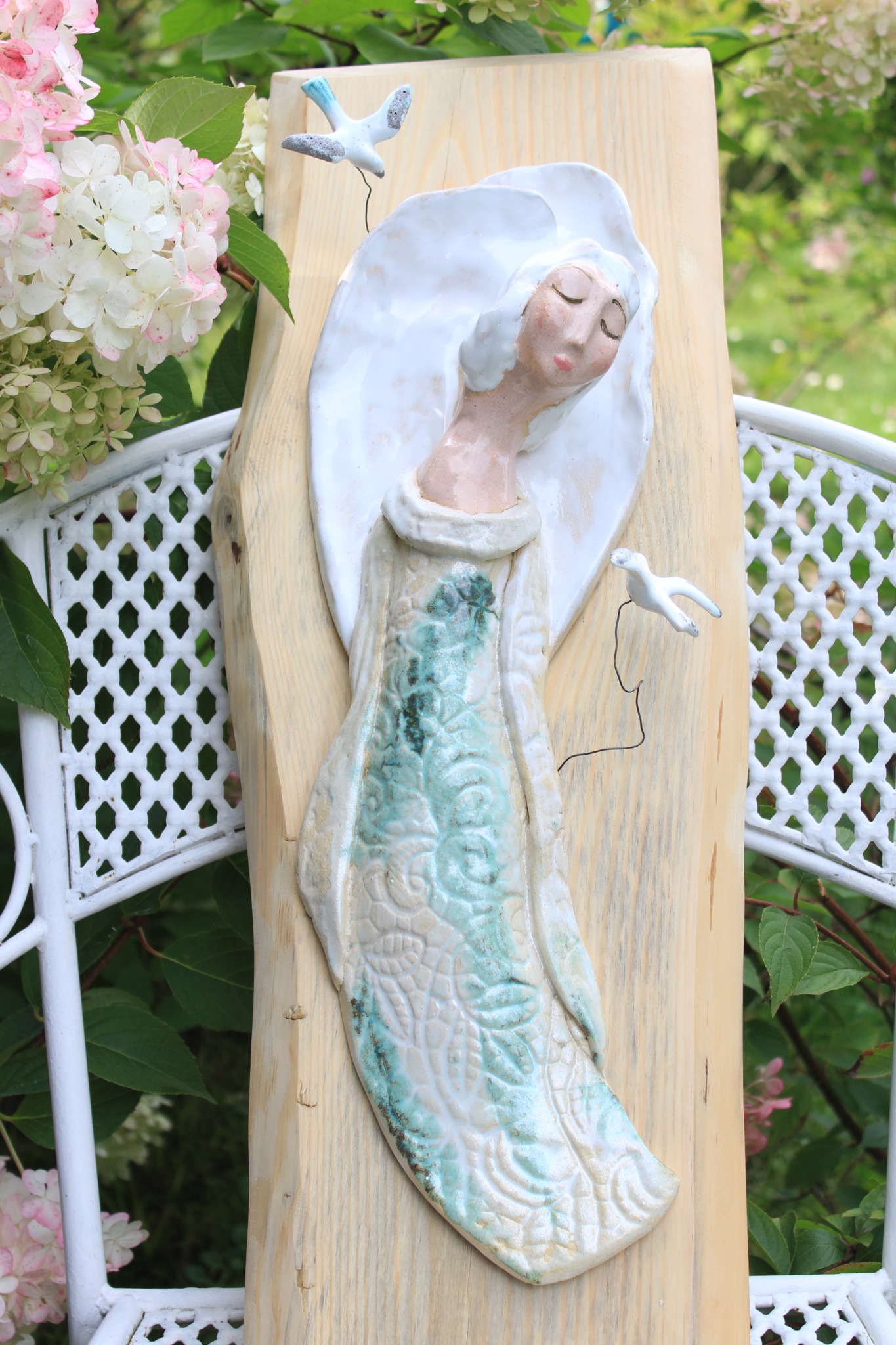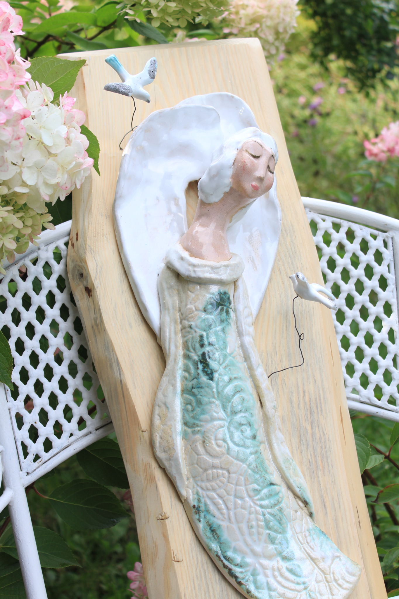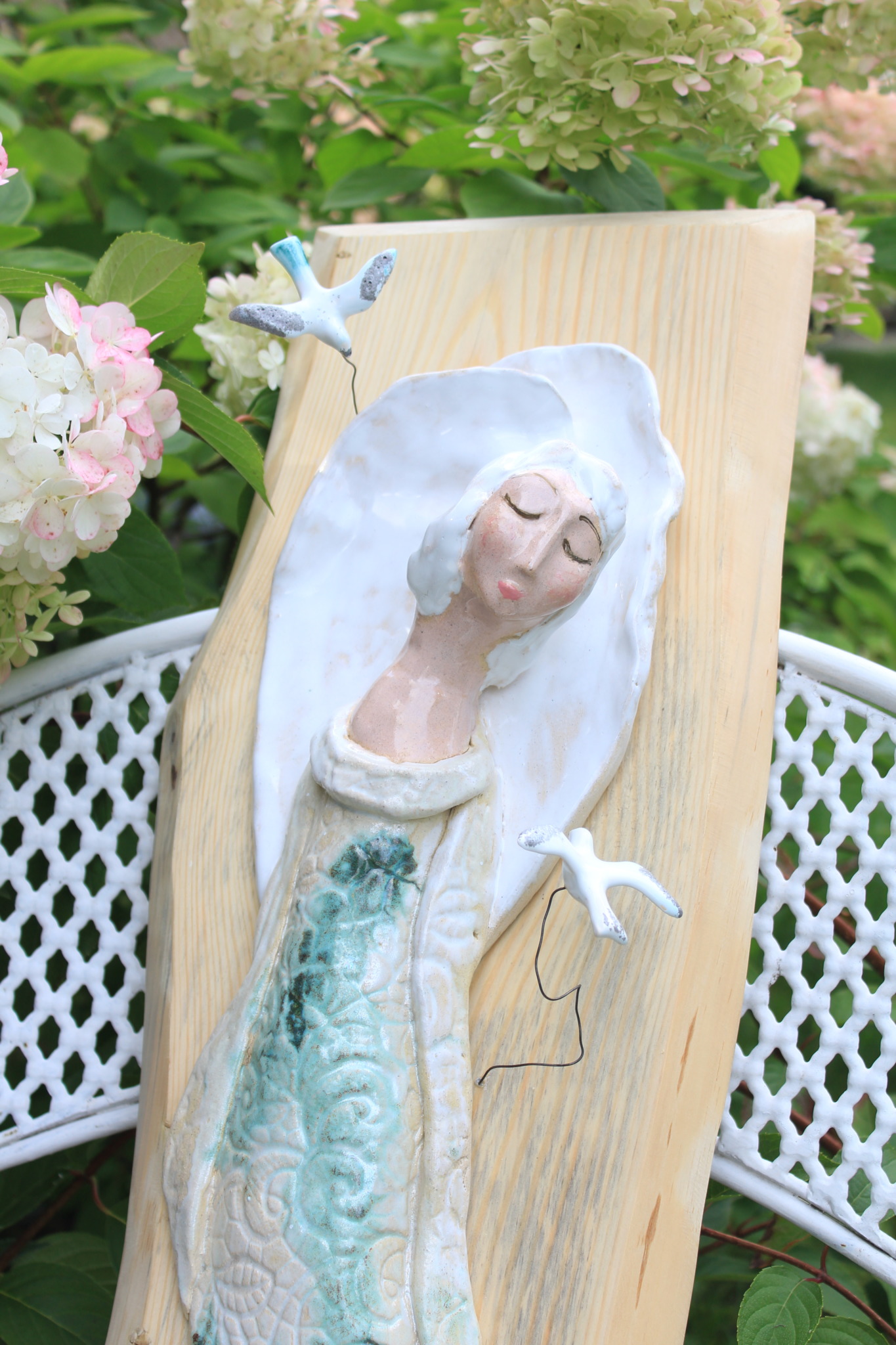 Ceramiczny anioł na desce wykonany ręcznie z gliny w pojedynczym egzemplarzu. Anioł jest całościowo szkliwiony i na stałe przyklejony do deski odpowiednio wcześniej zabezpieczonej. Z tyłu deski znajduje się stosowny otwór z blaszką do regulacji.