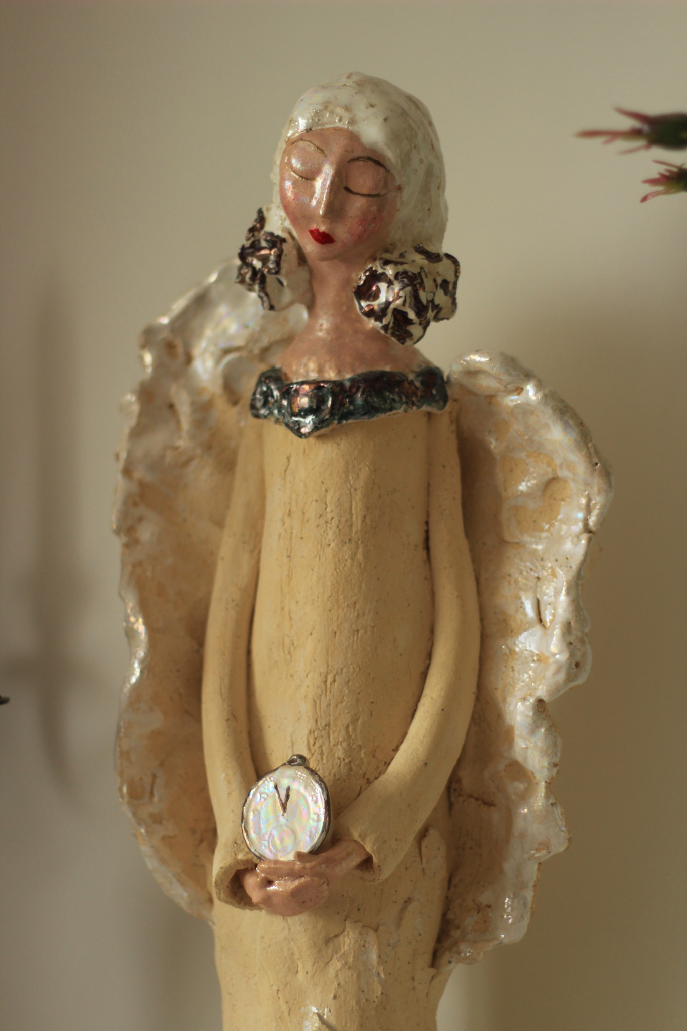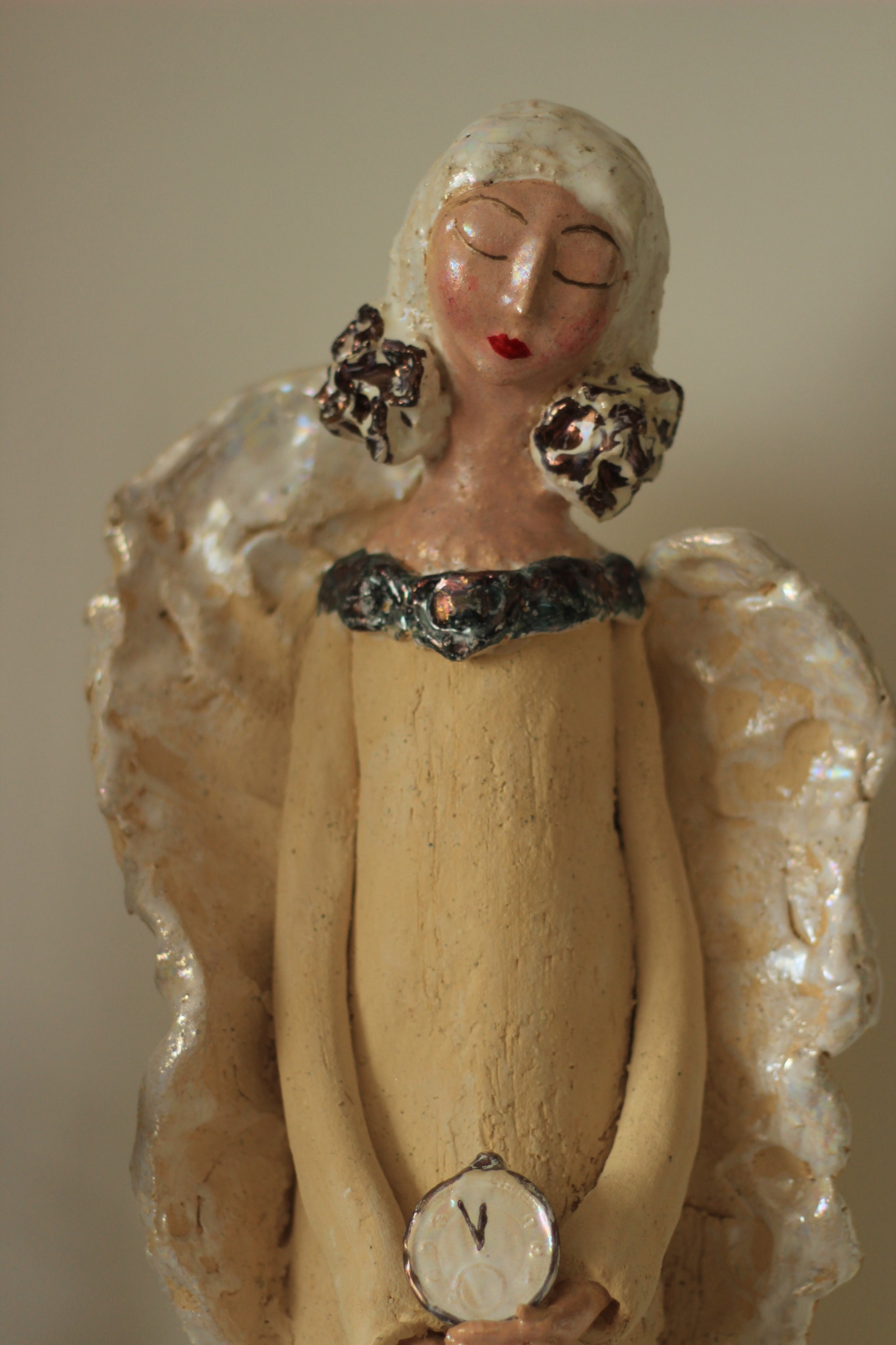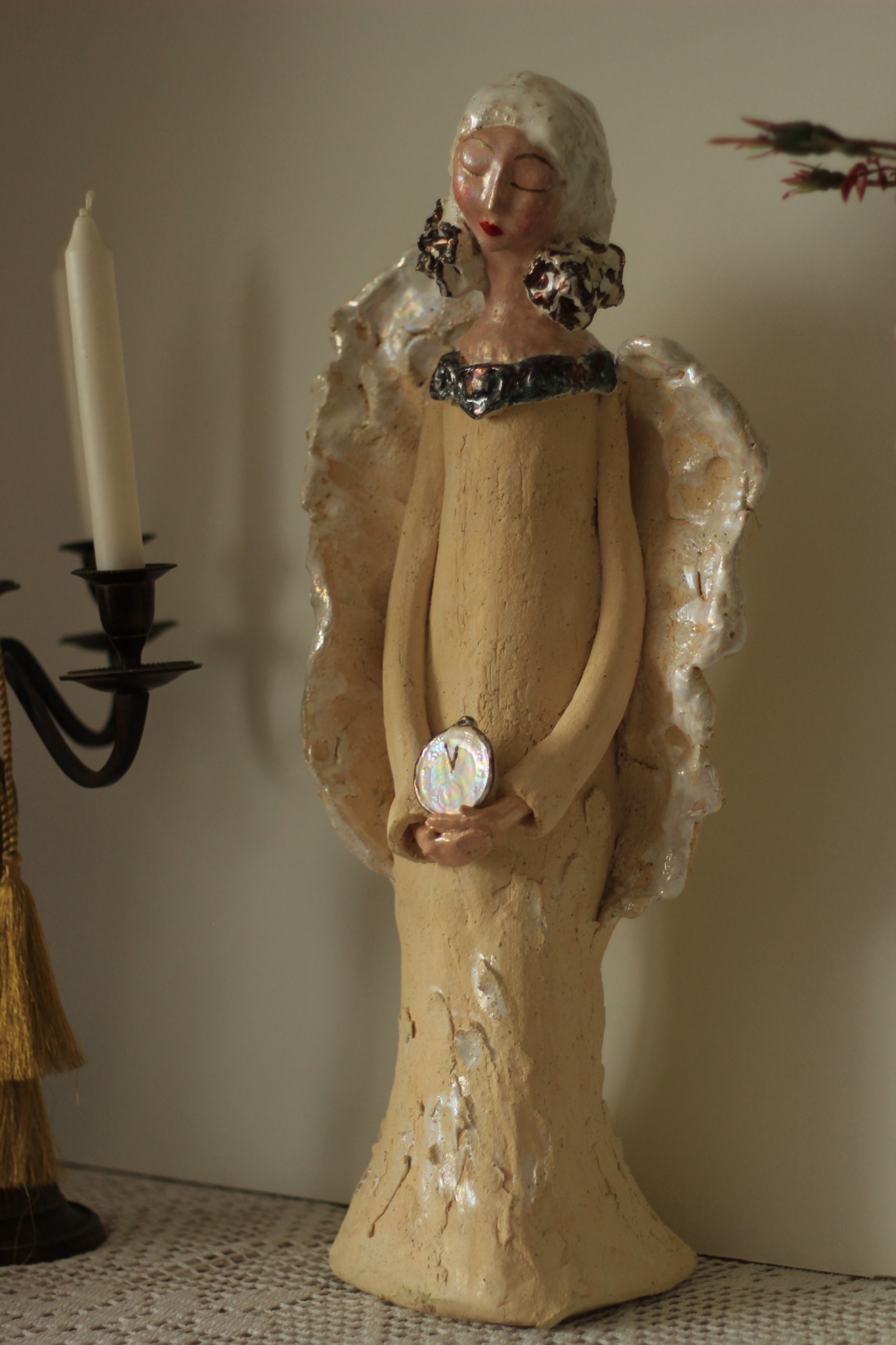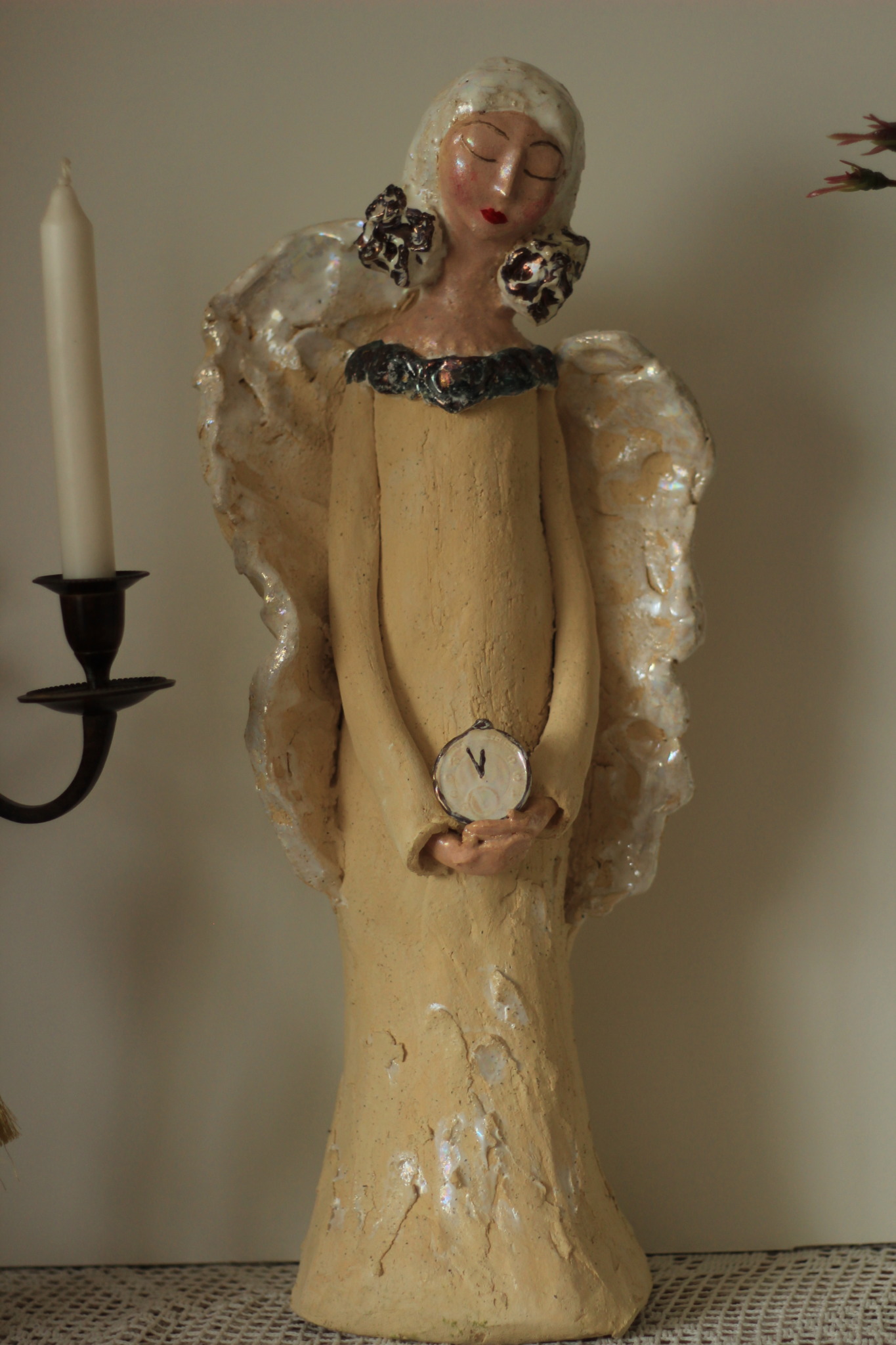 Anioł stojący, wykonany ręcznie w pojedynczym egzemplarzu z gliny szamotowej. Rzeźba całkowicie unikatowa, szkliwiona w detalach pokryta metalami szlachetnymi. Pięknie prezentuje się we wnętrzach, może być również idealna na prezent.