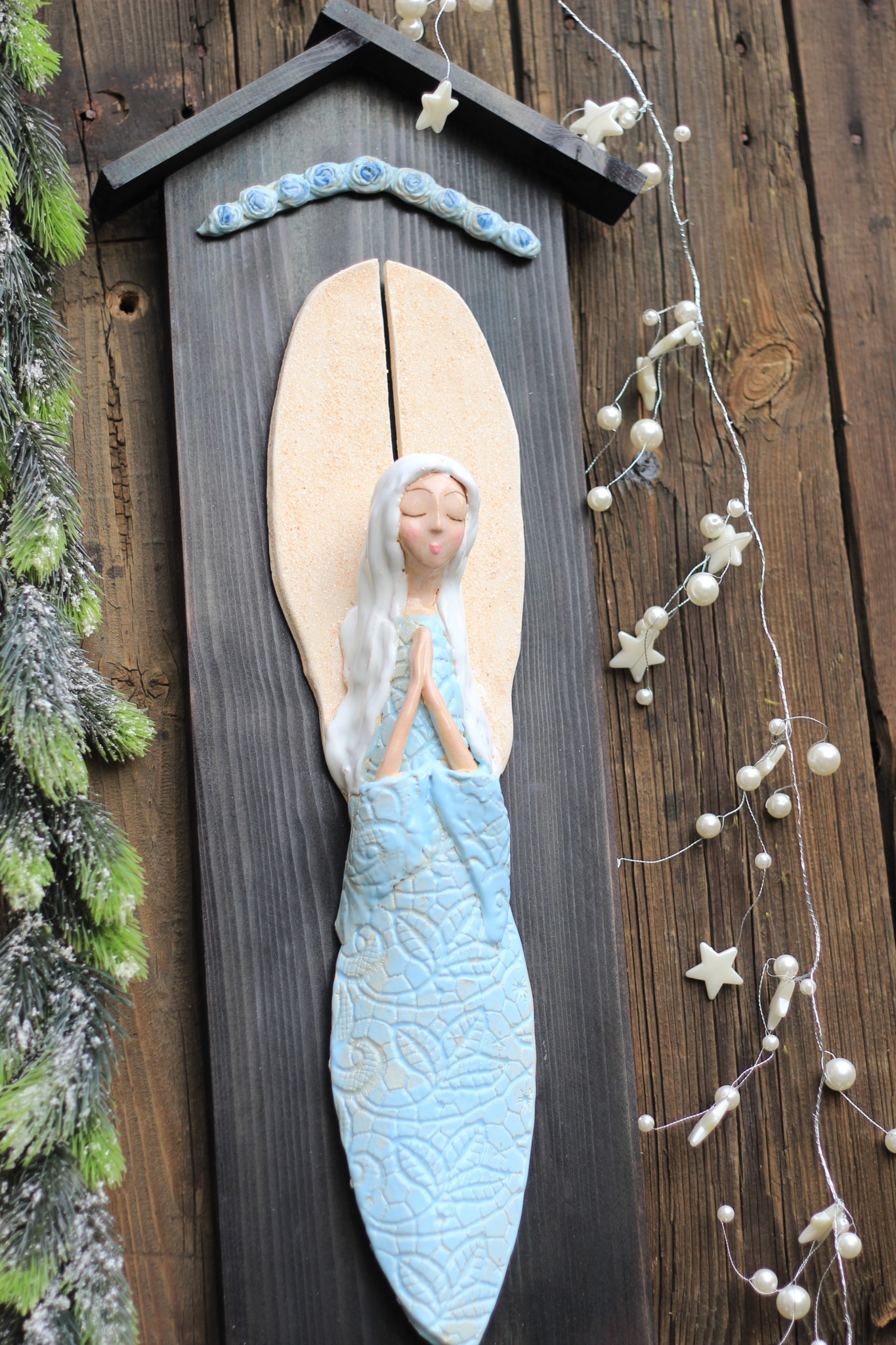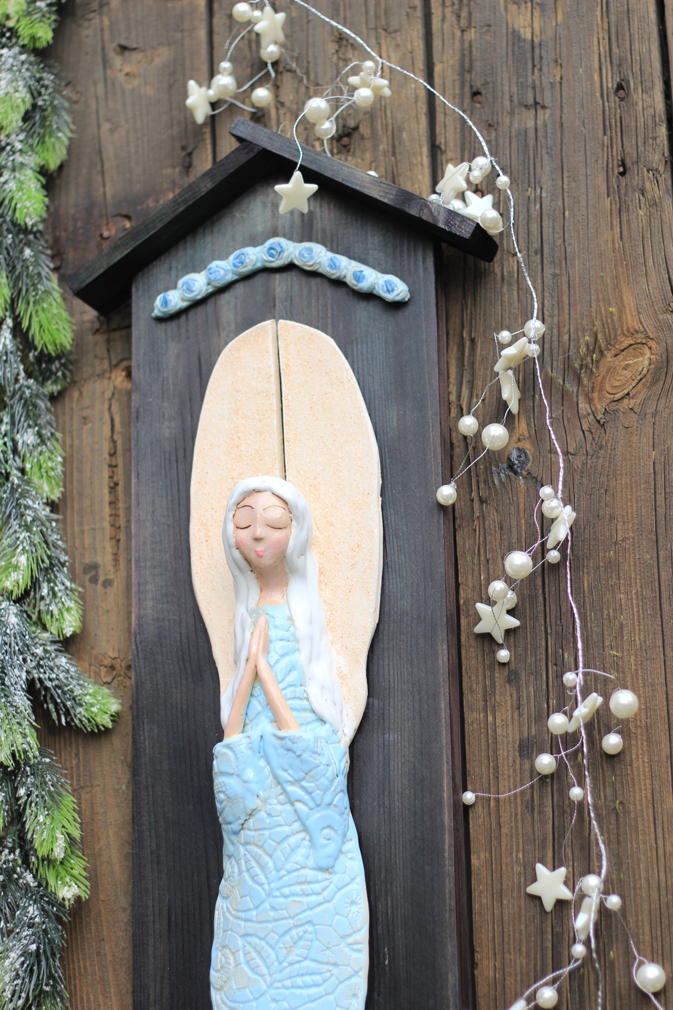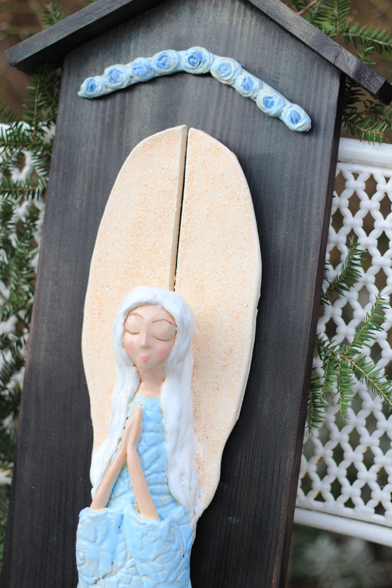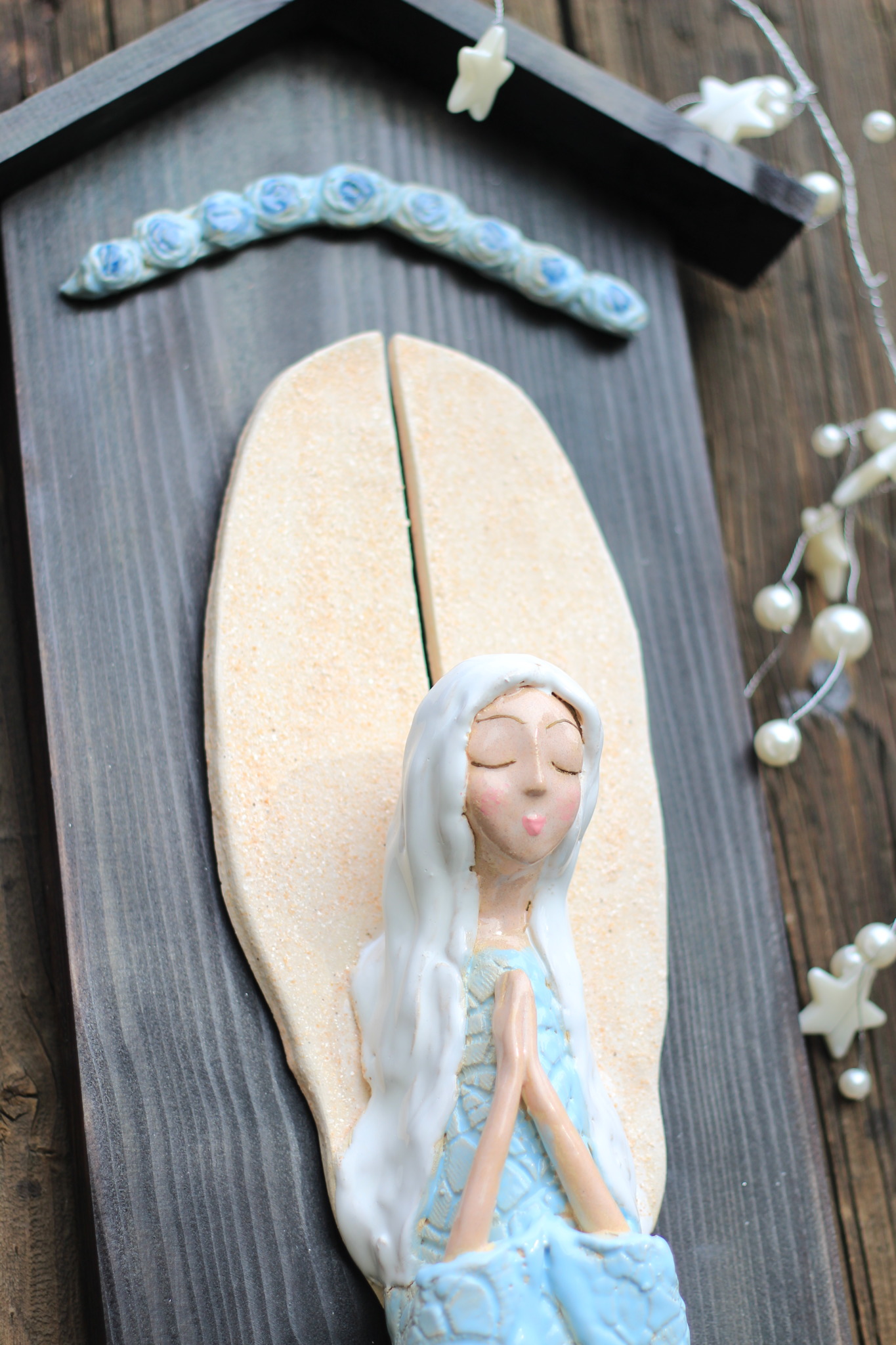 • Ceramiczny anioł na desce wykonany ręcznie z gliny w pojedynczym egzemplarzu. Anioł jest całościowo szkliwiony i na stałe przyklejony do deski w formie kapliczki odpowiednio wcześniej zabezpieczonej. Z tyłu deski znajduje się stosowny otwór z blaszką do regulacji.