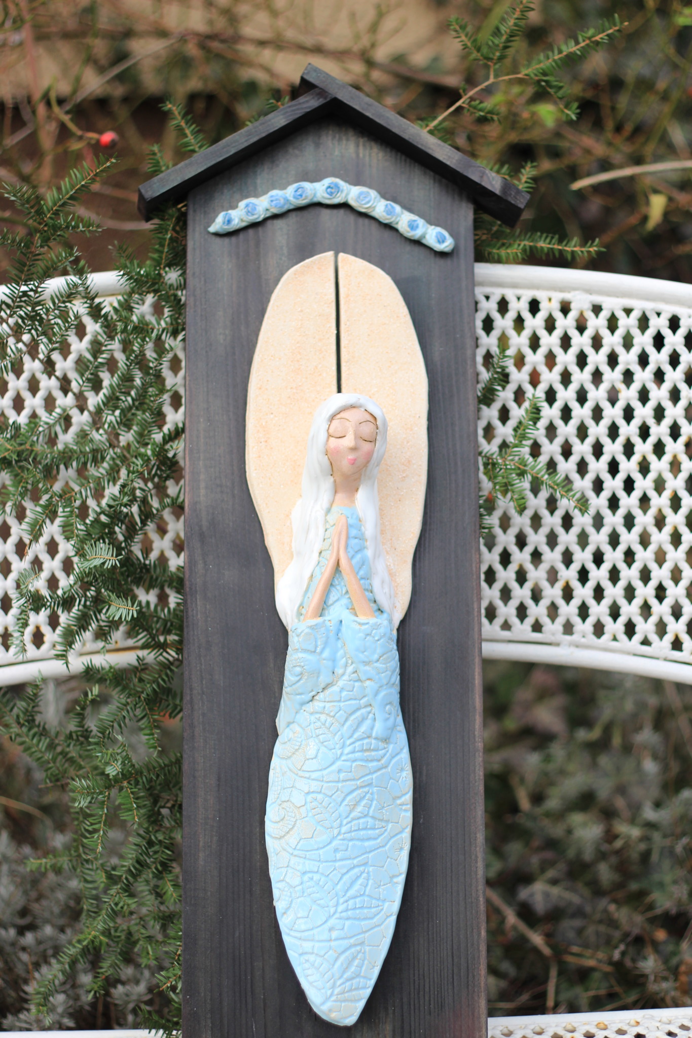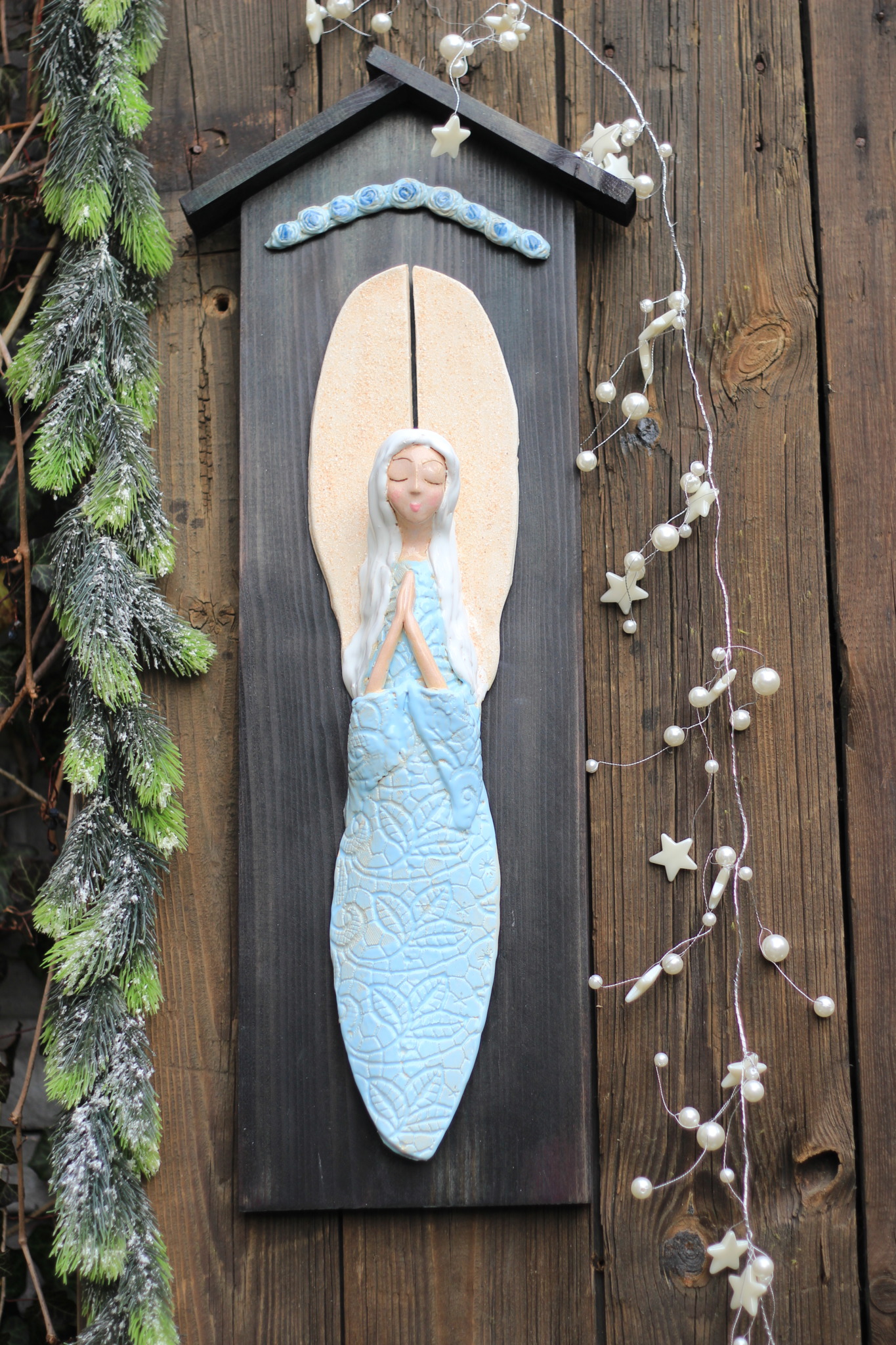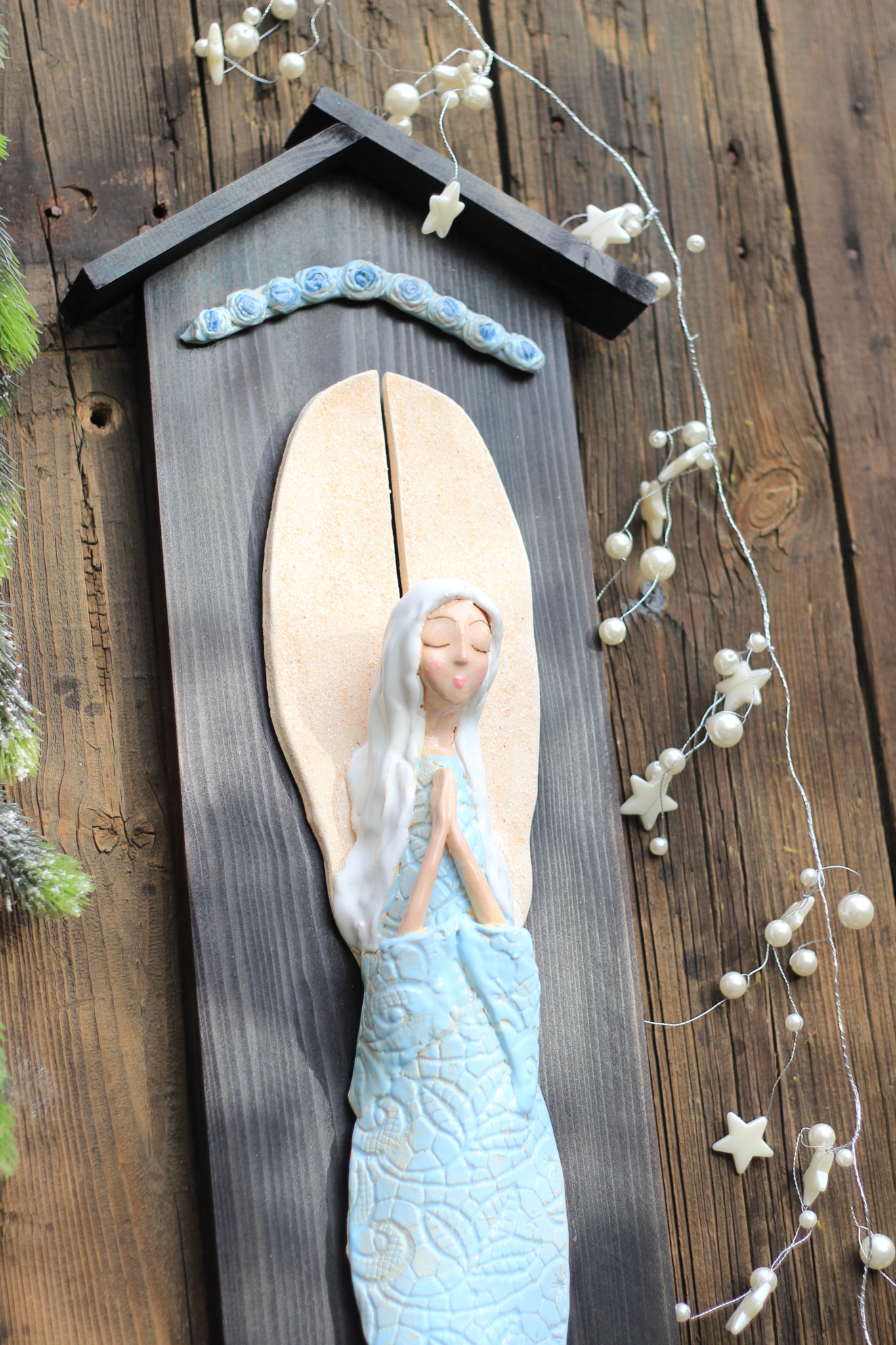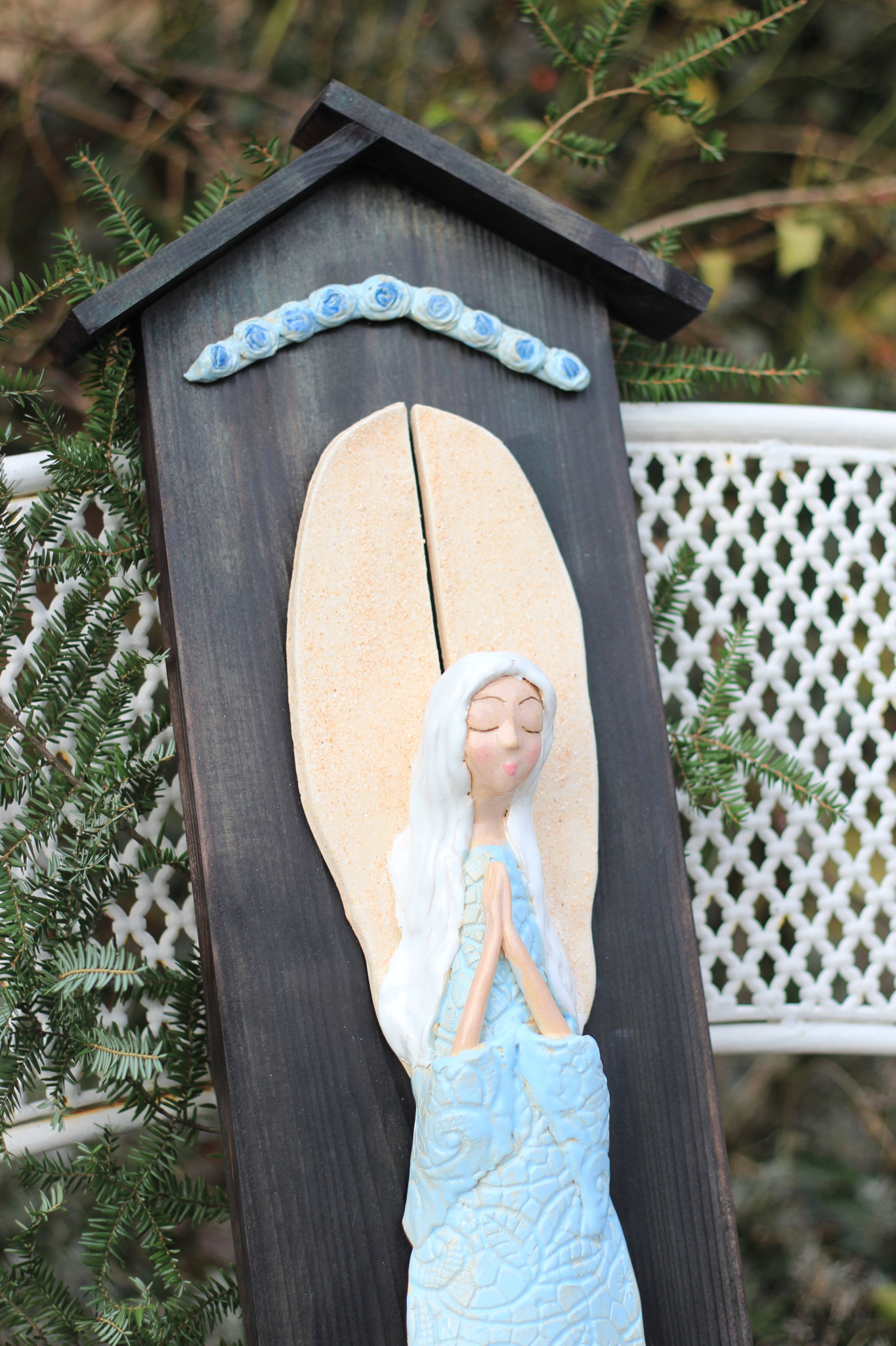 • Ceramiczny anioł na desce wykonany ręcznie z gliny w pojedynczym egzemplarzu. Anioł jest całościowo szkliwiony i na stałe przyklejony do deski w formie kapliczki odpowiednio wcześniej zabezpieczonej. Z tyłu deski znajduje się stosowny otwór z blaszką do regulacji.