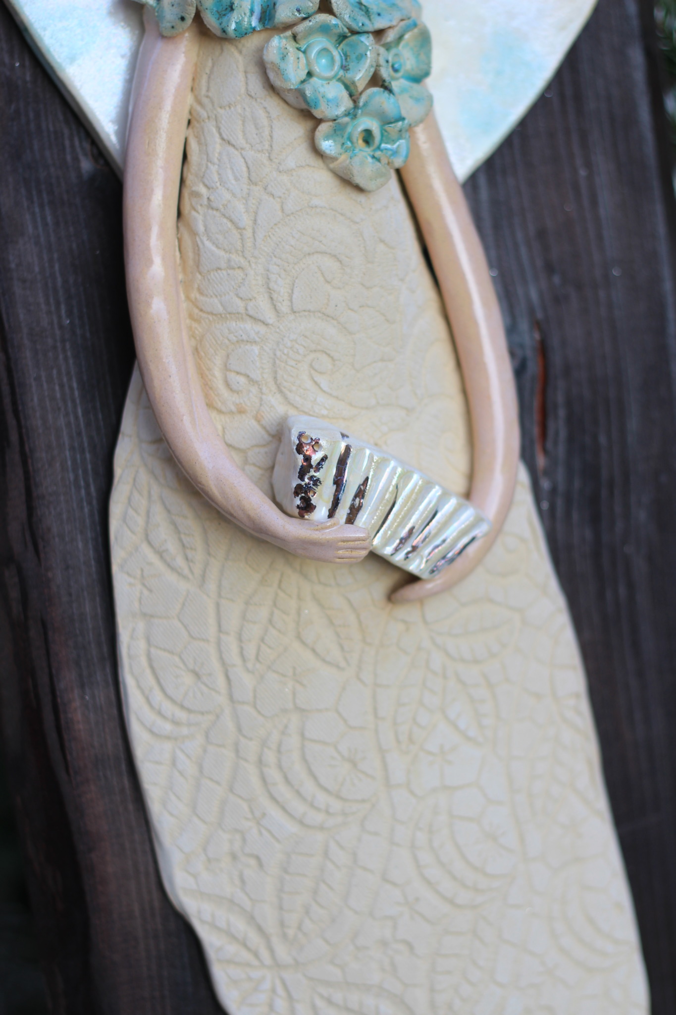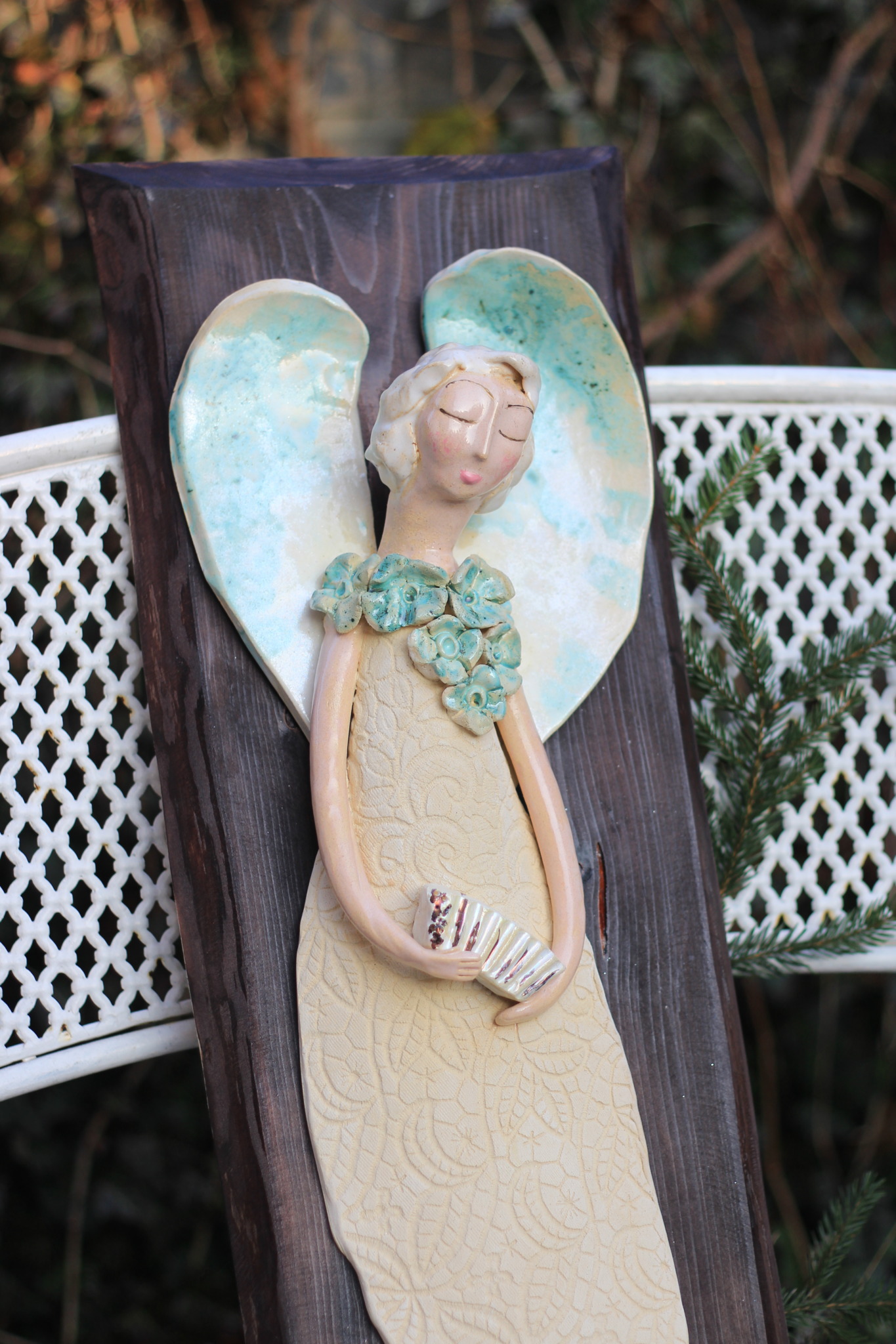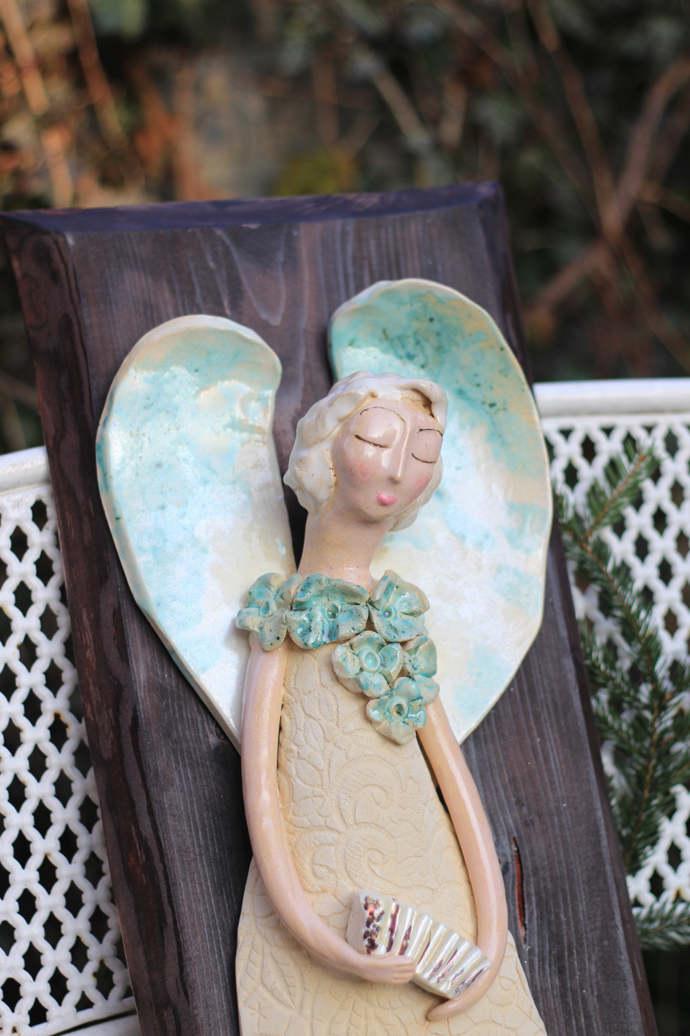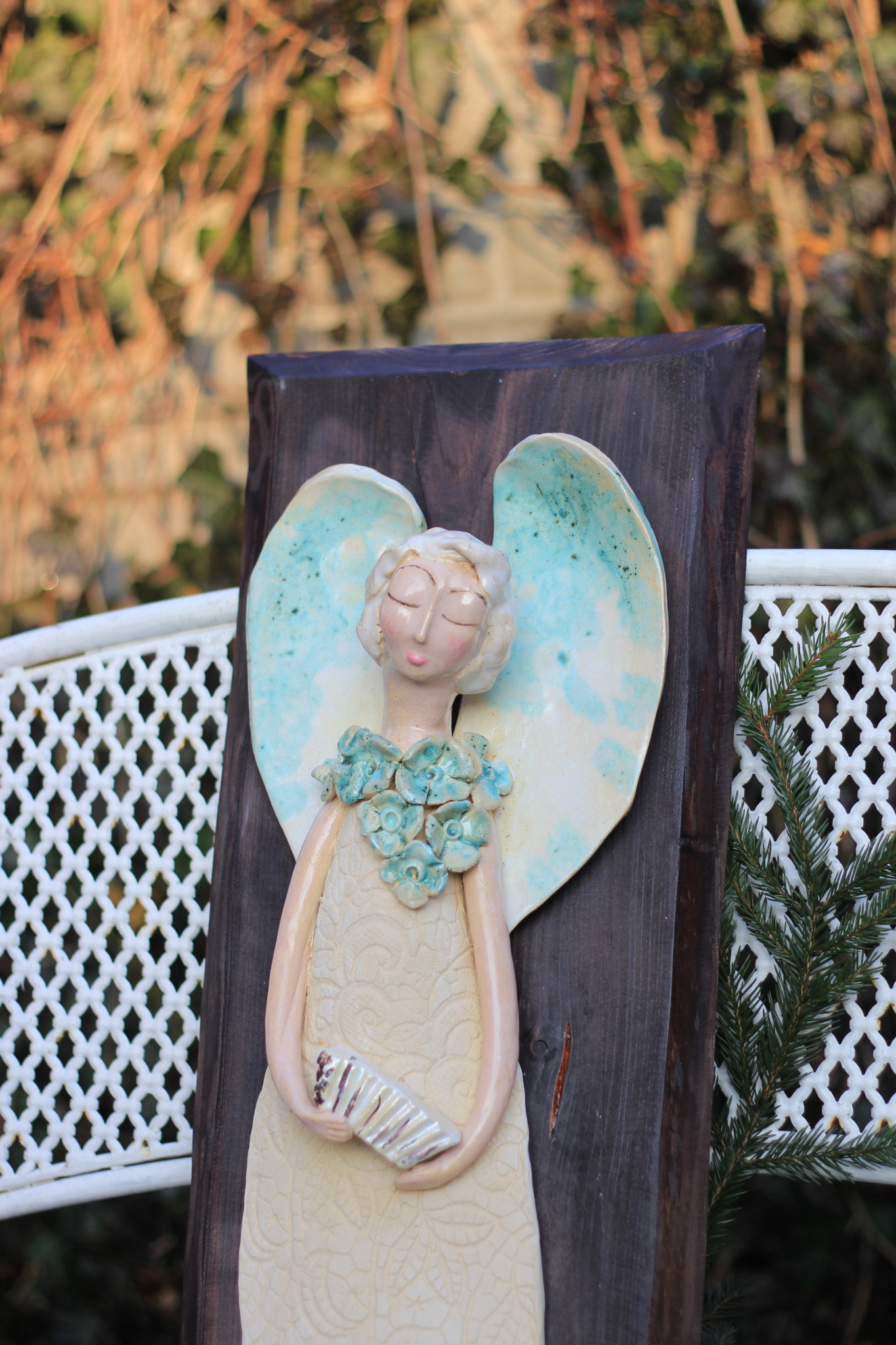Ceramiczny anioł na desce wykonany ręcznie z gliny w pojedynczym egzemplarzu. Anioł jest całościowo szkliwiony i na stałe przyklejony do deski w formie kapliczki odpowiednio wcześniej zabezpieczonej. Z tyłu deski znajduje się stosowny otwór z blaszką do regulacji.