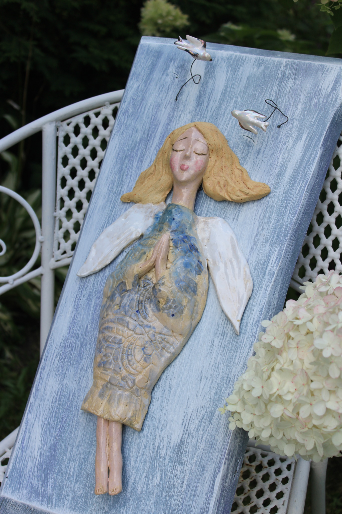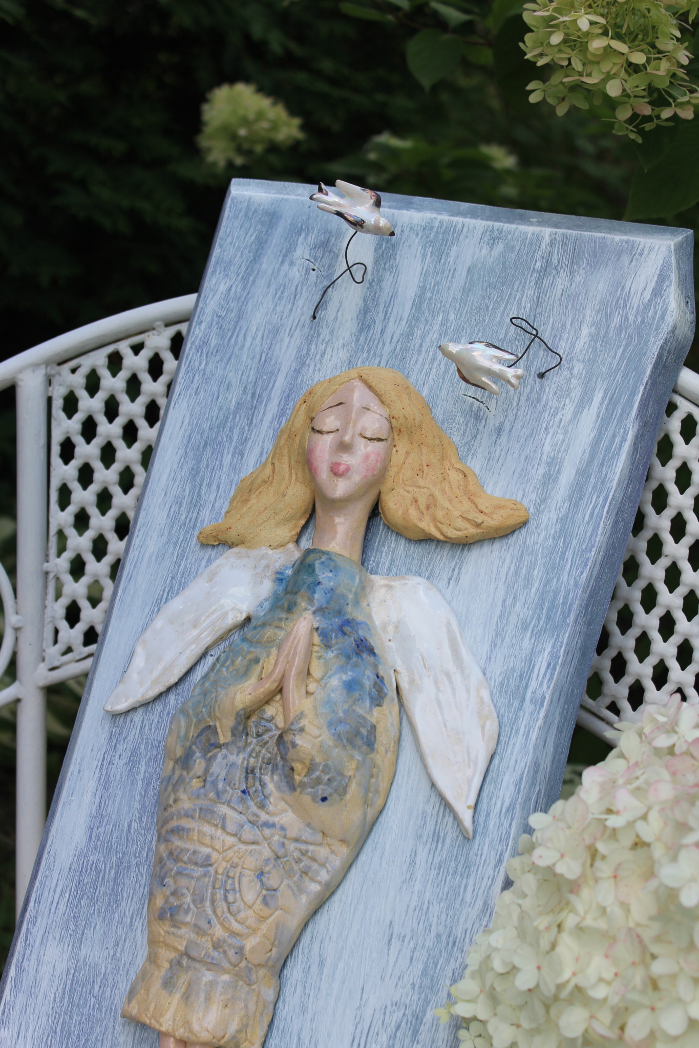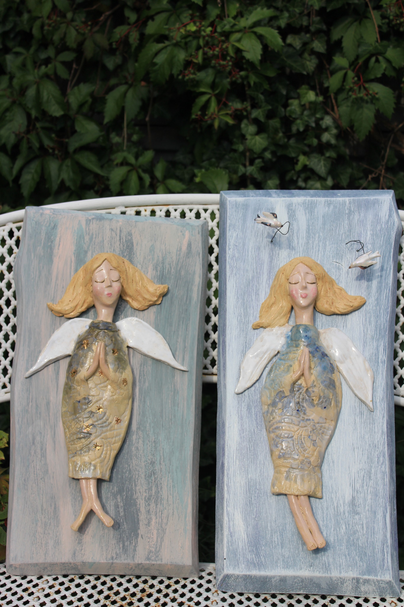 • Ceramiczny anioł na desce wykonany ręcznie z gliny w pojedynczym egzemplarzu. Anioł jest całościowo szkliwiony i na stałe przyklejony do deski odpowiednio wcześniej zabezpieczonej. Z tyłu deski znajduje się stosowny otwór z blaszką do regulacji.