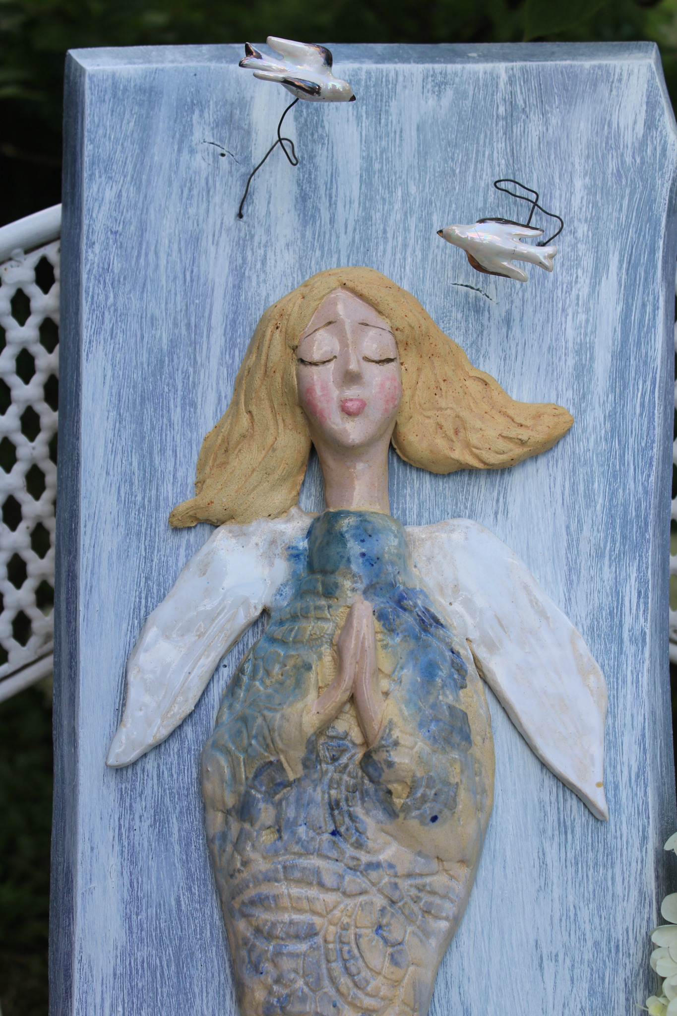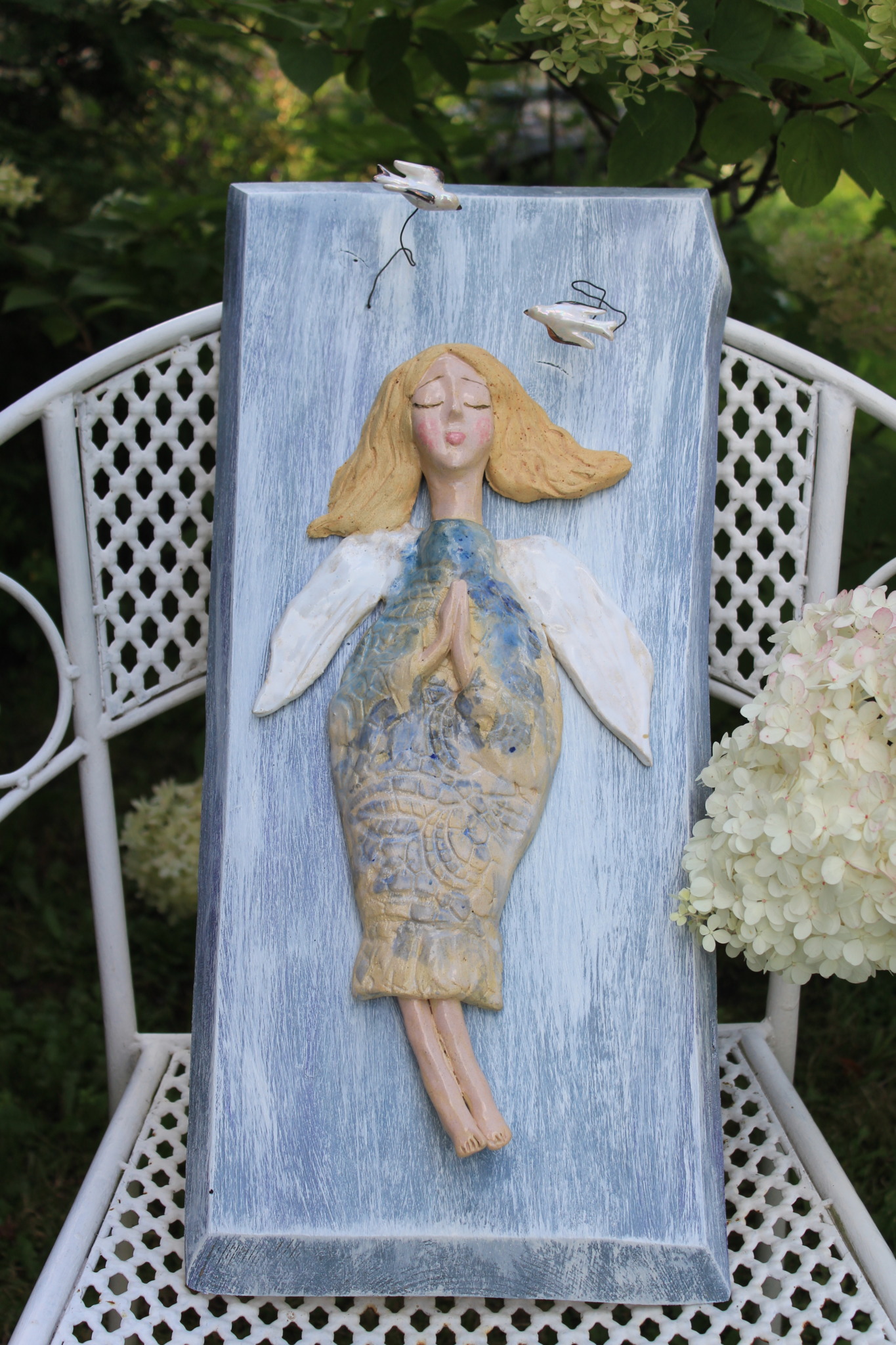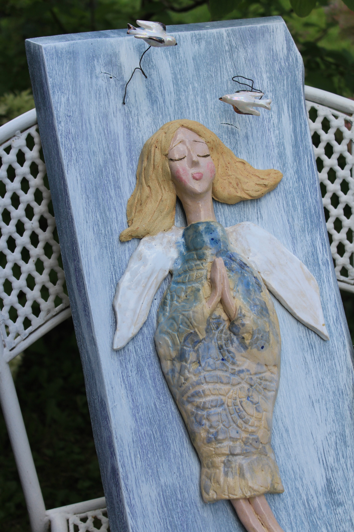• Ceramiczny anioł na desce wykonany ręcznie z gliny w pojedynczym egzemplarzu. Anioł jest całościowo szkliwiony i na stałe przyklejony do deski odpowiednio wcześniej zabezpieczonej. Z tyłu deski znajduje się stosowny otwór z blaszką do regulacji.