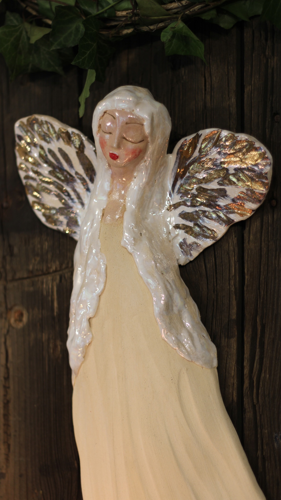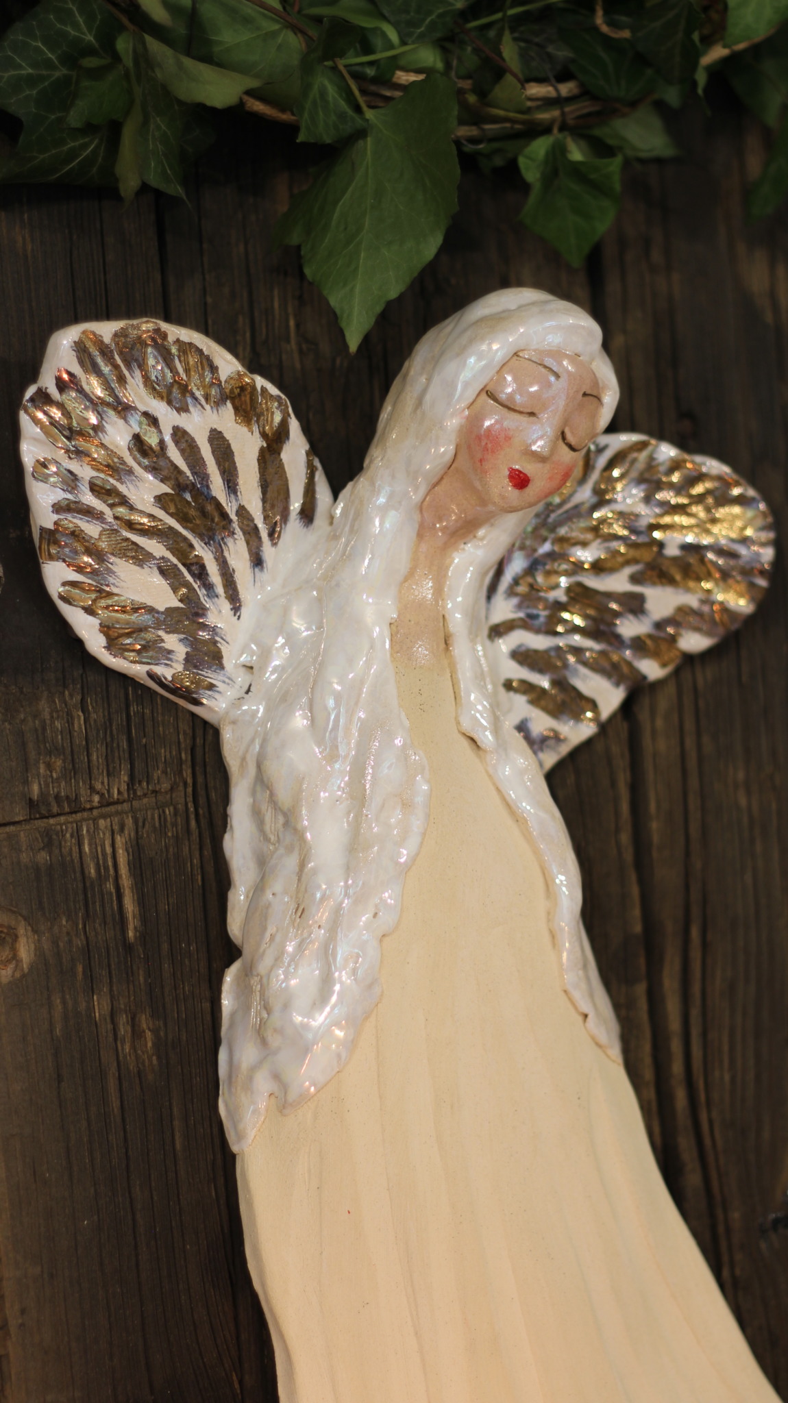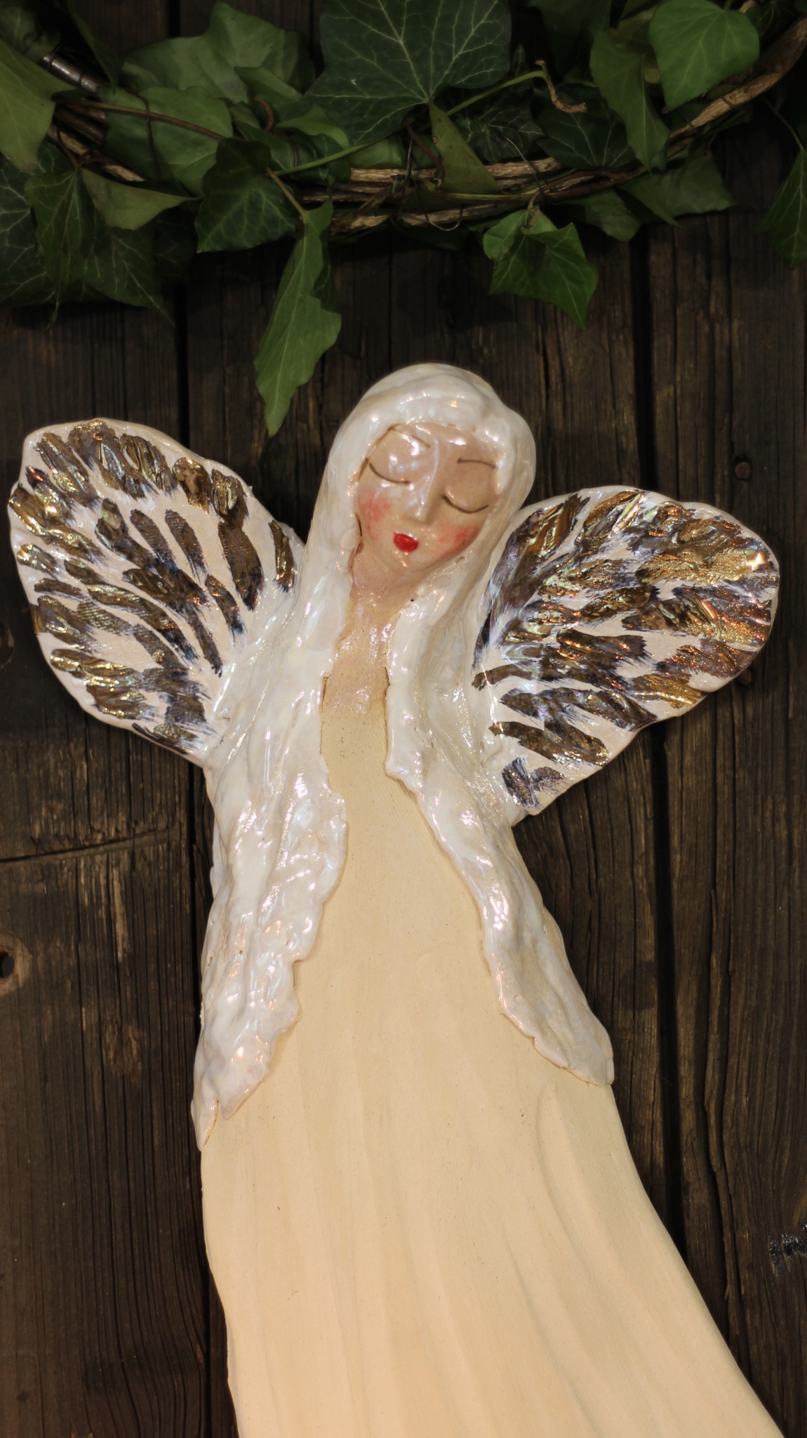 Anioł ceramiczny, wykonany ręcznie z gliny w pojedynczym egzemplarzu. Trzykrotnie wypalany, szkliwiony a w detalach pokryty złotem i metalami szlachetnymi. Stanowi świetną propozycję dla unikatowego prezentu dla bliskiej osoby oraz oryginalną ozdobę ścienną.