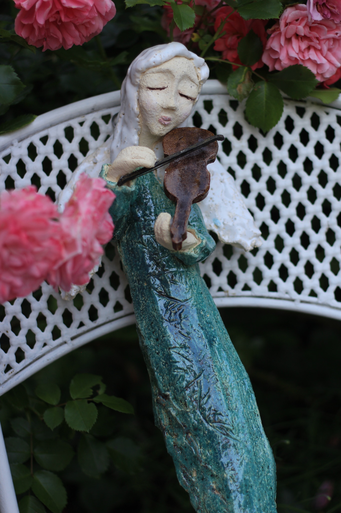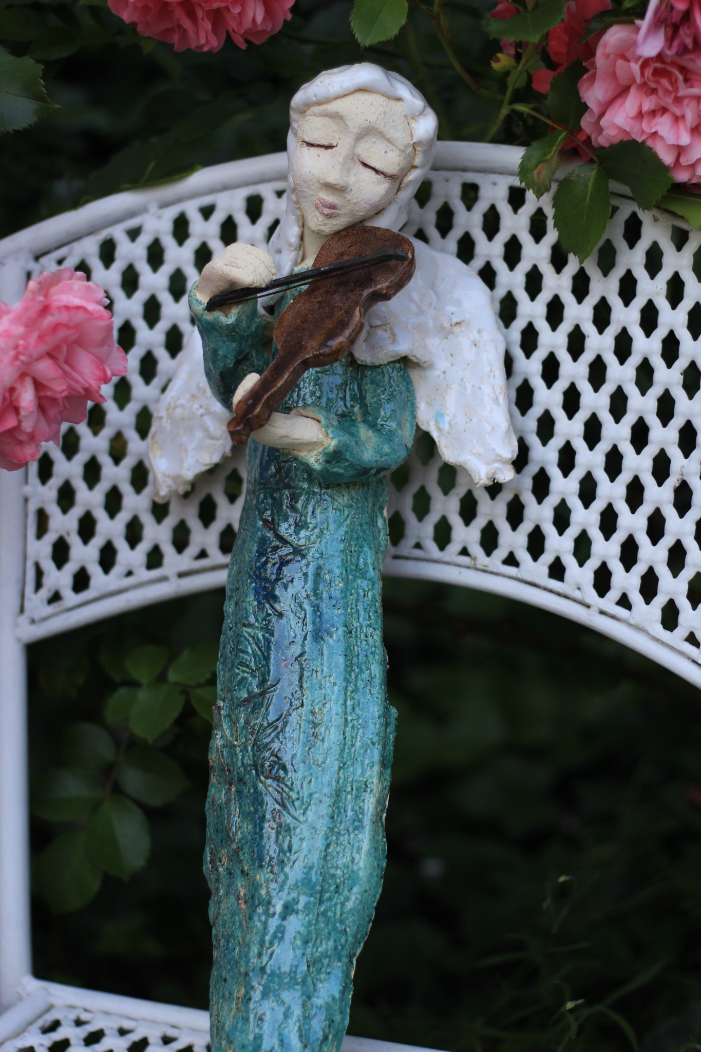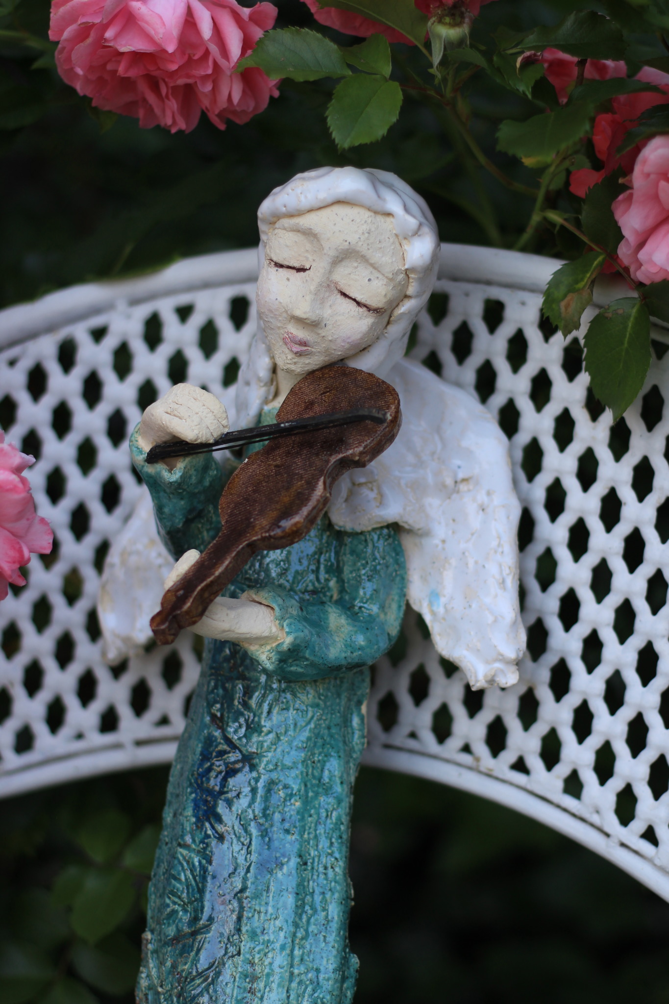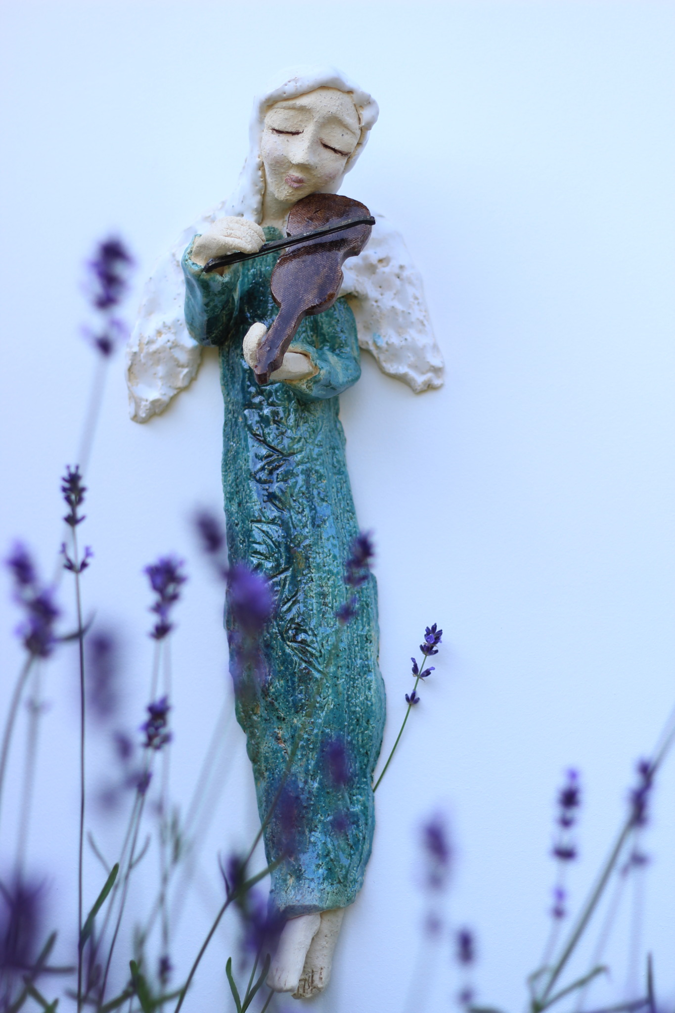 Anielski skrzypek, wykonany ręcznie z gliny w pojedynczym egzemplarzu. Dwukrotnie wypalany oraz szkliwiony. Stanowi świetną propozycję dla unikatowego prezentu dla bliskiej osoby oraz nietuzinkową ozdobę ścienną.
