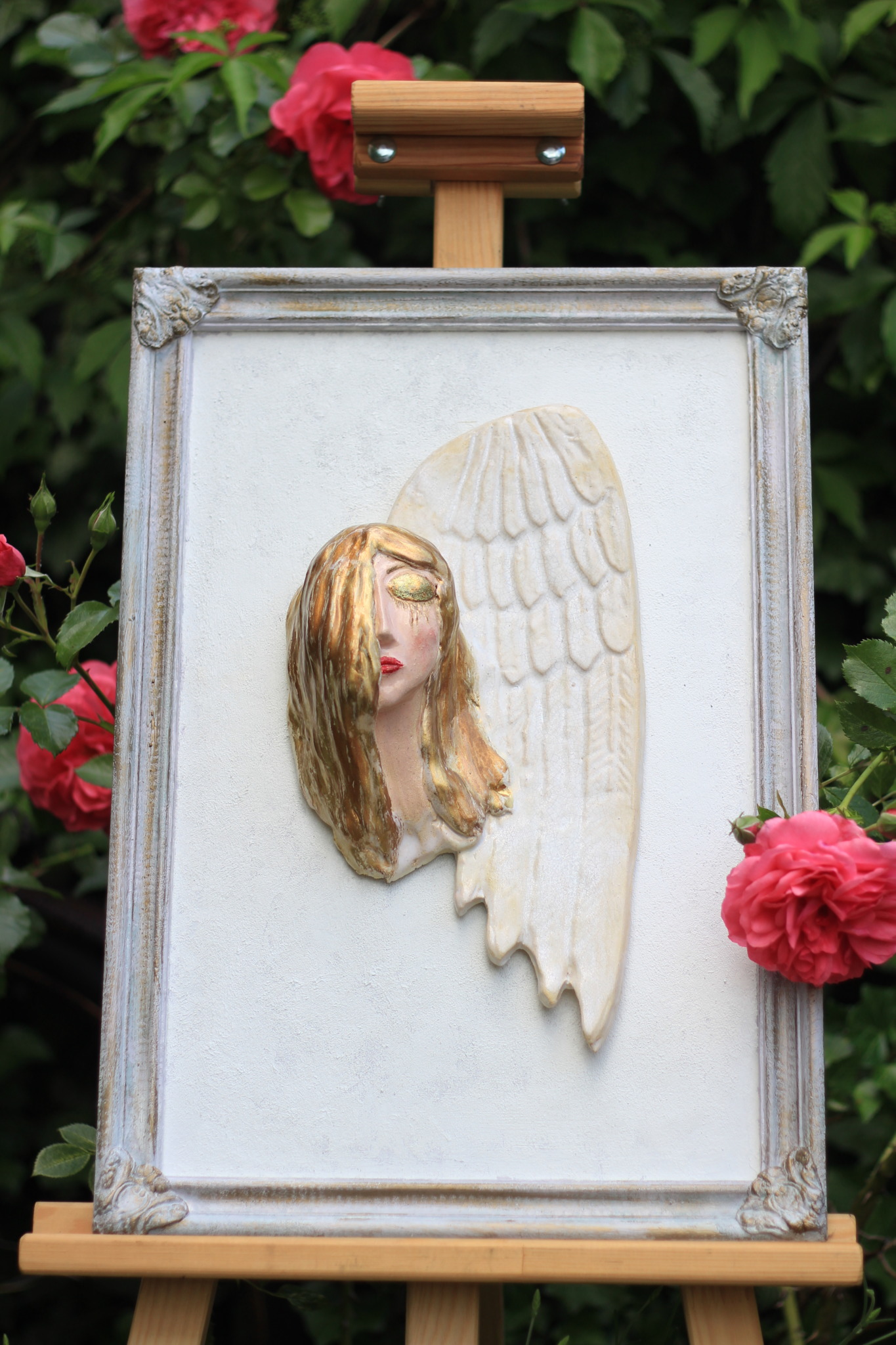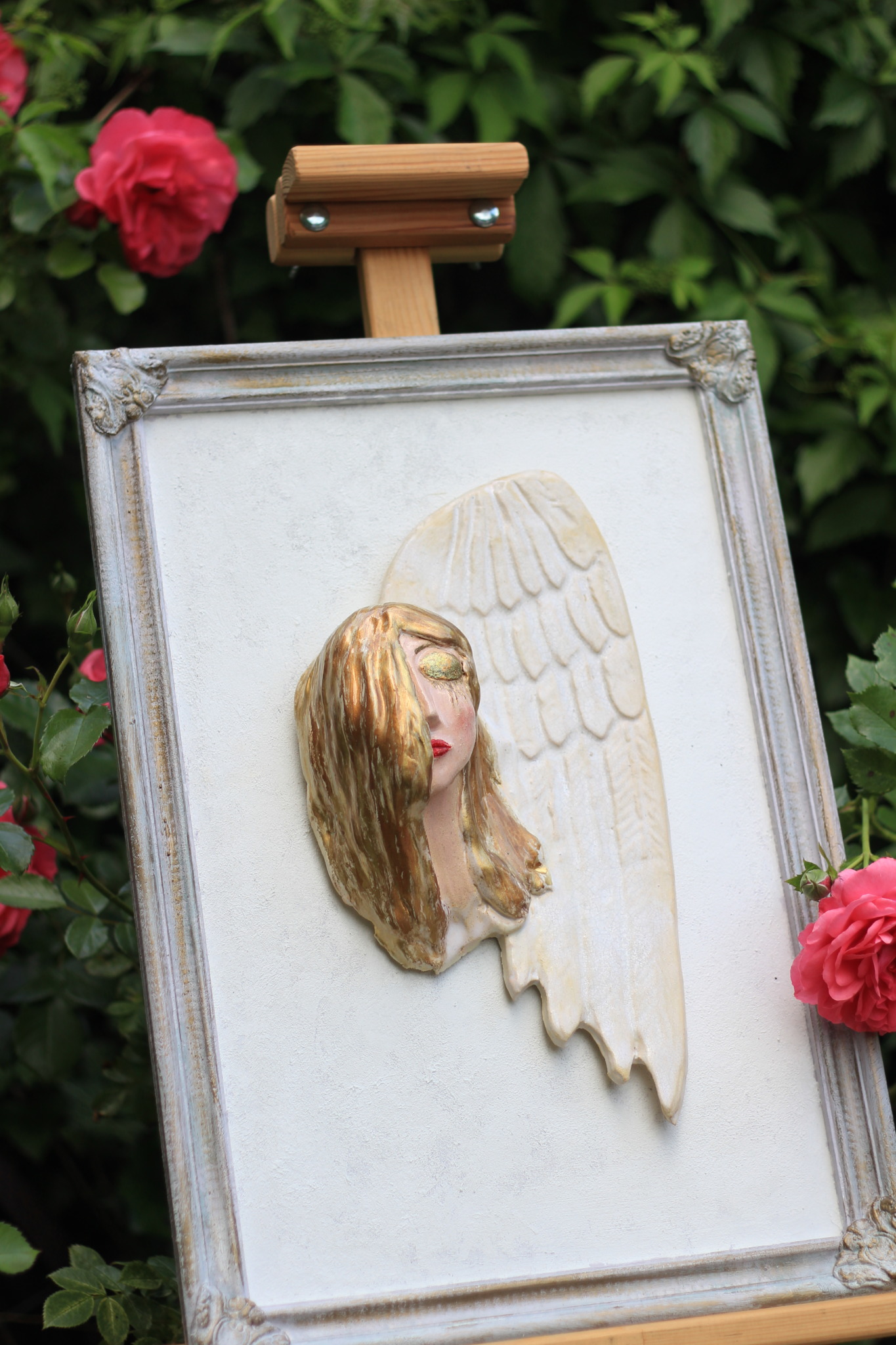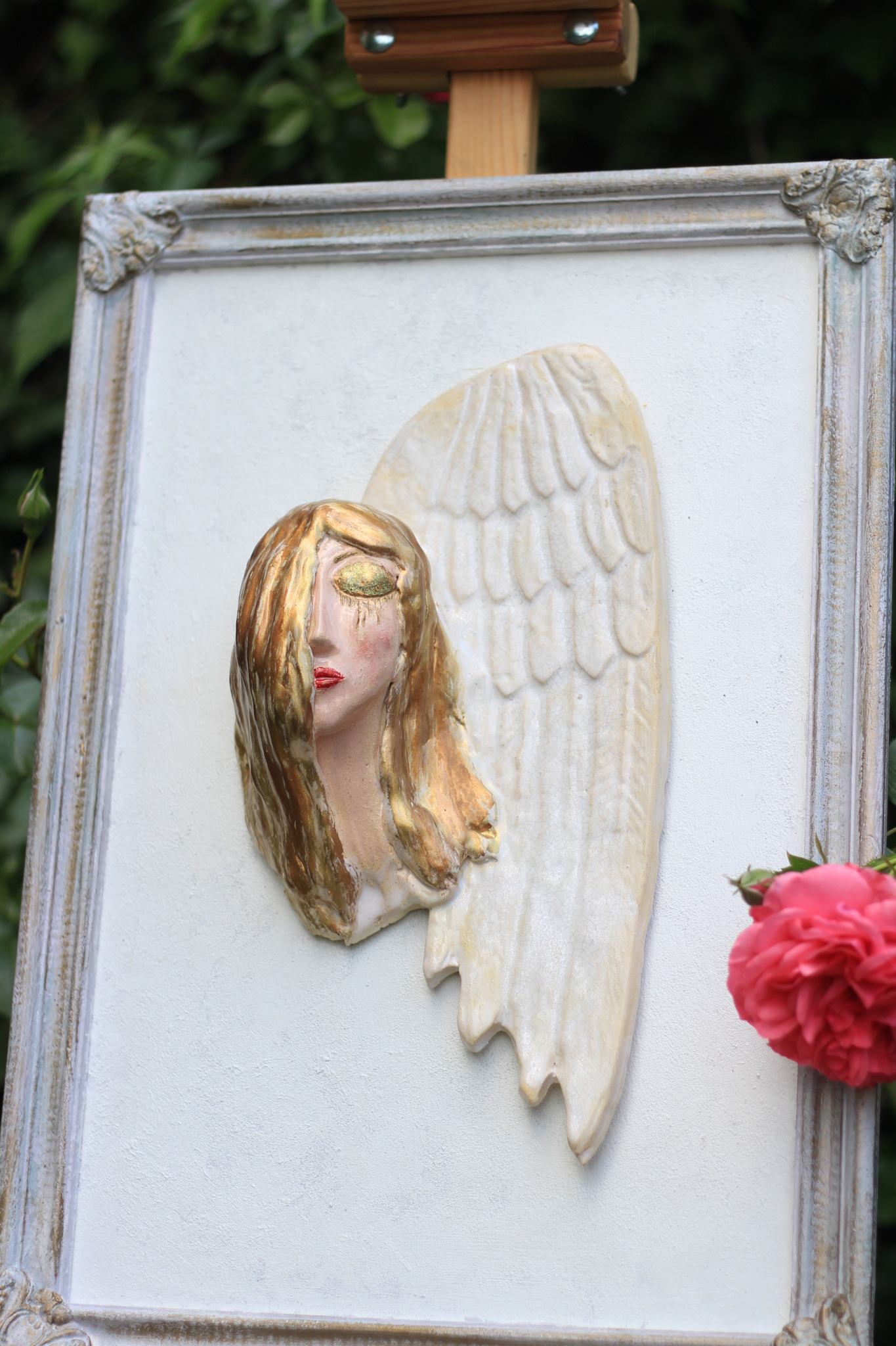 Anioł z jednym skrzydłem, ceramiczna rzeźba anioła szkliwiona, wykonana w jednym egzemplarzu  umieszczona w ramie jest niebanalną ozdobą mieszkania czy idealnym prezentem.