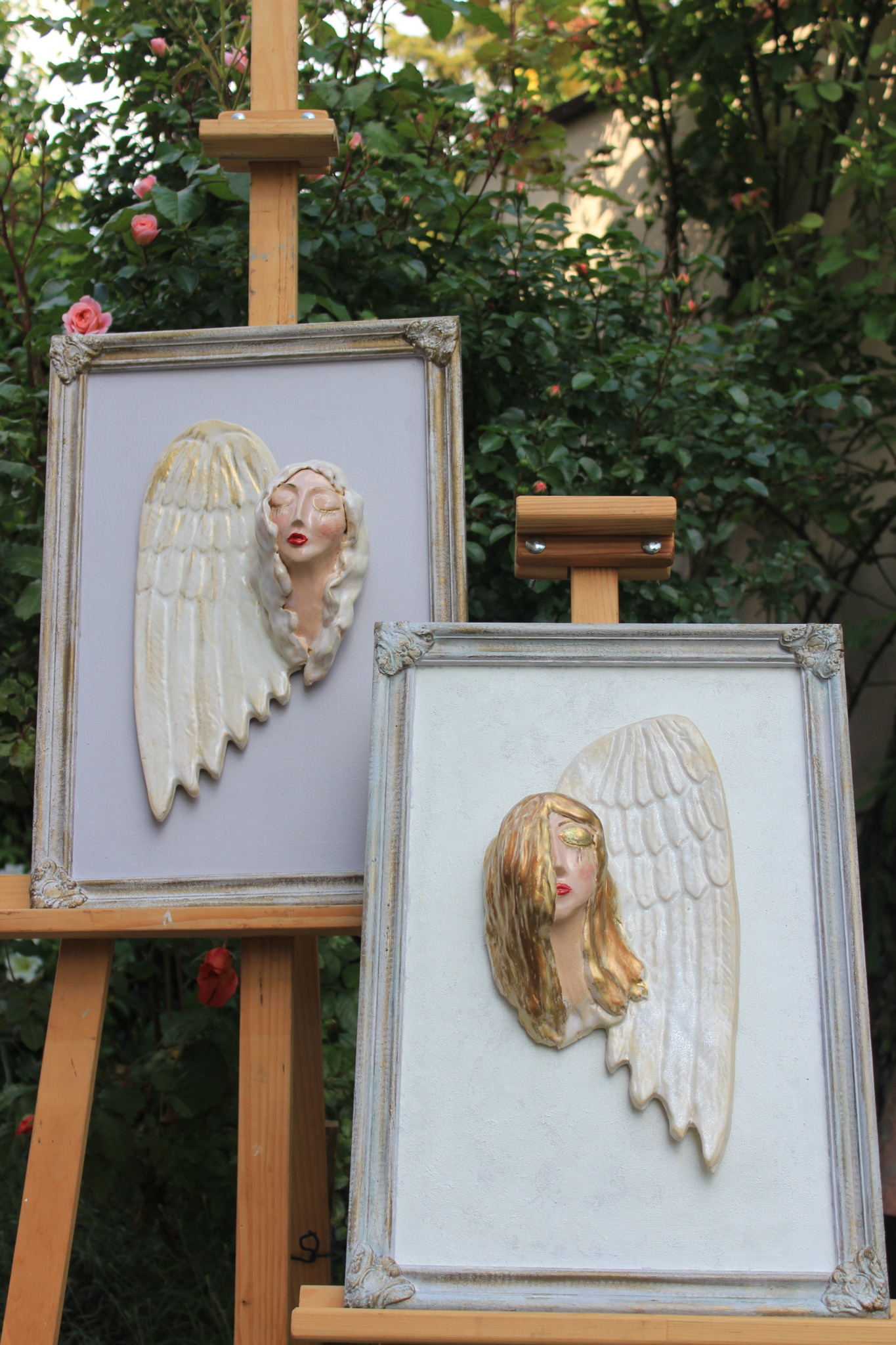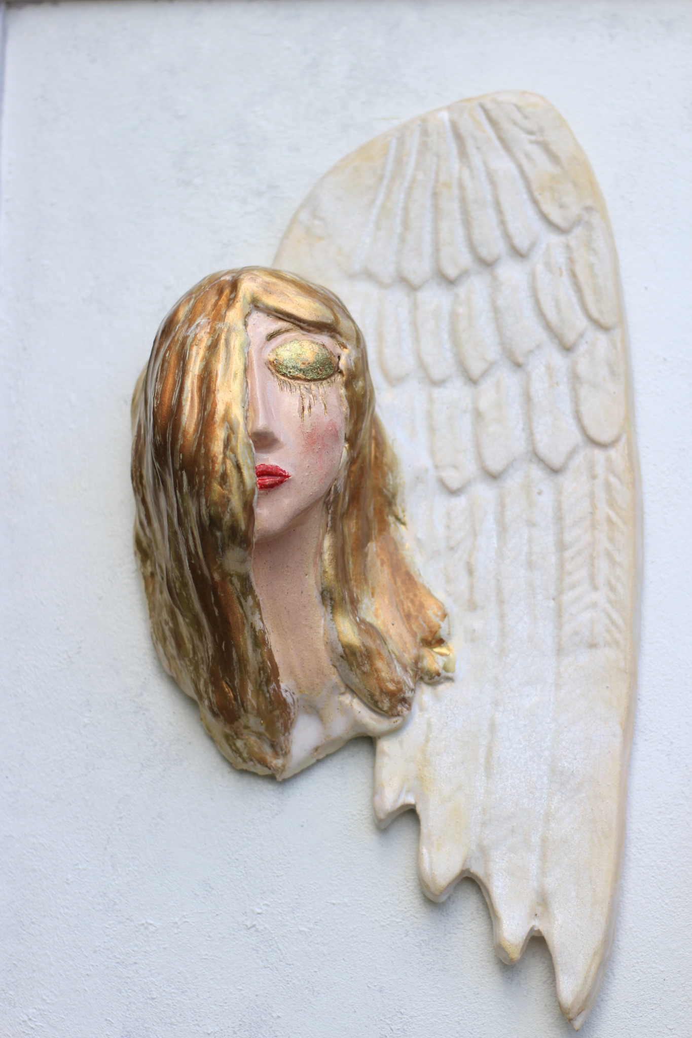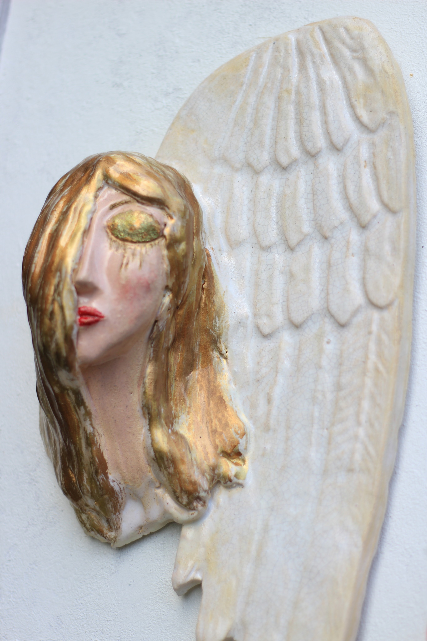Anioł z jednym skrzydłem, ceramiczna rzeźba anioła szkliwiona, wykonana w jednym egzemplarzu  umieszczona w ramie jest niebanalną ozdobą mieszkania czy idealnym prezentem.
