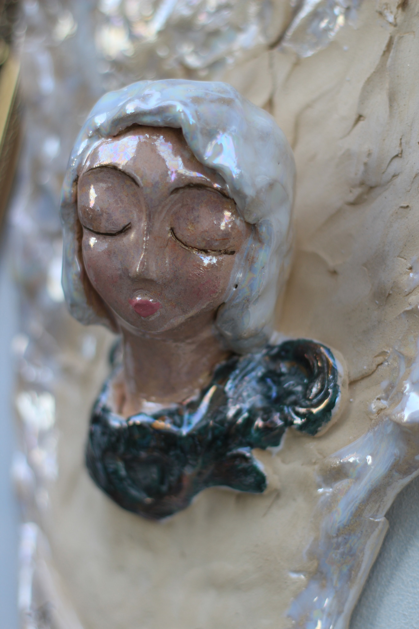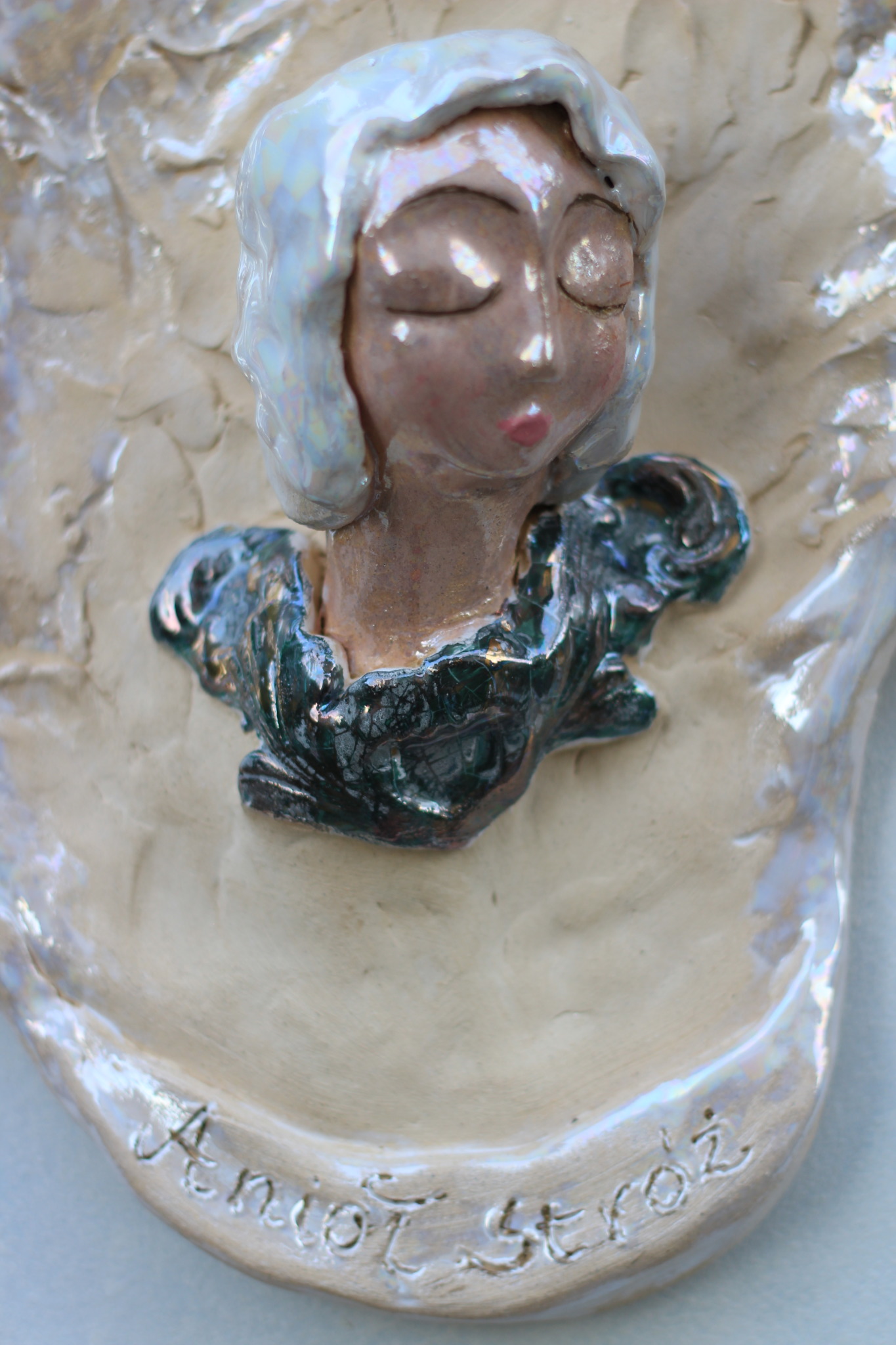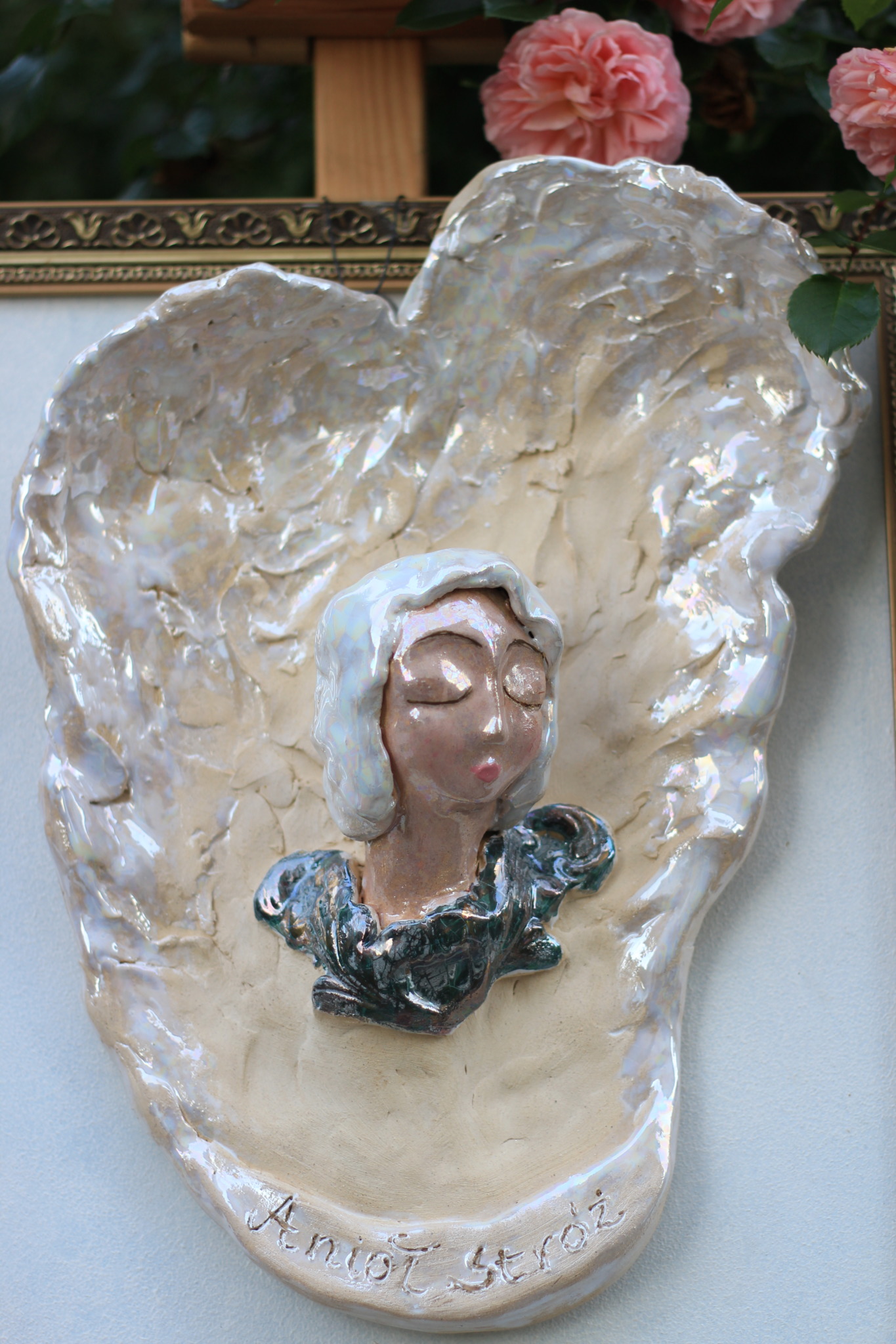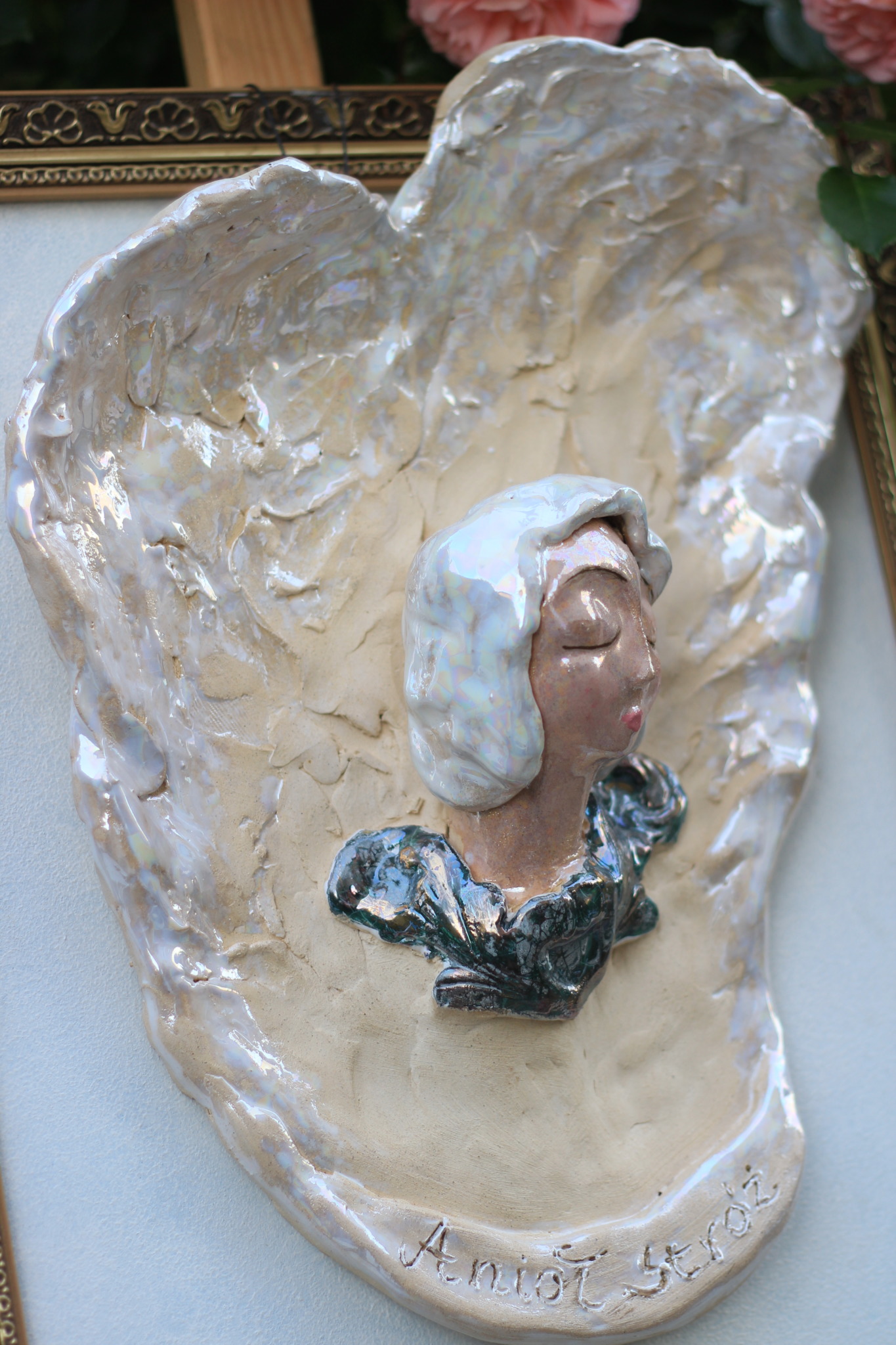 Anioł wykonany ręcznie z gliny, trzykrotnie wypalany, szkliwiony i zdobiony lustrami. Wykonany w pojedynczym egzemplarzu, będzie unikatową ozdobą wnętrza lub sprawdzi się również jako prezent.