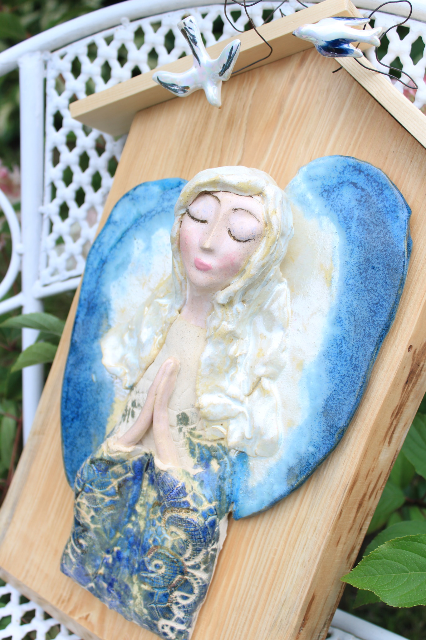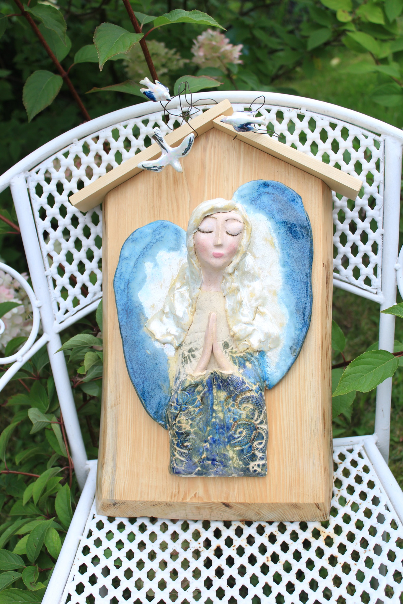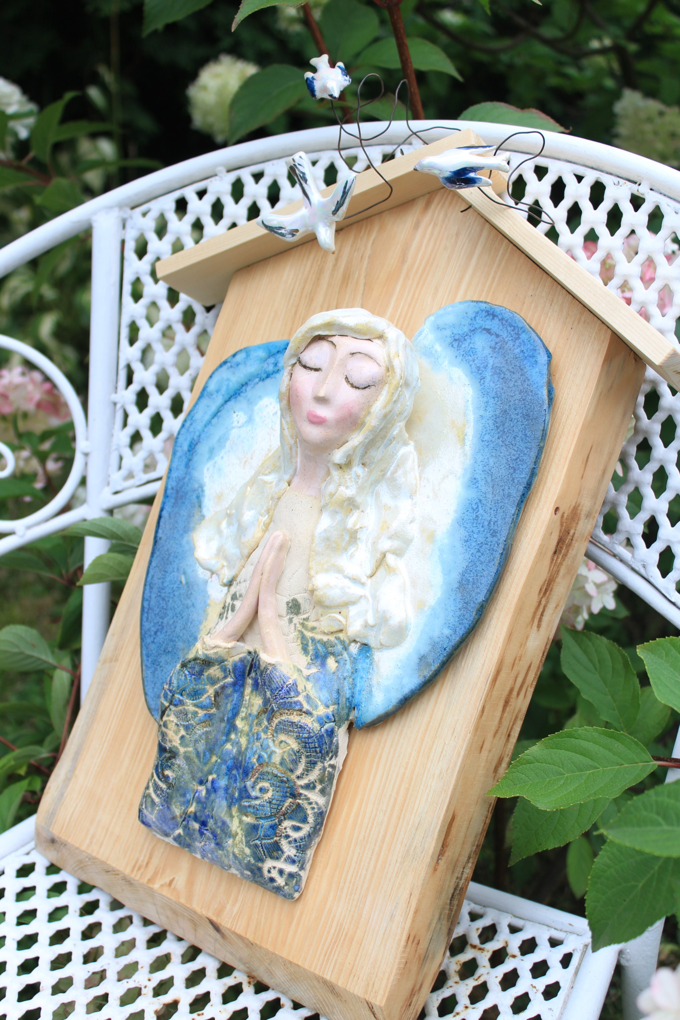 • Ceramiczny anioł na desce wykonany ręcznie z gliny w pojedynczym egzemplarzu. Anioł jest całościowo szkliwiony i na stałe przyklejony do deski w formie kapliczki odpowiednio wcześniej zabezpieczonej. Z tyłu deski znajduje się stosowny otwór z blaszką do regulacji.