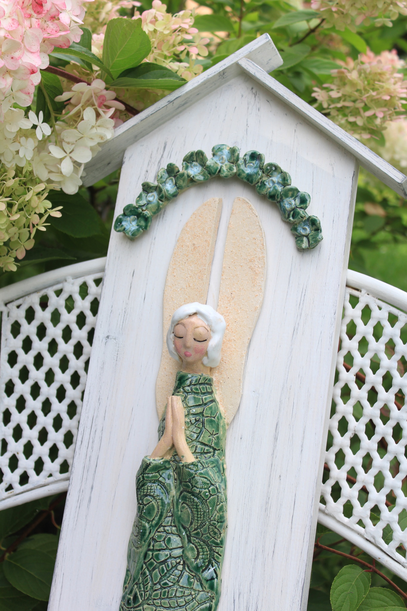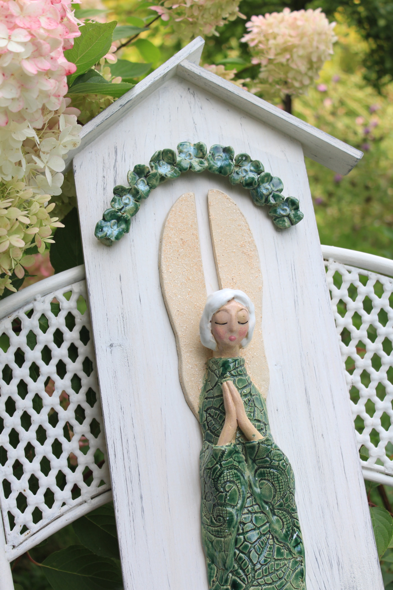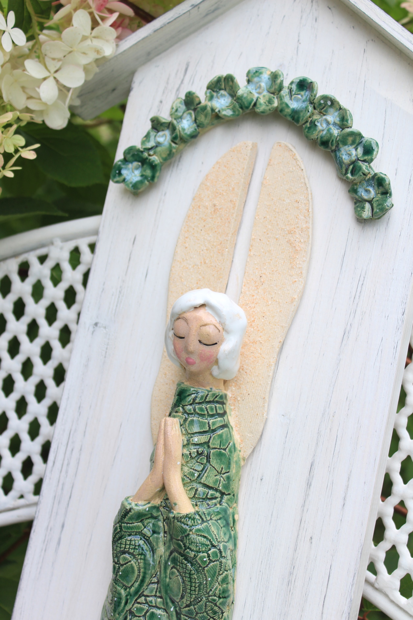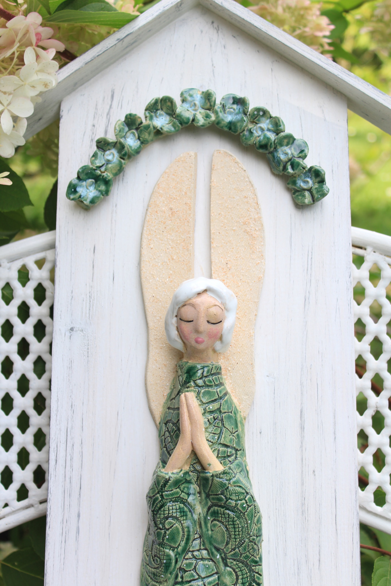 • Ceramiczny anioł na desce wykonany ręcznie z gliny w pojedynczym egzemplarzu. Anioł jest całościowo szkliwiony i na stałe przyklejony do deski w formie kapliczki odpowiednio wcześniej zabezpieczonej. Z tyłu deski znajduje się stosowny otwór z blaszką do regulacji.
