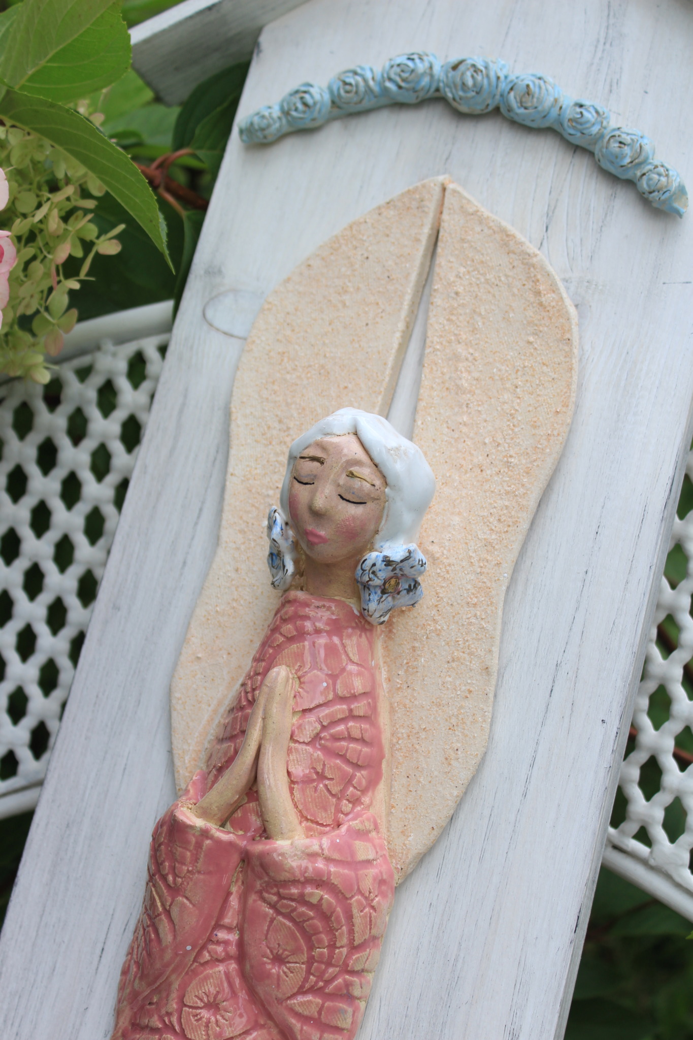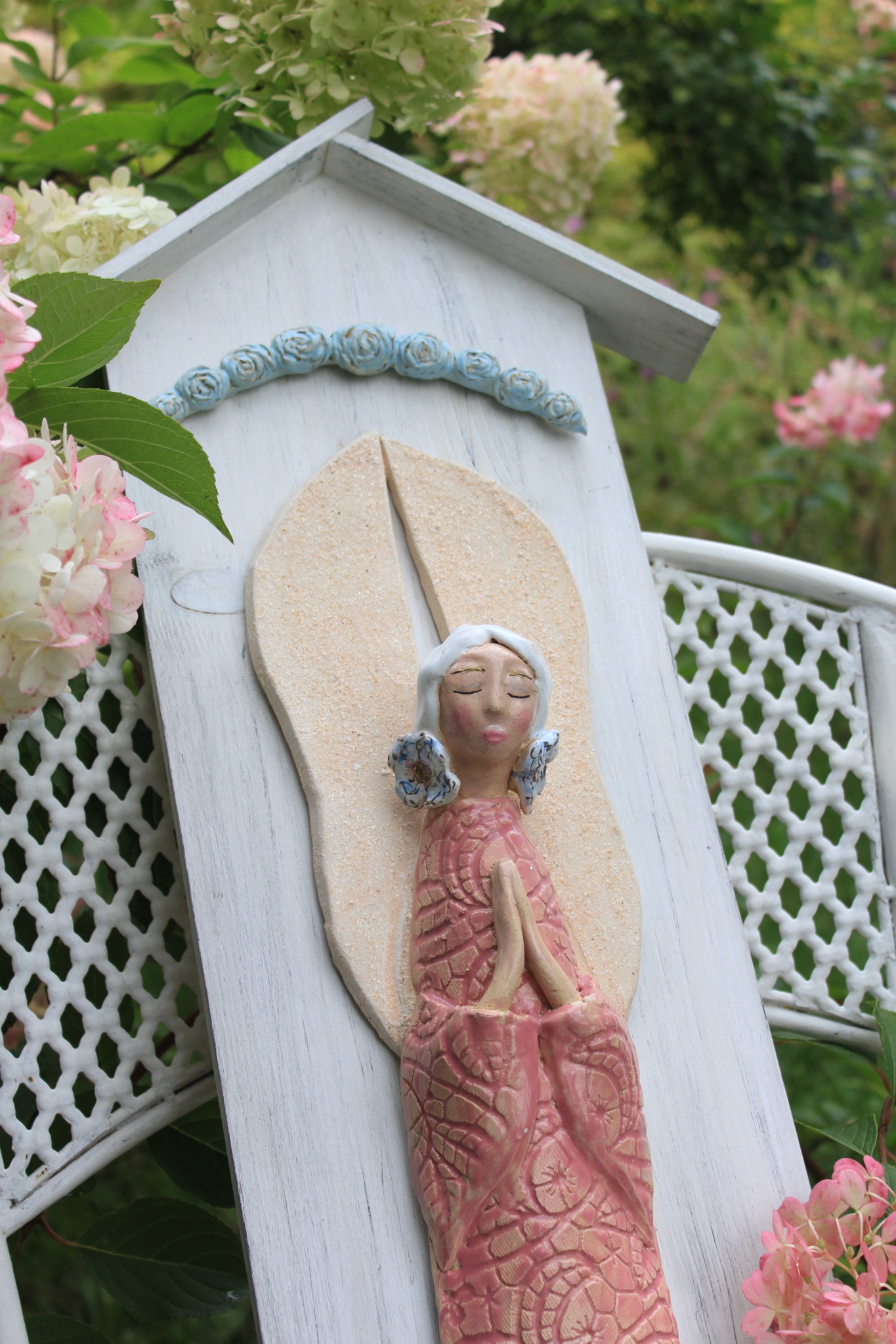 • Ceramiczny anioł na desce wykonany ręcznie z gliny w pojedynczym egzemplarzu. Anioł jest całościowo szkliwiony i na stałe przyklejony do deski w formie kapliczki odpowiednio wcześniej zabezpieczonej. Z tyłu deski znajduje się stosowny otwór z blaszką do regulacji.