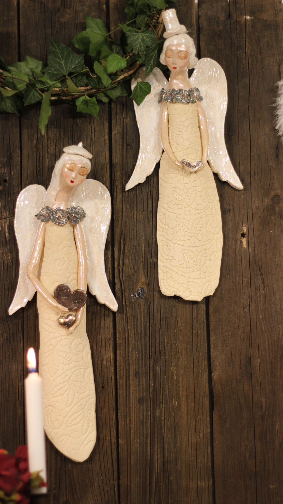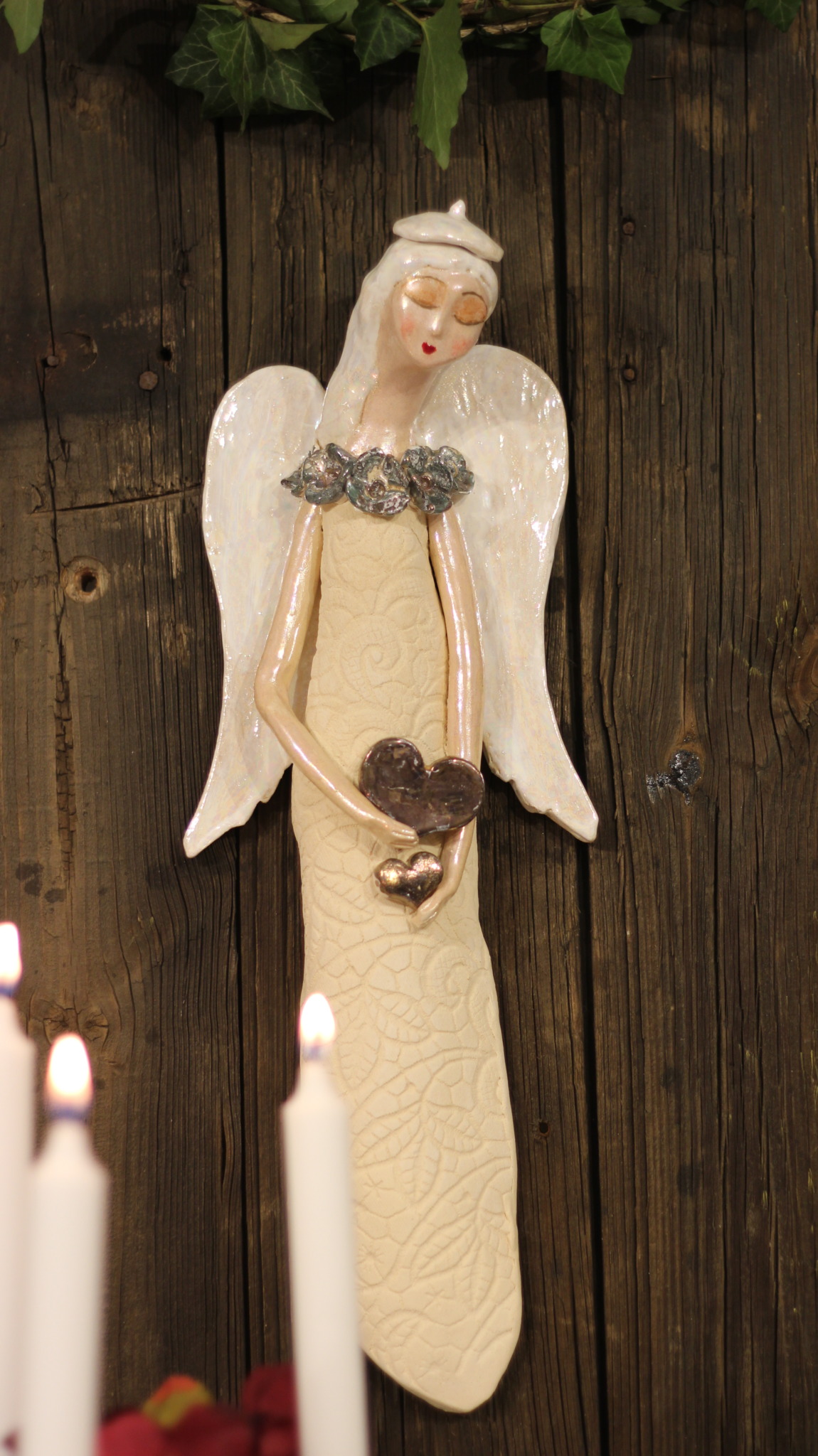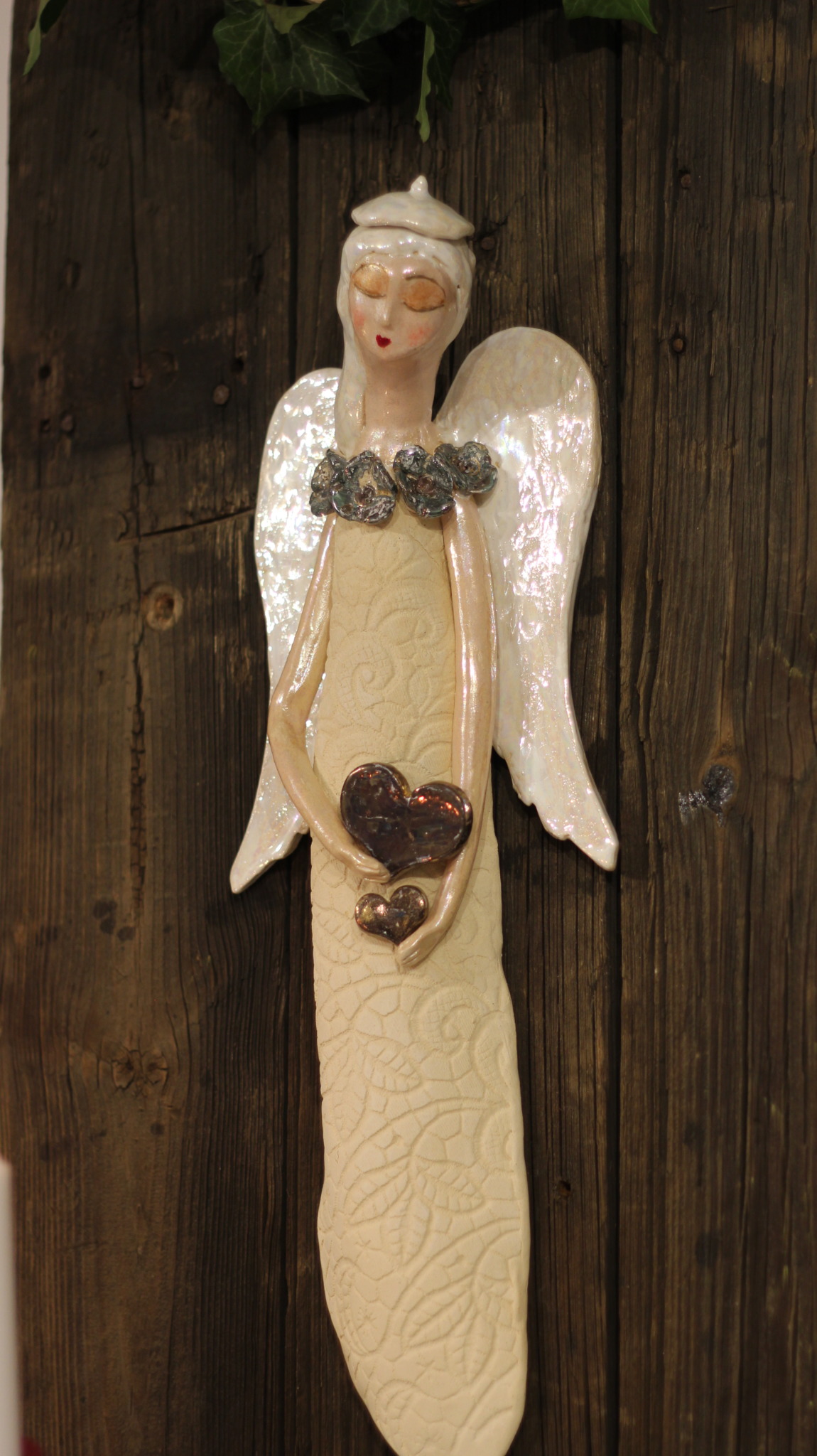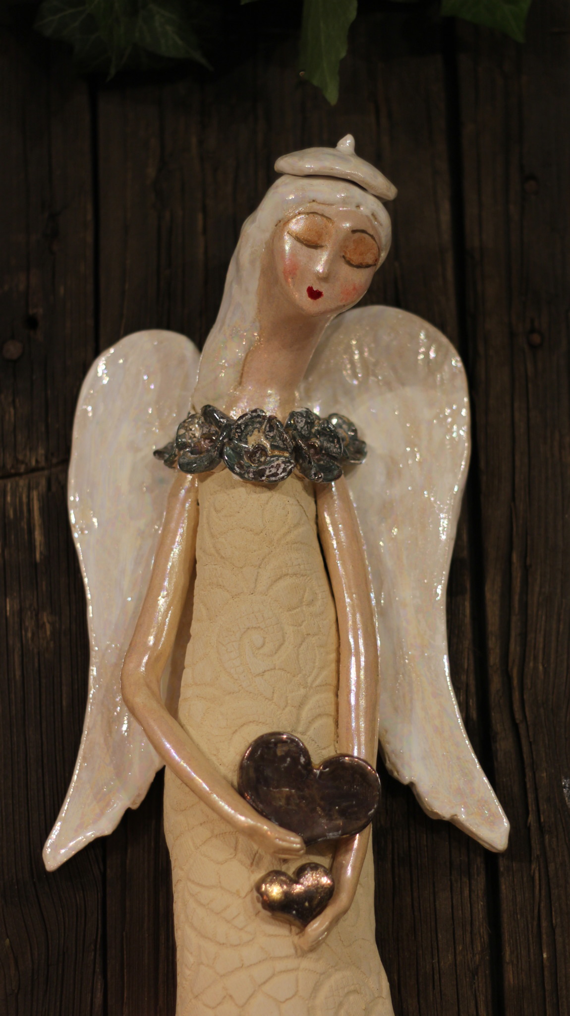 Anioł ceramiczny w bereciku z miedzianymi sercami, wykonany ręcznie z gliny w pojedynczym egzemplarzu. Trzykrotnie wypalany, szkliwiony a w detalach pokryty metalami szlachetnymi. Stanowi świetną propozycję dla unikatowego prezentu dla bliskiej osoby oraz oryginalną ozdobę ścienną.