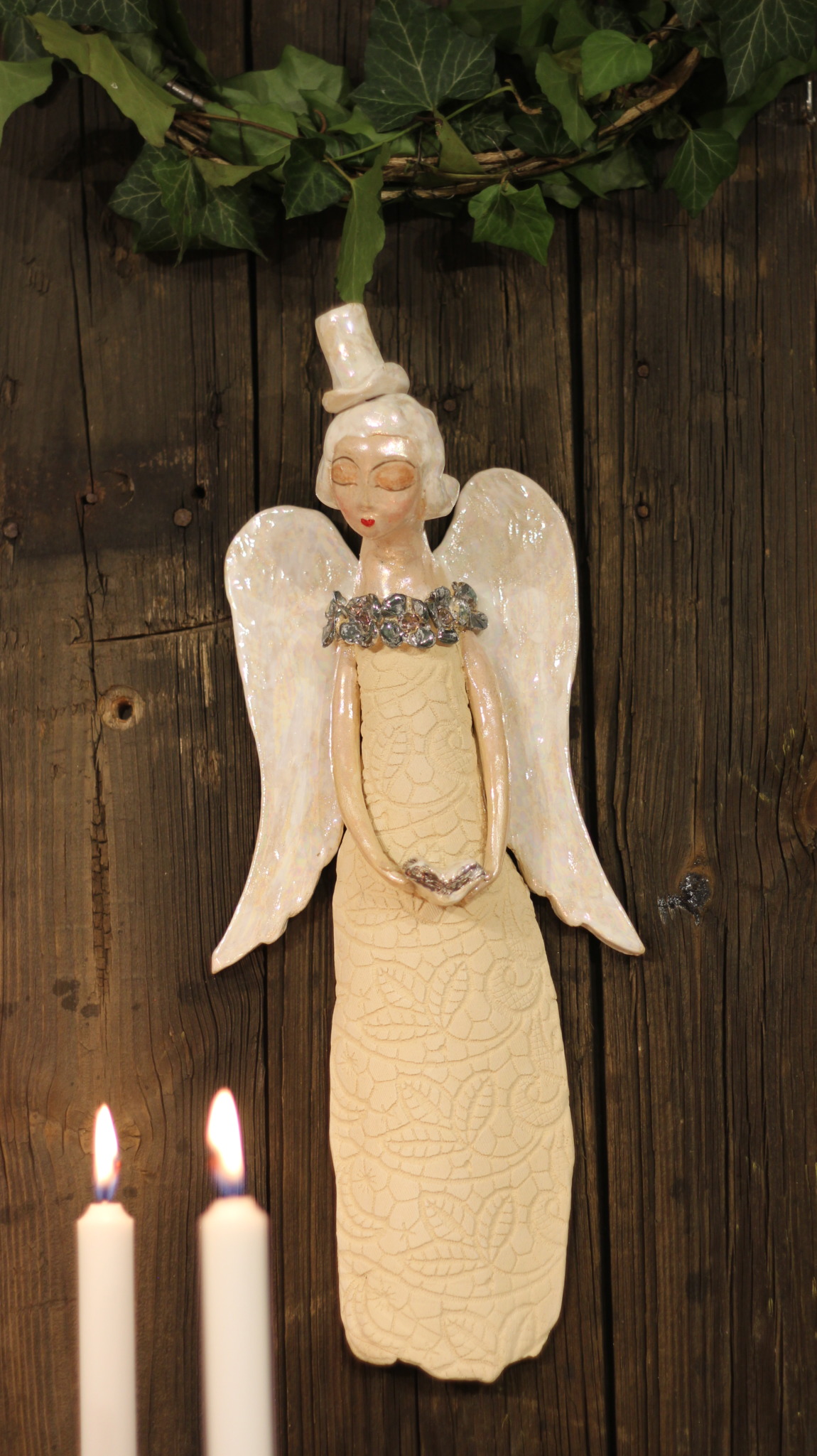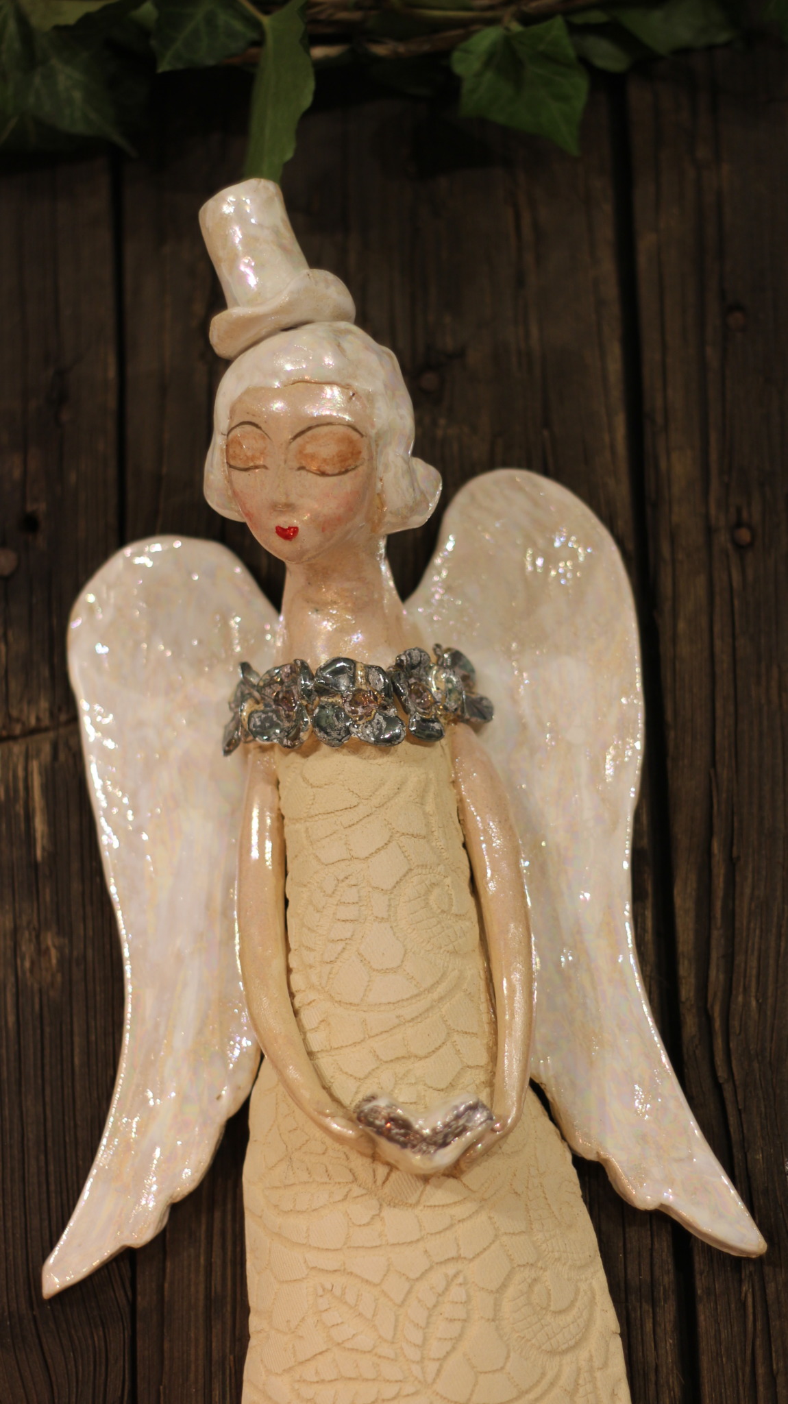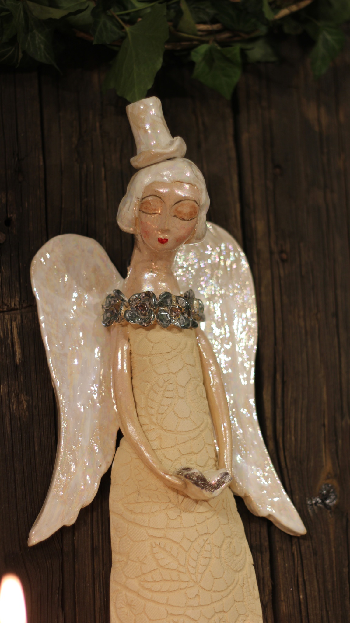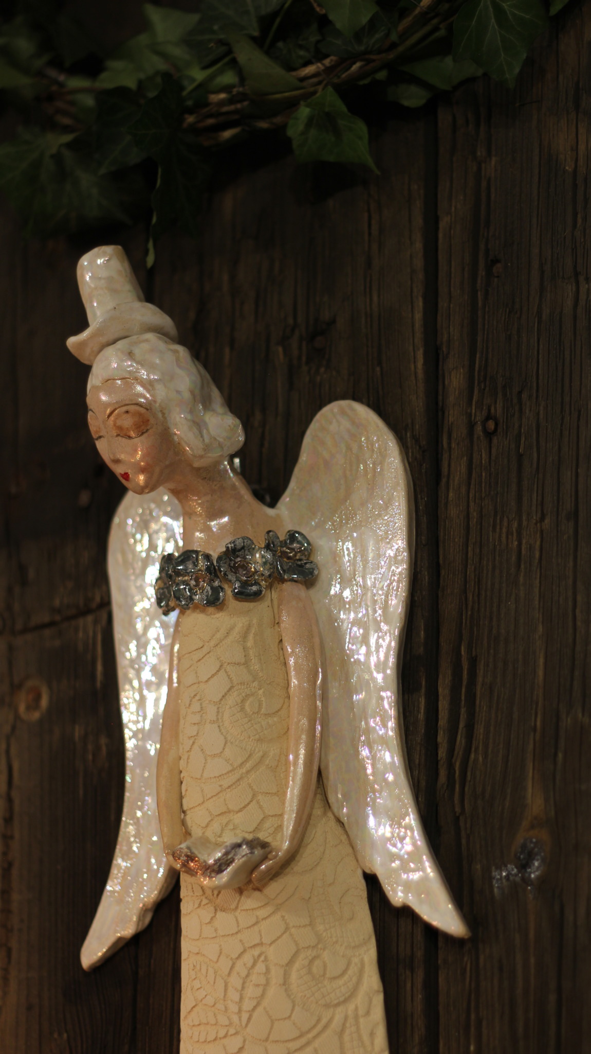 Anioł ceramiczny w cylindrze, wykonany ręcznie z gliny w pojedynczym egzemplarzu. Trzykrotnie wypalany, szkliwiony a w detalach pokryty metalami szlachetnymi. Stanowi świetną propozycję dla unikatowego prezentu dla bliskiej osoby oraz oryginalną ozdobę ścienną.