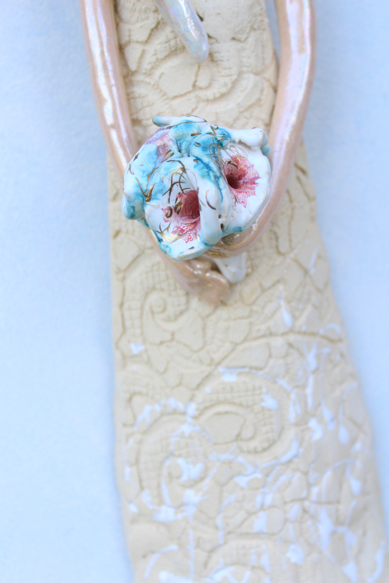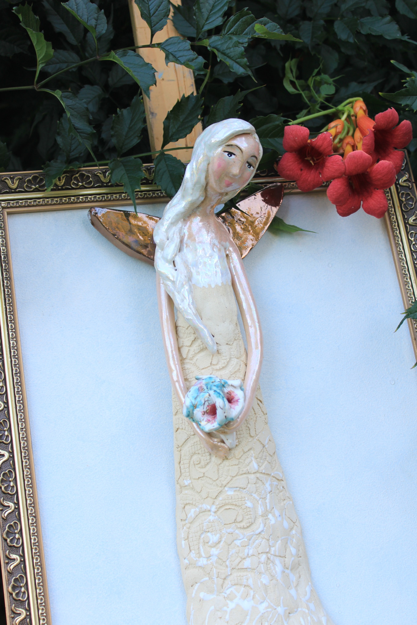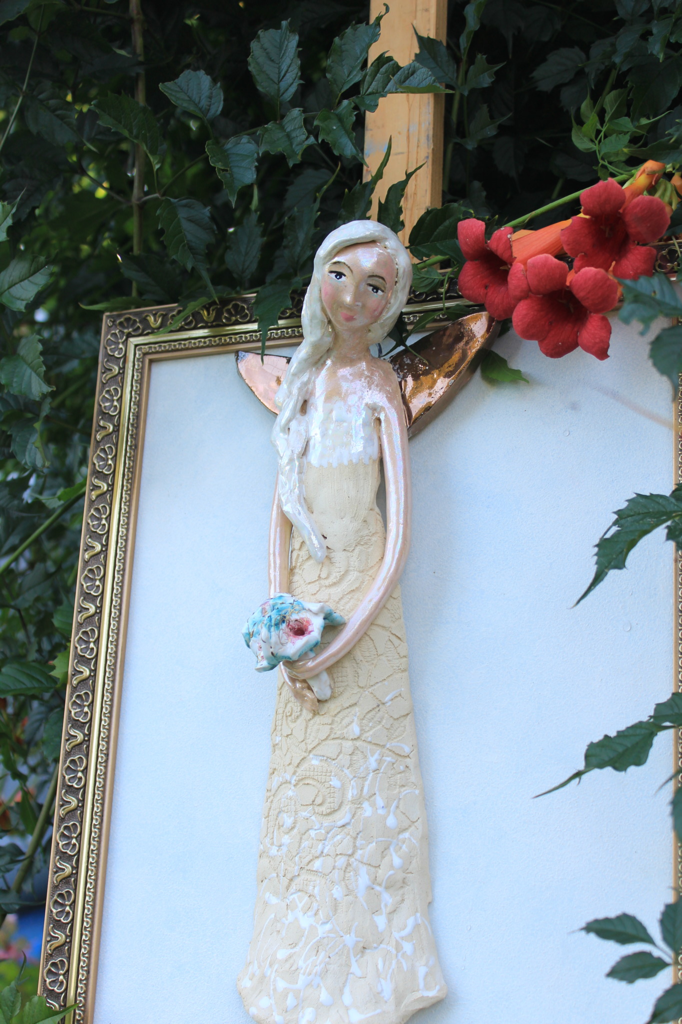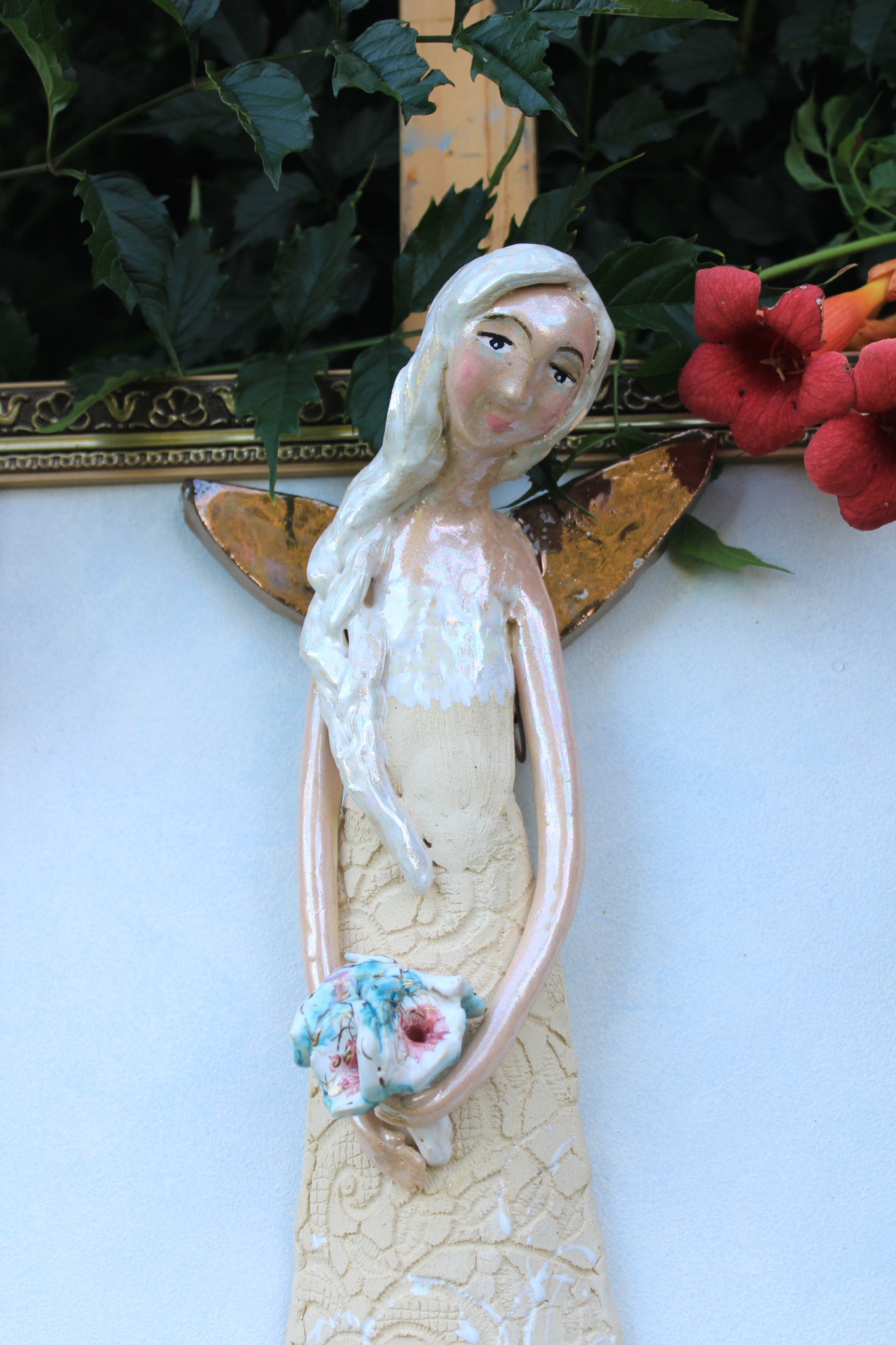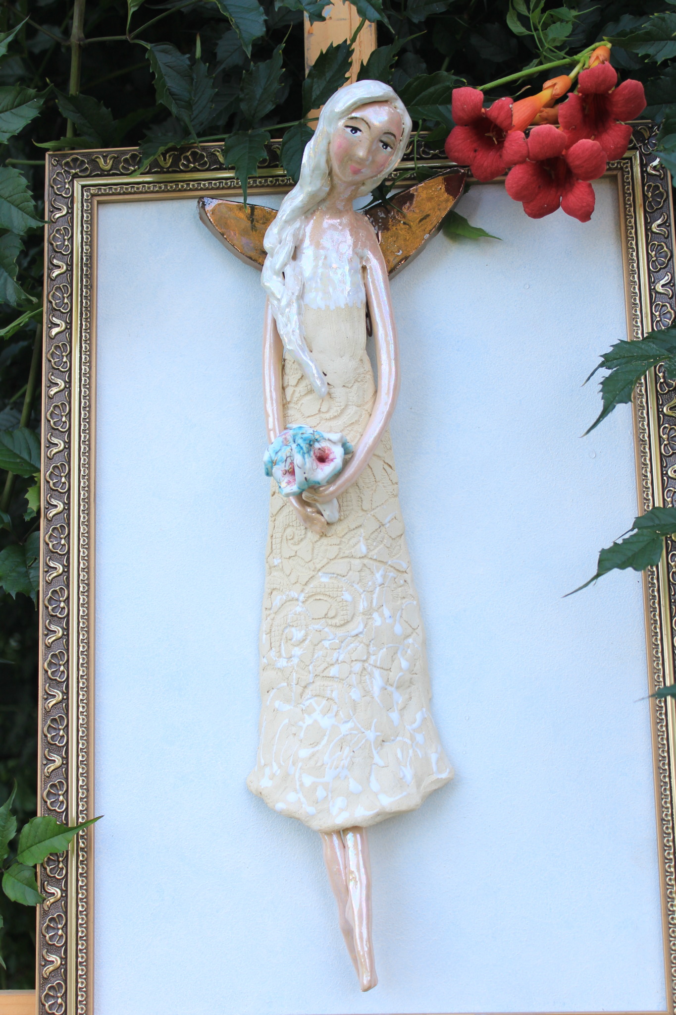 Anioł z bukietem, to rzeźba wykonana ręcznie z gliny w pojedynczym egzemplarzu. Anioł ten jest trzykrotnie wypalany, szkliwiony a w detalach pokryty metalami szlachetnymi. Szczególnie polecamy tą rzeźbę, jako prezent na specjalne okazje takie jak, wesele bądź rocznice ślubu. Jej wyjątkowy wygląd sprawi, iż będzie to unikatowa ozdoba ścienna.