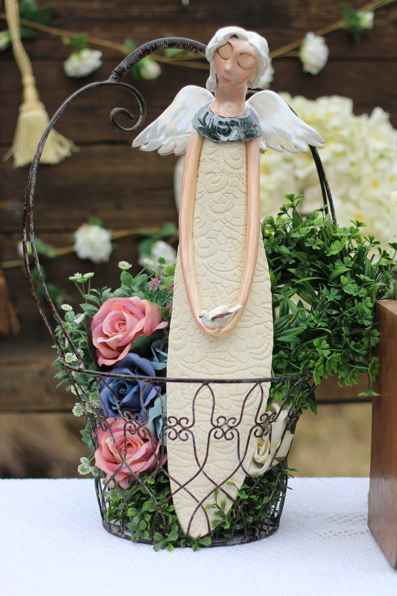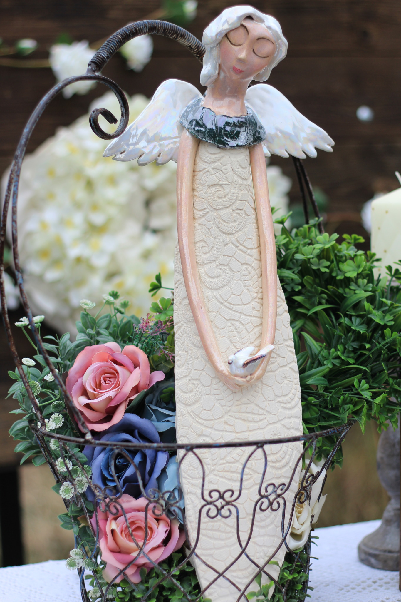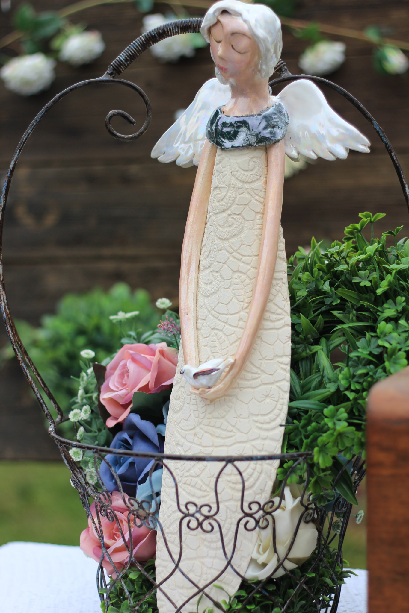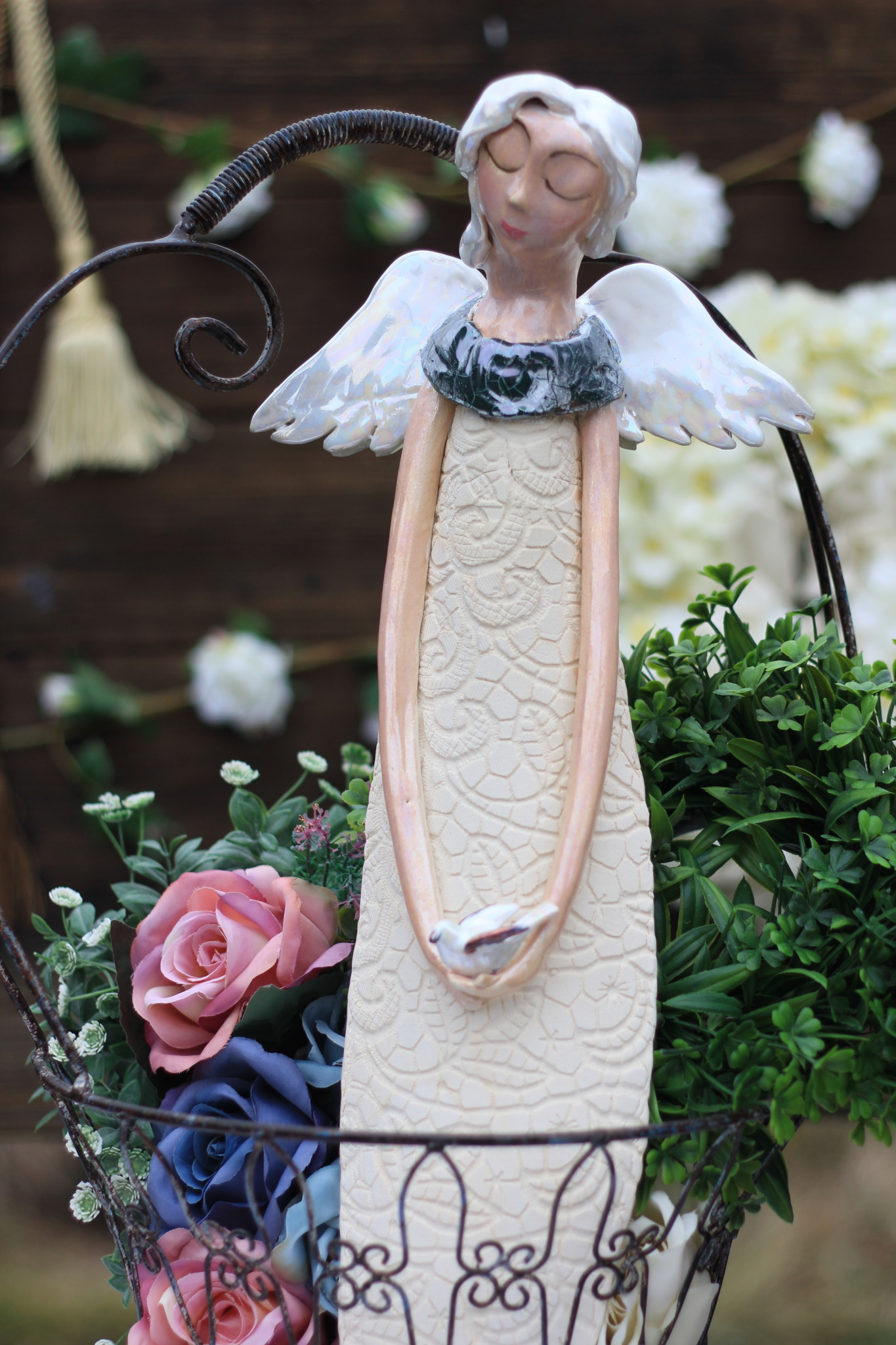 Anioł ceramiczny wykonany ręcznie z gliny, trzykrotnie wypalany, szkliwiony i zdobiony metalami szlachetnymi. Wykonany w pojedynczym egzemplarzu, będzie unikatową ozdobą wnętrza,idealny również jako upominek,na nowe mieszkanie,urodziny czy komunię.