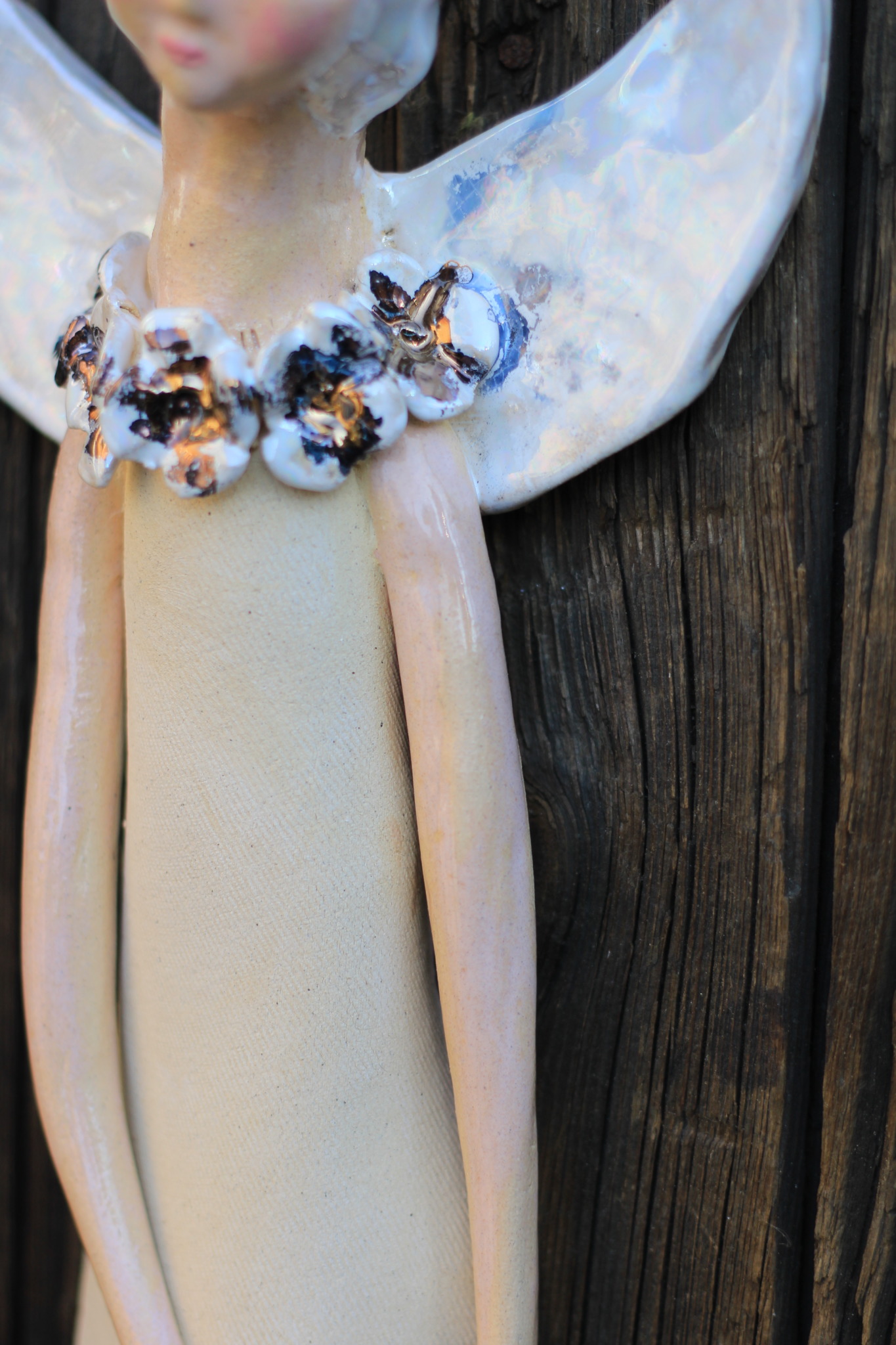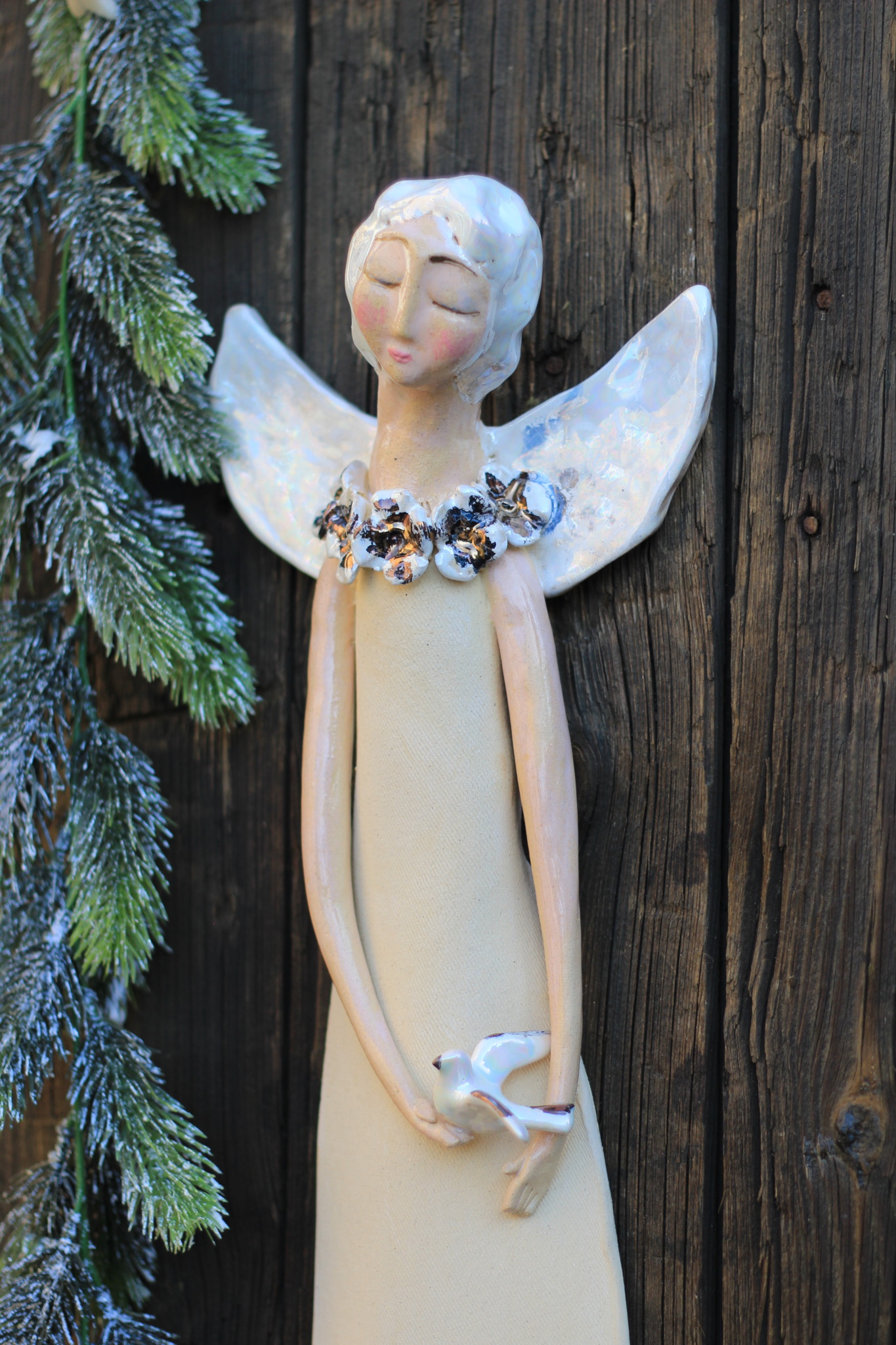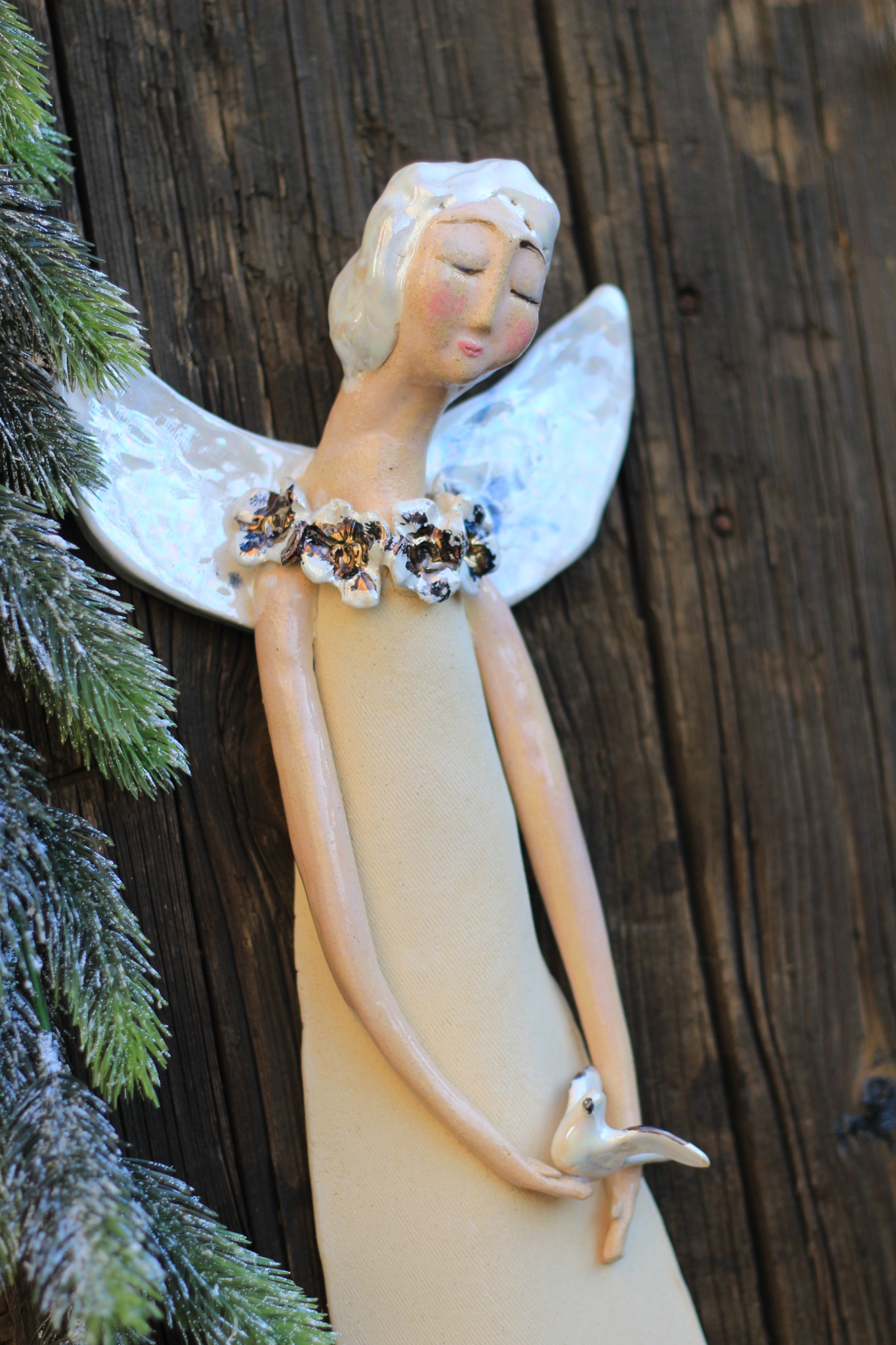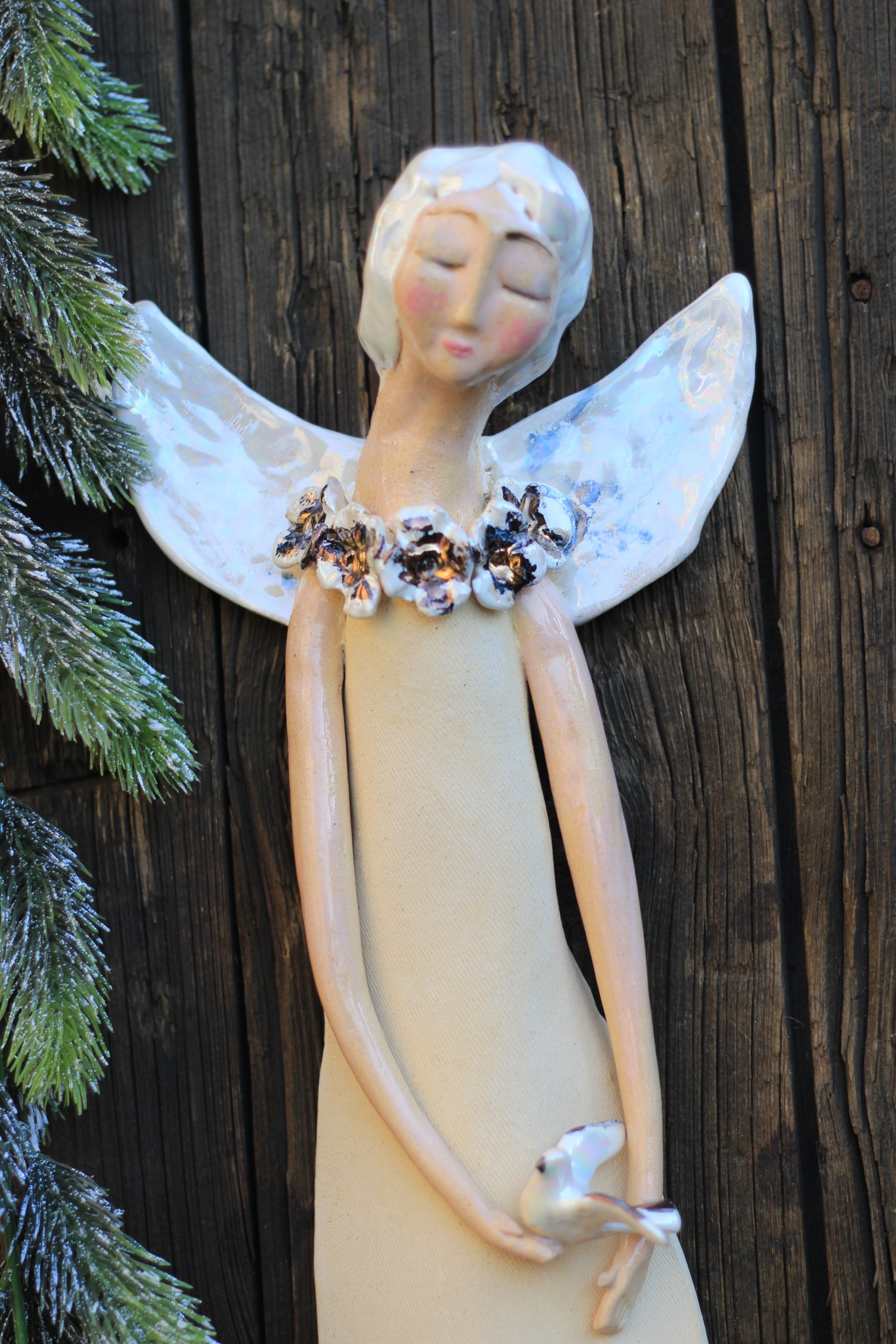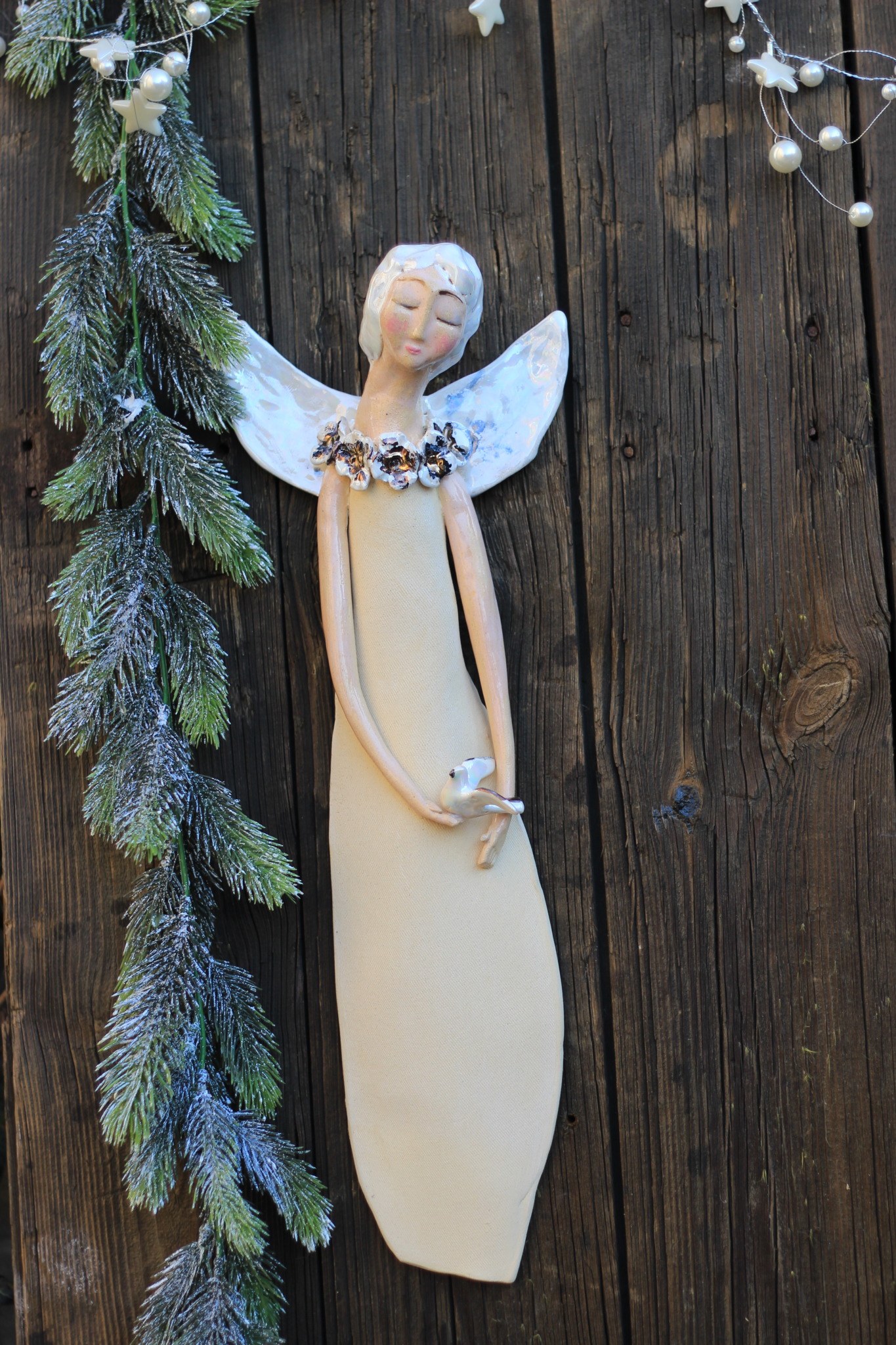 • Anioł ceramiczny, wykonany ręcznie z gliny w pojedynczym egzemplarzu. Trzykrotnie wypalany, szkliwiony,  pokryty metalami szlachetnymi. Stanowi świetną propozycję dla unikatowego prezentu dla bliskiej osoby oraz oryginalną ozdobę ścienną.