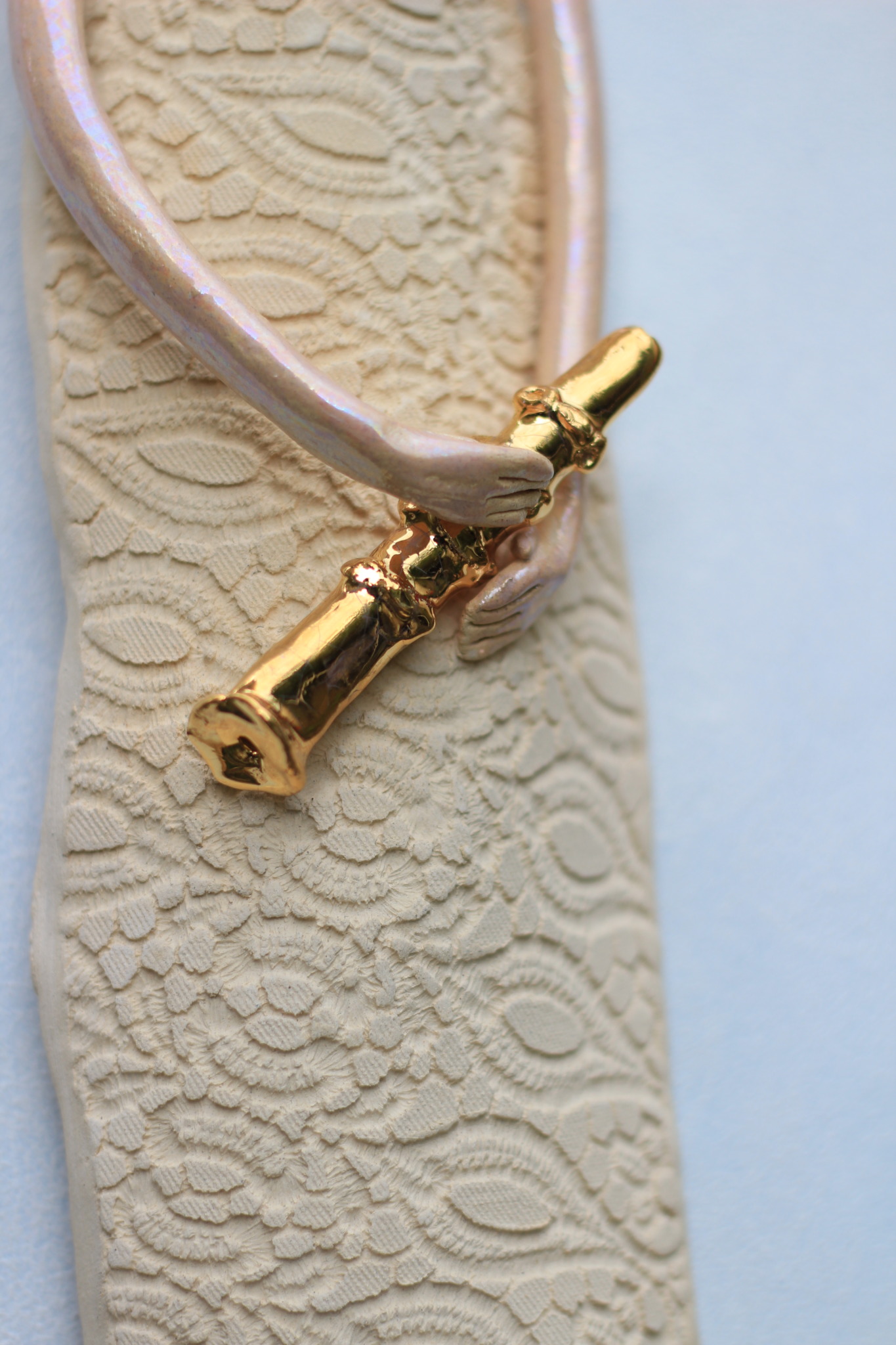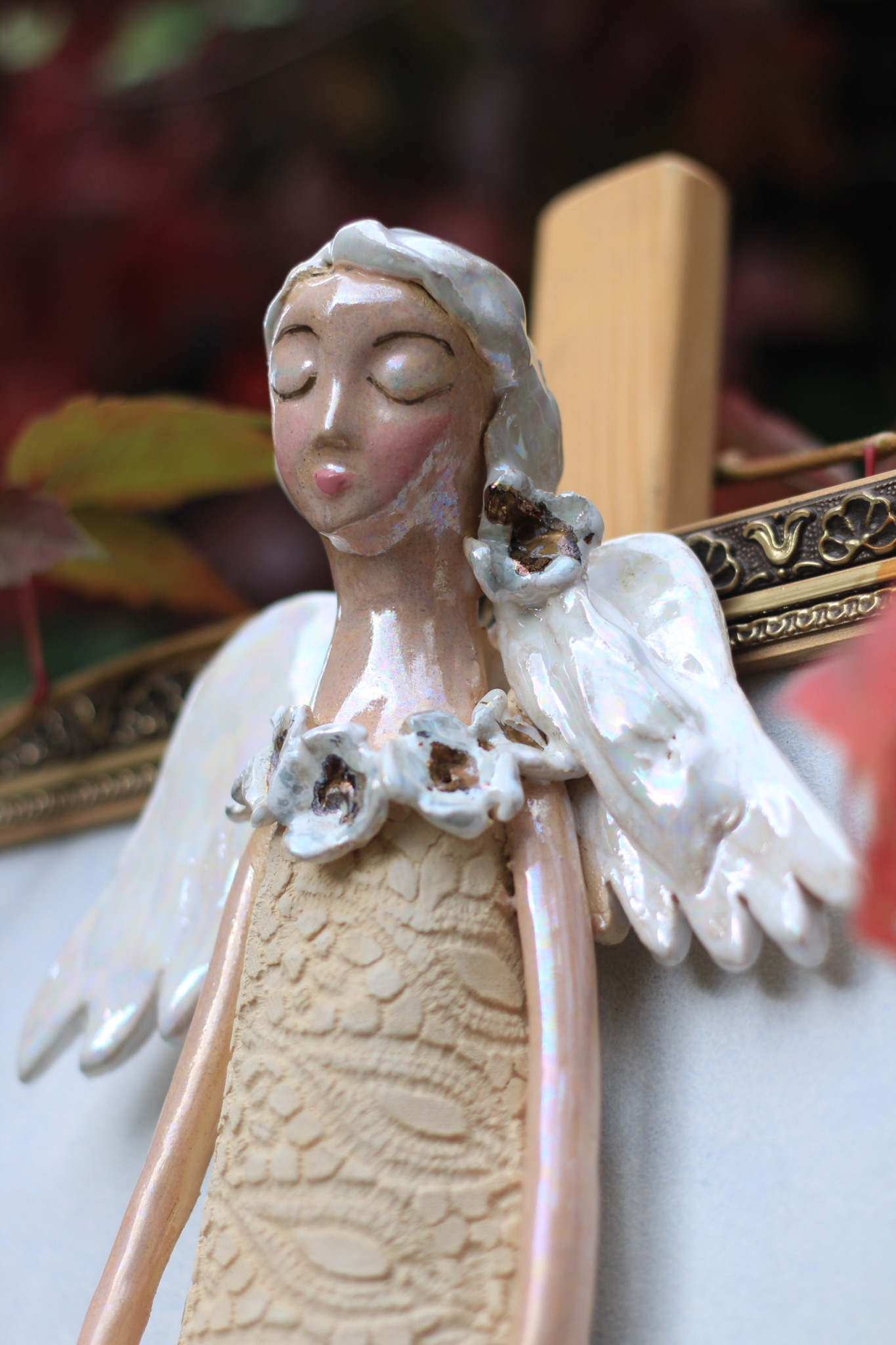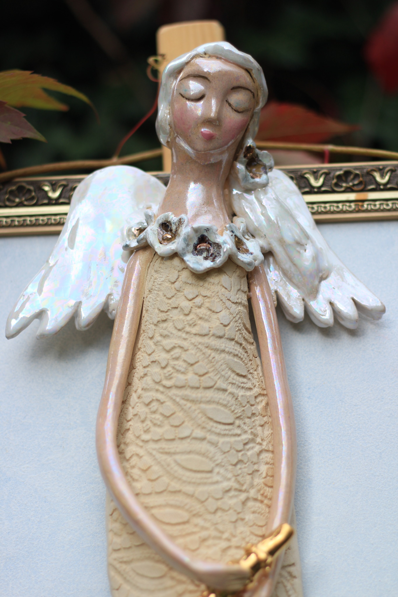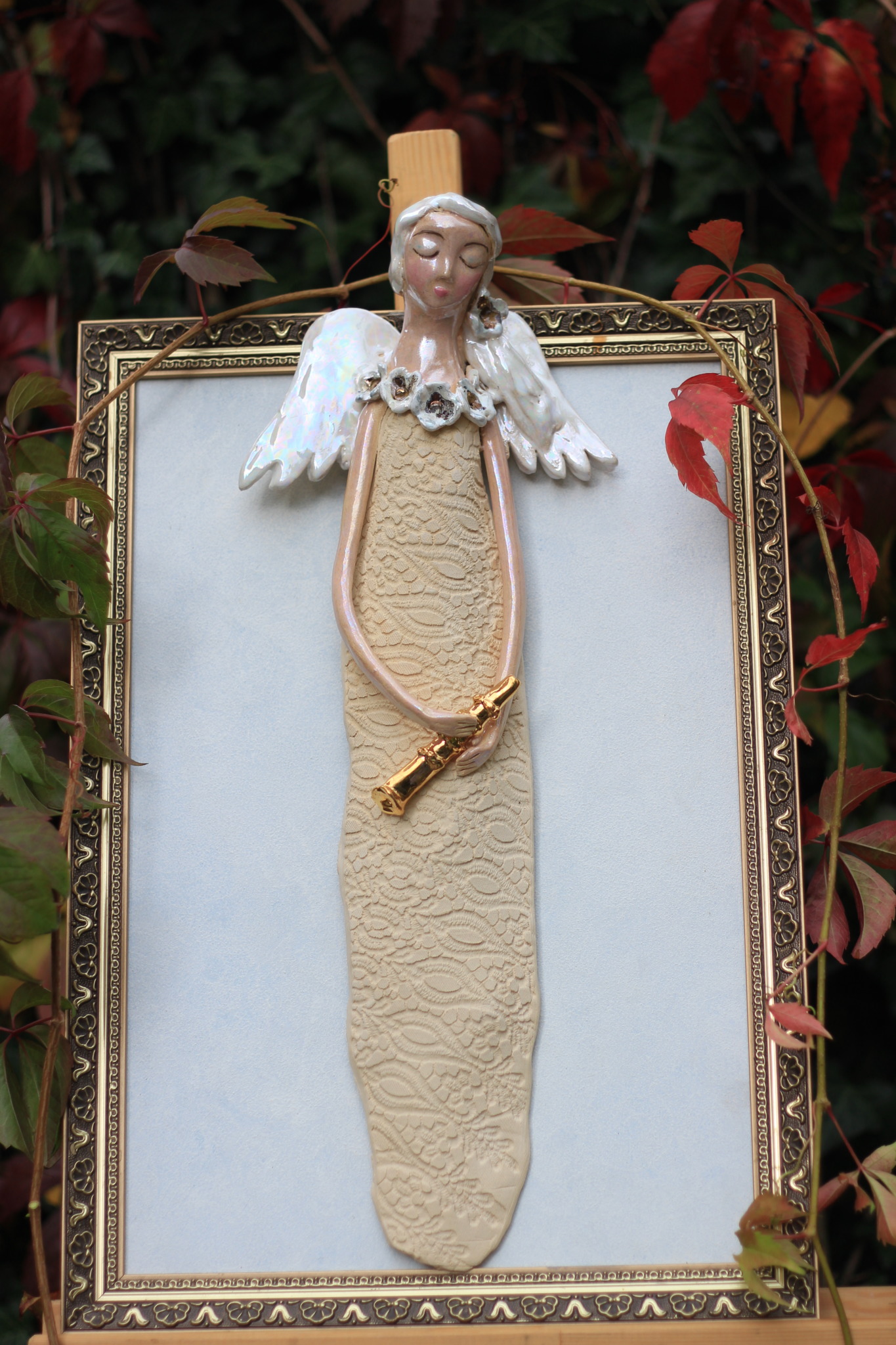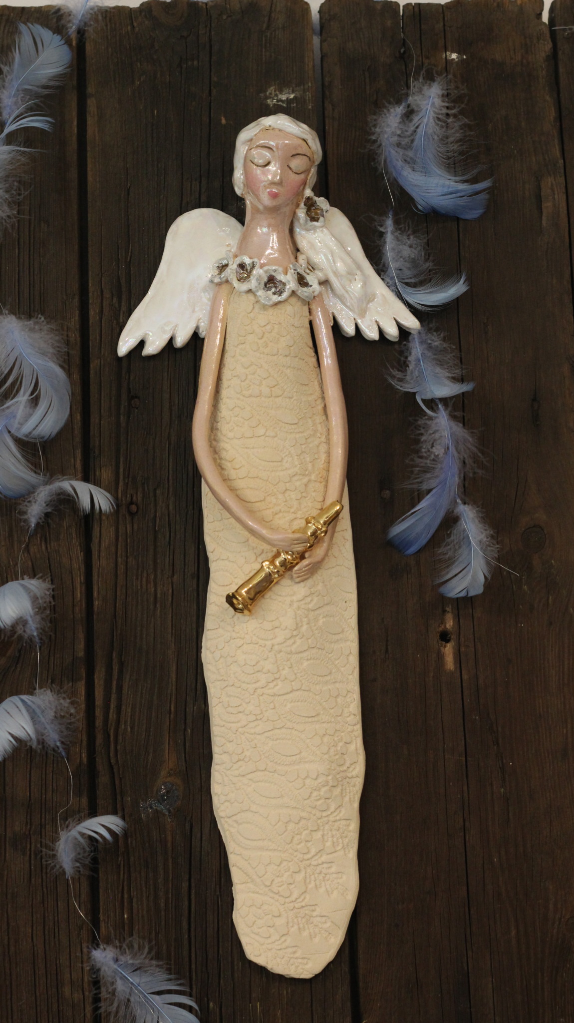 Anioł ceramiczny ze złotym klarnetem, wykonany ręcznie z gliny w pojedynczym egzemplarzu. Trzykrotnie wypalany, szkliwiony a w detalach pokryty metalami szlachetnymi. Stanowi świetną propozycję dla unikatowego prezentu dla bliskiej osoby oraz oryginalną ozdobę ścienną.