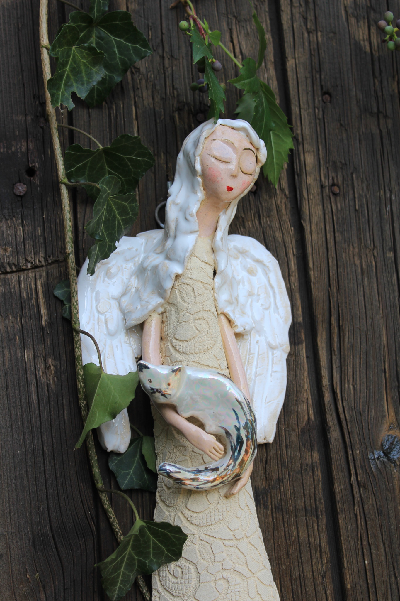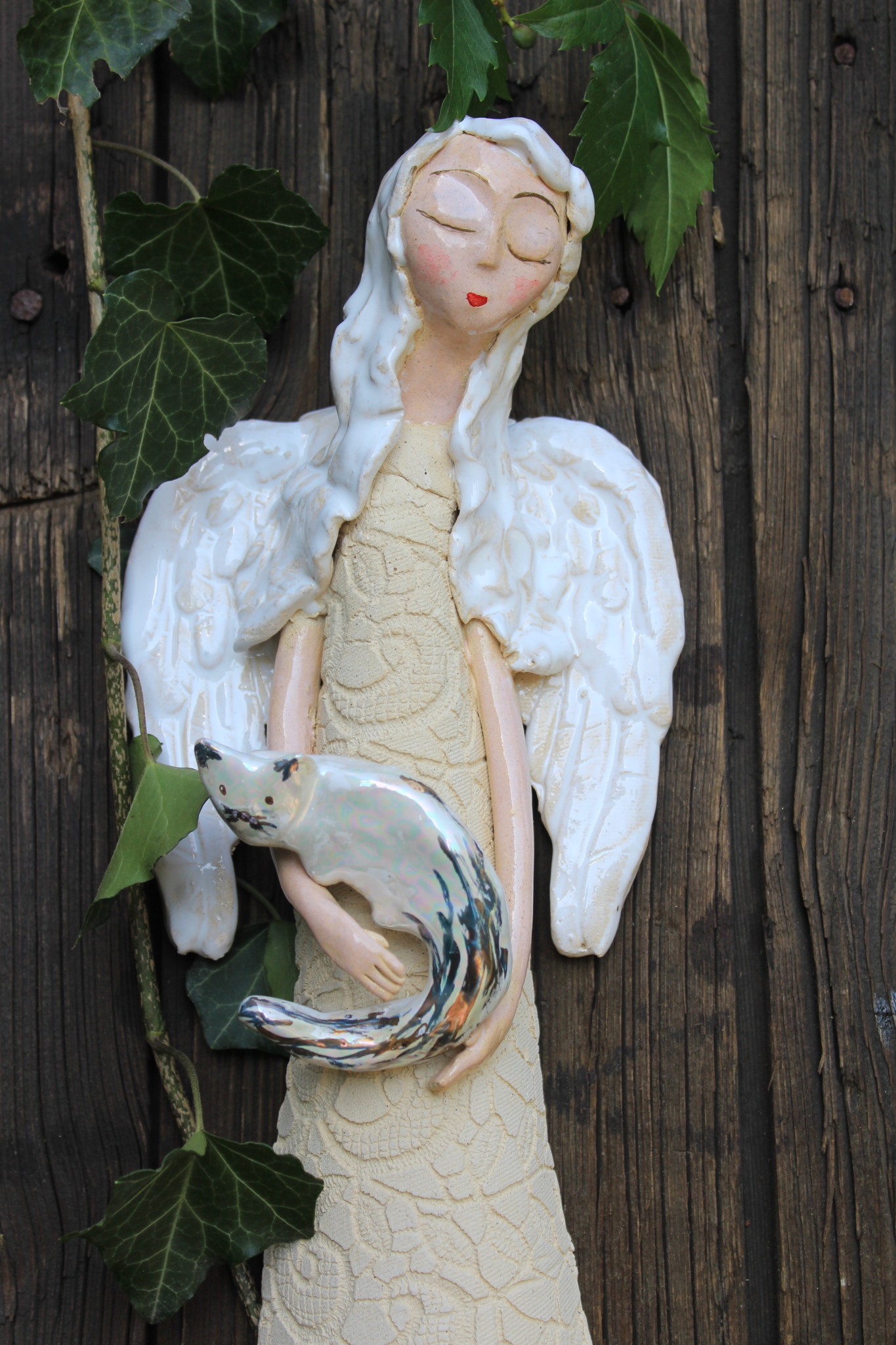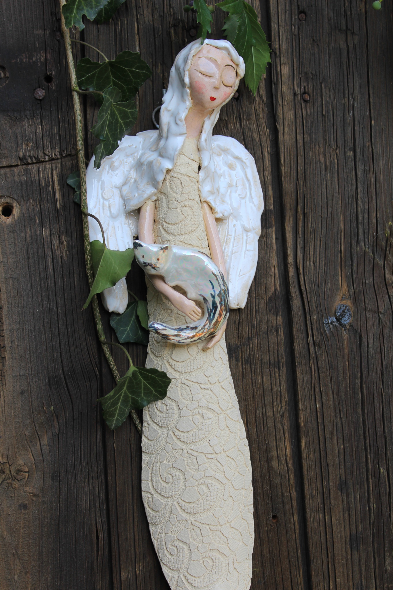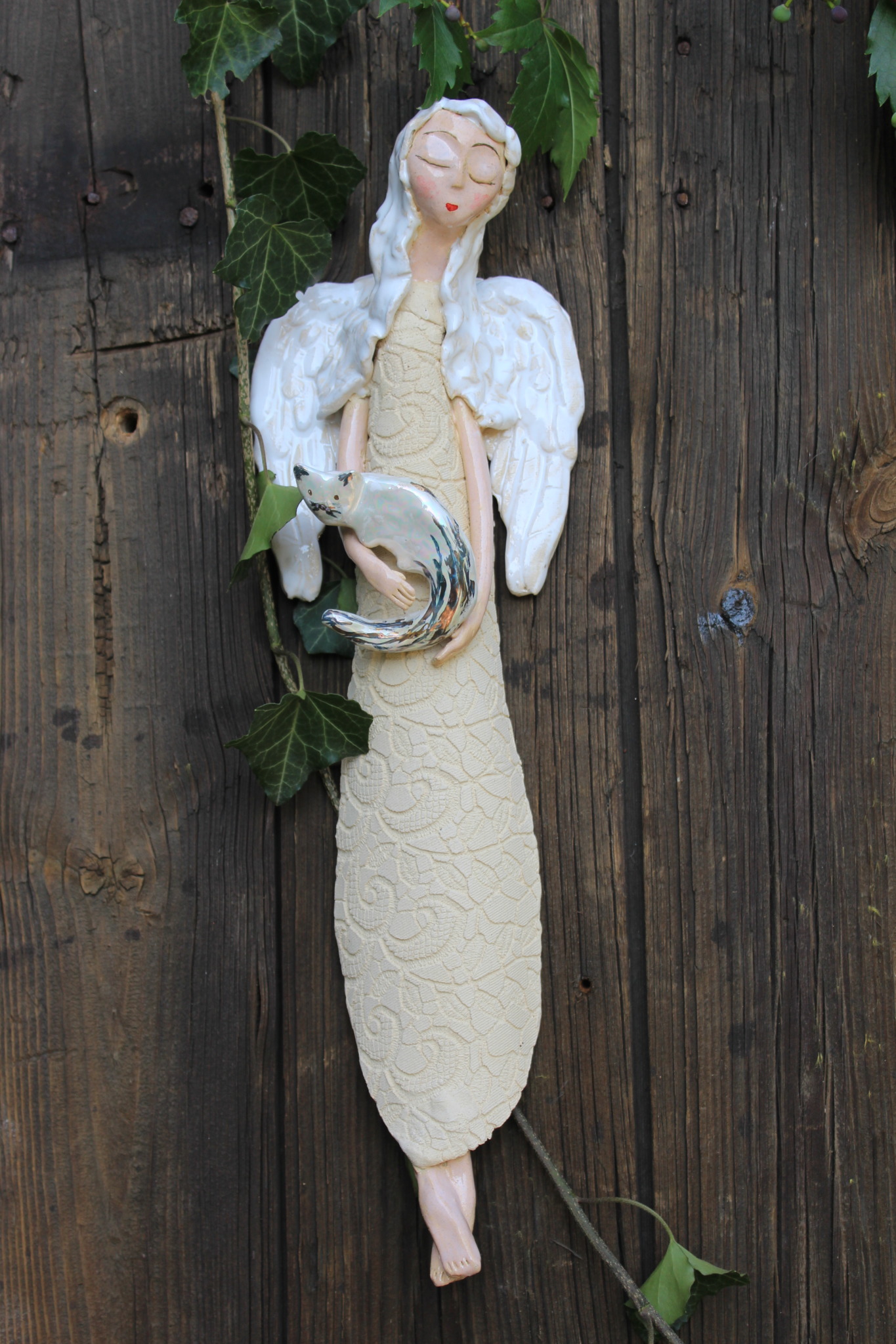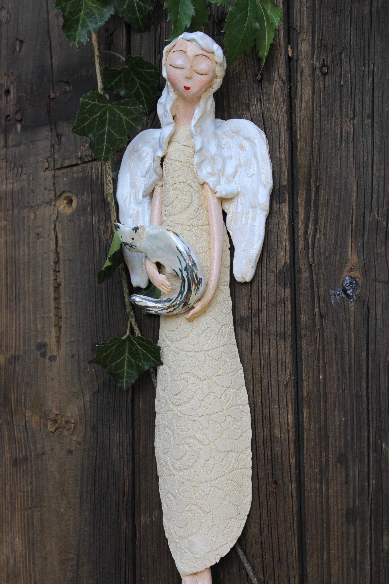 Anioł z Kotkiem, to rzeźba wykonana ręcznie z gliny w pojedynczym egzemplarzu. Anioł ten jest trzykrotnie wypalany, szkliwiony a w detalach pokryty metalami szlachetnymi. Szczególnie polecamy tą rzeźbę, jako prezent na specjalne okazje takie jak, wesele bądź rocznice ślubu. Jej wyjątkowy wygląd sprawi, iż będzie to unikatowa ozdoba ścienna.