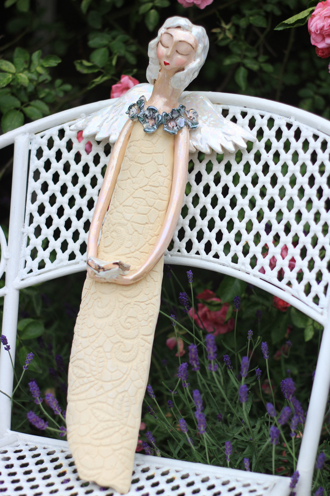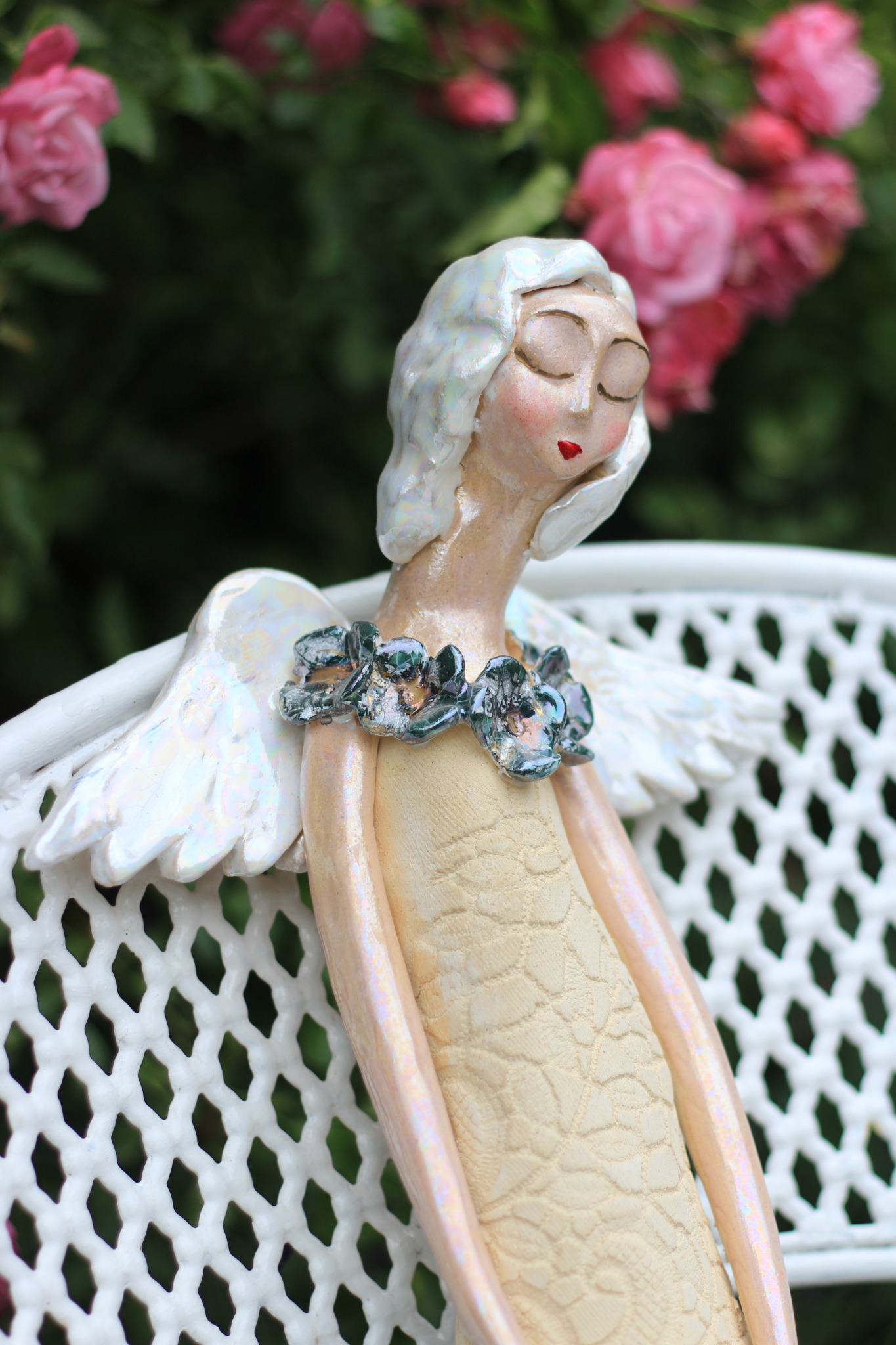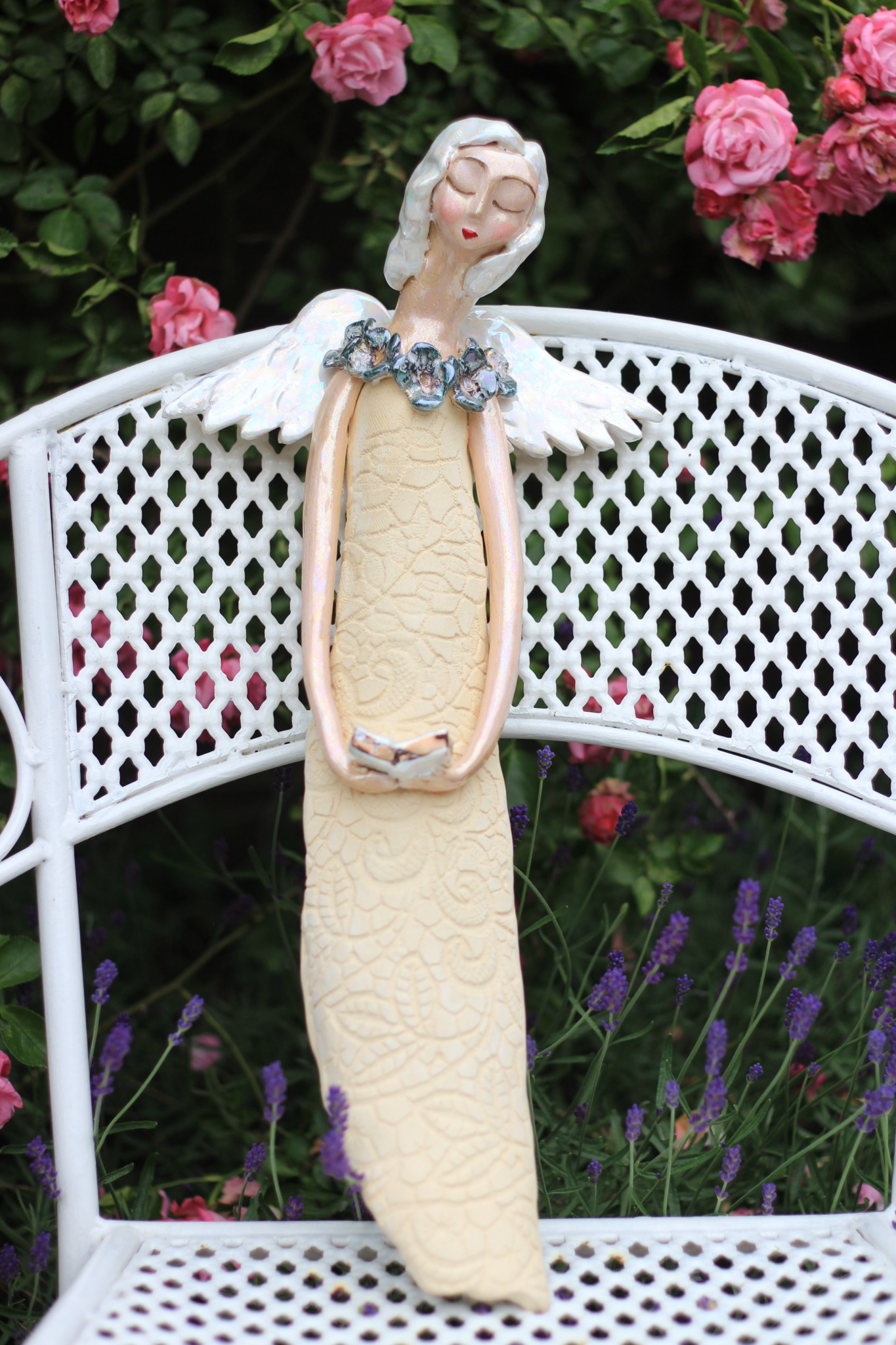 Anioł wykonany ręcznie z gliny, trzykrotnie wypalany, szkliwiony i zdobiony metalami szlachetnymi. Wykonany w pojedynczym egzemplarzu, będzie unikatową ozdobą wnętrza lub sprawdzi się również jako prezent.