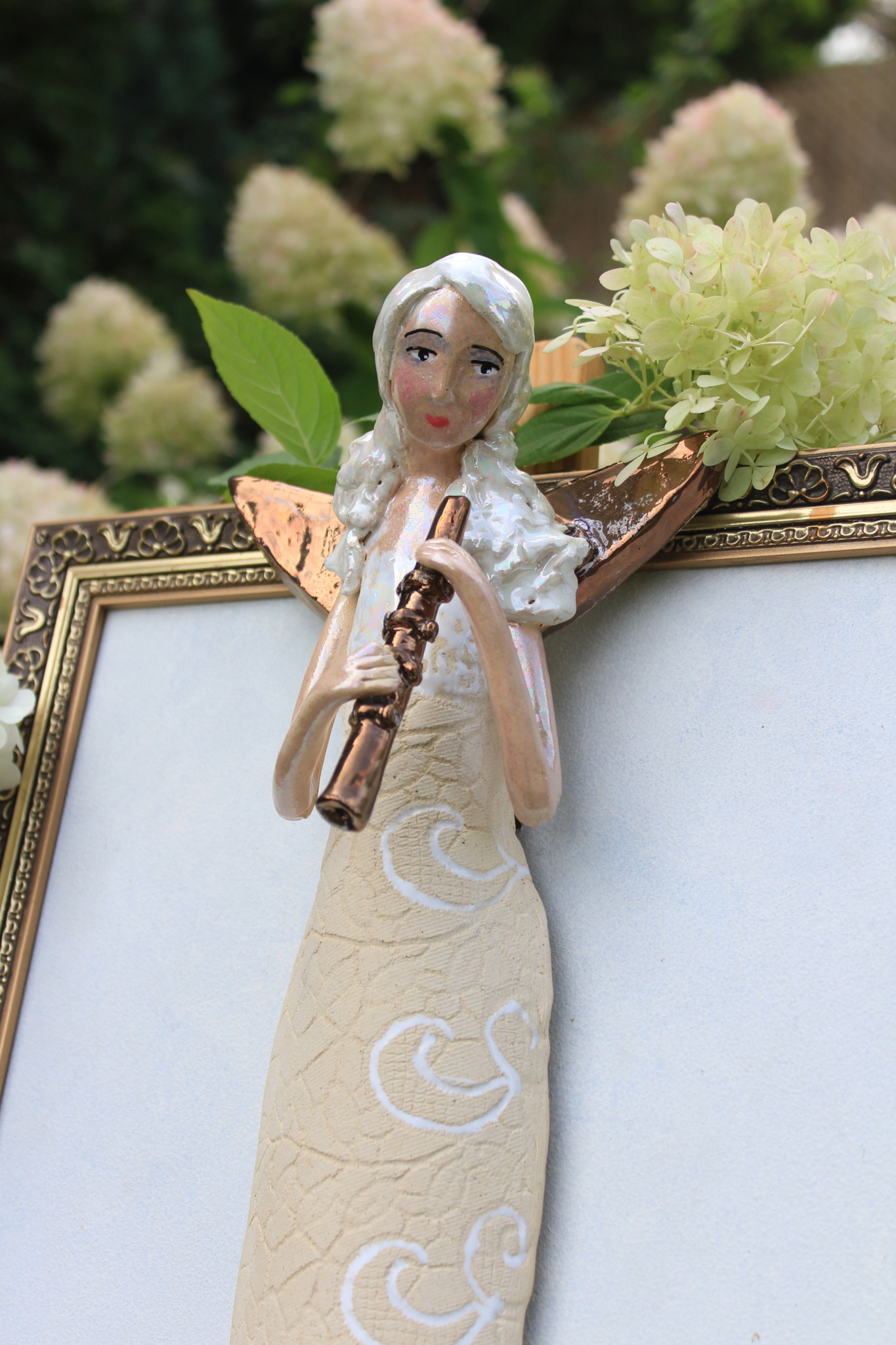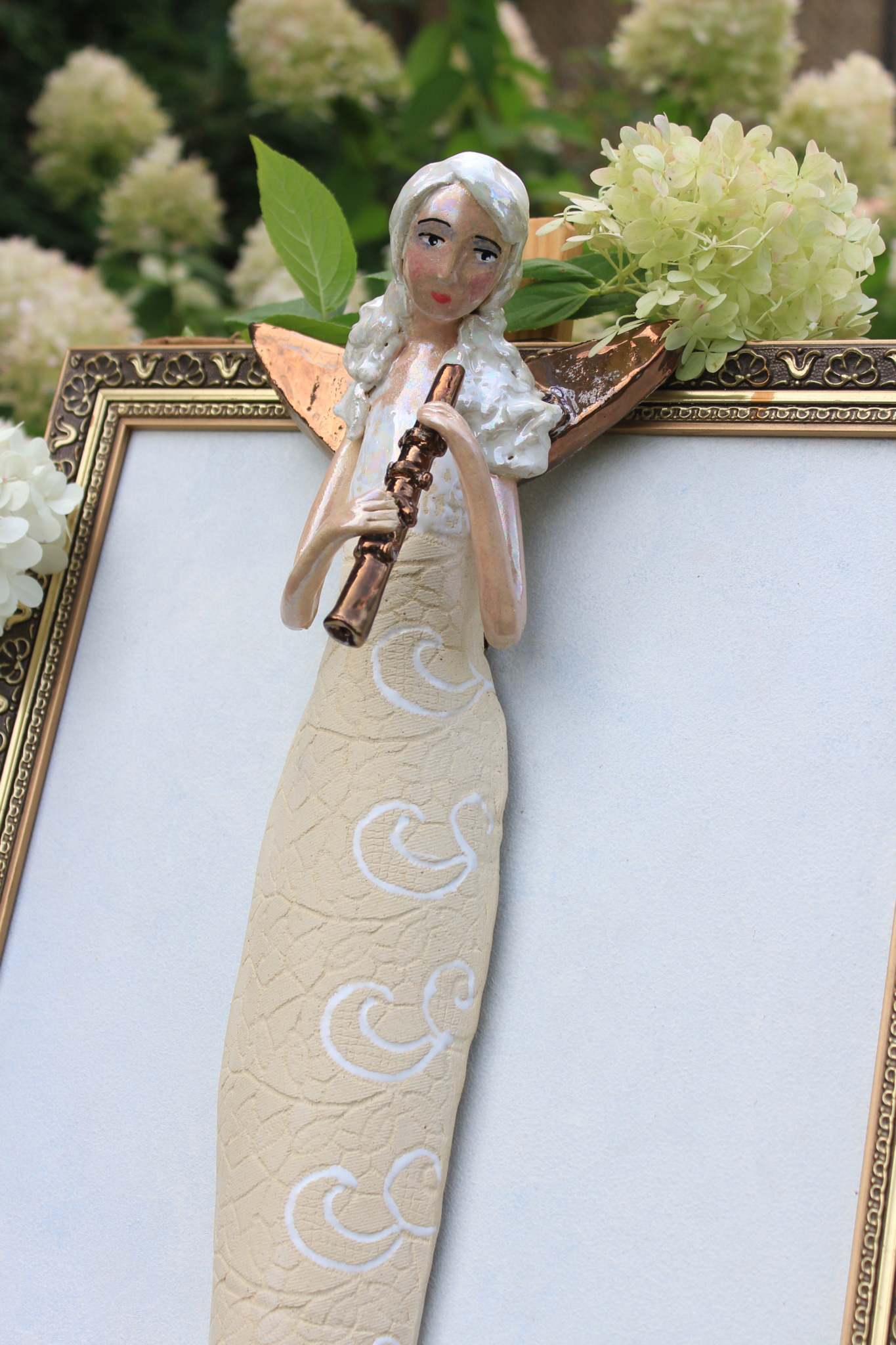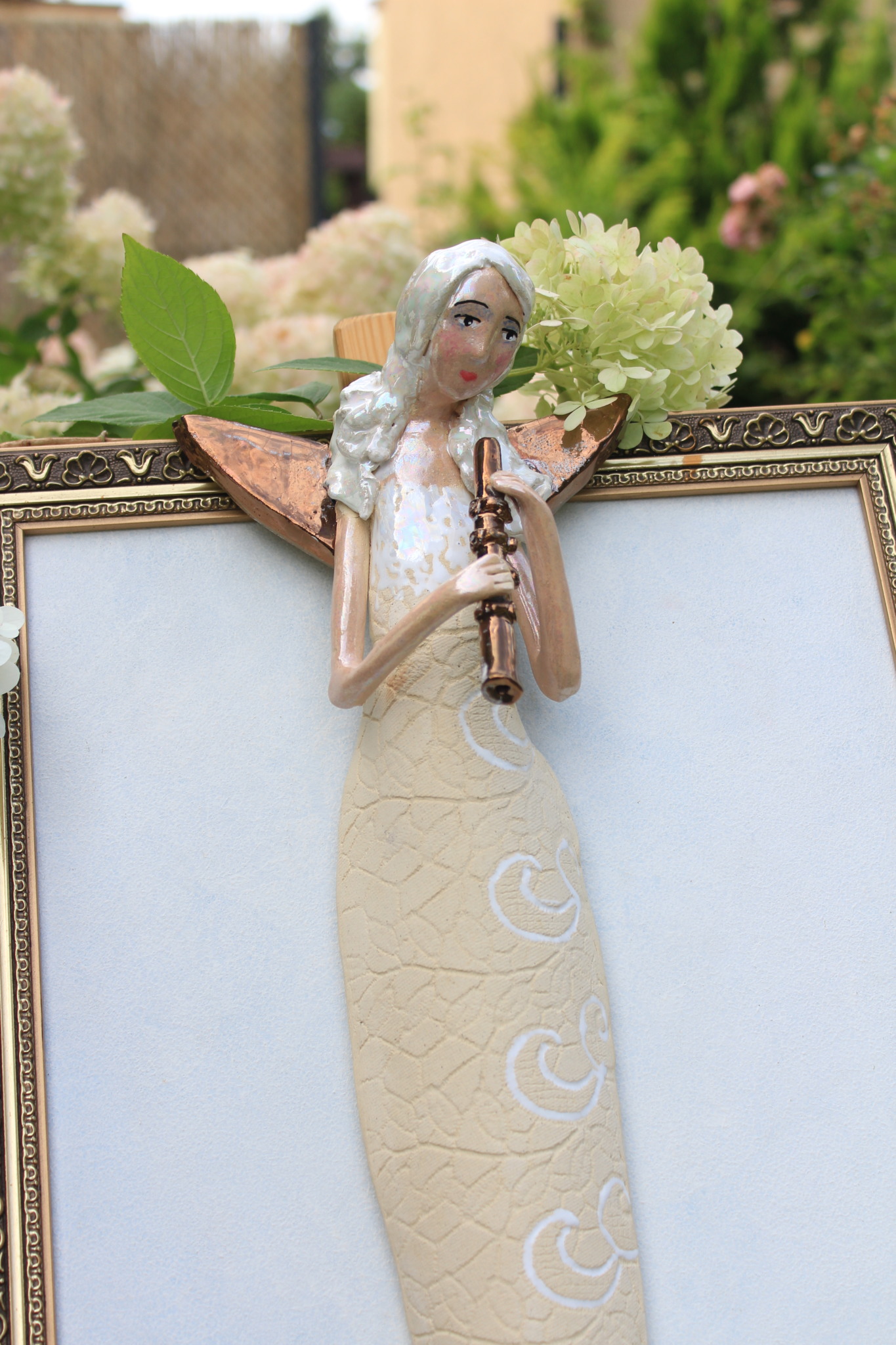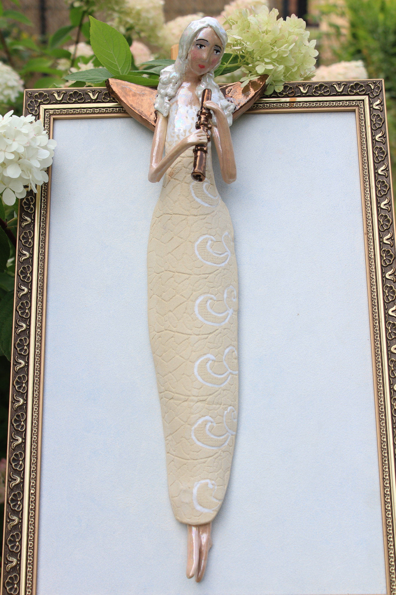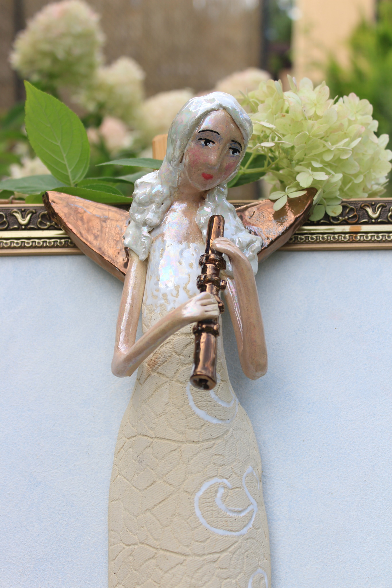 Anioł z miedzianym klarnetem, to rzeźba wykonana ręcznie z gliny w pojedynczym egzemplarzu. Anioł ten jest trzykrotnie wypalany, szkliwiony a w detalach pokryty metalami szlachetnymi. Szczególnie polecamy tą rzeźbę, jako prezent na specjalne okazje takie jak, wesele bądź rocznice ślubu. Jej wyjątkowy wygląd sprawi, iż będzie to unikatowa ozdoba ścienna.