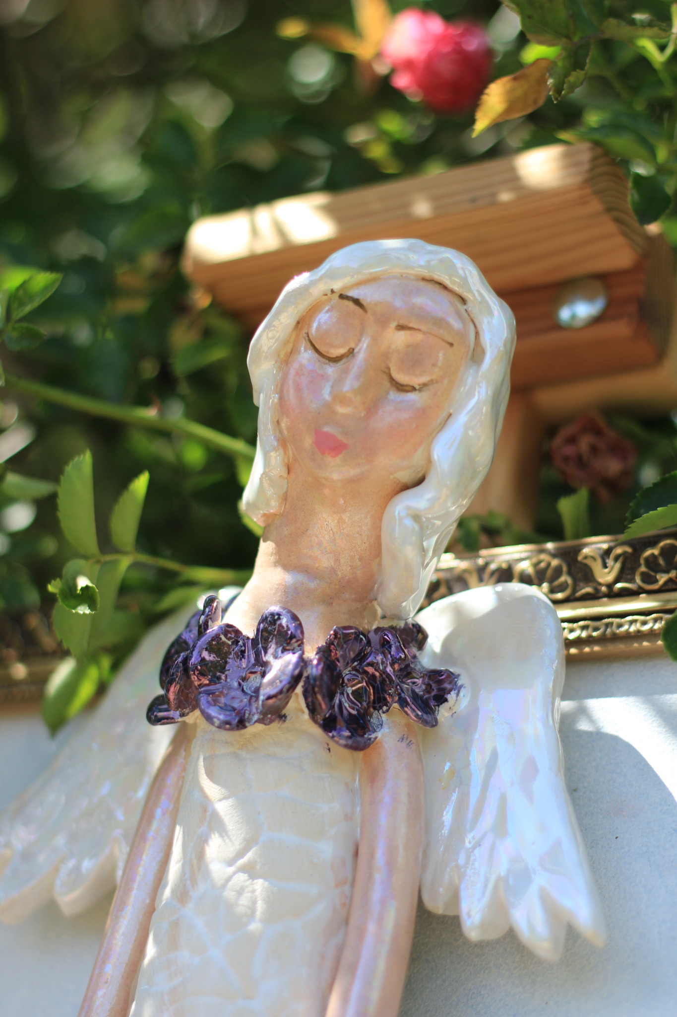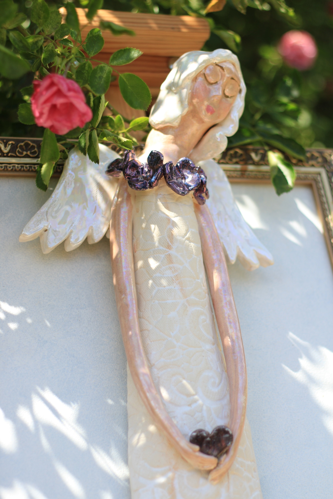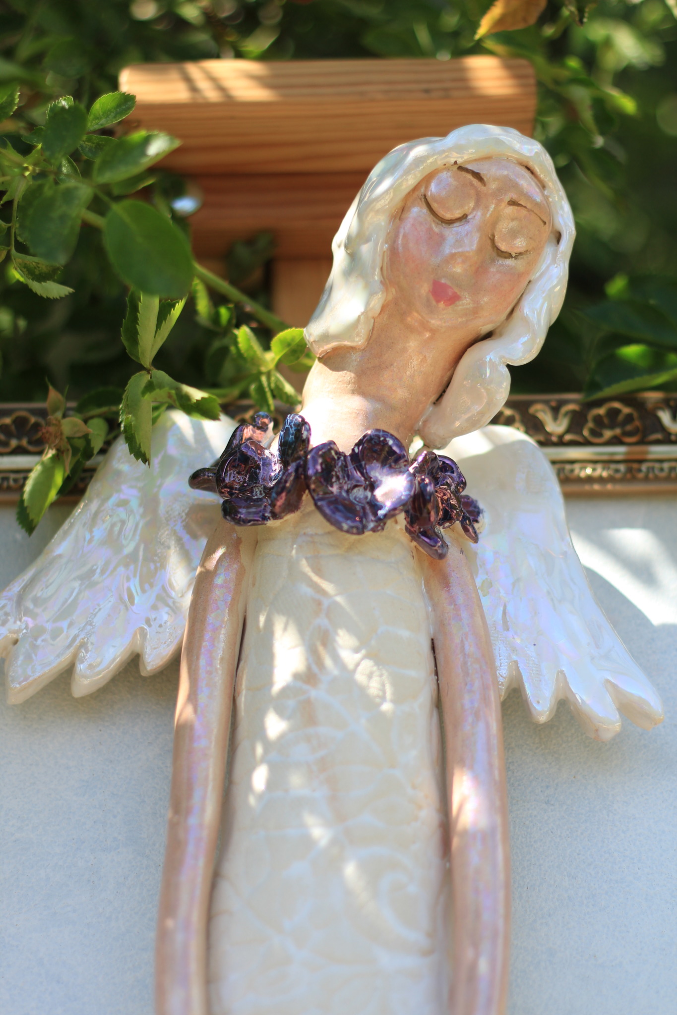 Anioł wykonany ręcznie z gliny, trzykrotnie wypalany, szkliwiony i zdobiony metalami szlachetnymi. Wykonany w pojedynczym egzemplarzu, będzie unikatową ozdobą wnętrza lub sprawdzi się również jako prezent.