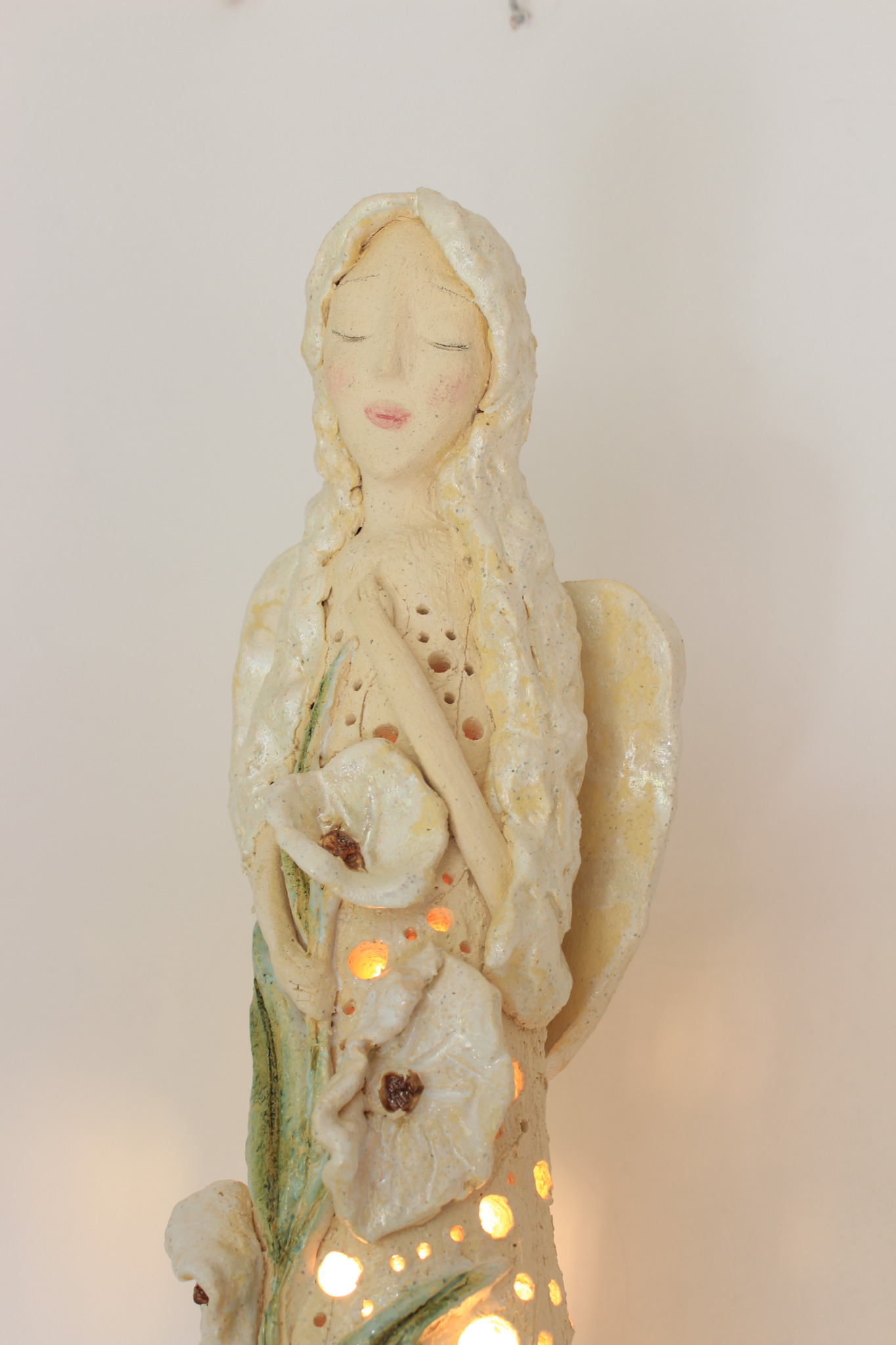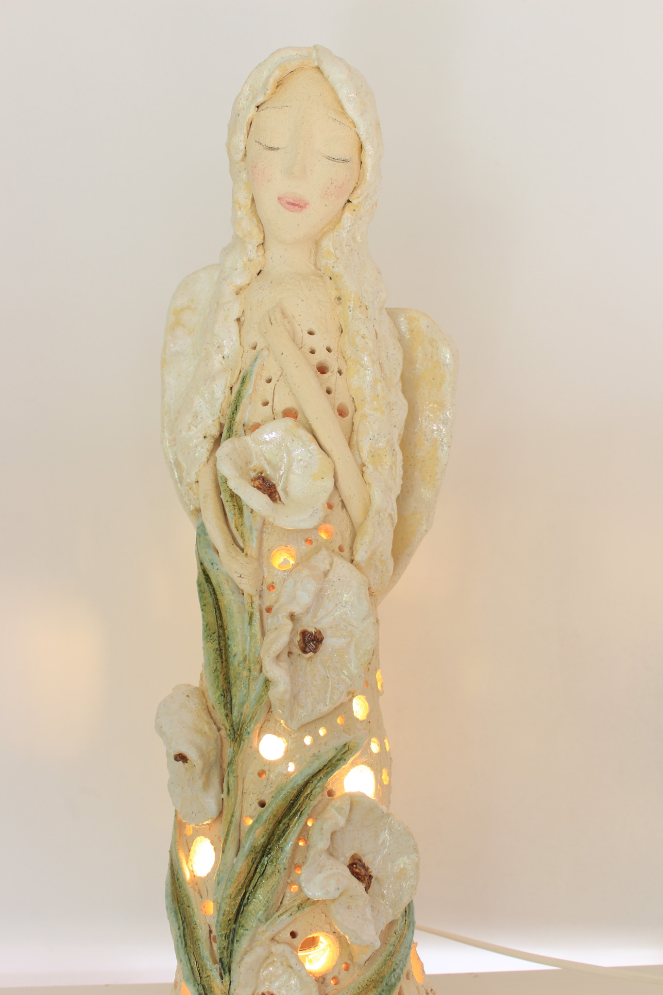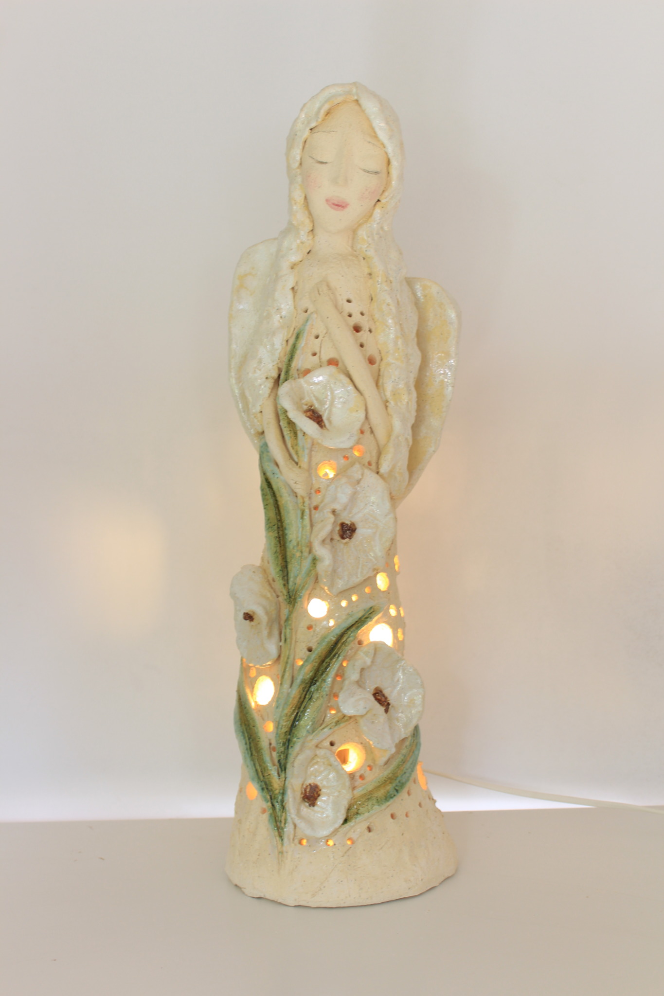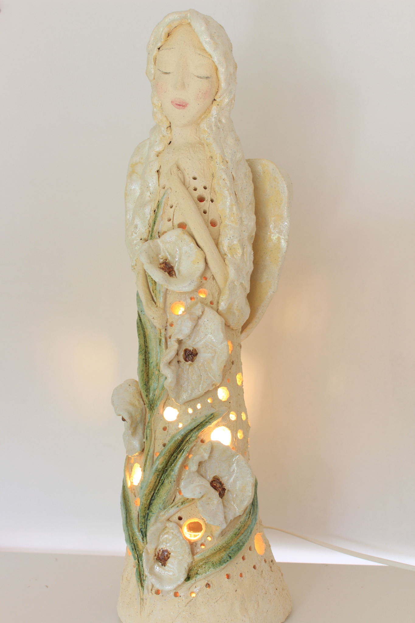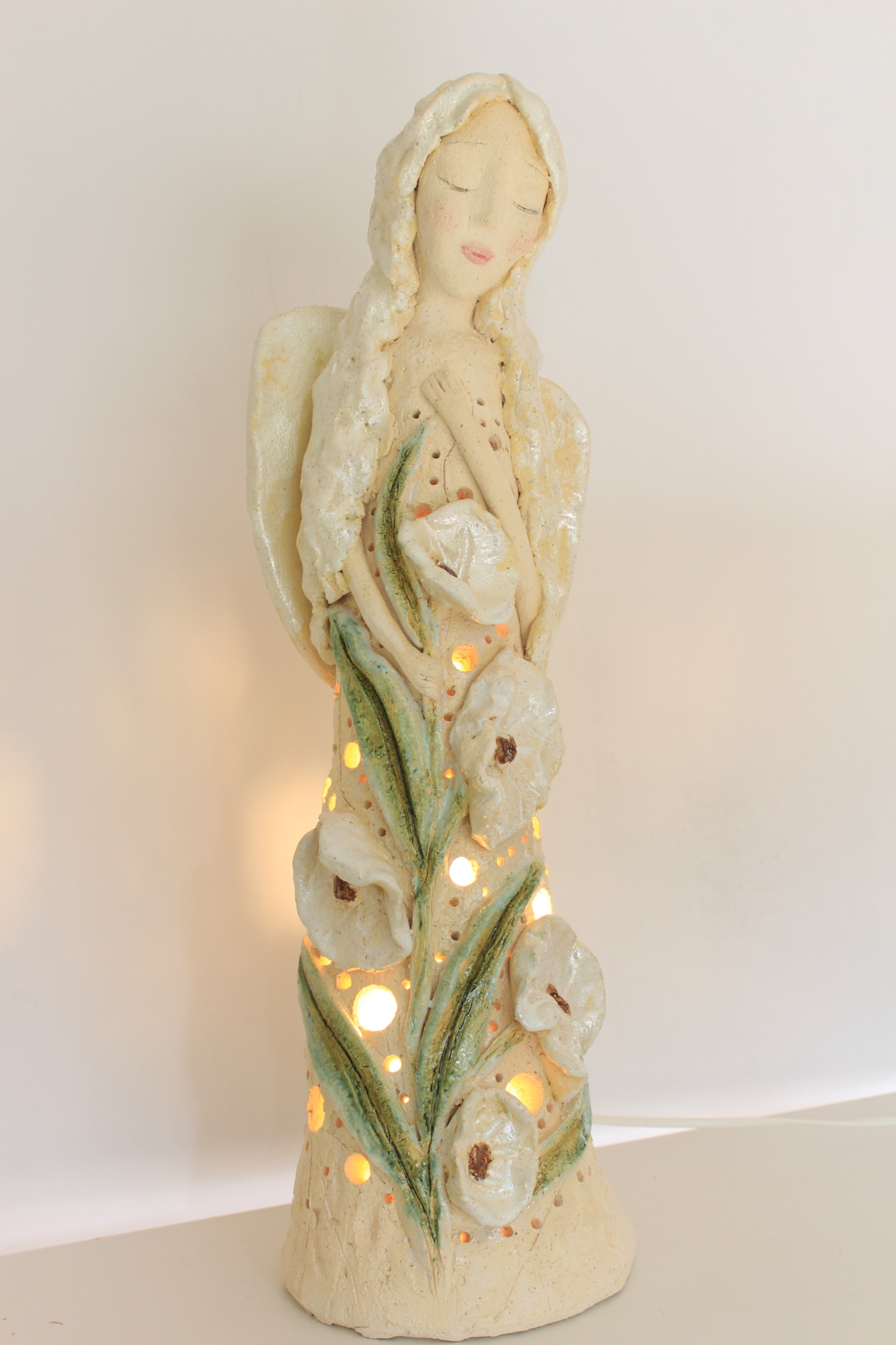 • Ceramiczna lampa w formie anioła wykonana ręcznie z gliny szamotowej w pojedynczym egzemplarzu. Lampa jest dwukrotnie wypalana oraz szkliwiona w detalach. Szczególnie polecamy tą lampę jako nieszablonową ozdobę wnętrza. Do lampy dołączona jest żarówka LED 40w wraz z oprawką oraz przewodem o długości 2m.