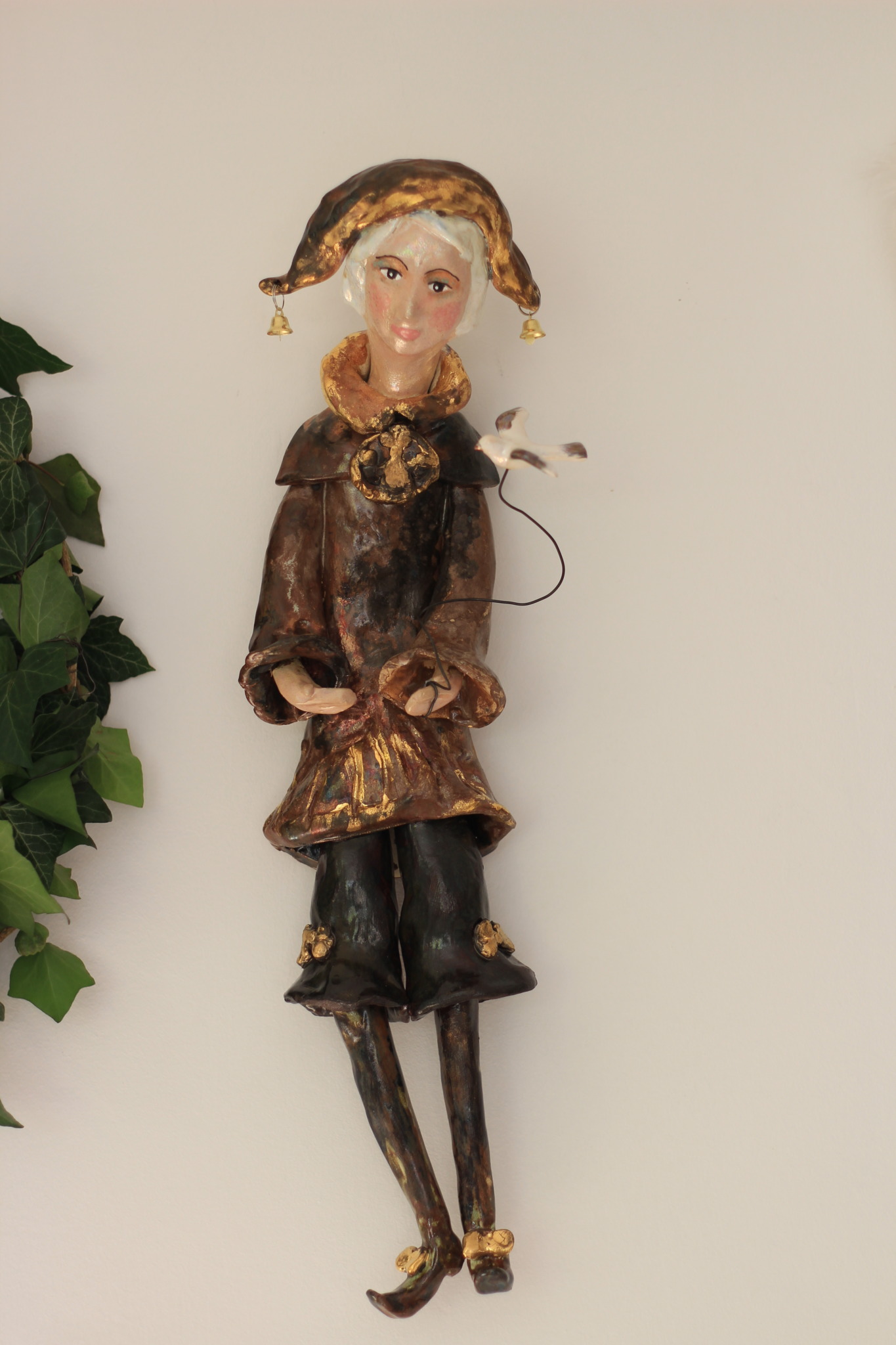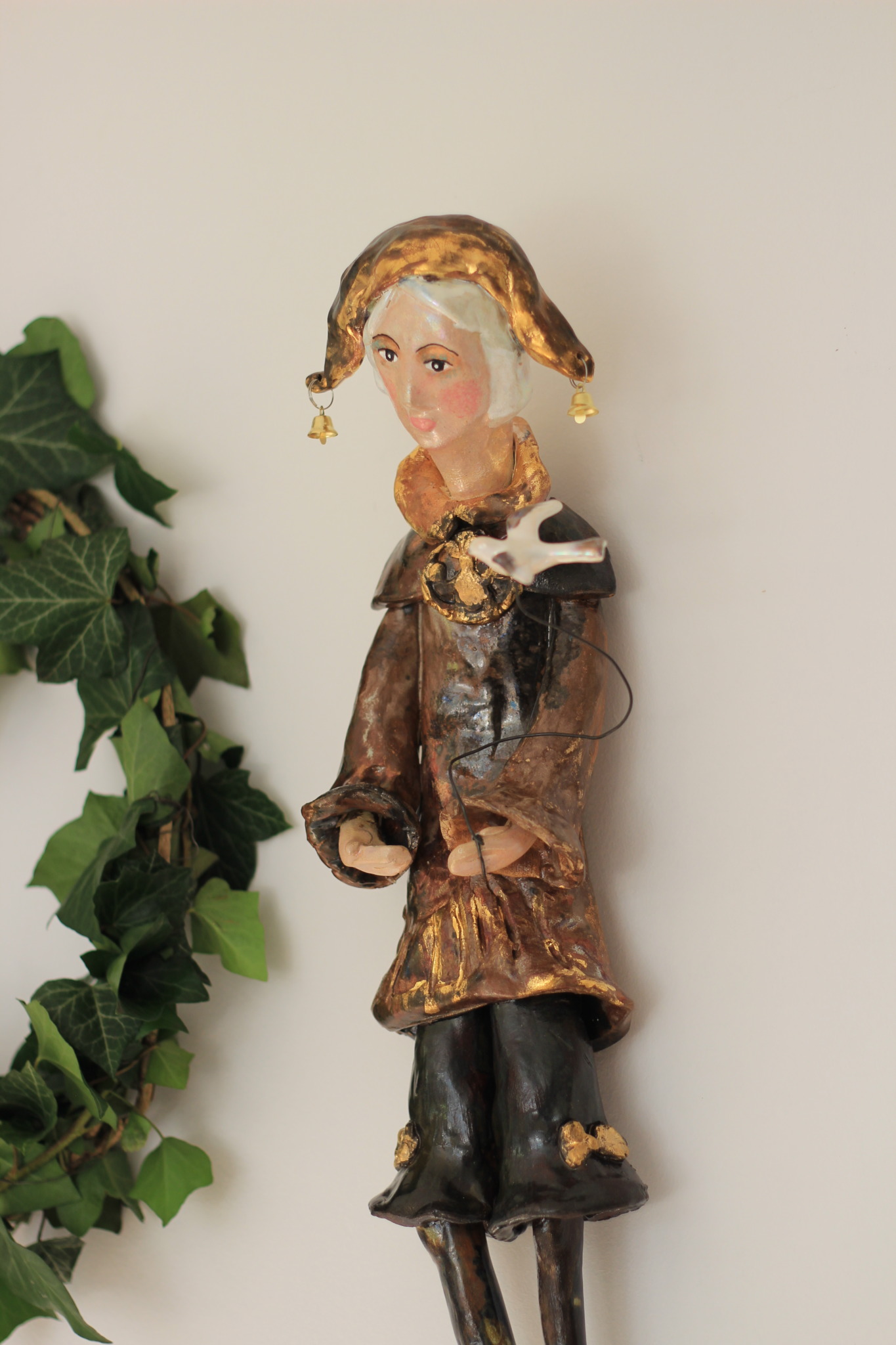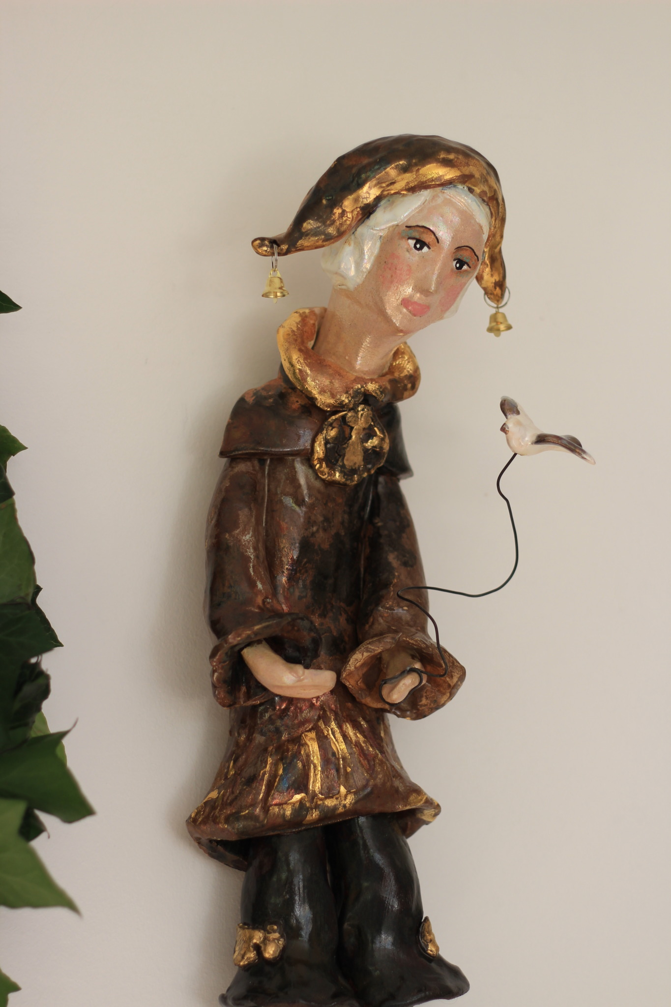 Pierrot wykonany ręcznie z gliny w pojedynczym egzemplarzu. Trzykrotnie wypalany, szkliwiony i w detalach zdobiony metalami szlachetnymi. Stanowi świetną propozycję dla unikatowego prezentu dla bliskiej osoby oraz oryginalną ozdobę ścienną.