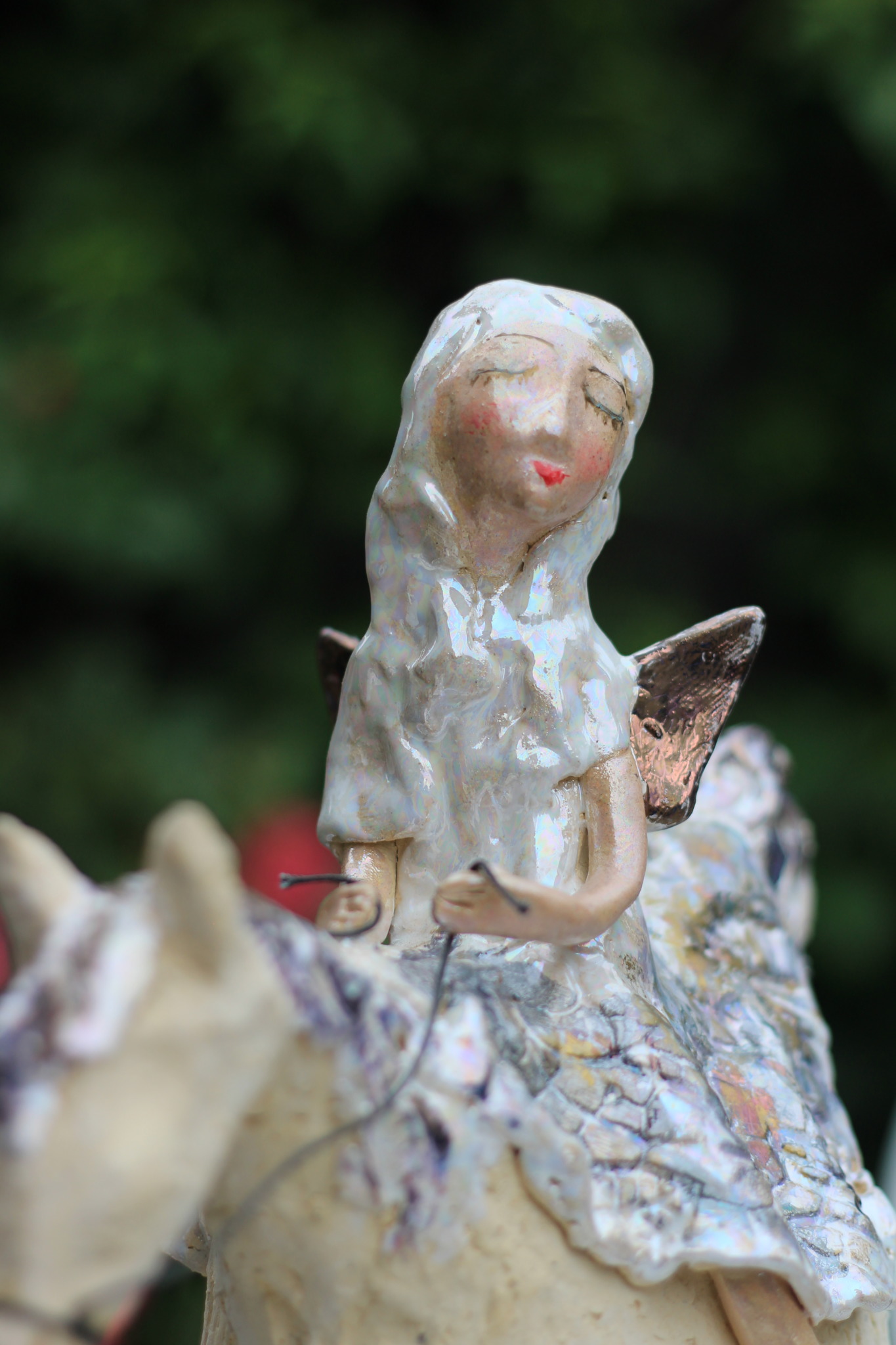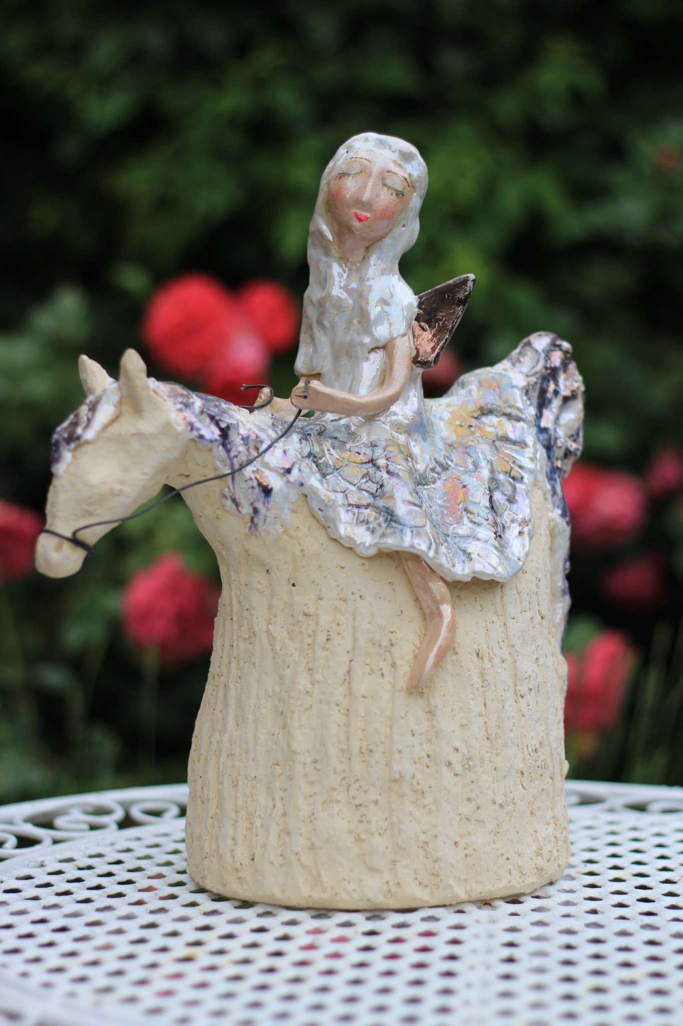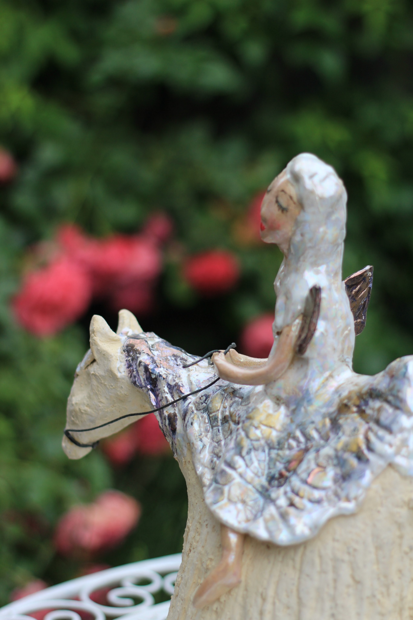 Rzeźba przedstawiająca anioła na koniu została wykonana w pojedynczym egzemplarzu. Rzeźba trzykrotnie wypalana, częściowo szkliwiona a w detalach pokryta lustrami, stanowi nietuzinkową ozdobę wnętrza jak i formę prezentu dla bliskiej osoby.
