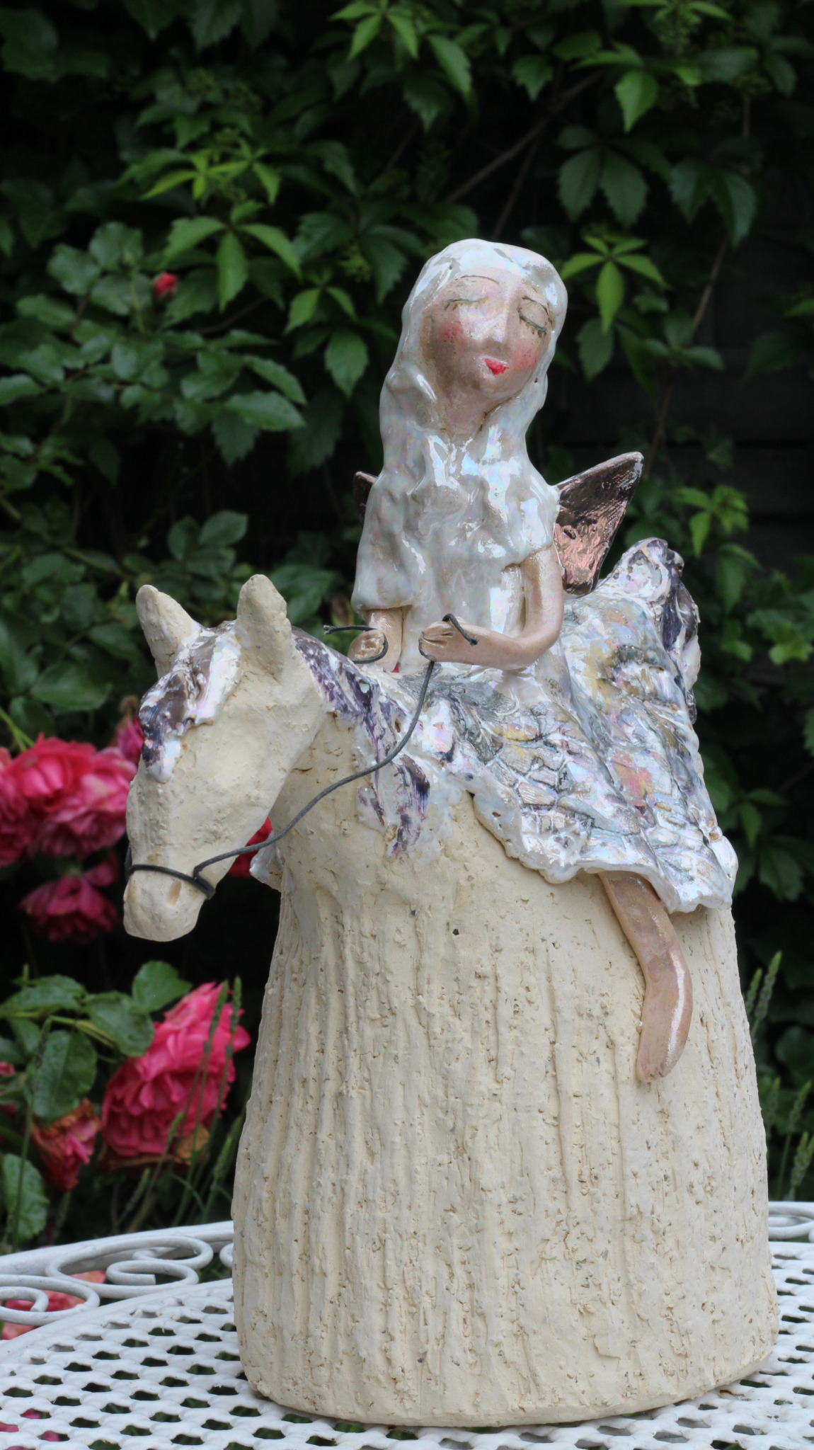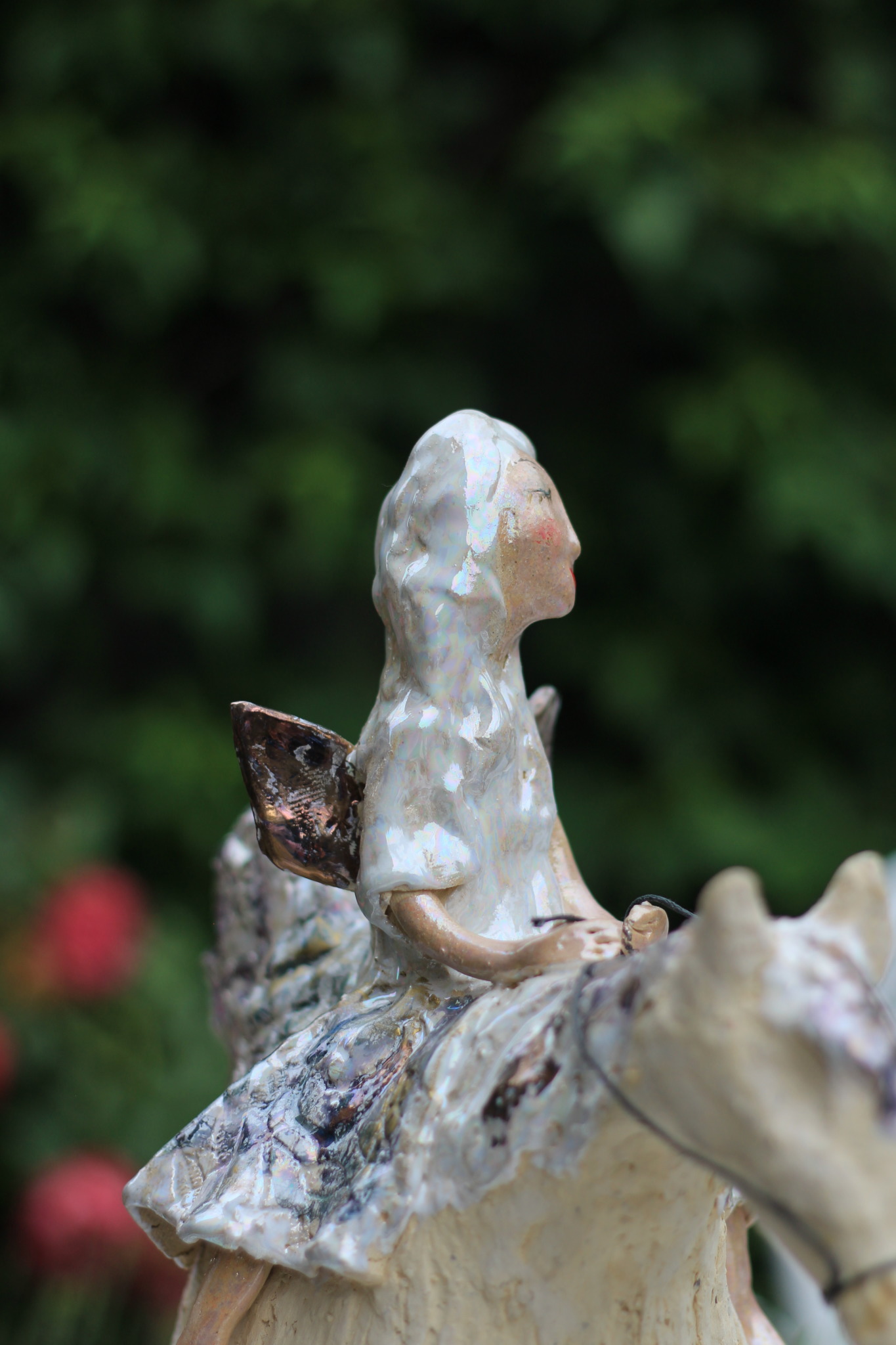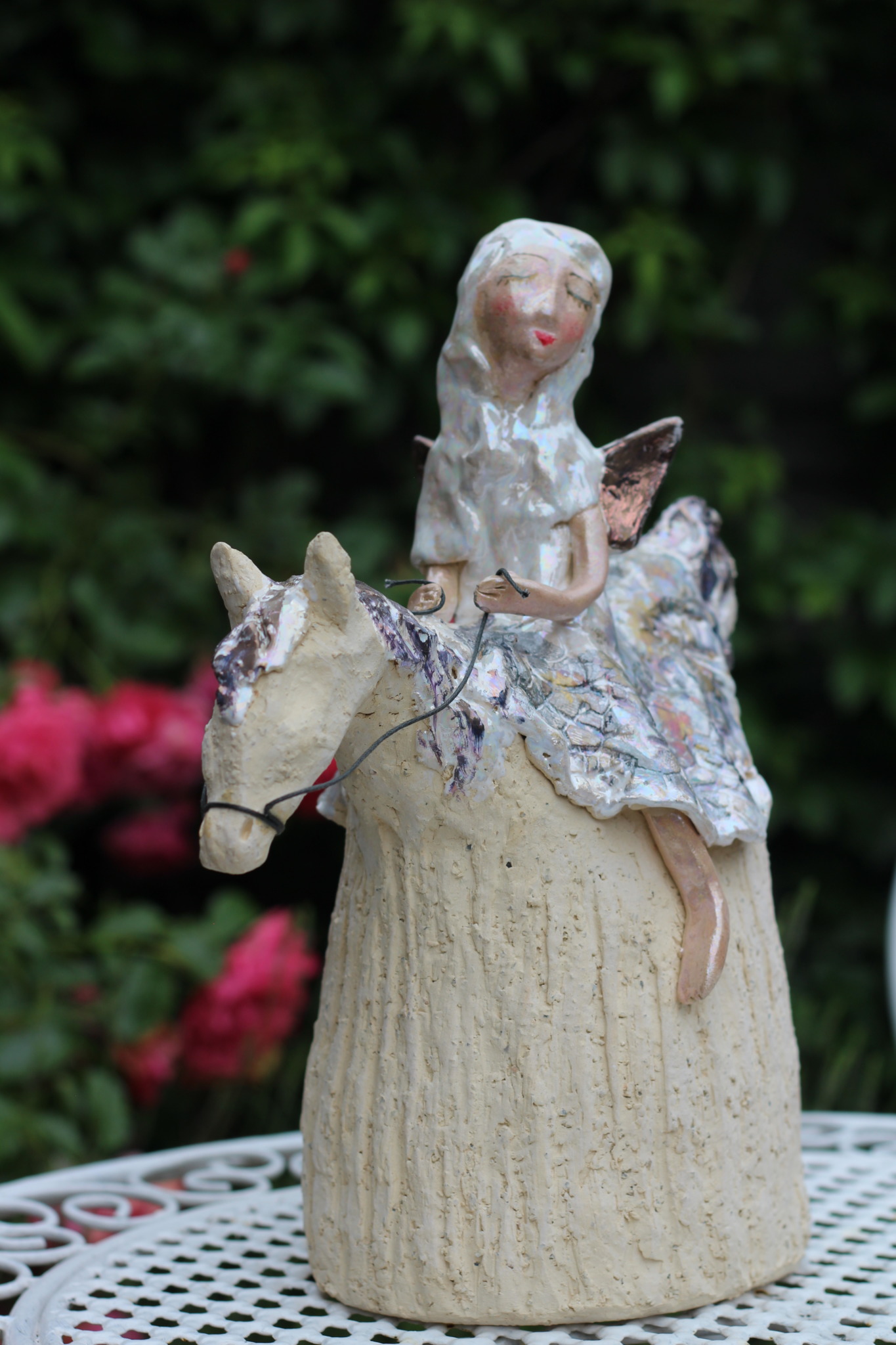 Rzeźba przedstawiająca anioła na koniu została wykonana w pojedynczym egzemplarzu. Rzeźba trzykrotnie wypalana, częściowo szkliwiona a w detalach pokryta lustrami, stanowi nietuzinkową ozdobę wnętrza jak i formę prezentu dla bliskiej osoby.