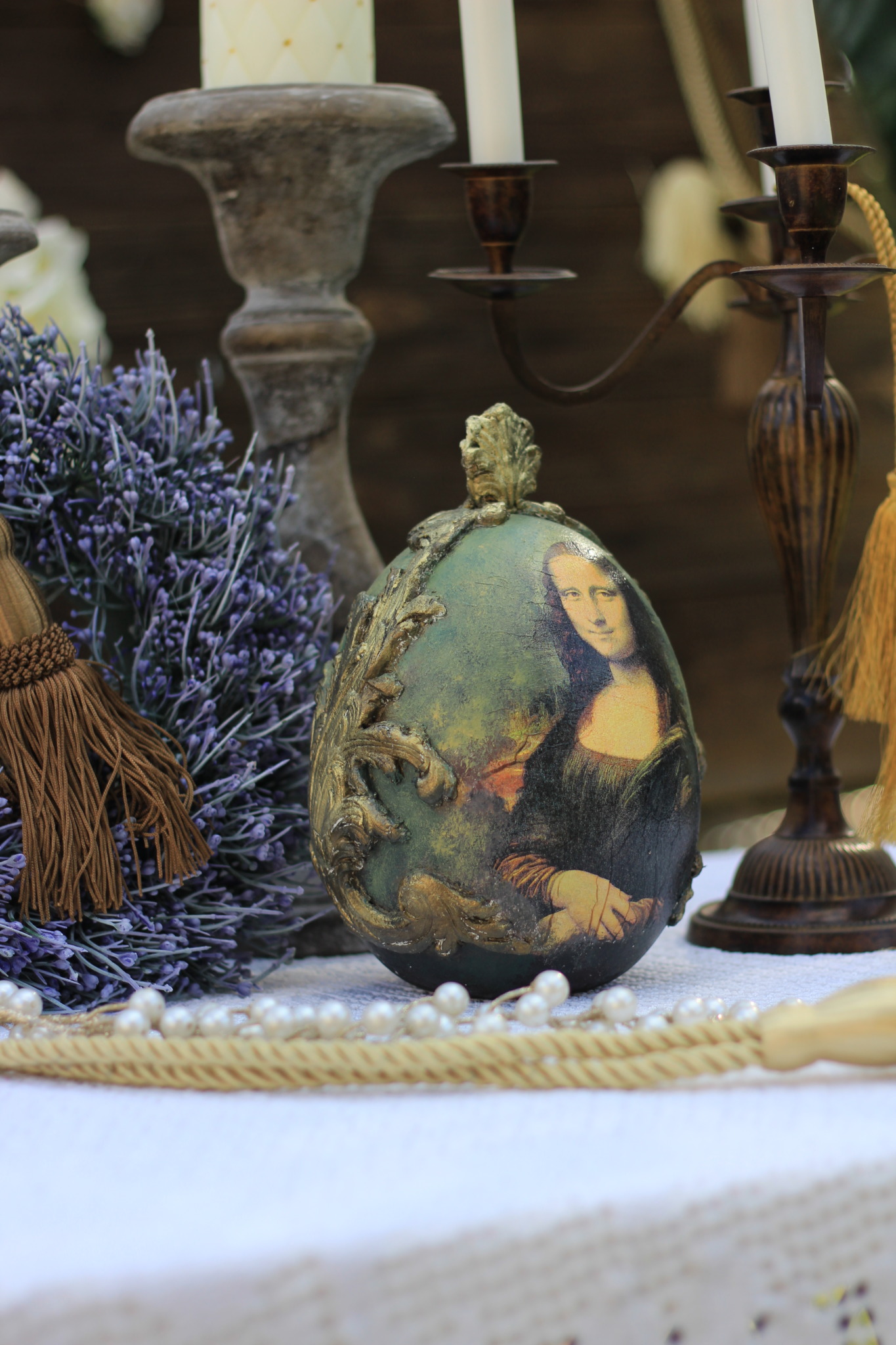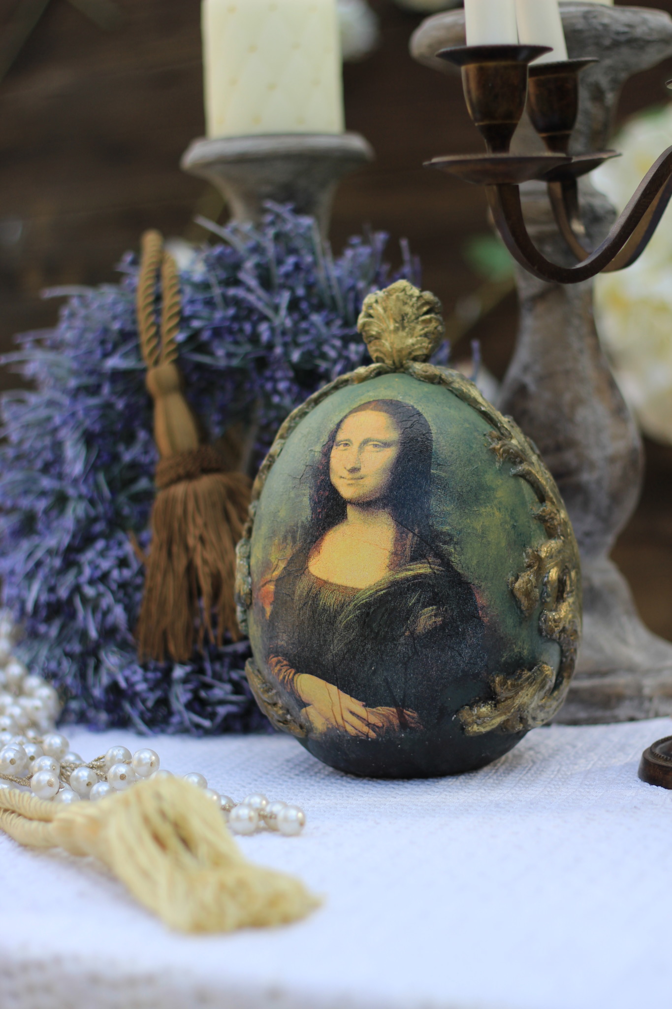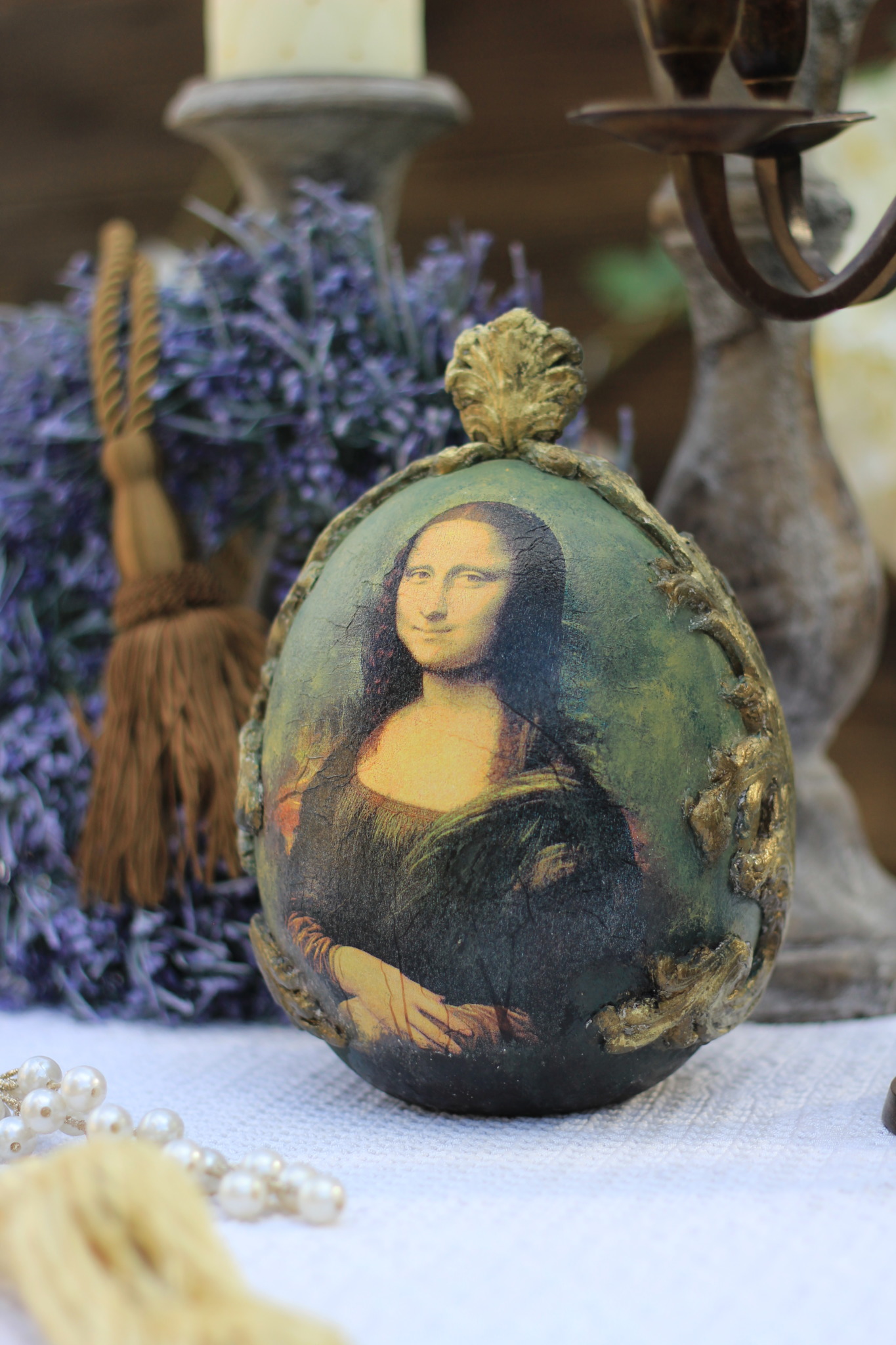 Jajo ceramiczne w stylu barokowym zdobione metodą decoupage oraz techniką własną. Idealne do dekoracji wielkanocnej lub całorocznej, na stół, komodę, okno lub kominek.