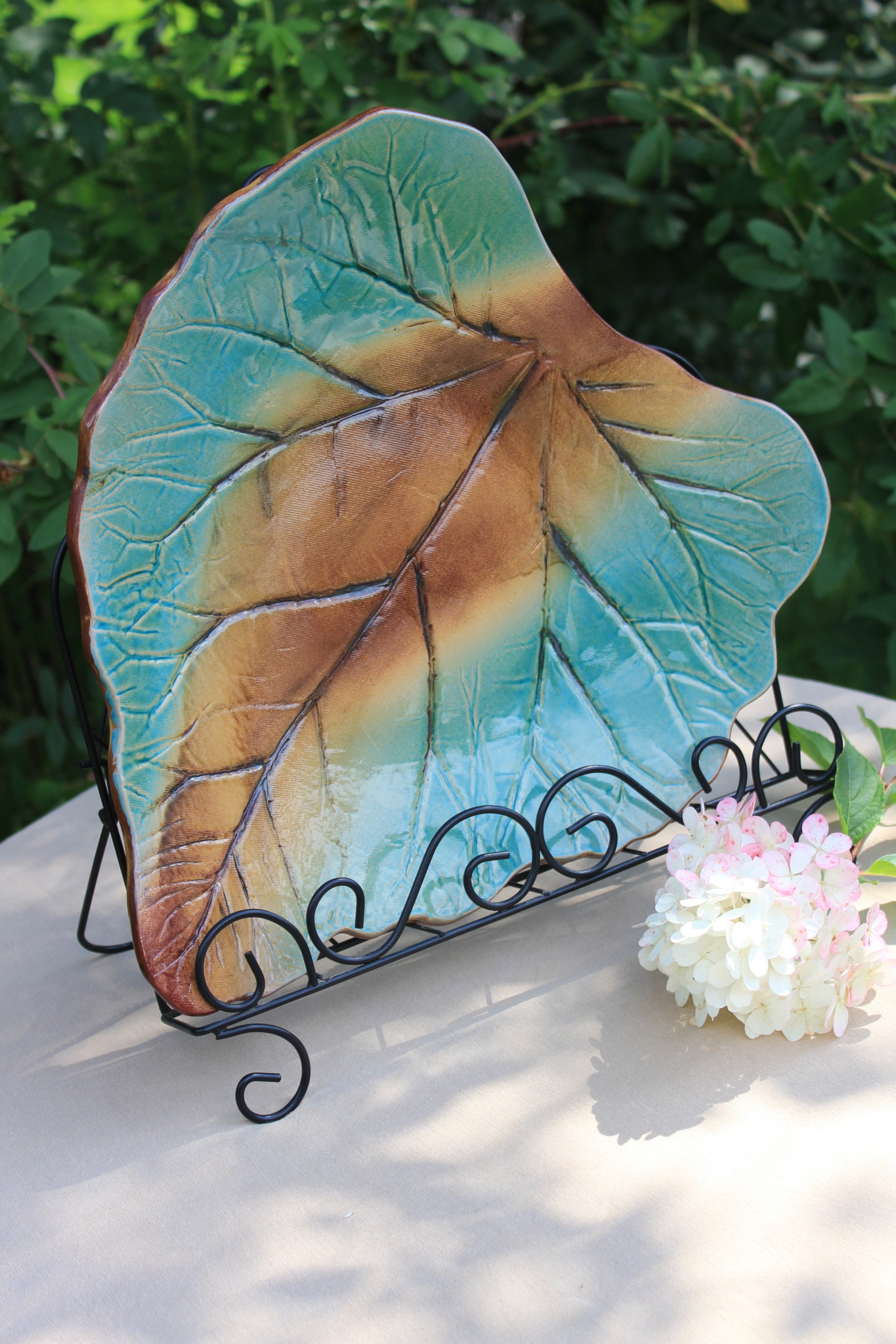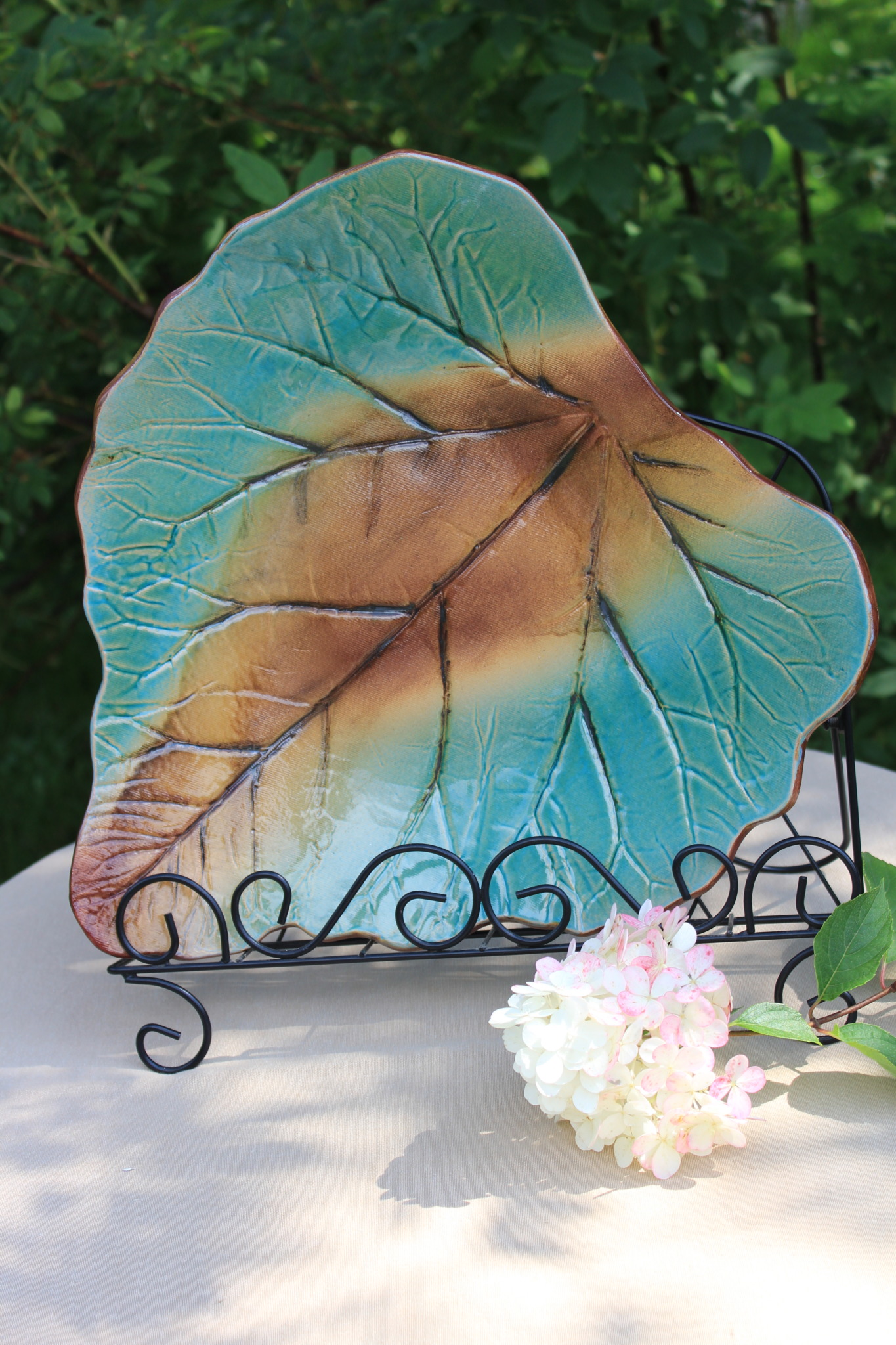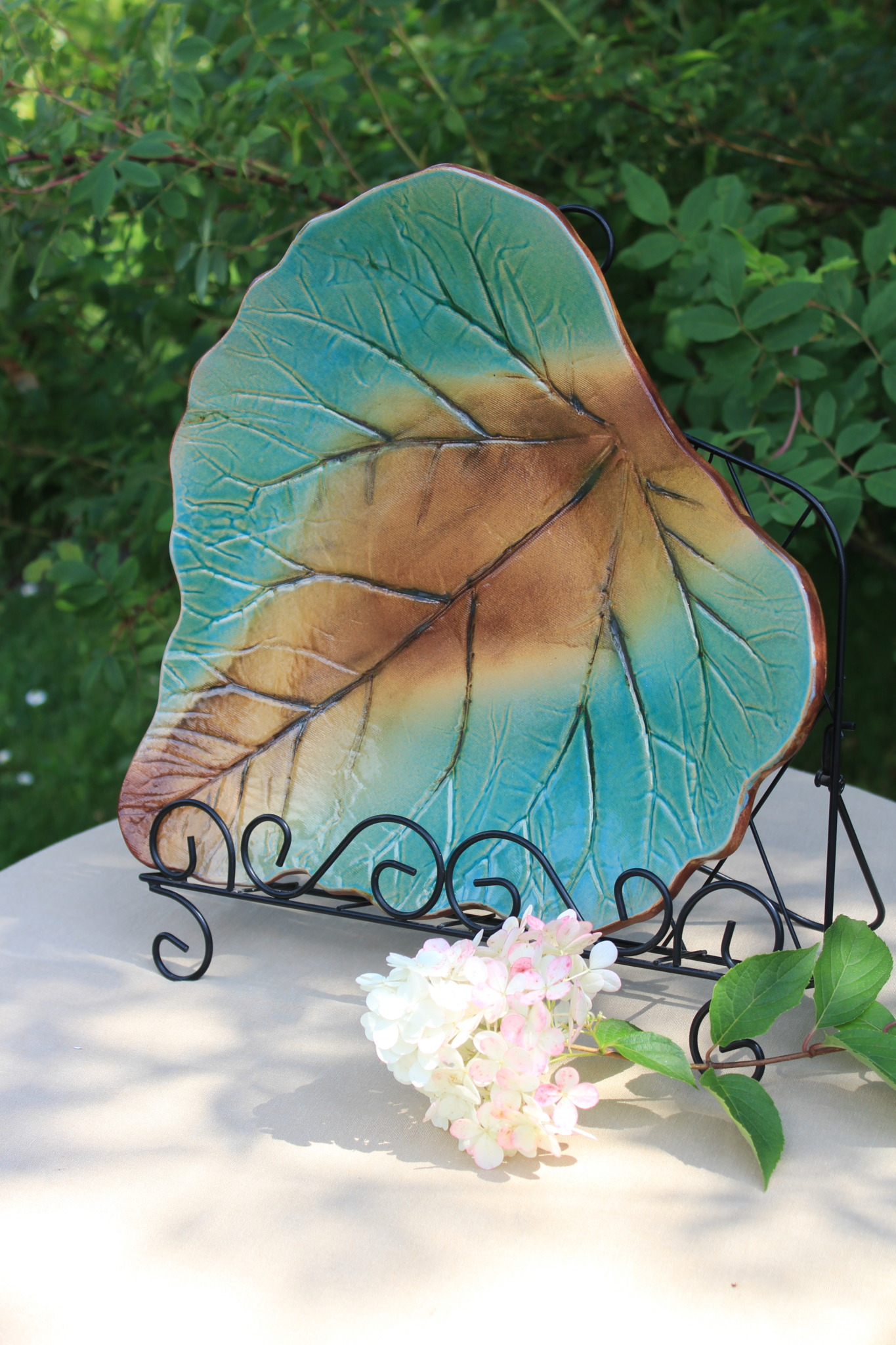 • Ceramiczna Patera w formie liścia. Patera jest dwukrotnie wypalana i obustronnie pokryta szkliwem. Sprawdzi się idealnie jako dekoracja kuchenna pod owoce lub warzywa.