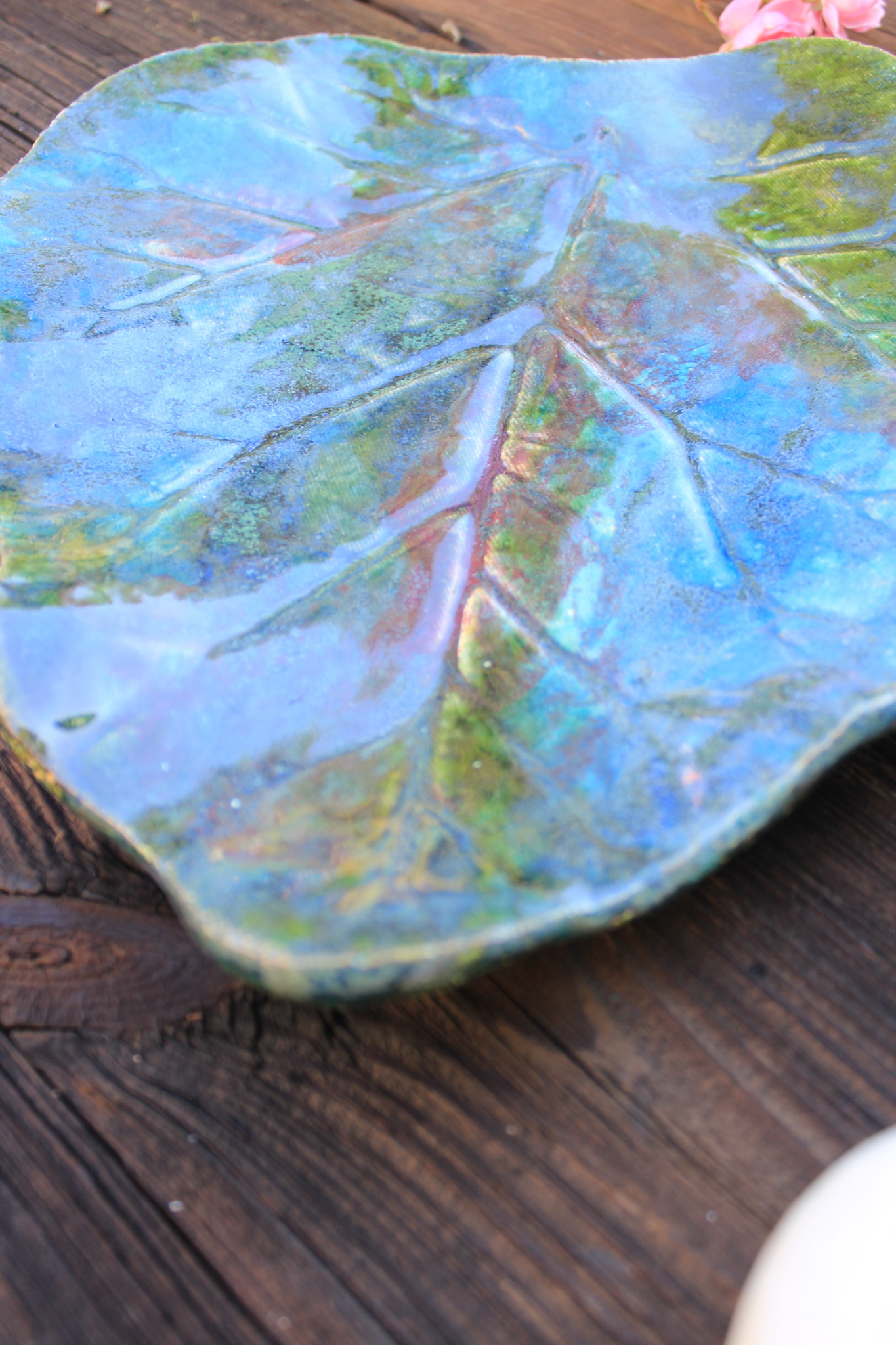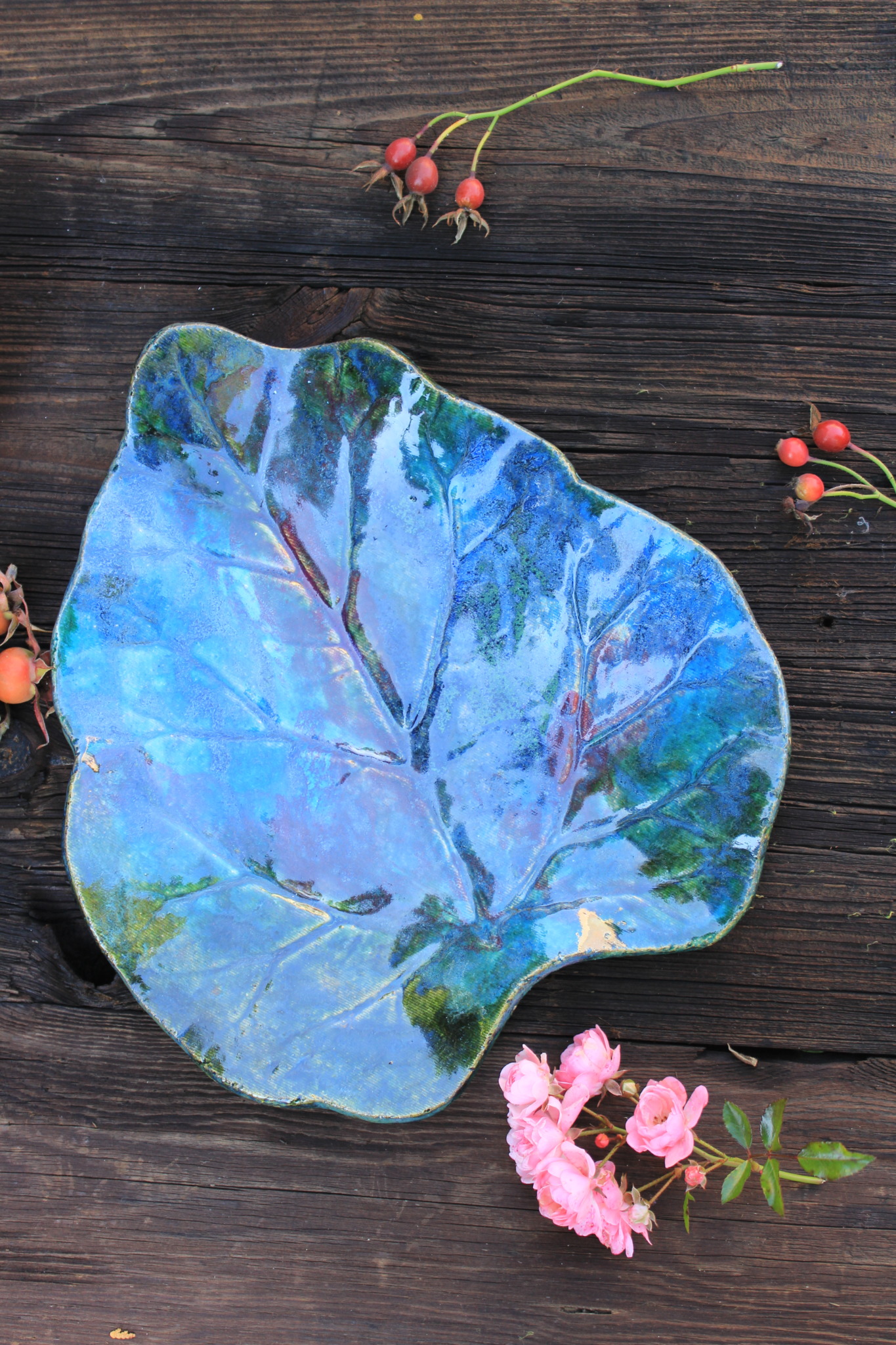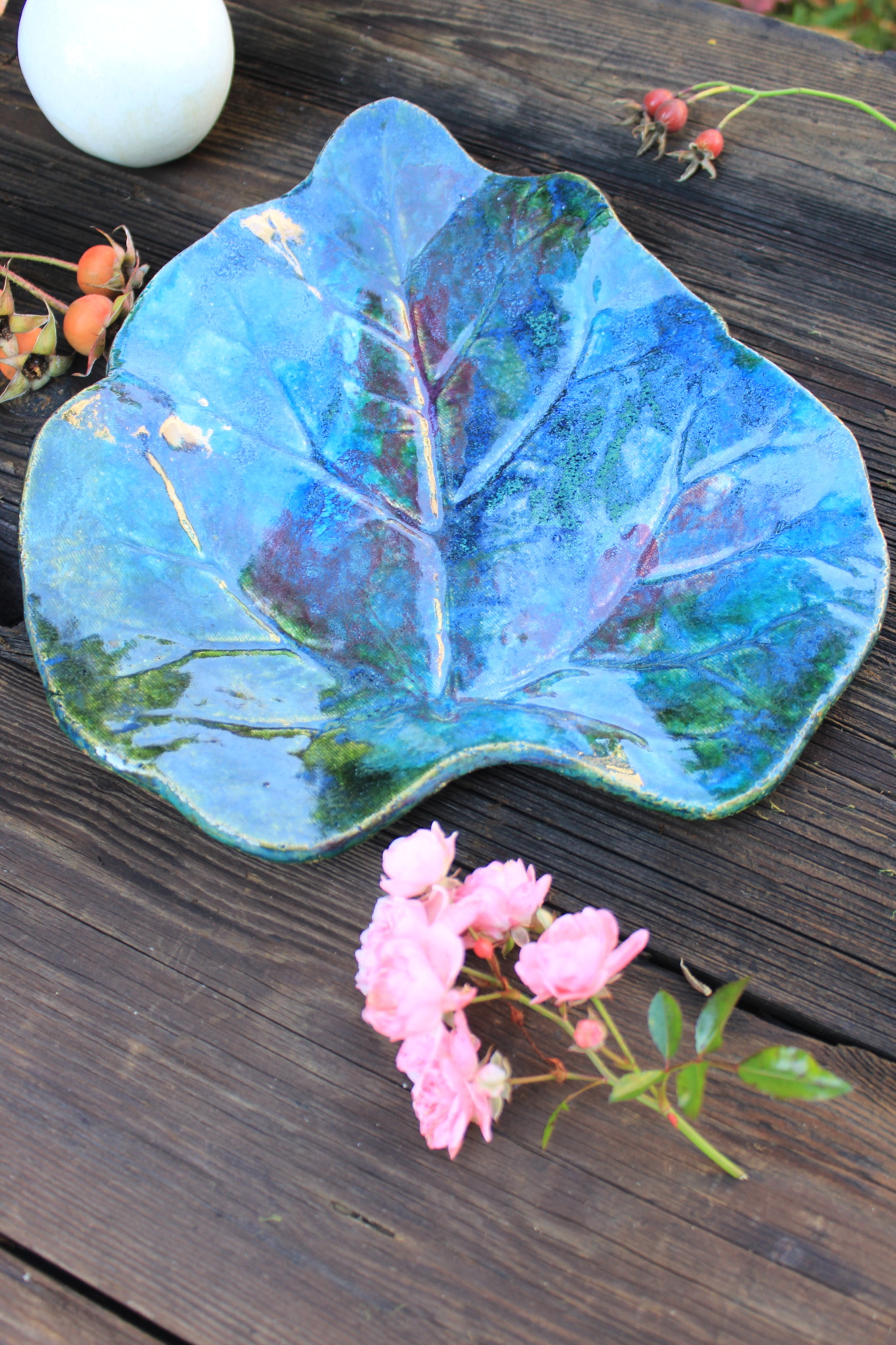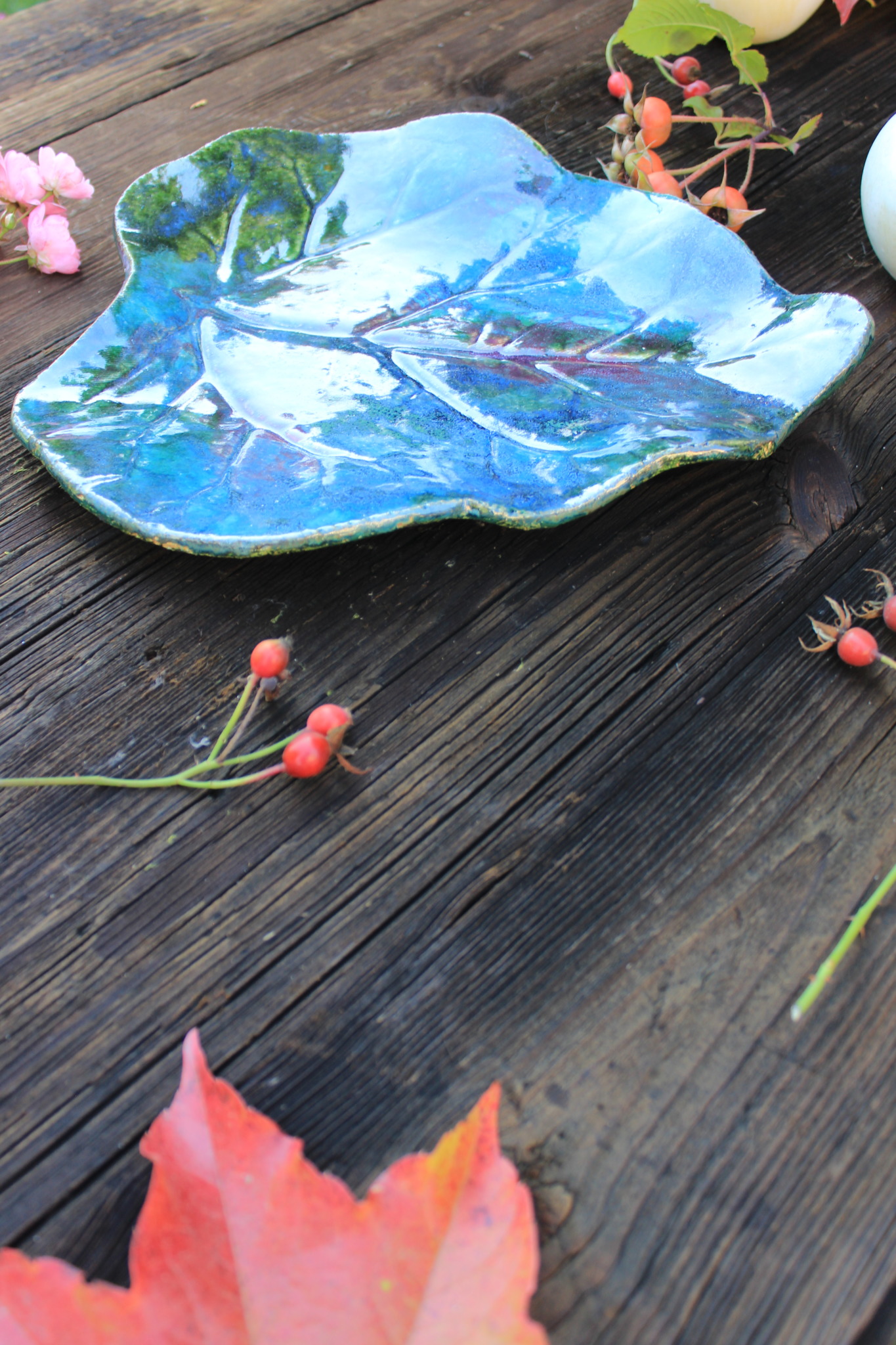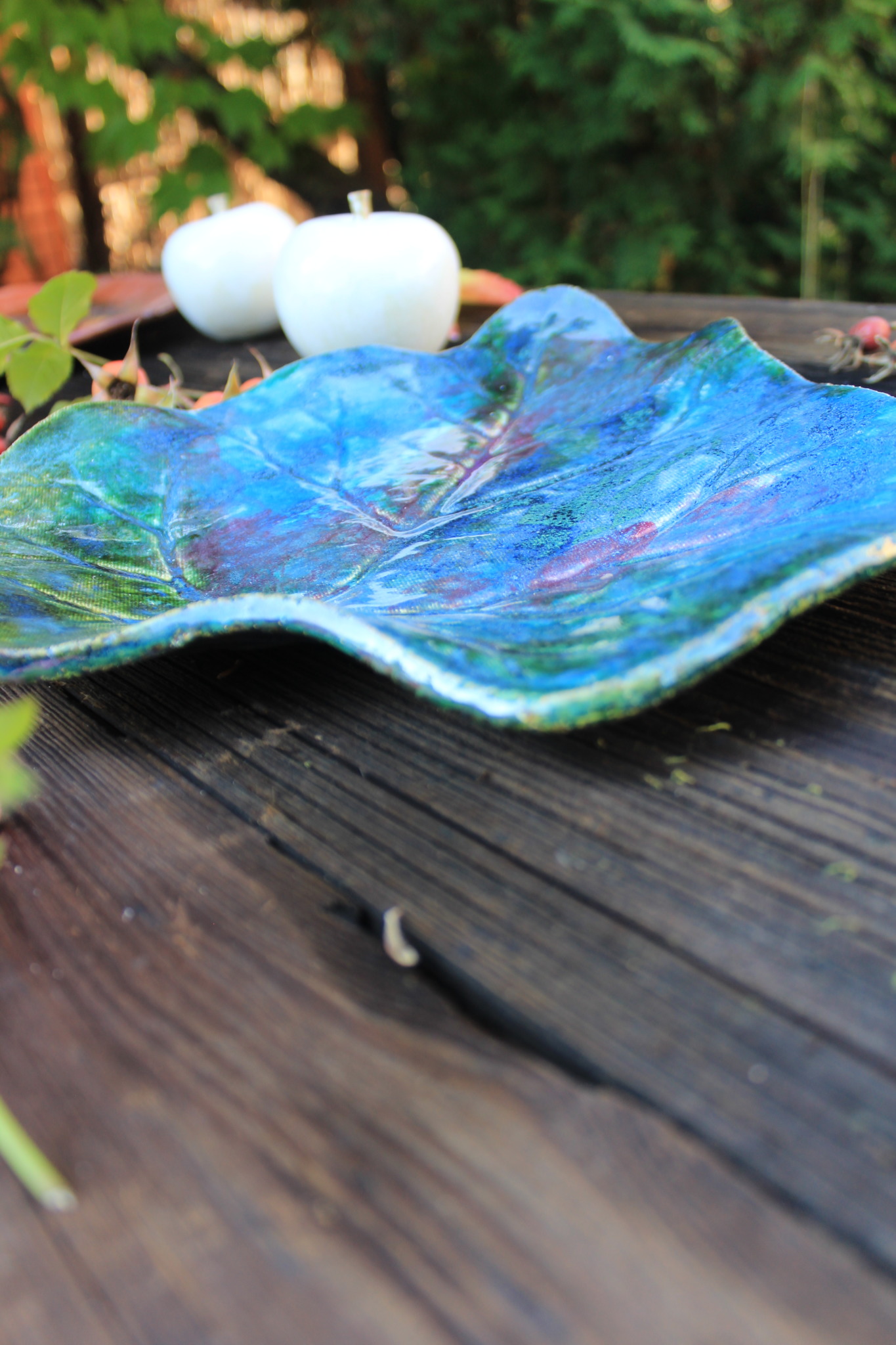• Ceramiczna Patera w formie liścia. Patera jest dwukrotnie wypalana i obustronnie pokryta szkliwem. Sprawdzi się idealnie jako dekoracja kuchenna pod owoce lub warzywa.