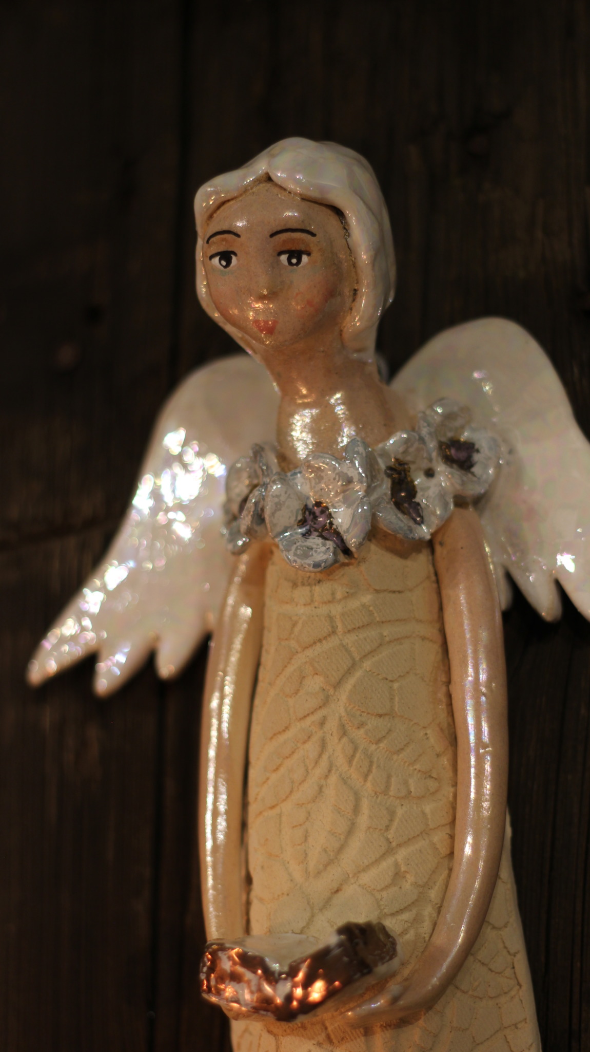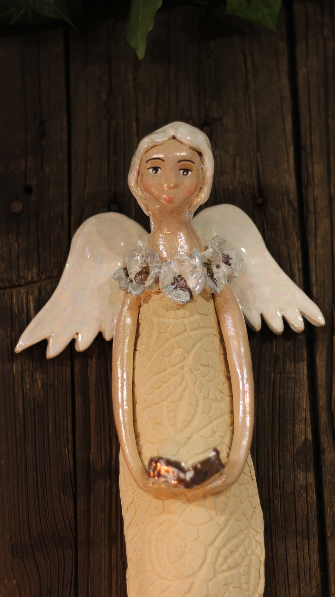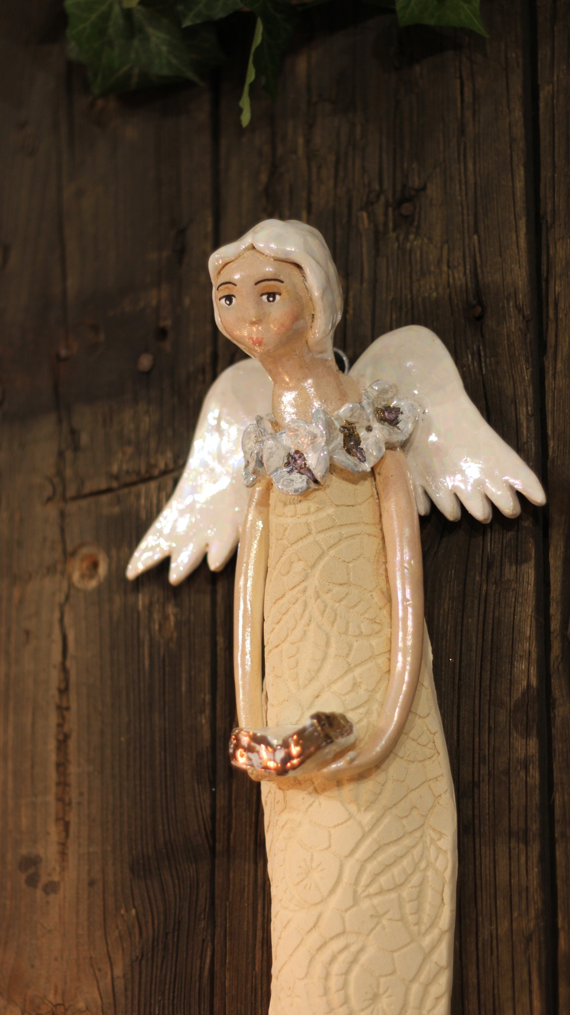 Anioł ceramiczny z książką, wykonany ręcznie z gliny w pojedynczym egzemplarzu. Trzykrotnie wypalany, szkliwiony a w detalach pokryty metalami szlachetnymi. Stanowi świetną propozycję dla unikatowego prezentu dla bliskiej osoby oraz oryginalną ozdobę ścienną.