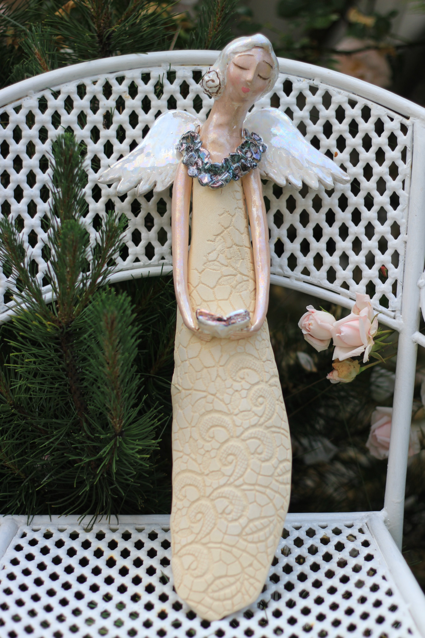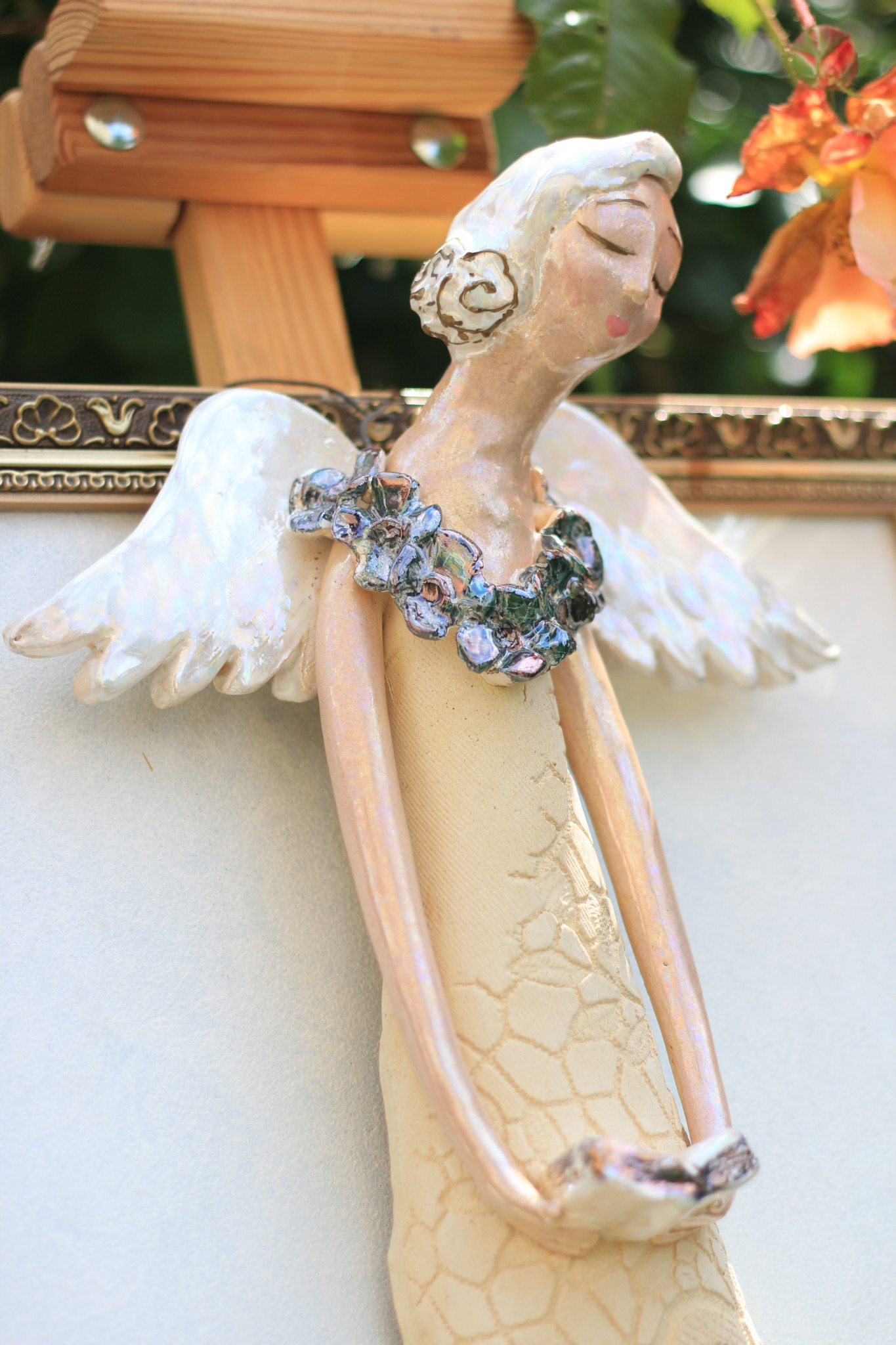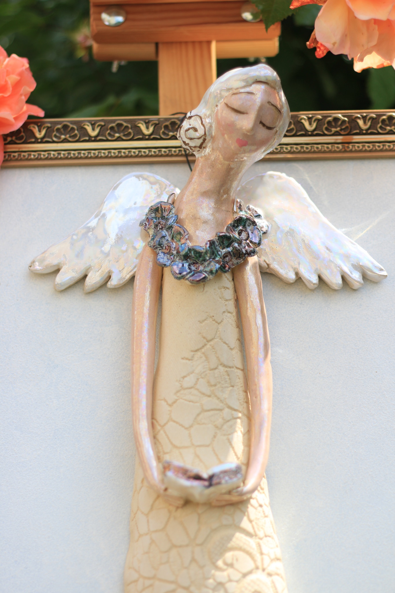 Anioł wykonany ręcznie z gliny, trzykrotnie wypalany, szkliwiony i zdobiony metalami szlachetnymi. Wykonany w pojedynczym egzemplarzu, będzie unikatową ozdobą wnętrza lub sprawdzi się również jako prezent.