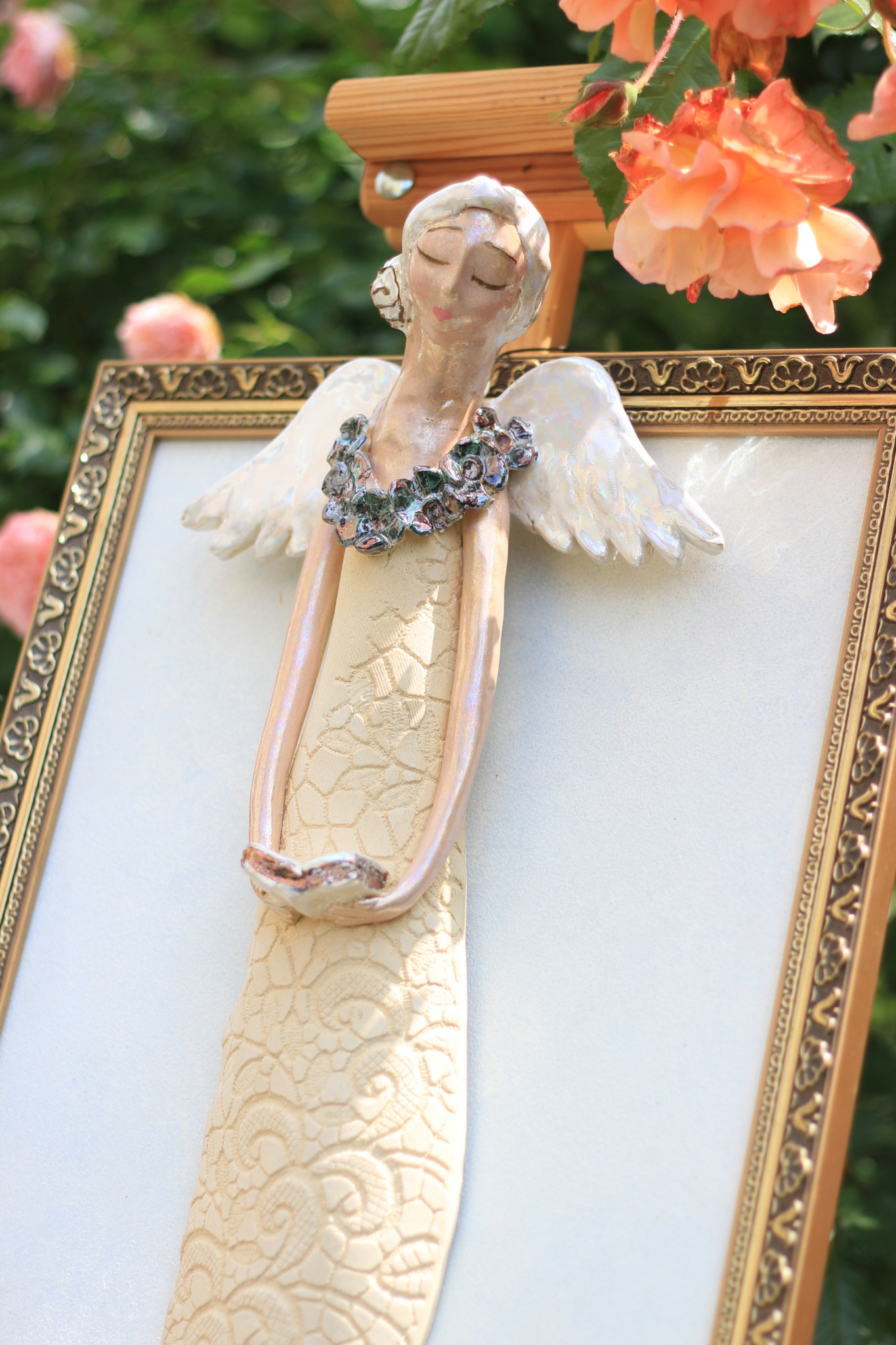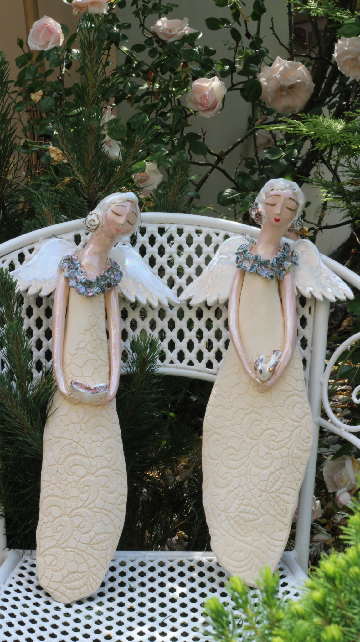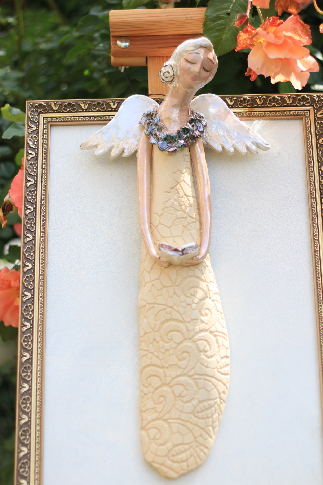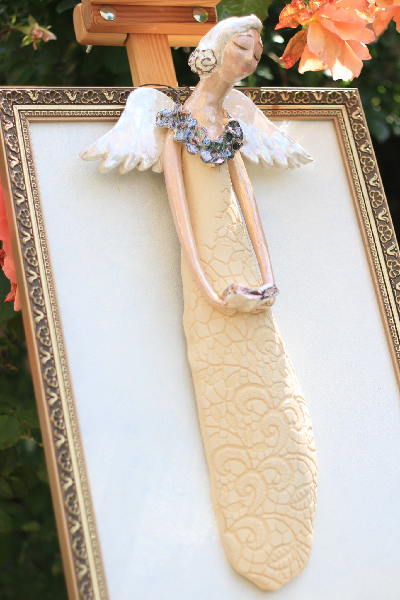 Anioł wykonany ręcznie z gliny, trzykrotnie wypalany, szkliwiony i zdobiony metalami szlachetnymi. Wykonany w pojedynczym egzemplarzu, będzie unikatową ozdobą wnętrza lub sprawdzi się również jako prezent.