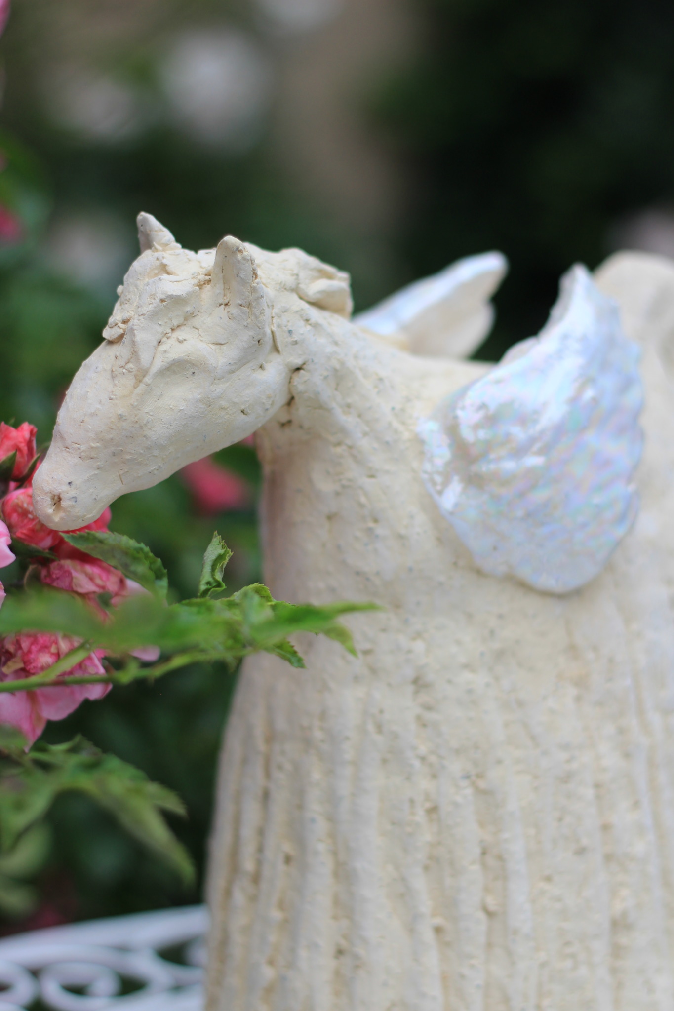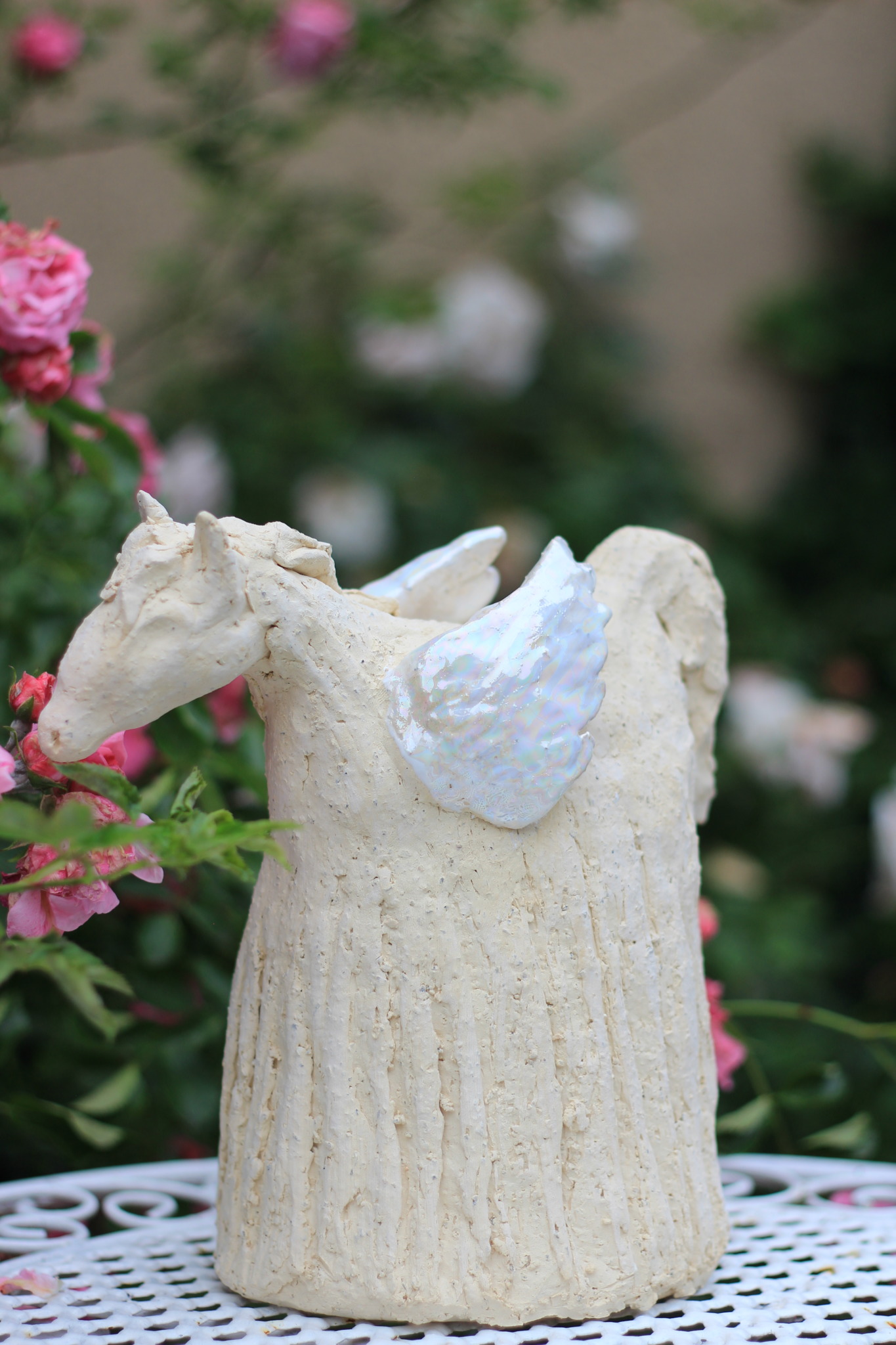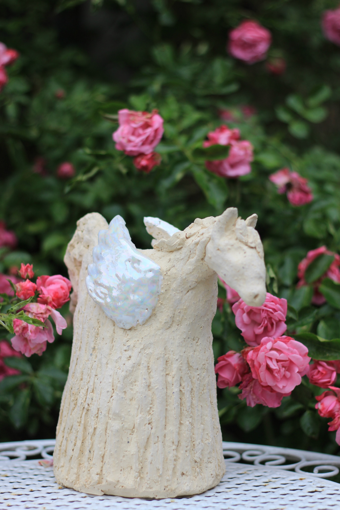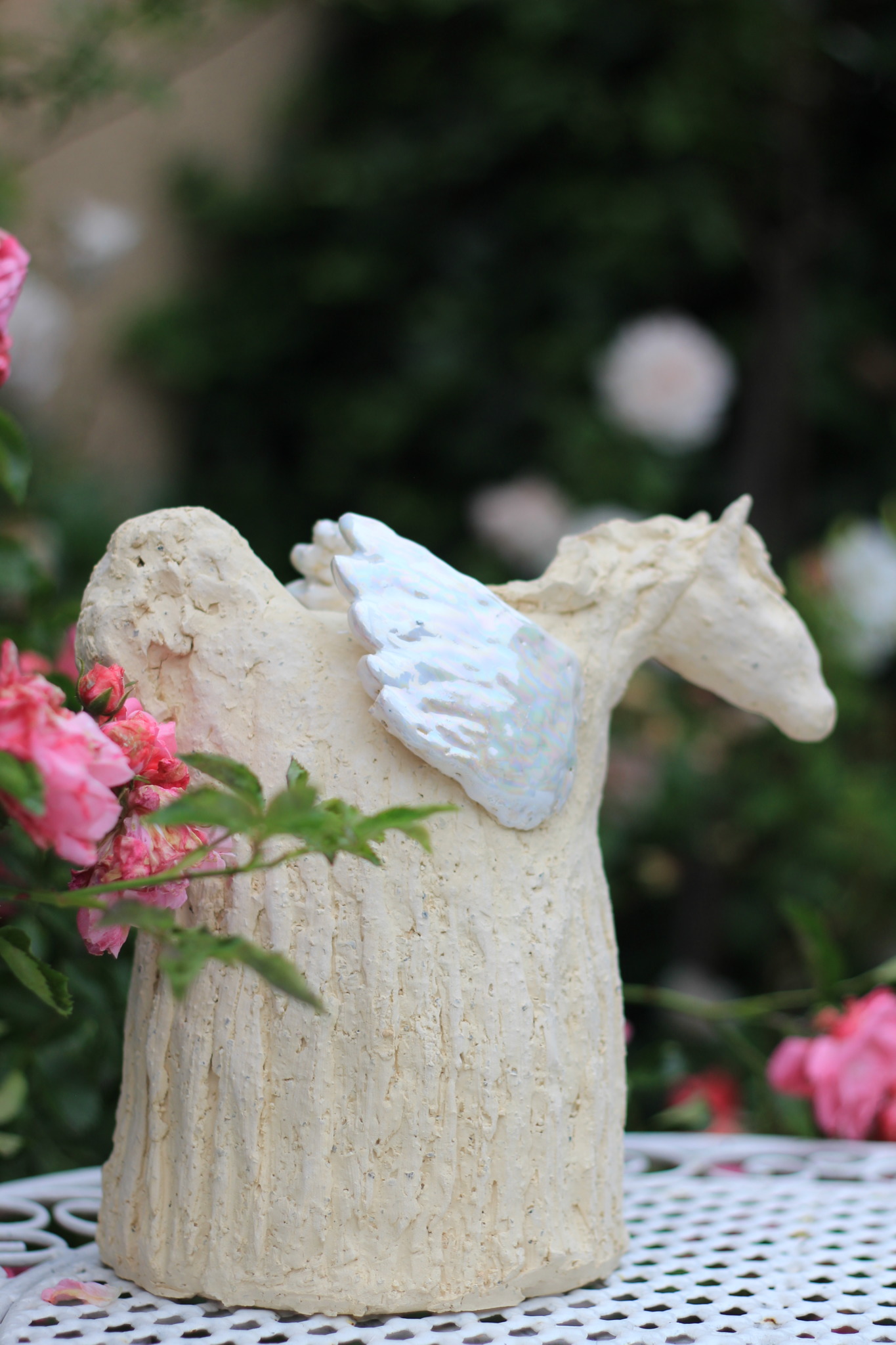 Rzeźba szamotowa przedstawiająca pegaza została wykonana w pojedynczym egzemplarzu. Rzeźba trzykrotnie wypalana, skrzydła szkliwione i pokryte lustrami, stanowi nietuzinkową ozdobę wnętrza jak i formę prezentu dla bliskiej osoby.