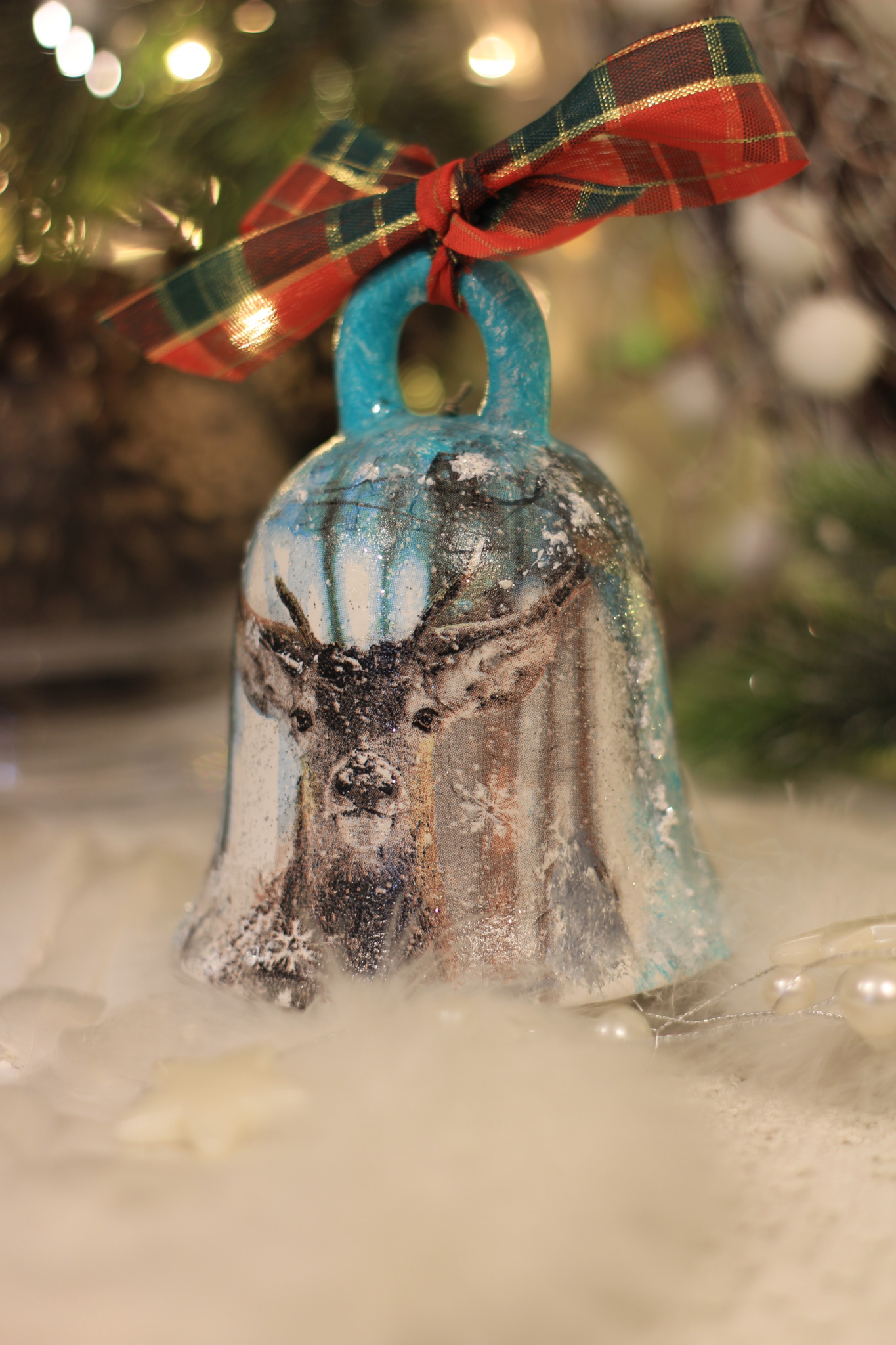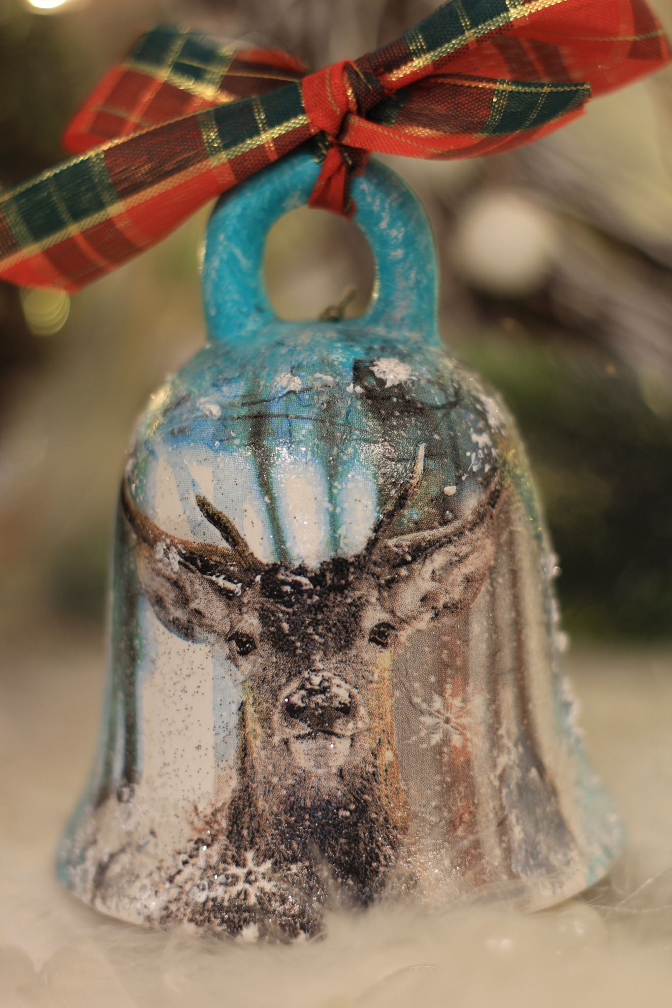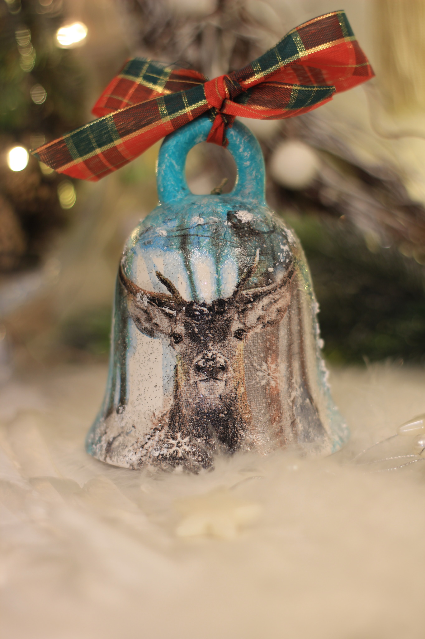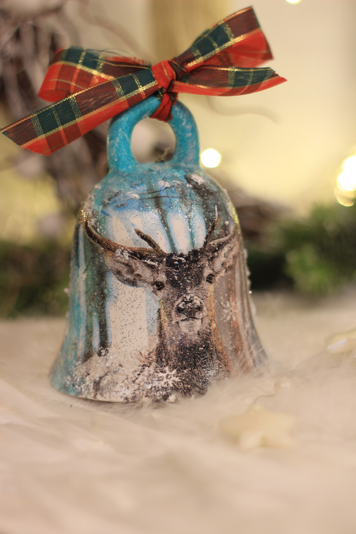 - Ceramiczny dzwonek z Jelonkiem dekorowany metodą Decoupage oraz techniką własną. Dzwonek po obu stronach przedstawia taki sam motyw.