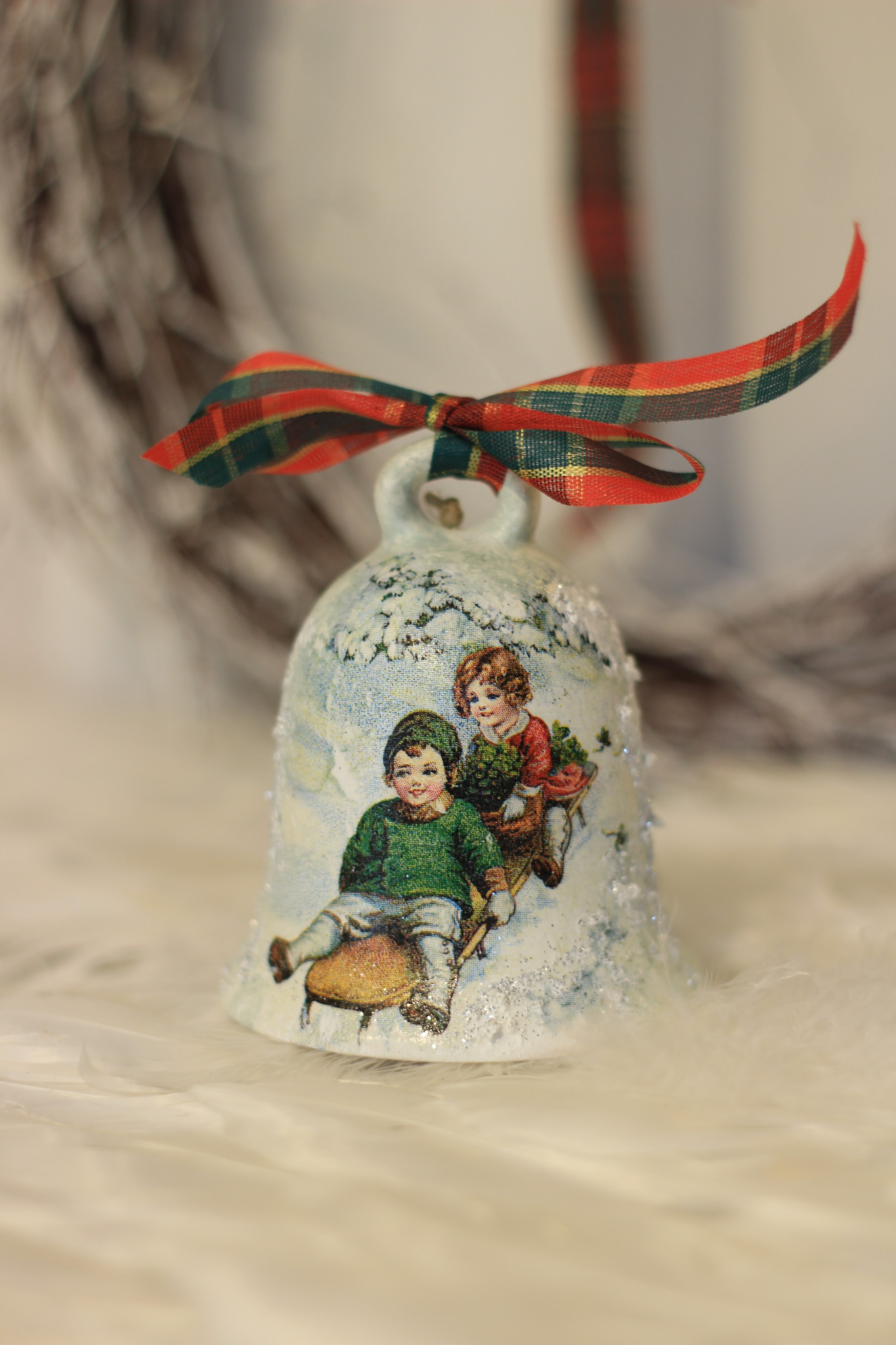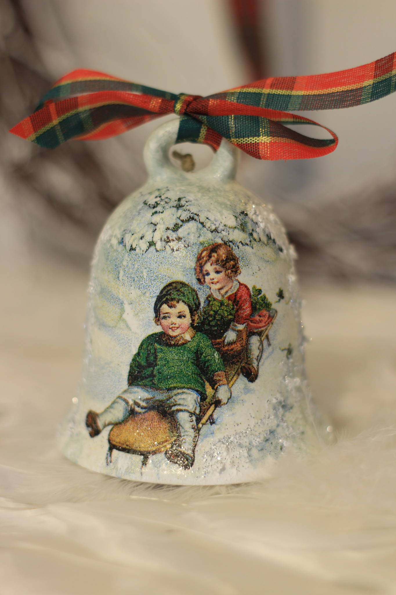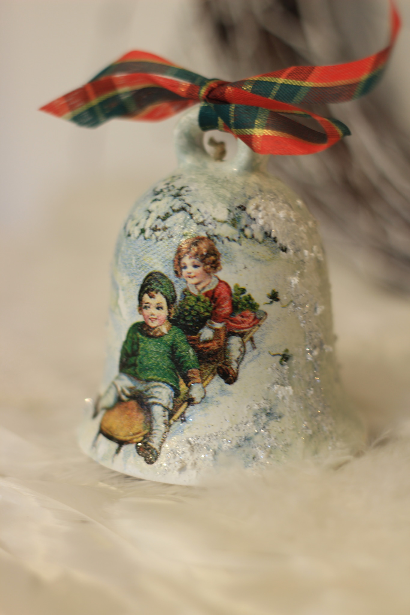 - Ceramiczny dzwonek dekorowany metodą Decoupage oraz techniką własną. Dzwonek po obu stronach przedstawia taki sam motyw.