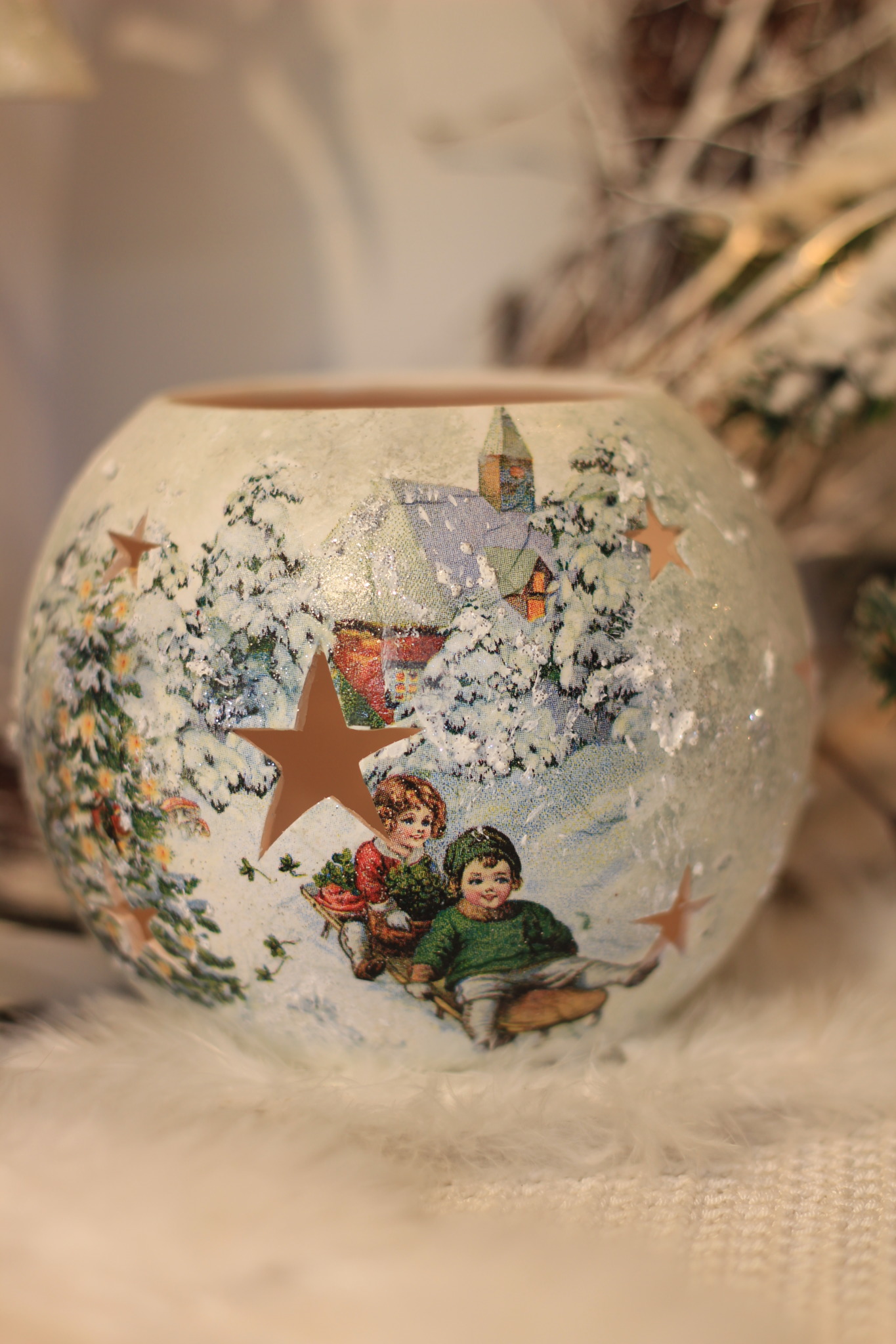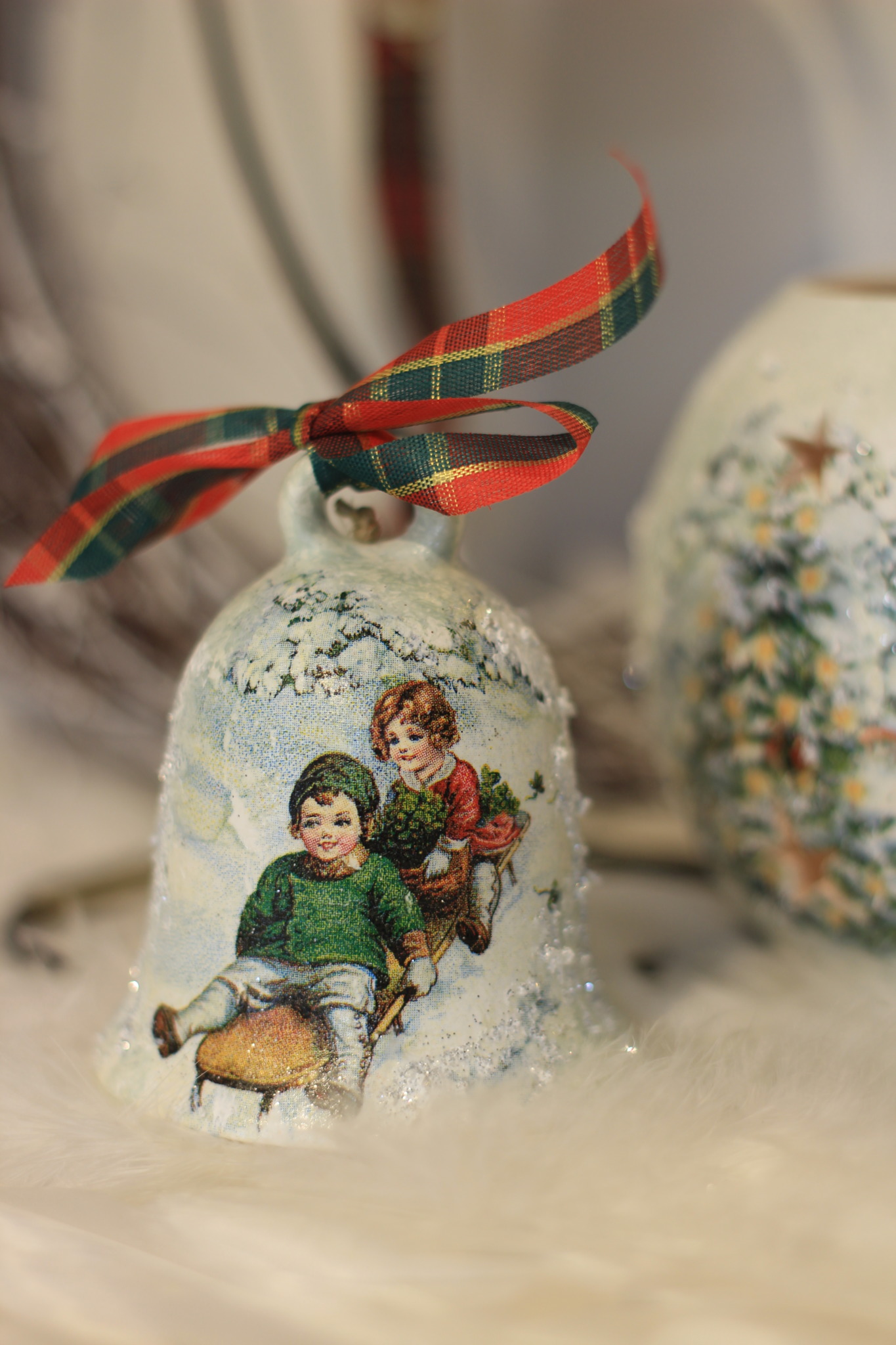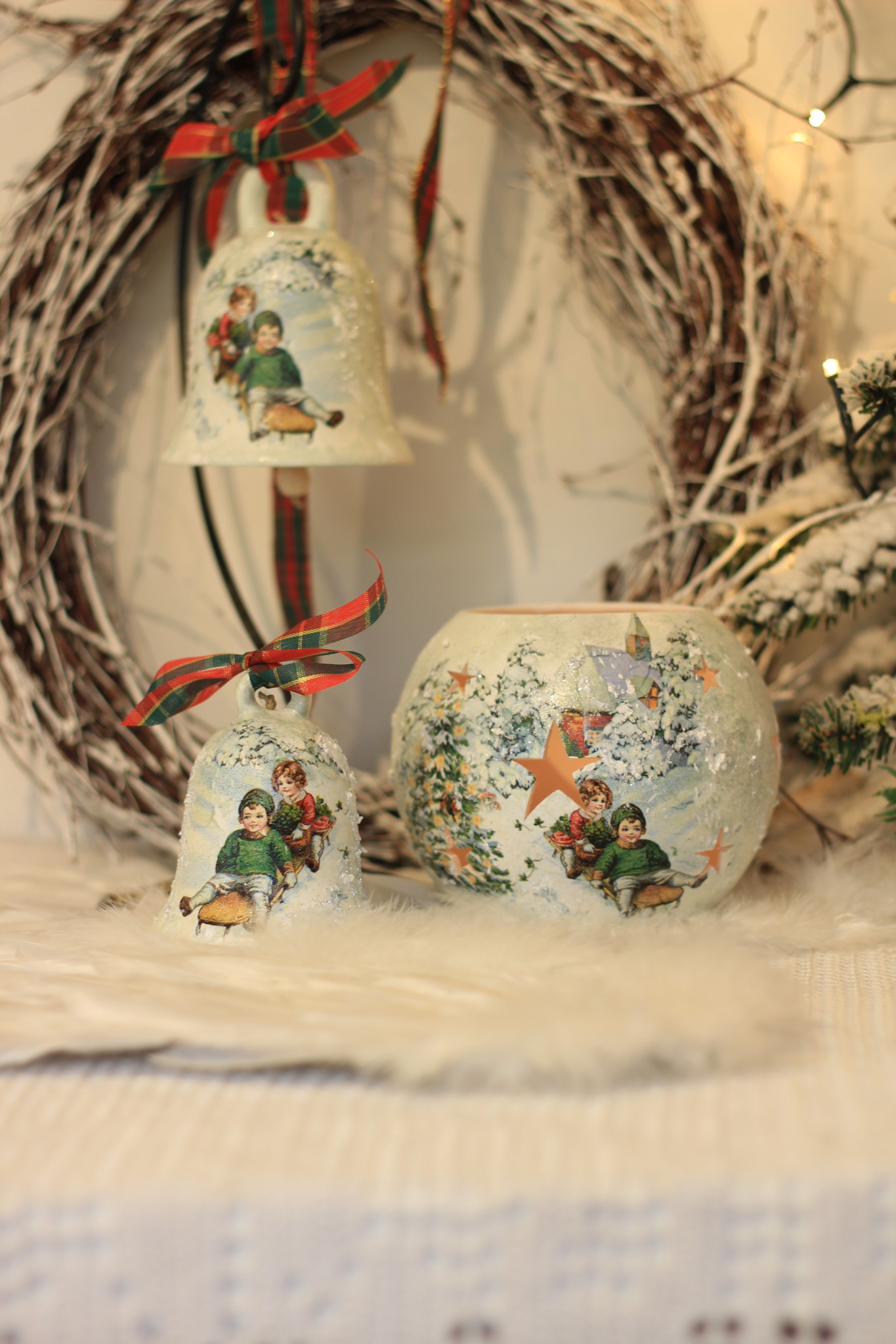 - Ceramiczny komplet bożonarodzeniowy zdobiony techniką Decoupage oraz techniką własną. Komplet składa się z Średniego lampionu w kształcie kuli oraz Dużego i Małego dzwonka. Do rozświetlenia lampionu najlepiej nadają się świeczki typu tealight. Lampiony są idealną świąteczną ozdobą na stół, parapet lub kominek.
