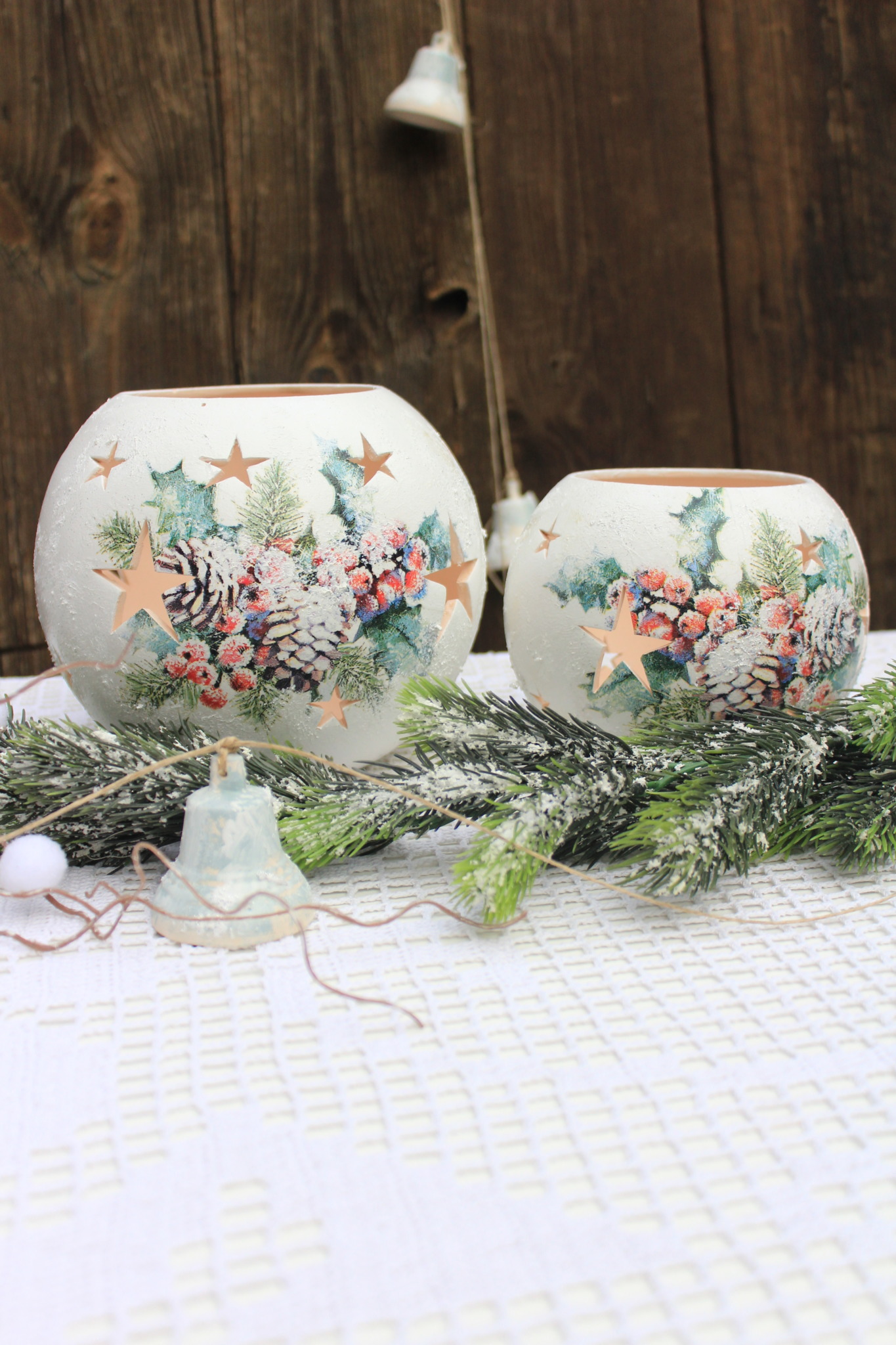 - Ceramiczny komplet bożonarodzeniowy zdobiony metodą Decoupage oraz techniką własną. Komplet składa się z Dużego oraz Średniego lampionu w kształcie kuli. Po obu stronach lampiony przedstawiają taki sam motyw. Do rozświetlenia lampionu najlepiej nadają się świeczki typu tealight. Lampiony są idealną świąteczną ozdobą na stół, parapet lub kominek.