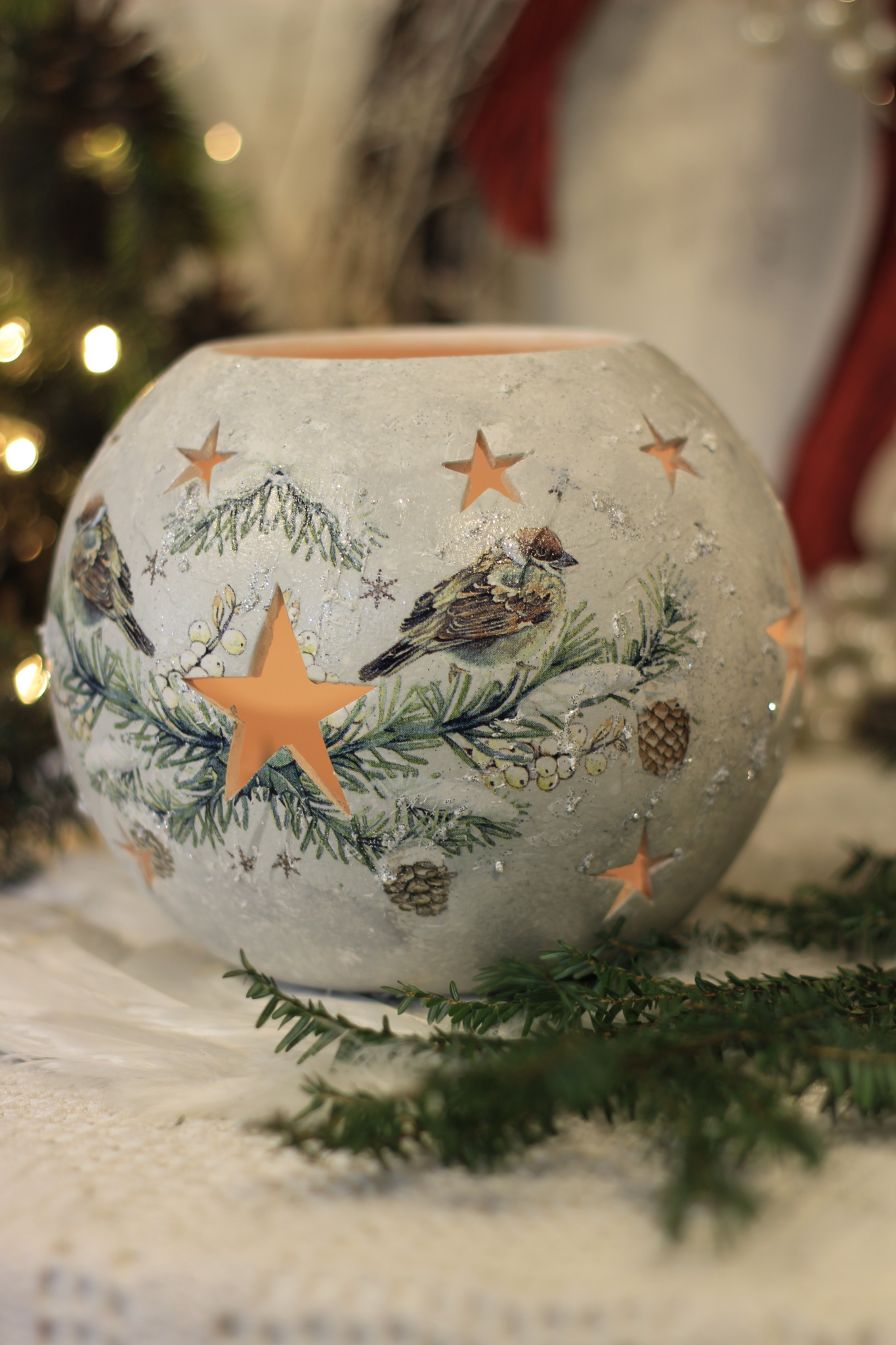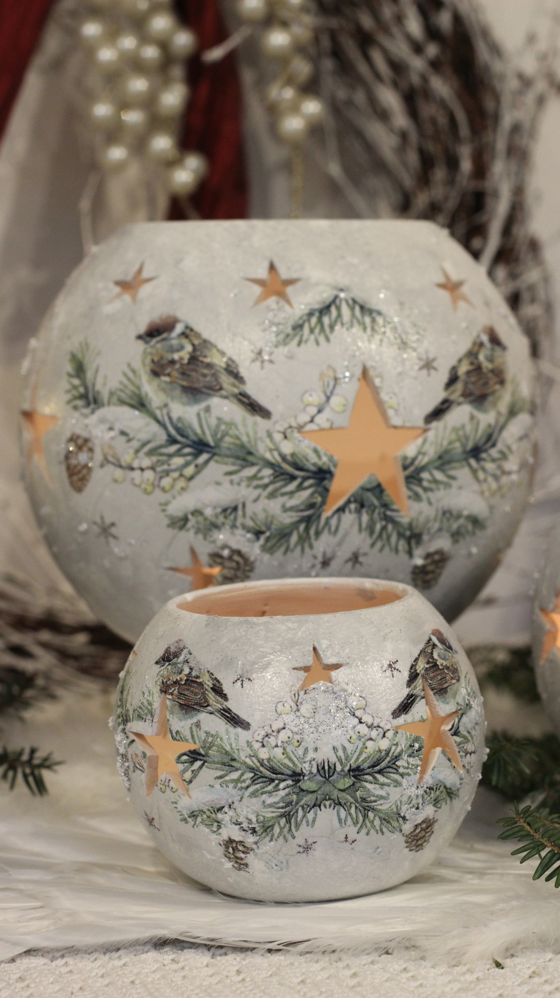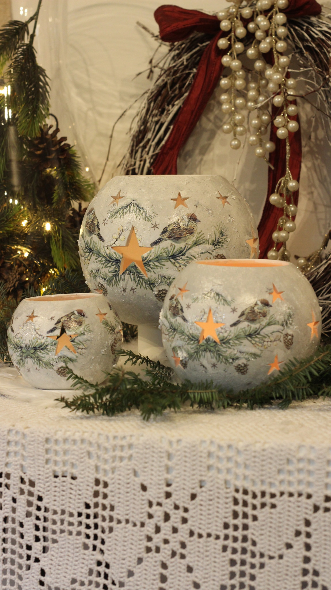 - Ceramiczny komplet bożonarodzeniowy zdobiony techniką Decoupage oraz techniką własną. Komplet składa się z Dużego, Średniego oraz Małego lampionu w kształcie kuli. Do rozświetlenia lampionu najlepiej nadają się świeczki typu tealight. Lampiony są idealną świąteczną ozdobą na stół, parapet lub kominek.