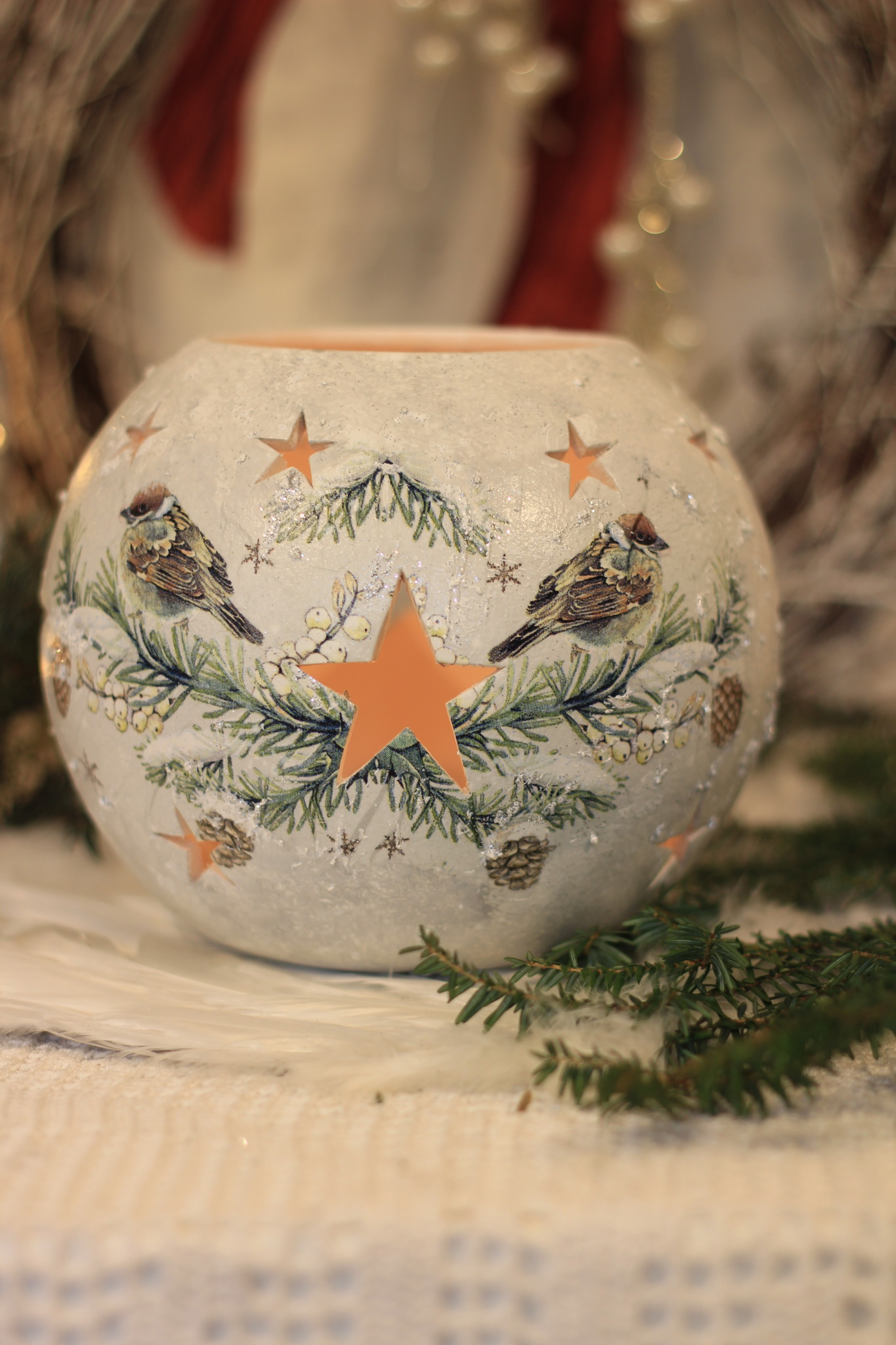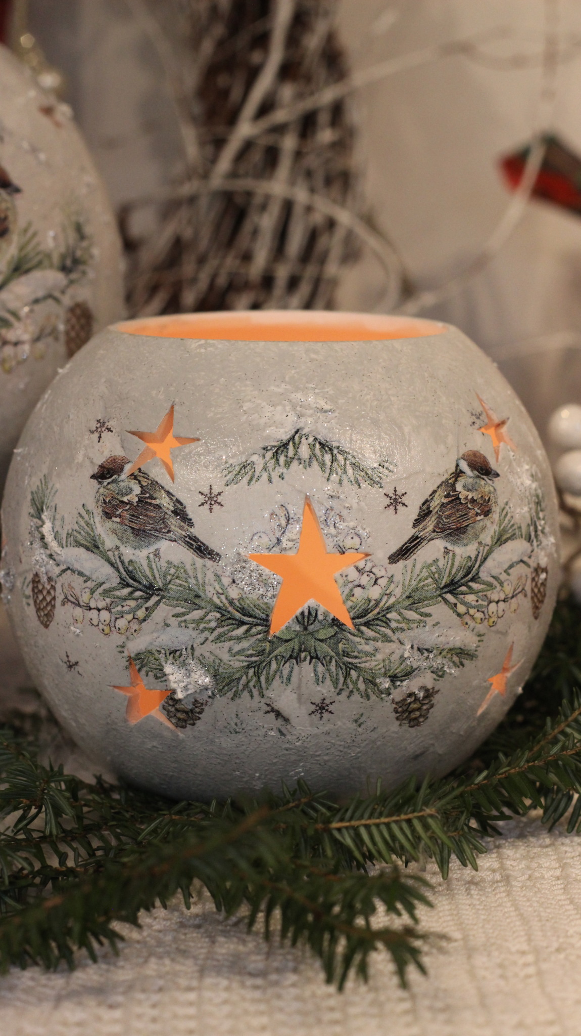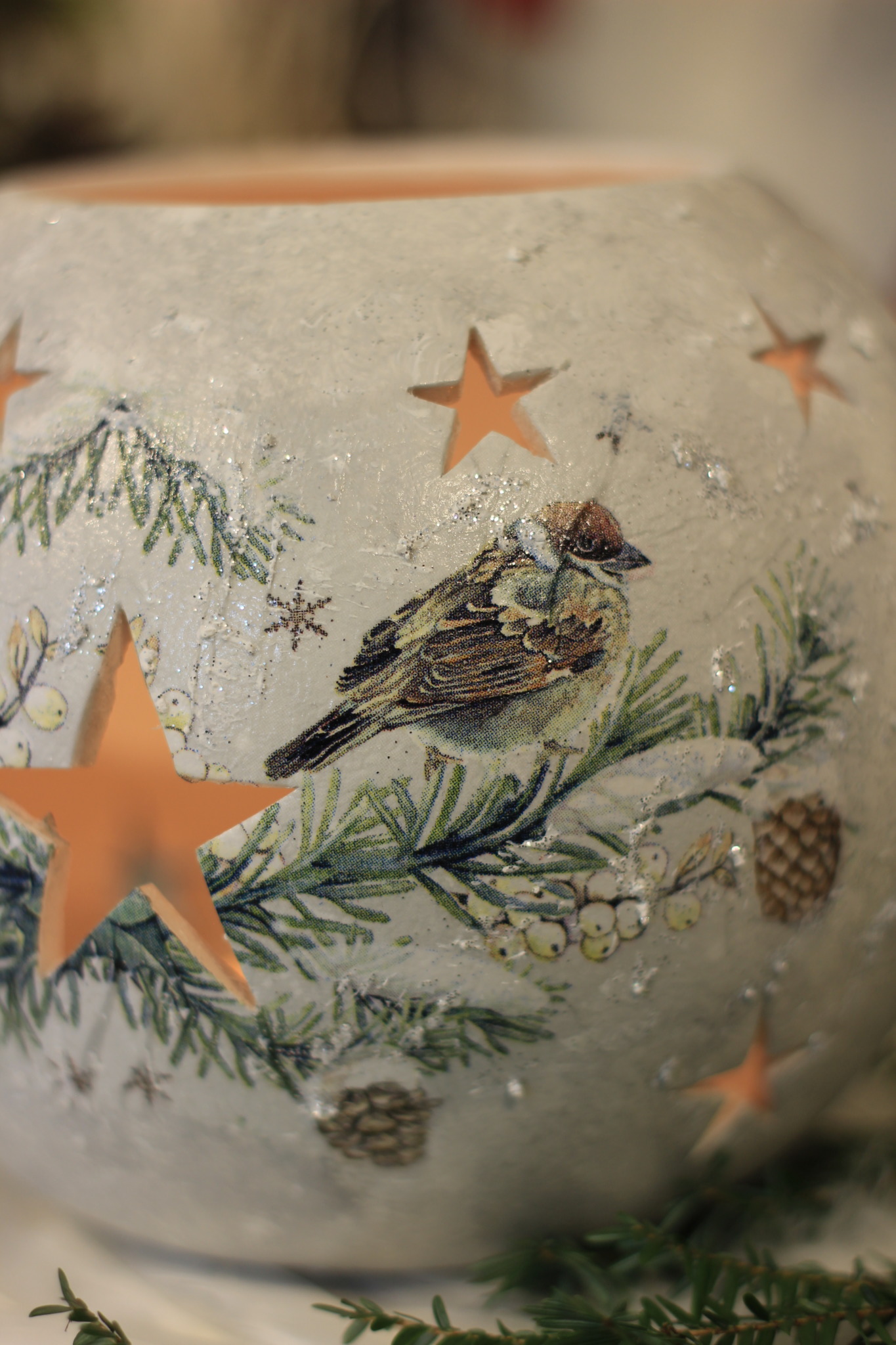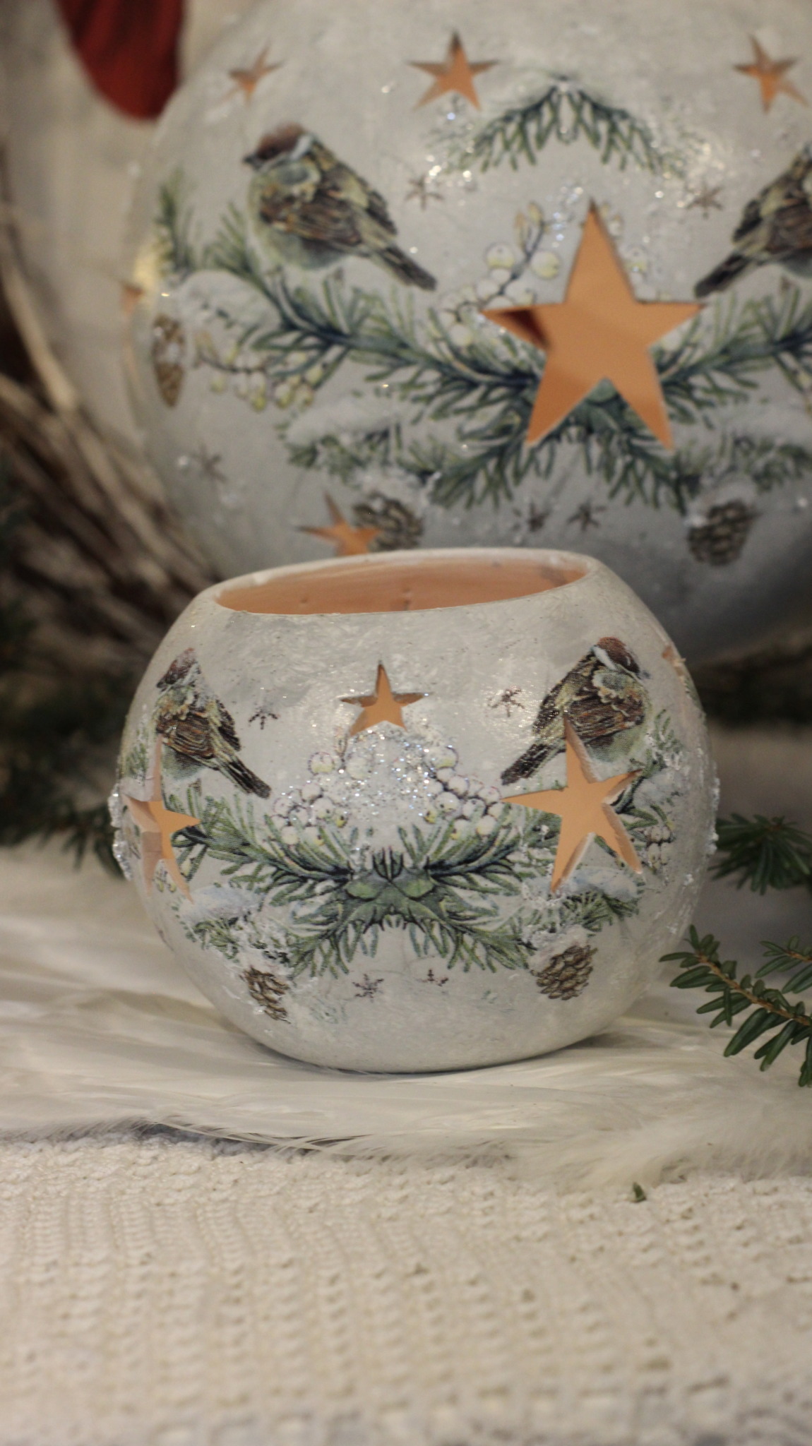 - Ceramiczny komplet bożonarodzeniowy zdobiony techniką Decoupage oraz techniką własną. Komplet składa się z Dużego, Średniego oraz Małego lampionu w kształcie kuli. Do rozświetlenia lampionu najlepiej nadają się świeczki typu tealight. Lampiony są idealną świąteczną ozdobą na stół, parapet lub kominek.