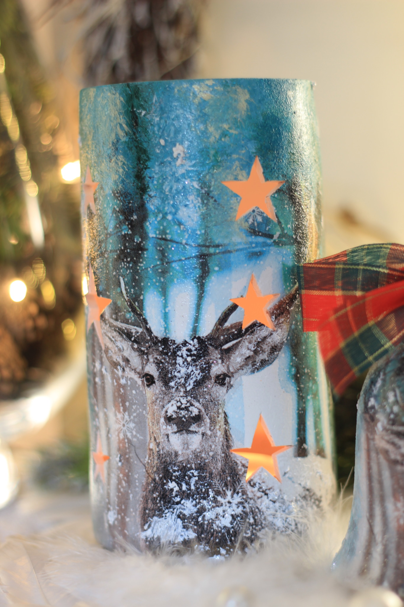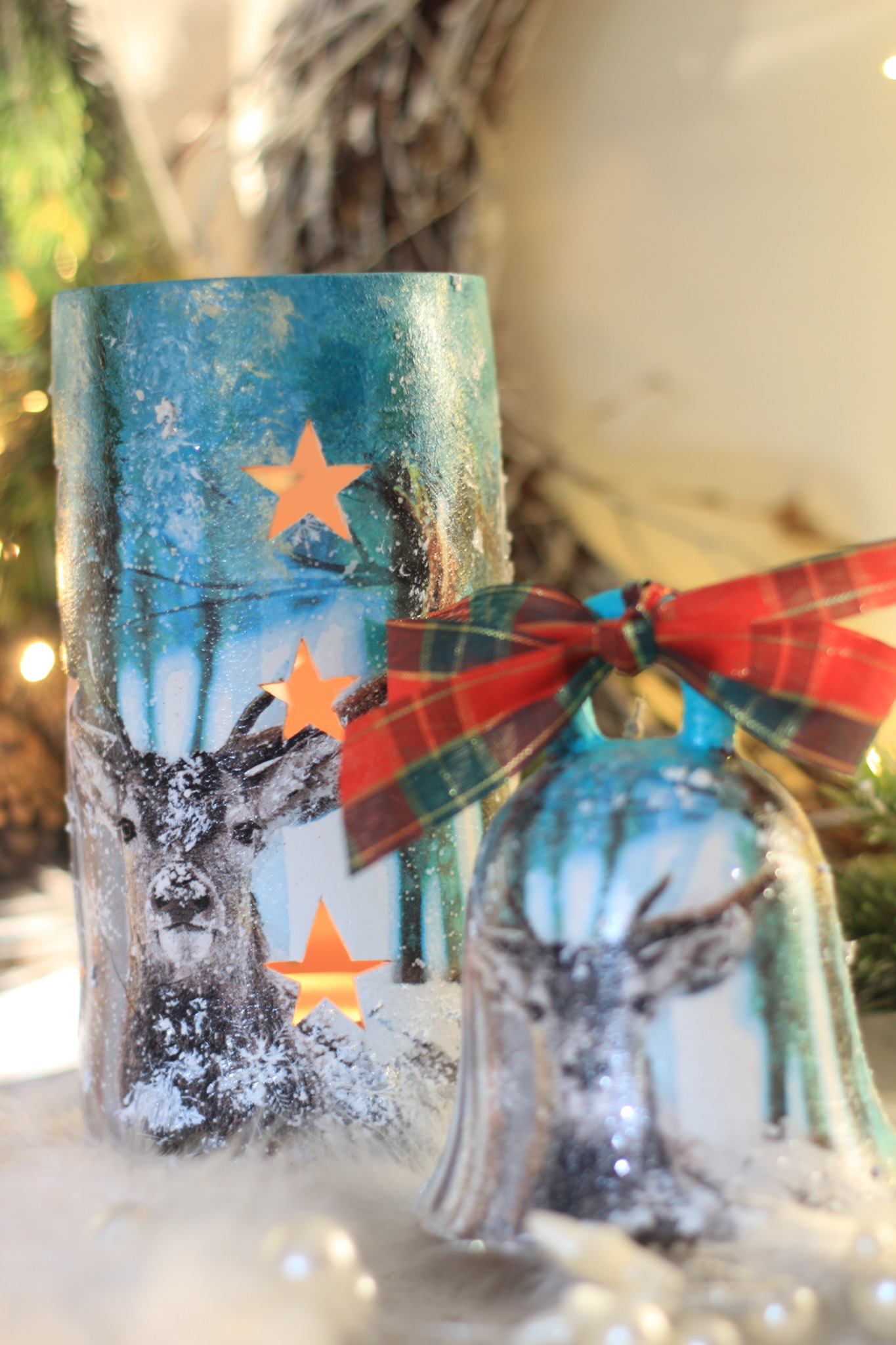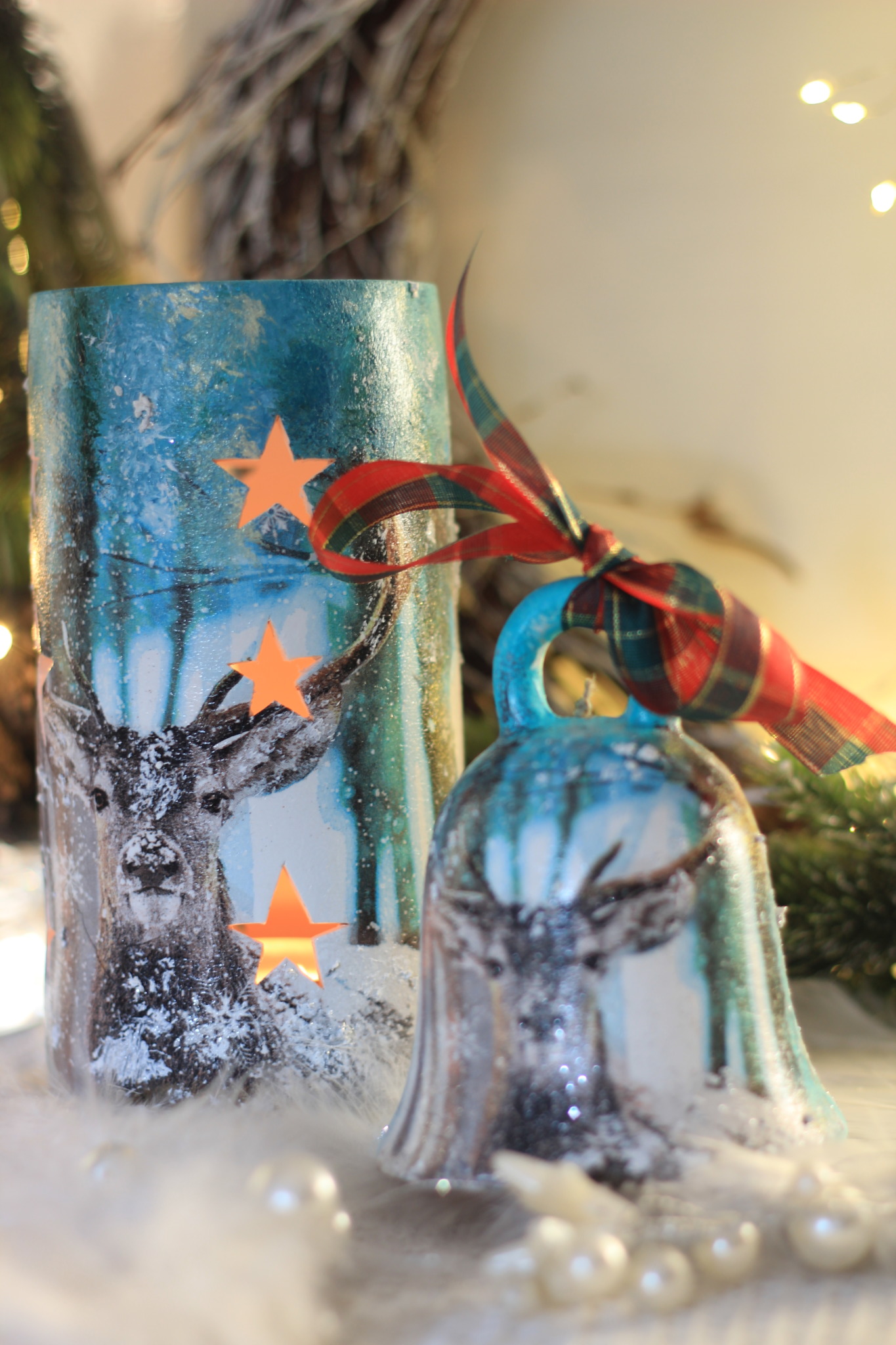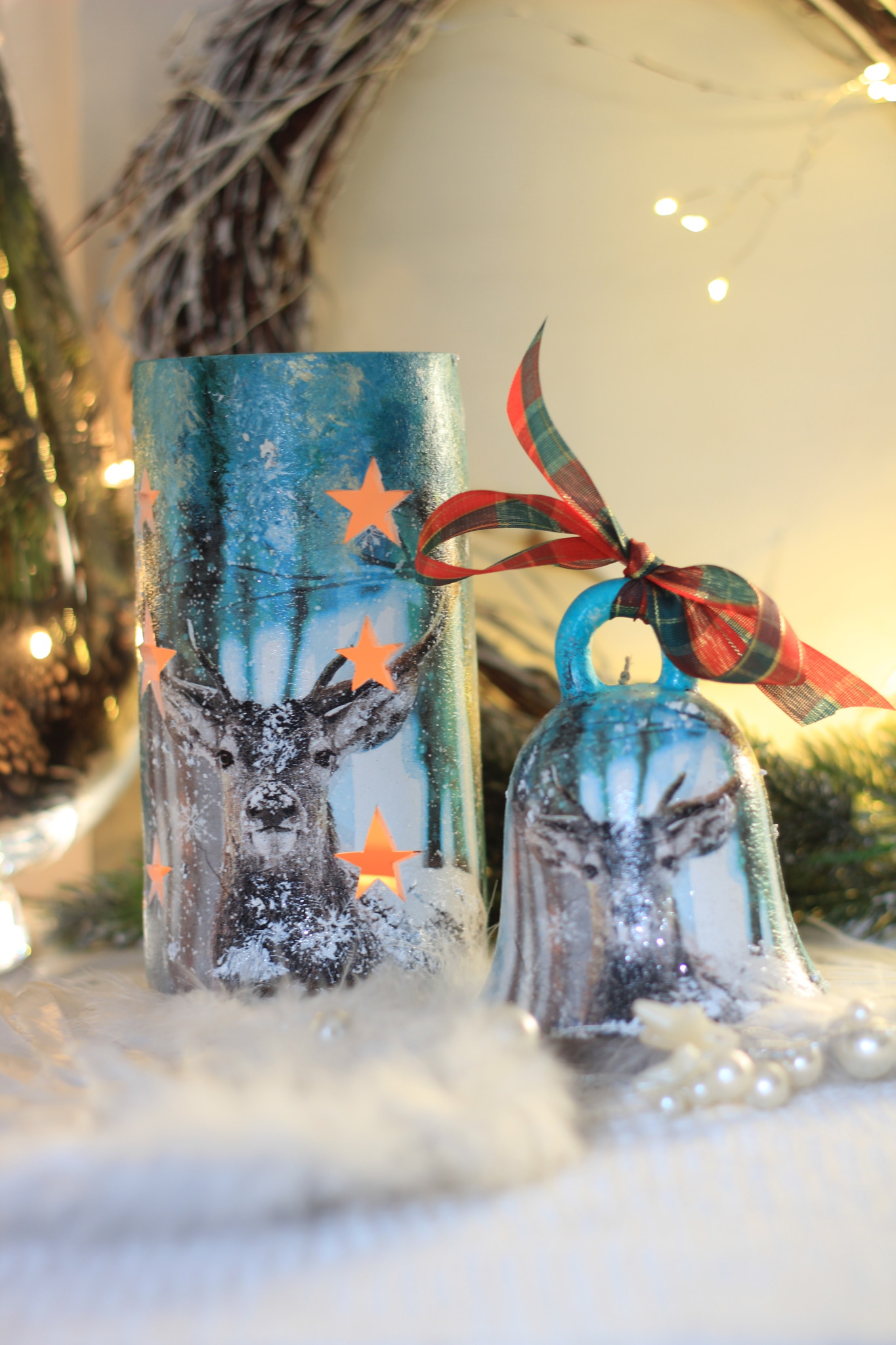 - Ceramiczny komplet bożonarodzeniowy zdobiony metodą Decoupage oraz techniką własną. Komplet składa się z lampionu w kształcie tulei oraz dużego dzwonka. Po obu stronach dzwonek i lampion przedstawiają taki sam motyw. Do rozświetlenia lampionu najlepiej nadają się świeczki typu tealight. Lampiony są idealną świąteczną ozdobą na stół, parapet lub kominek.