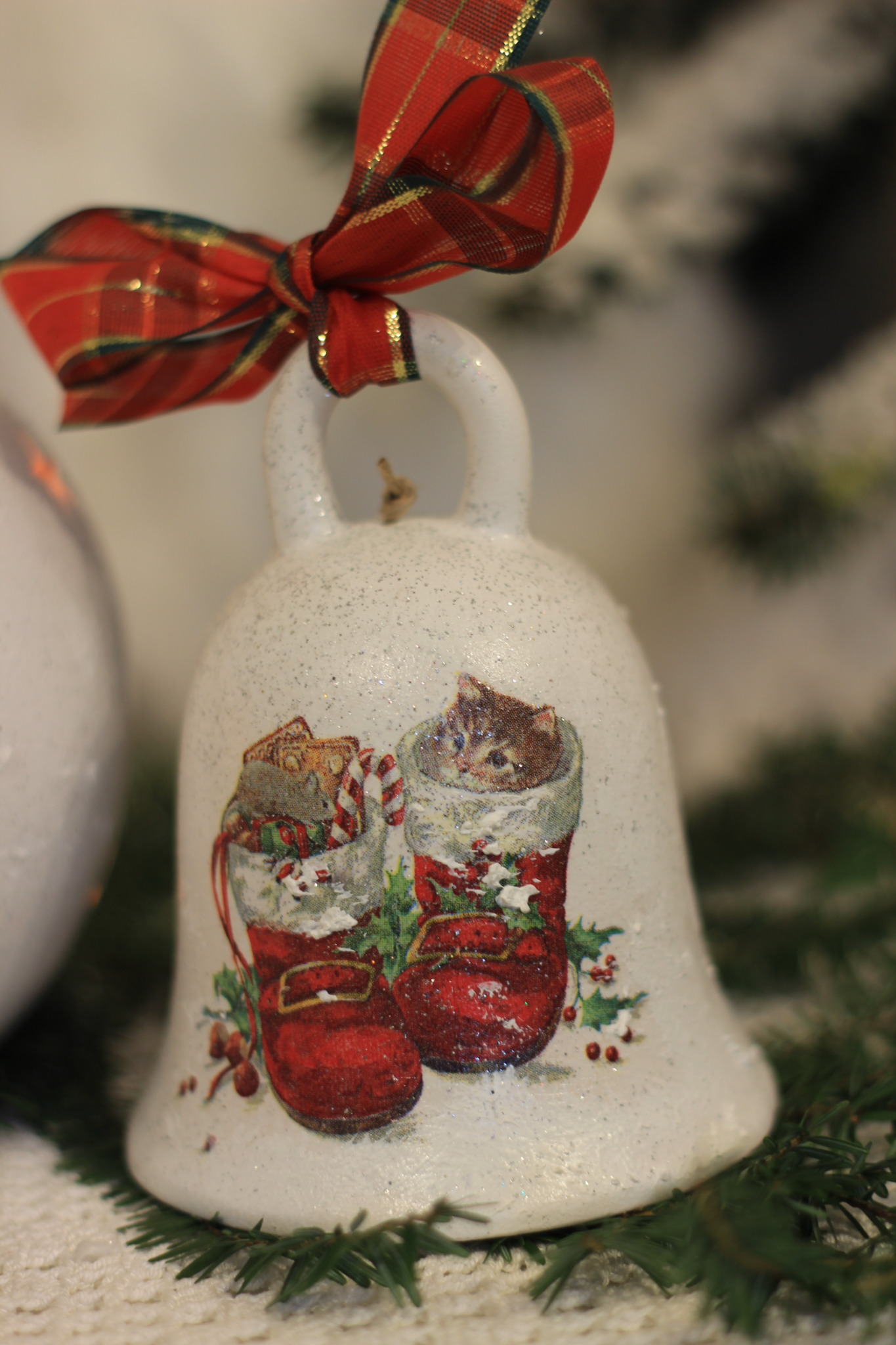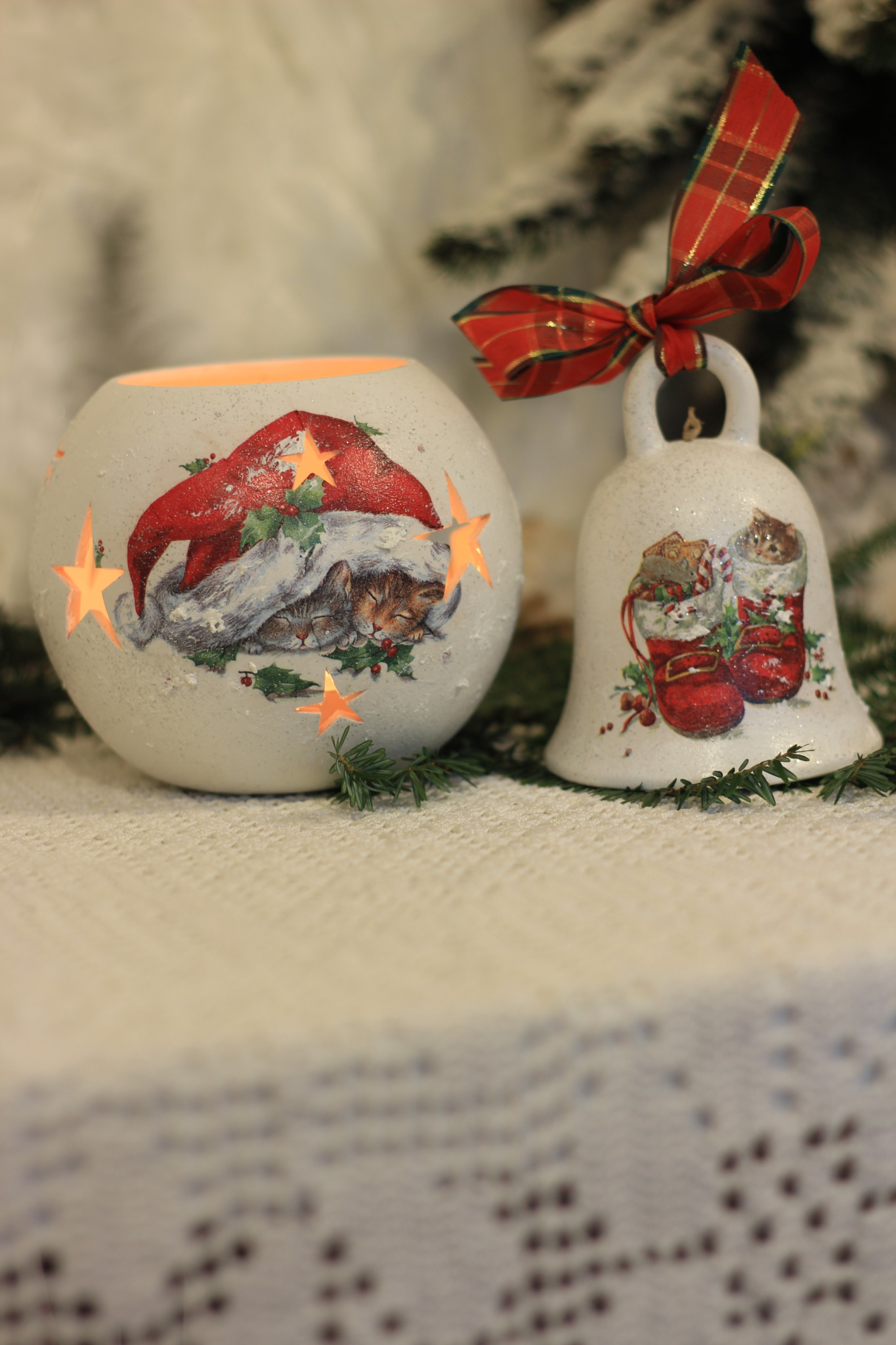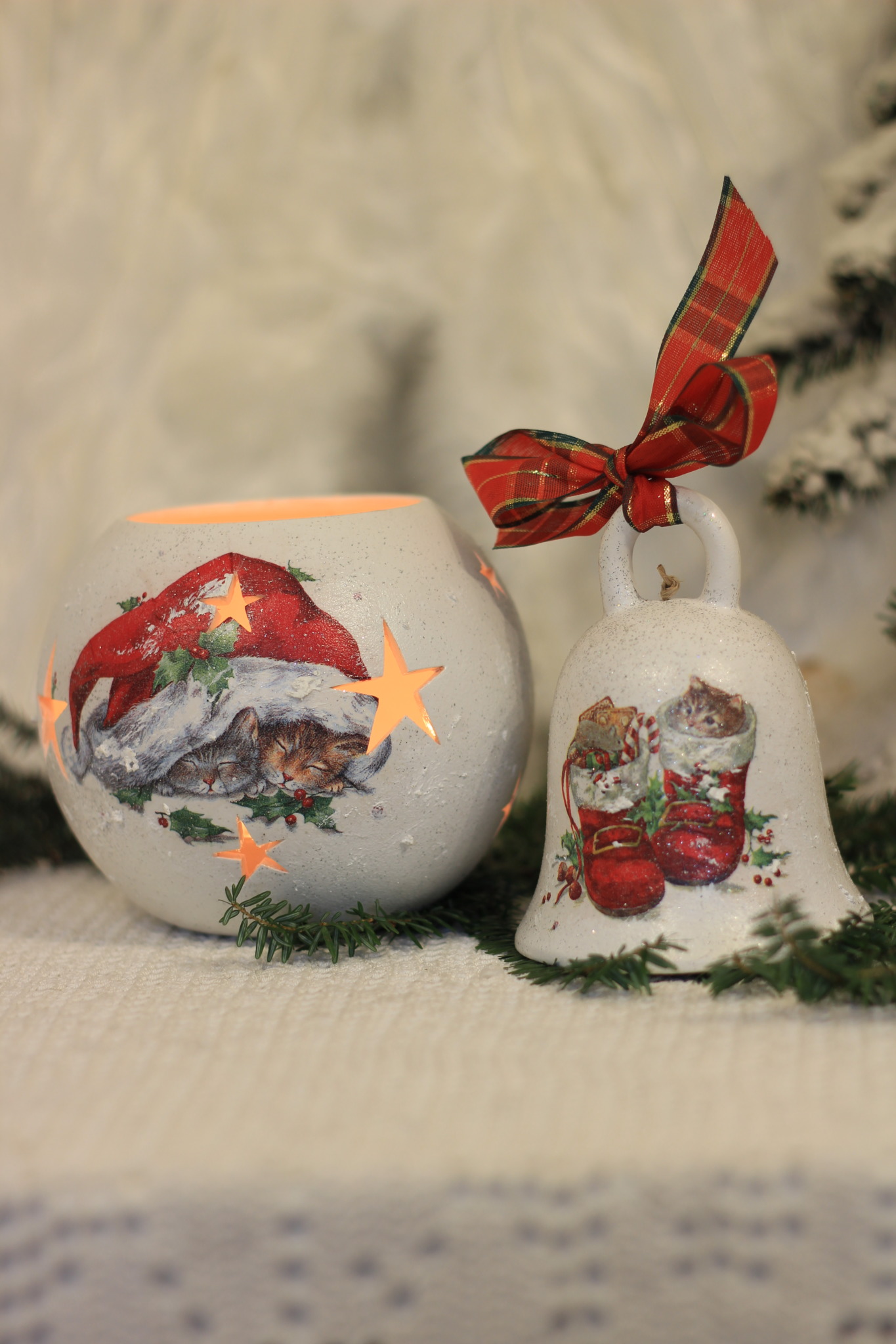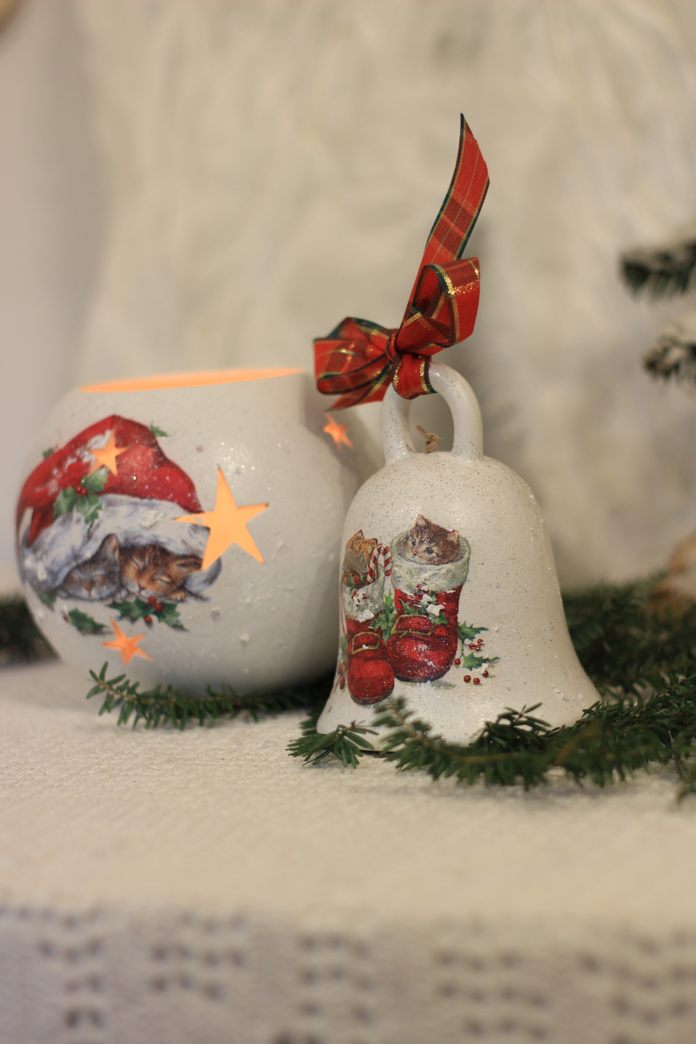 - Ceramiczny komplet bożonarodzeniowy zdobiony metodą Decoupage oraz techniką własną. Komplet składa się z Średniego lampionu w kształcie kuli oraz dużego dzwonka. Po obu stronach dzwonek i lampion przedstawiają taki sam motyw. Do rozświetlenia lampionu najlepiej nadają się świeczki typu tealight. Lampiony są idealną świąteczną ozdobą na stół, parapet lub kominek.